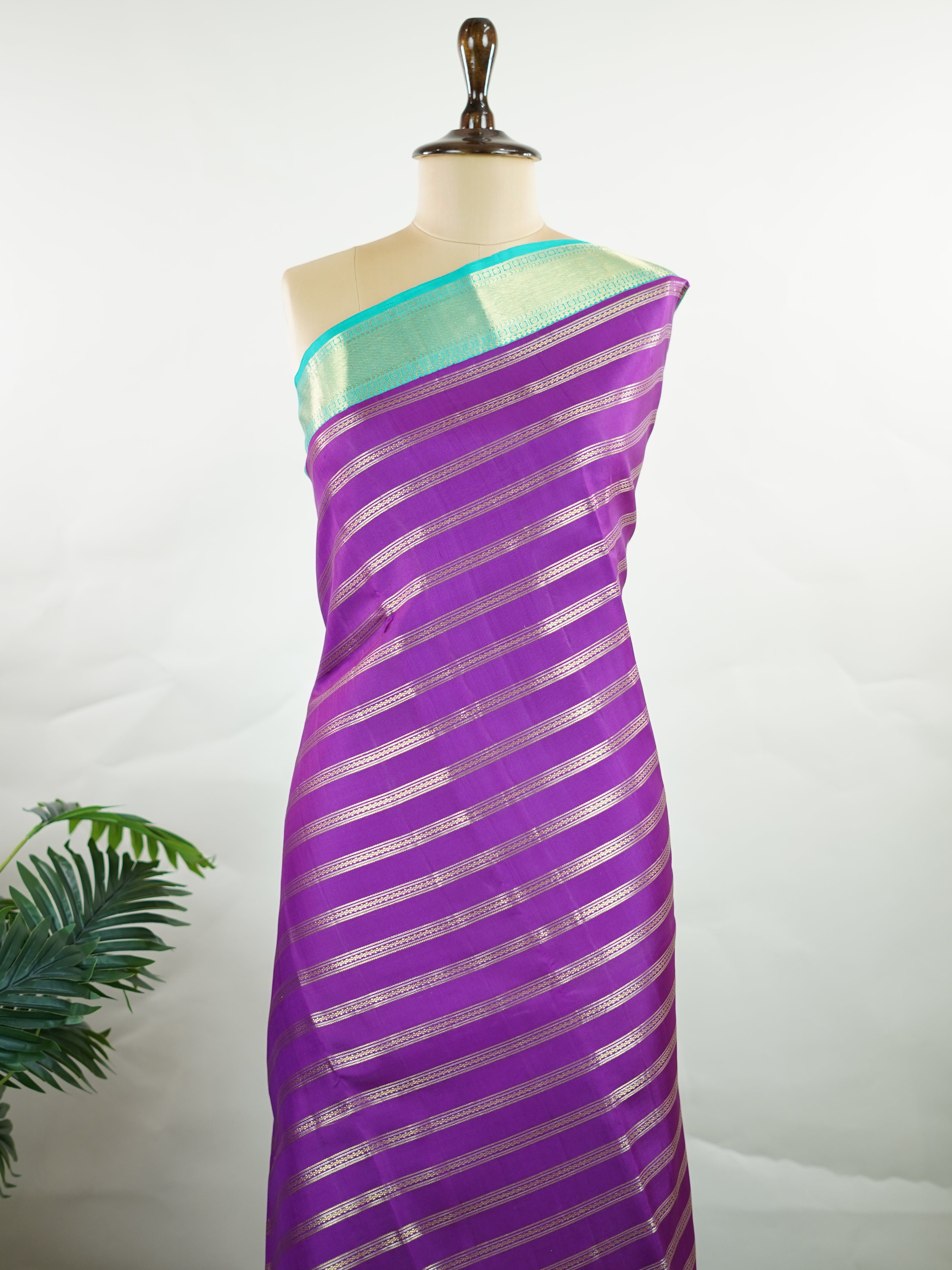 This Kanjivaram silk saree, adorned in Violet and detailed with Pure Zari weaving, reflects the grandeur of Kanchipuram. The timeless Buttis motifs enhance its bridal charm. A perfect blend of luxury and tradition, it is designed for those who appreciate fine craftsmanship.