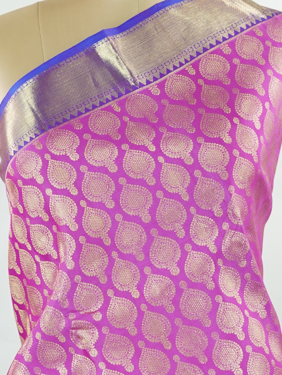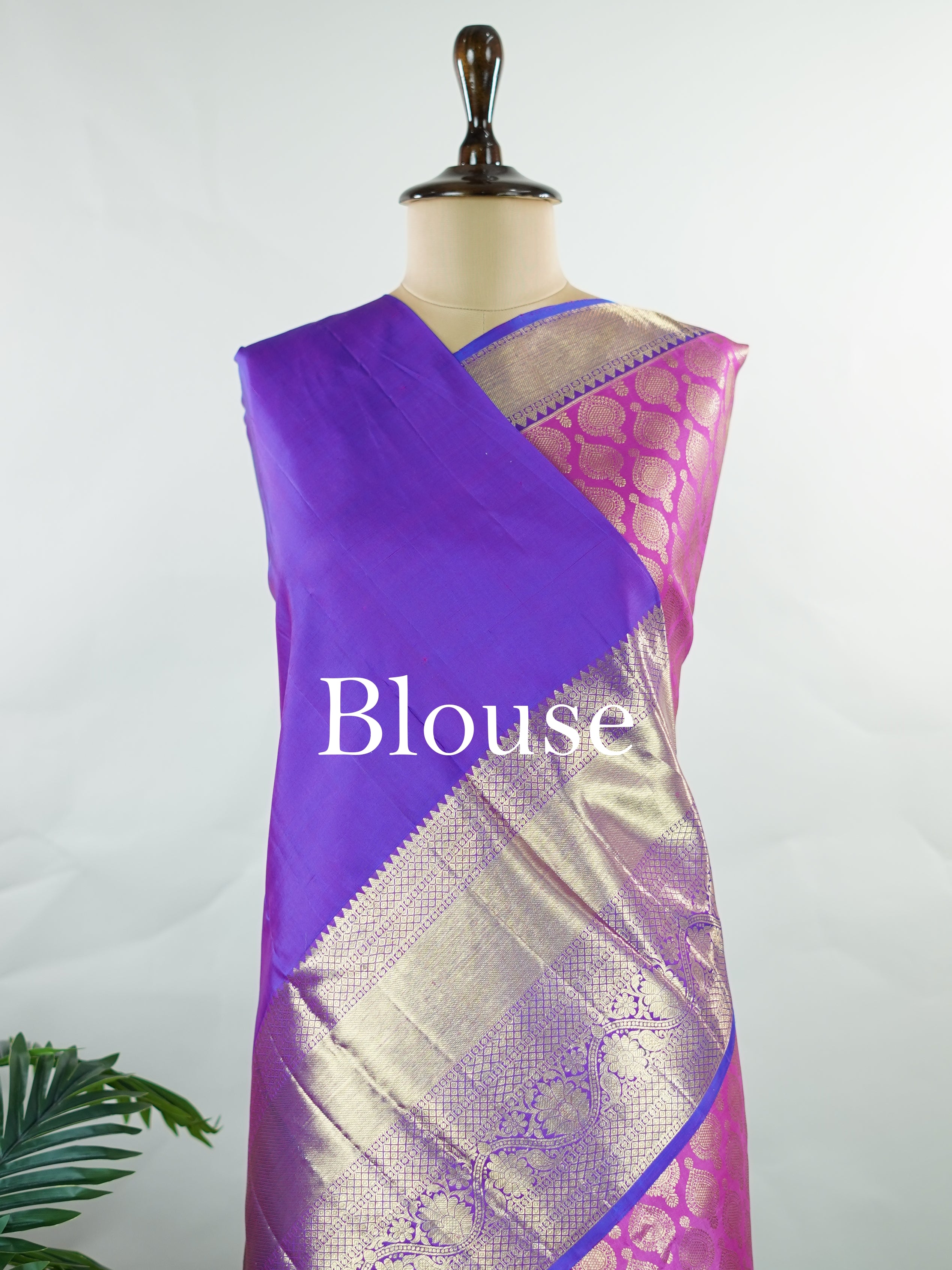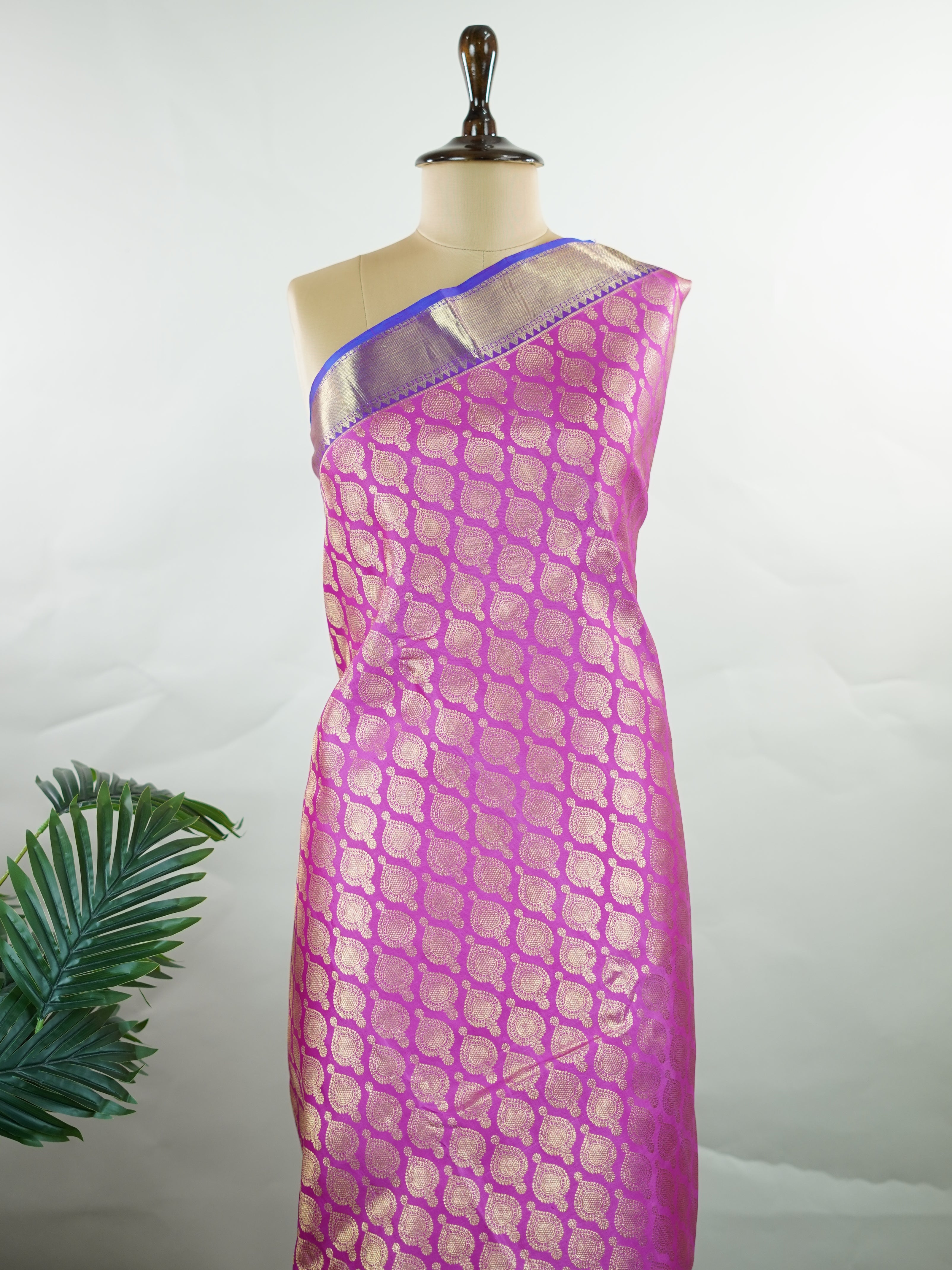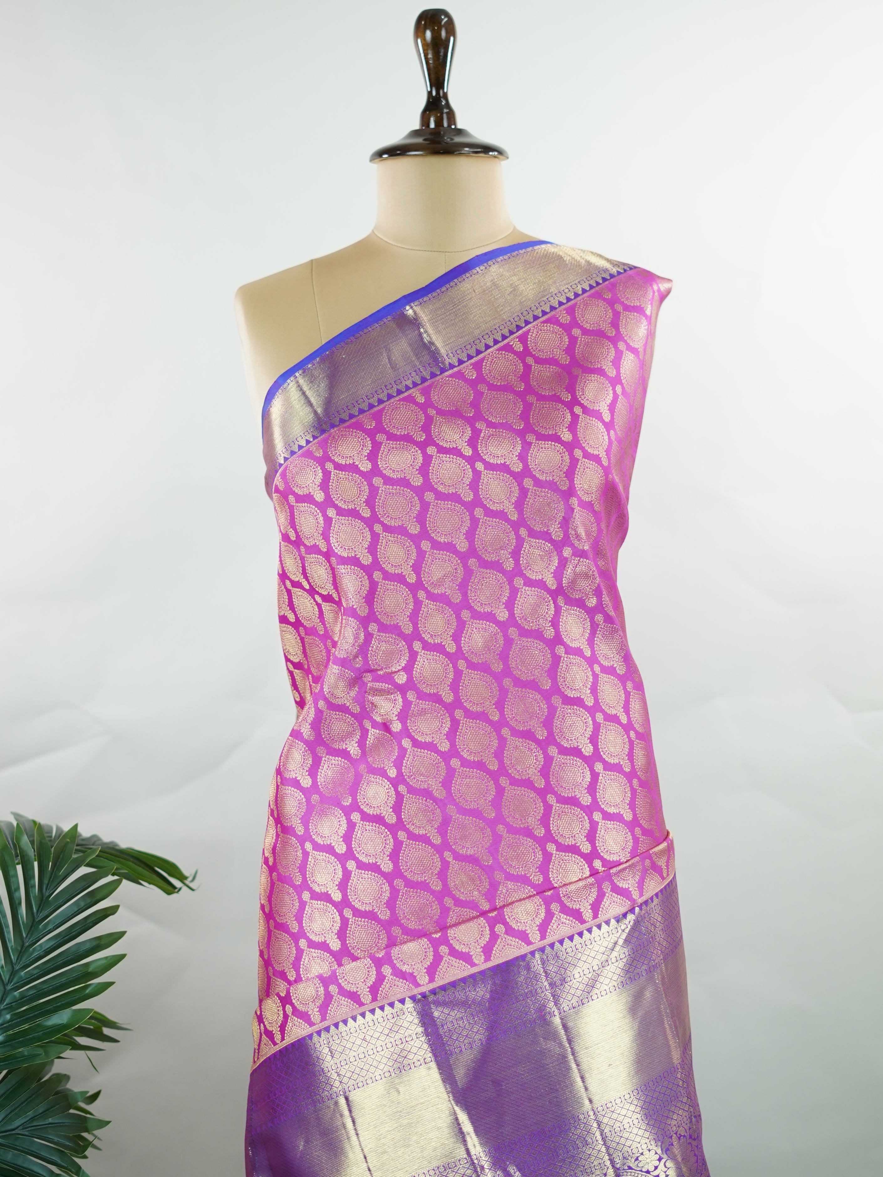 A masterpiece from Kanchipuram, this Kanjivaram saree in Pink is a tribute to India's rich handloom legacy. The Pure Zari weaving and Buttis motifs make it a perfect choice for brides and celebrations. Every thread speaks of elegance, tradition, and the skilled hands that bring this saree to life.
