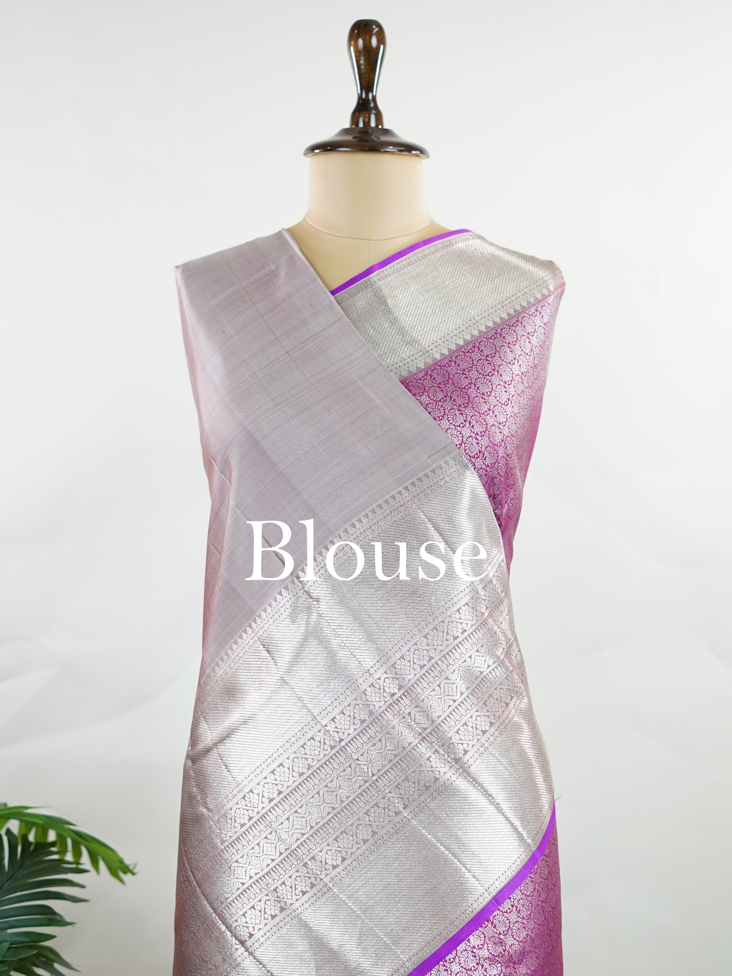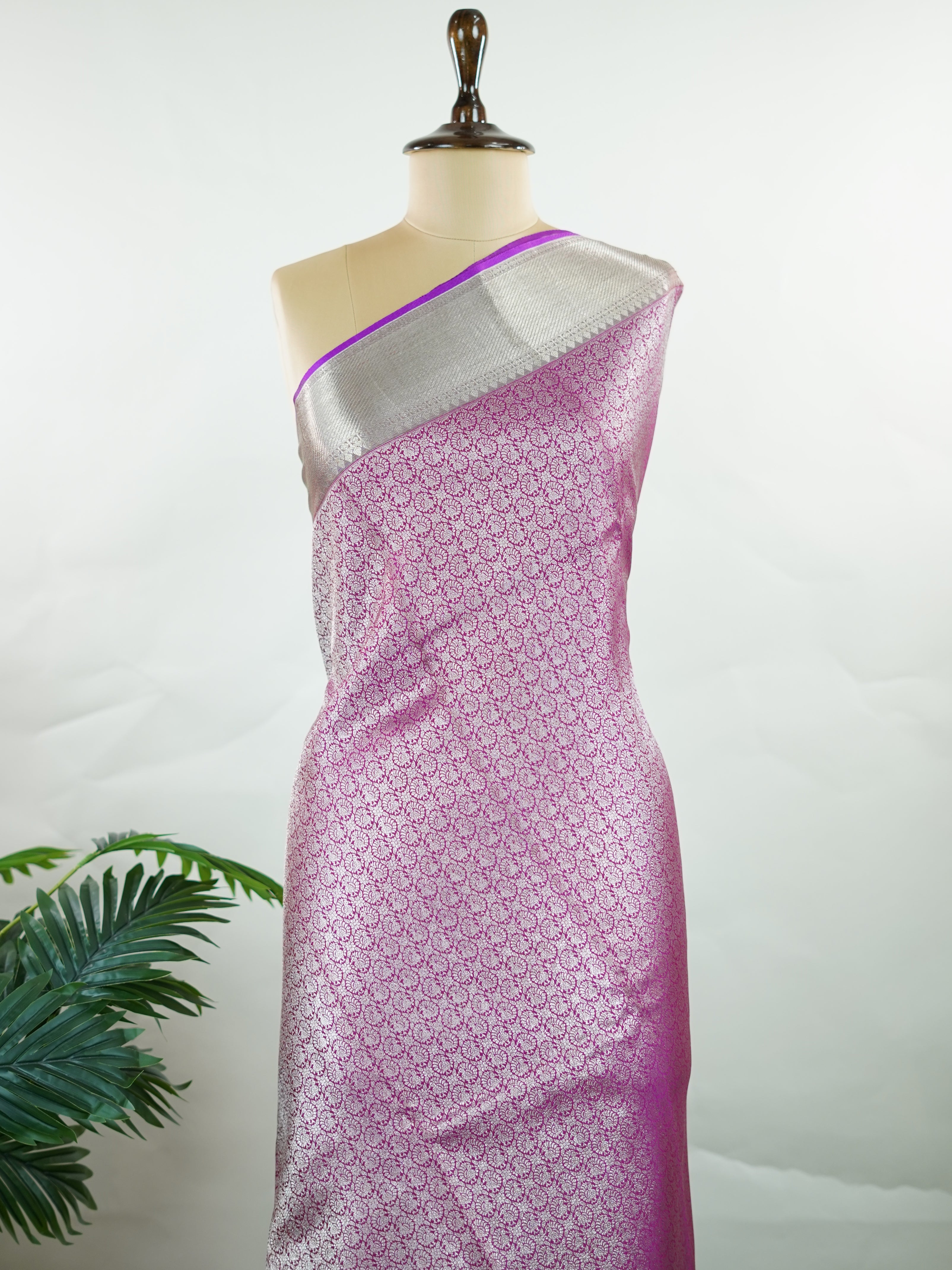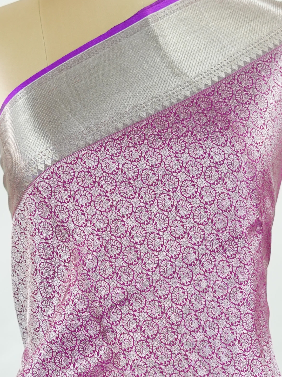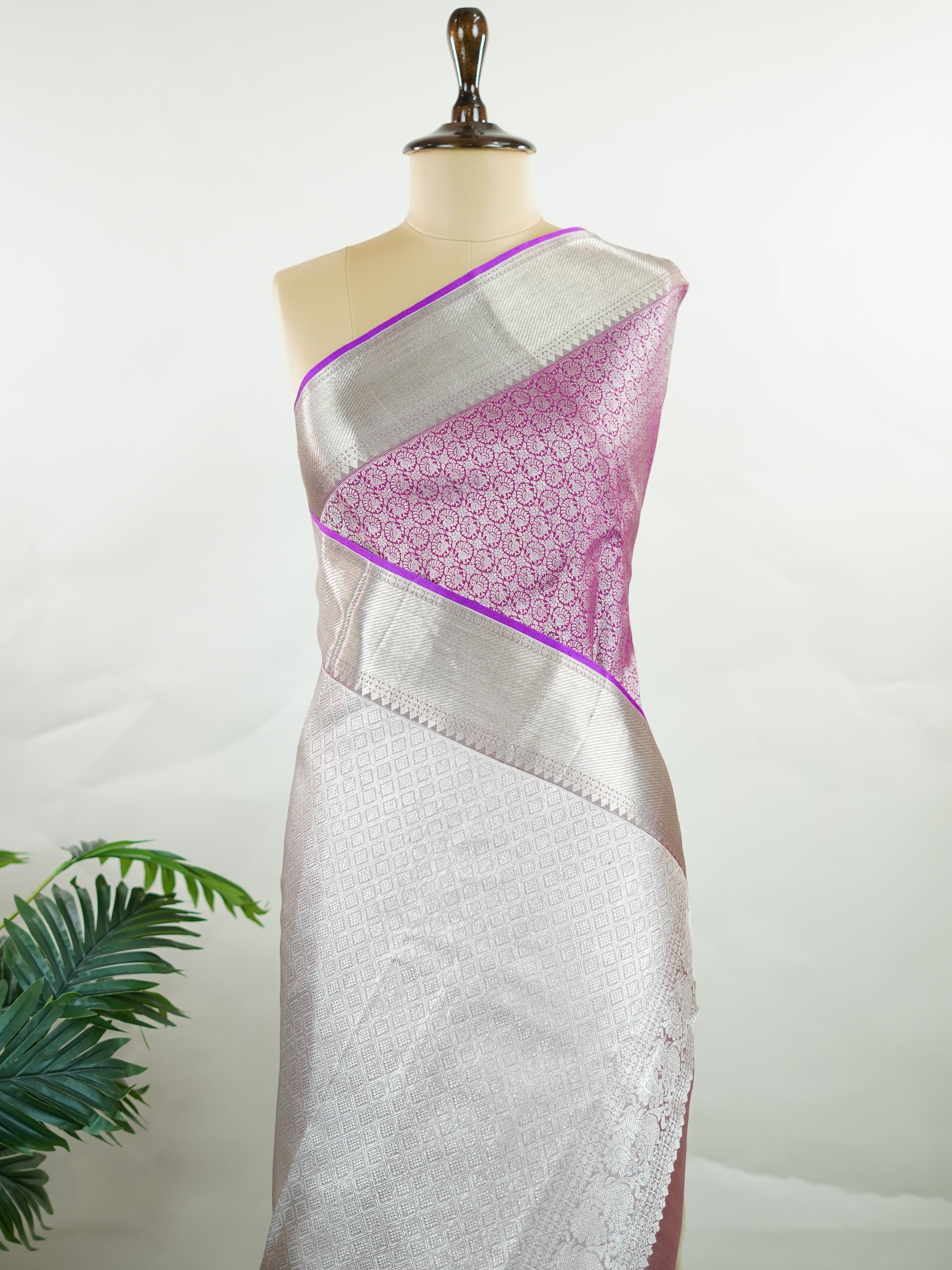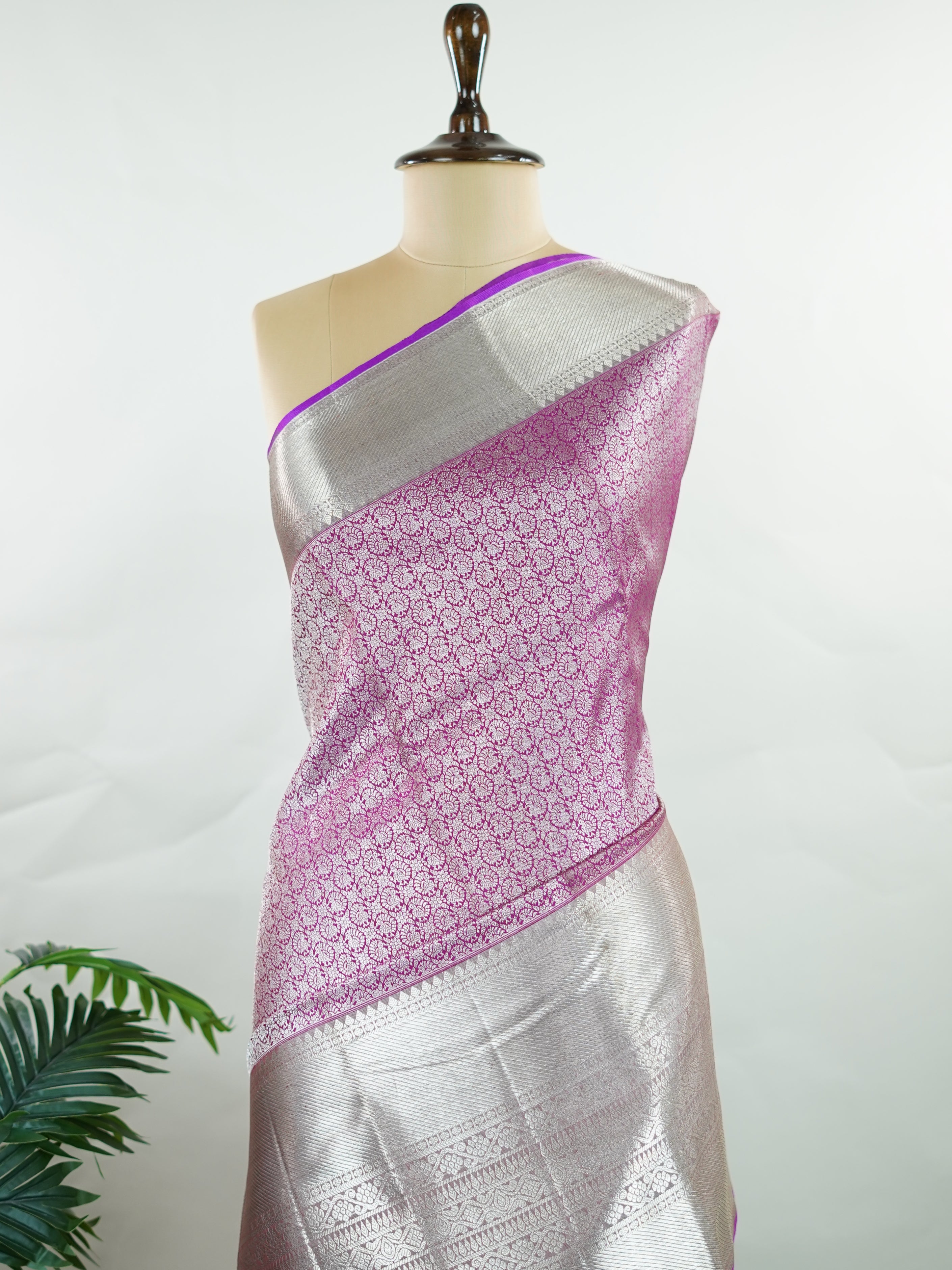 This Kanjivaram silk saree, adorned in Magenta and detailed with Pure Zari weaving, reflects the grandeur of Kanchipuram. The timeless Buttis motifs enhance its bridal charm. A perfect blend of luxury and tradition, it is designed for those who appreciate fine craftsmanship.