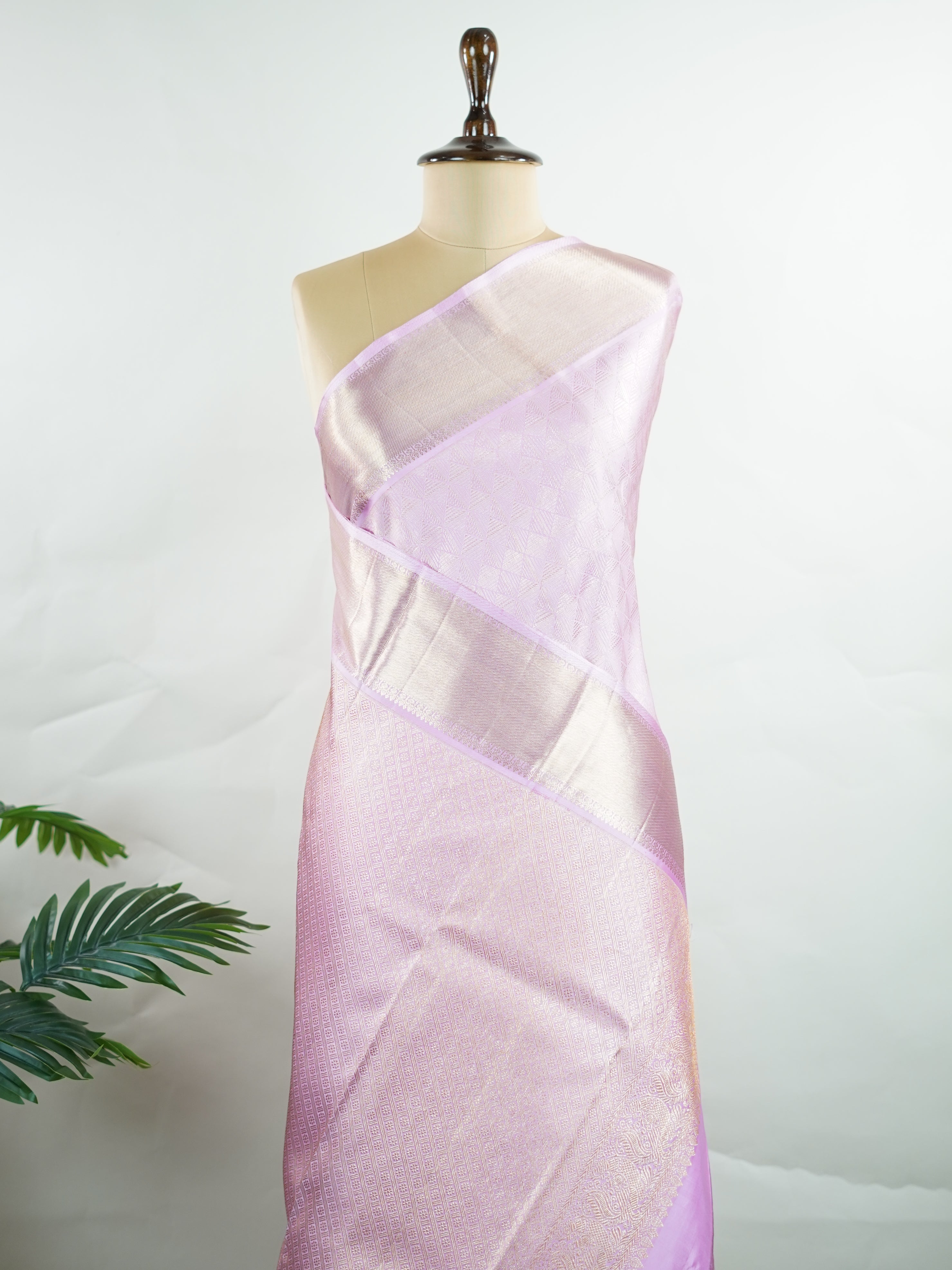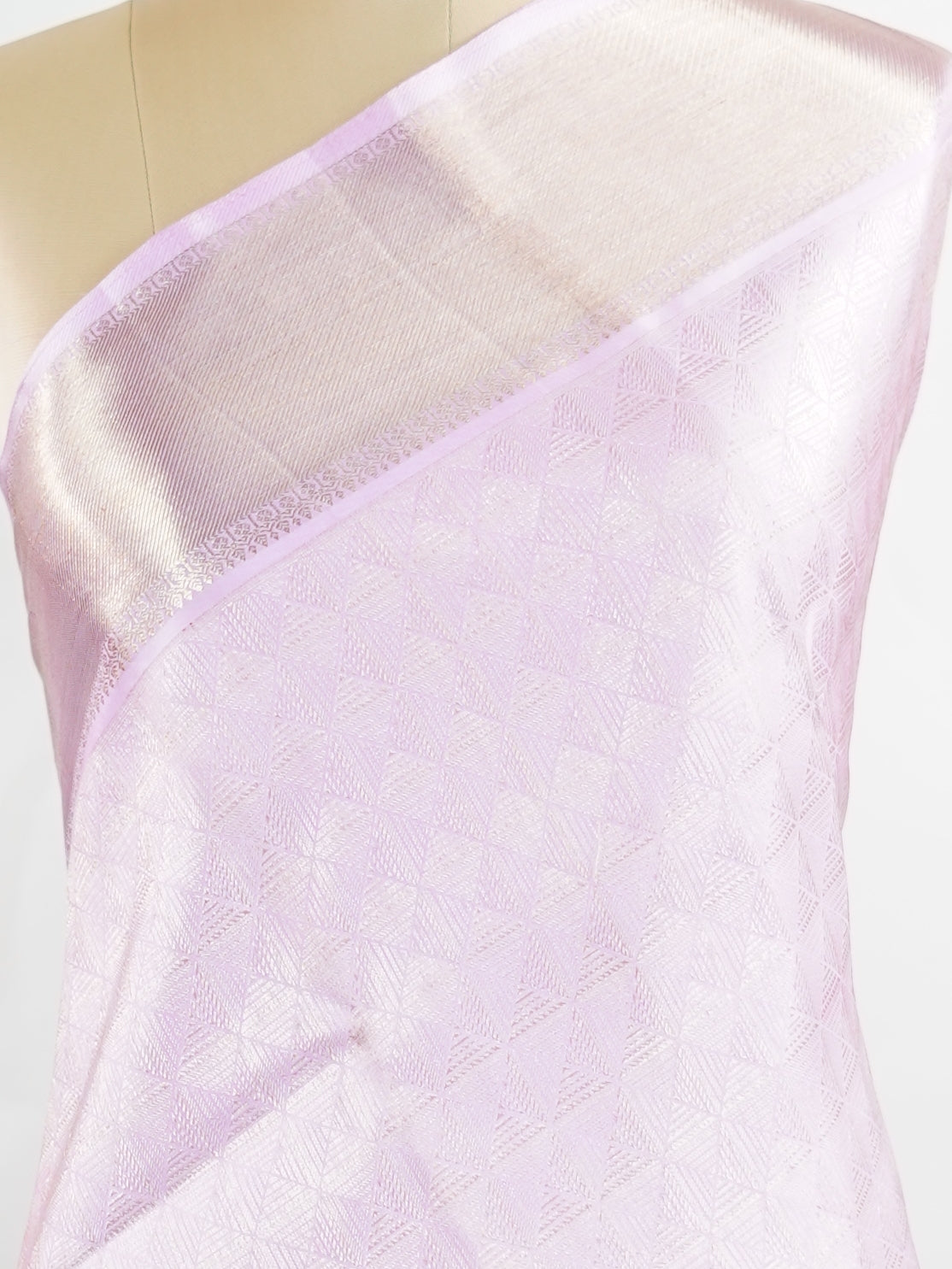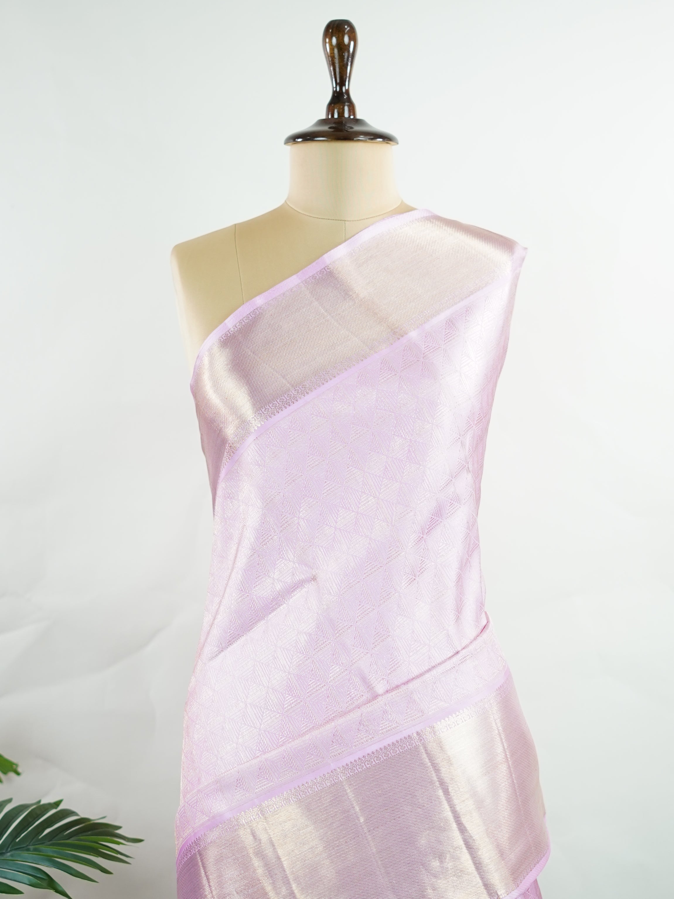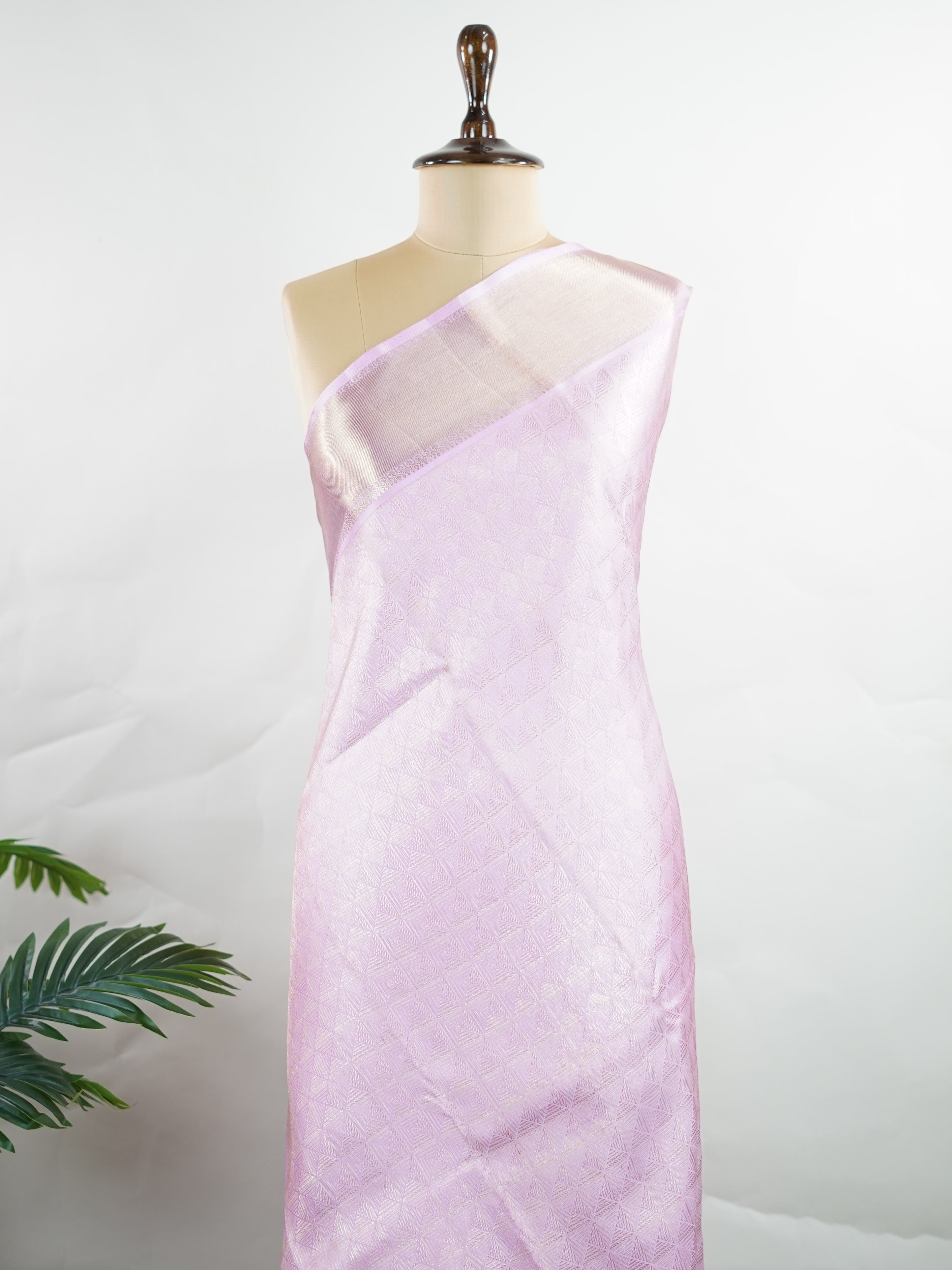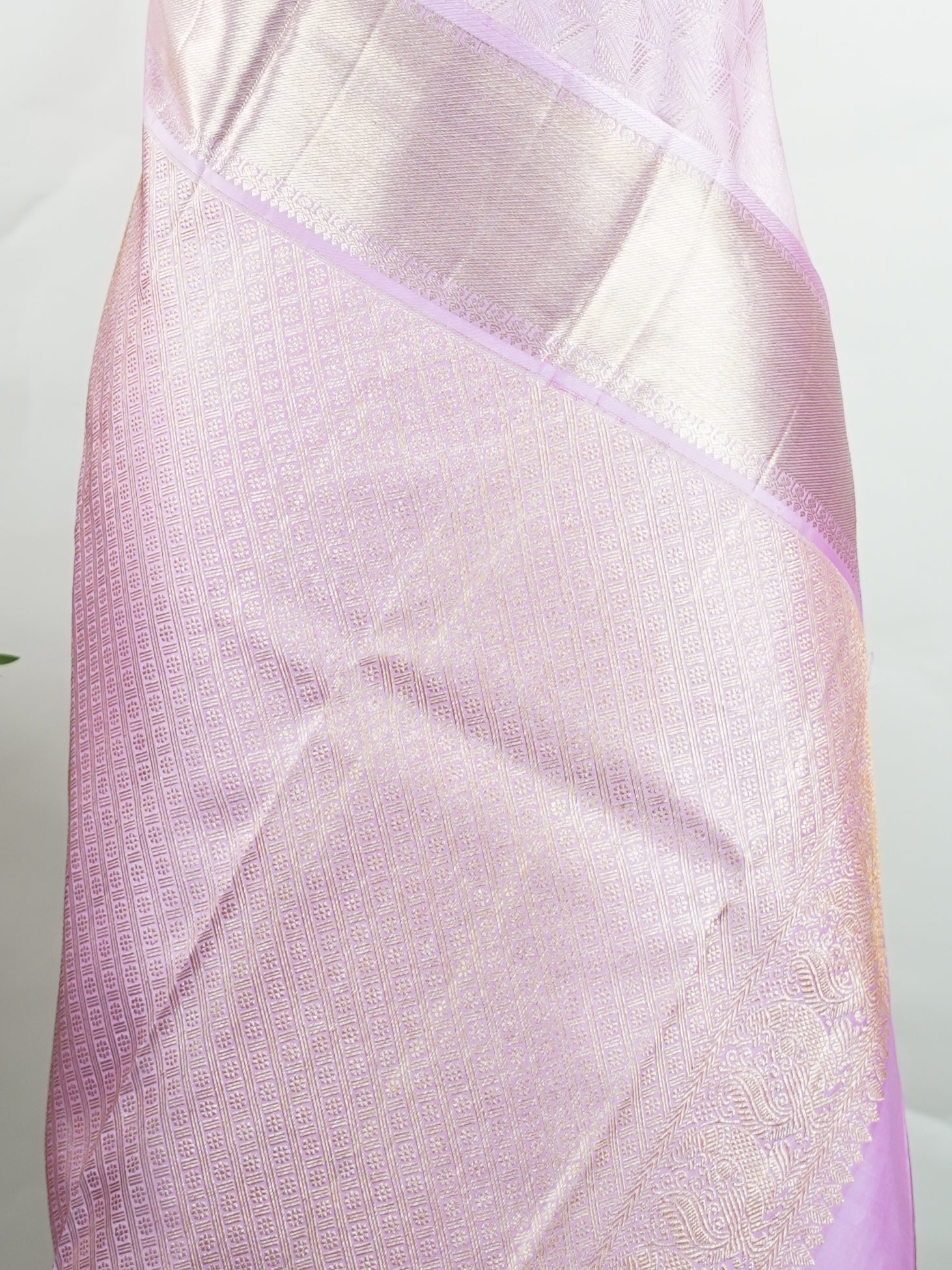 Handwoven by skilled artisans of Kanchipuram, this Kanjivaram saree in Peach Pink blends traditional elegance with intricate Pure Zari zari work. A truly stunning drape for special occasions. The interplay of colors and craftsmanship makes it a treasured piece for every saree connoisseur.