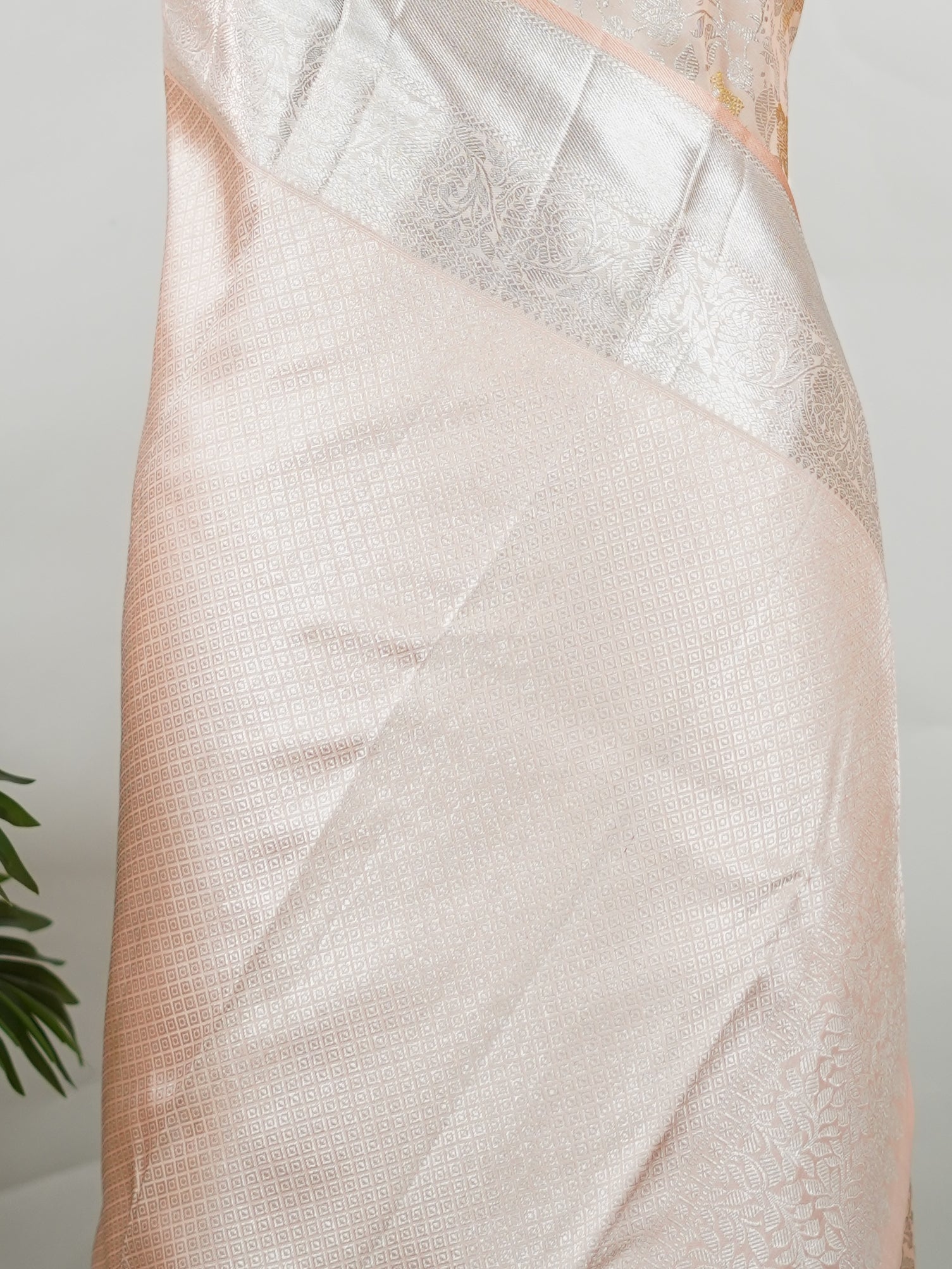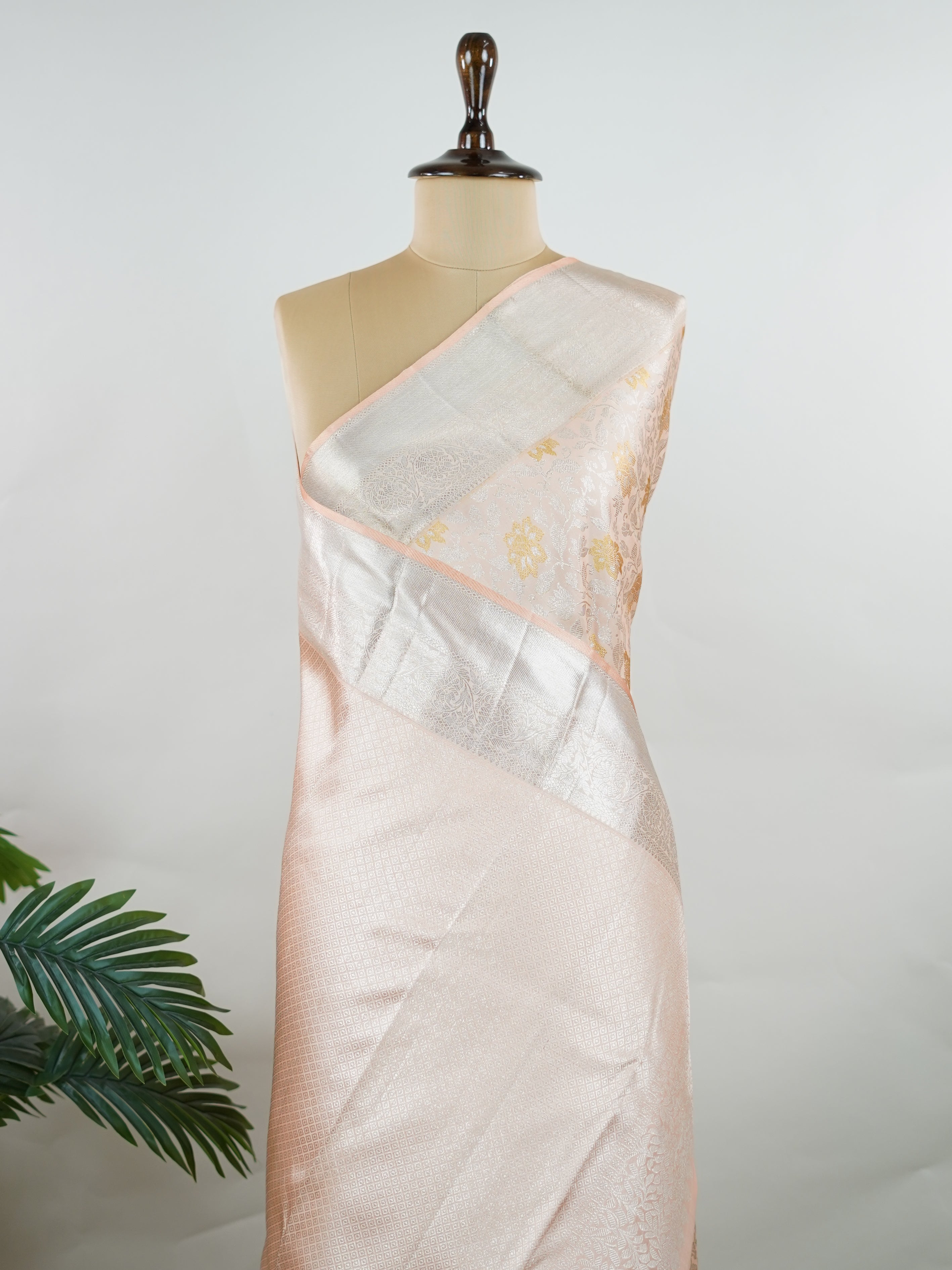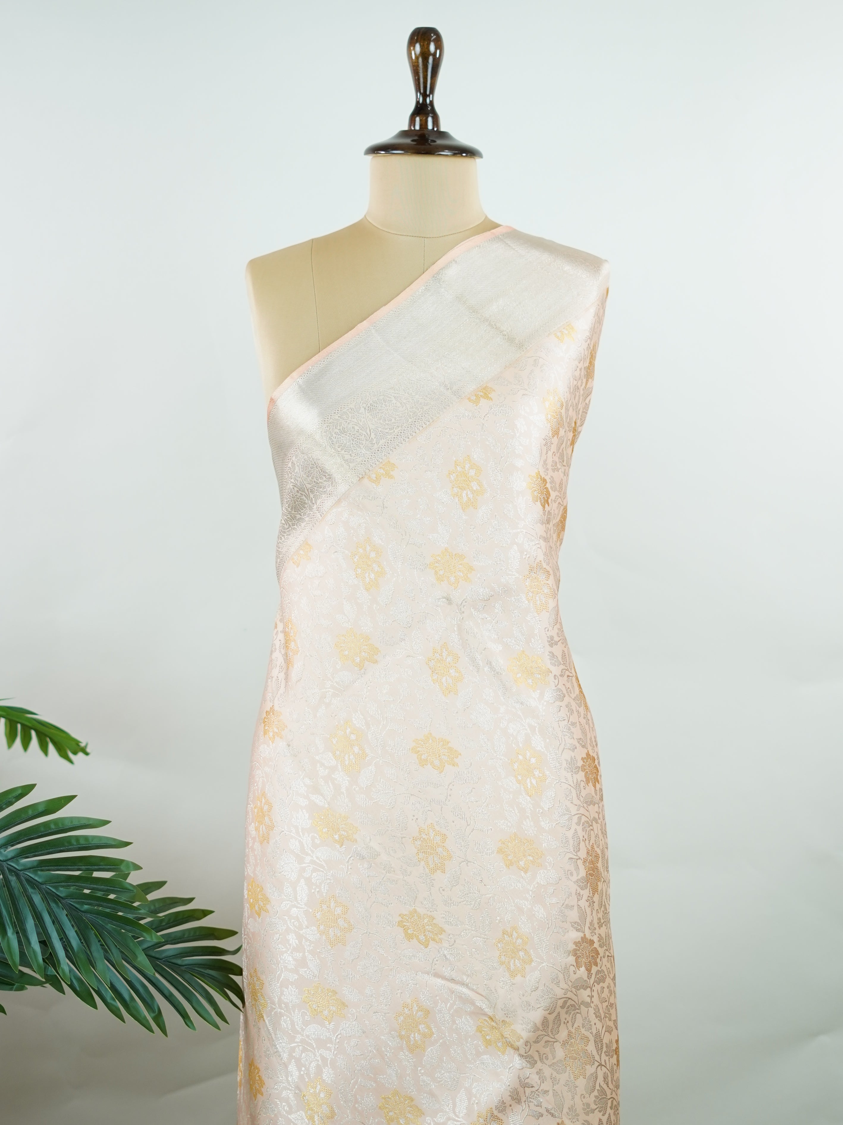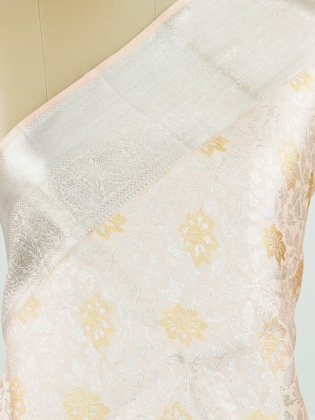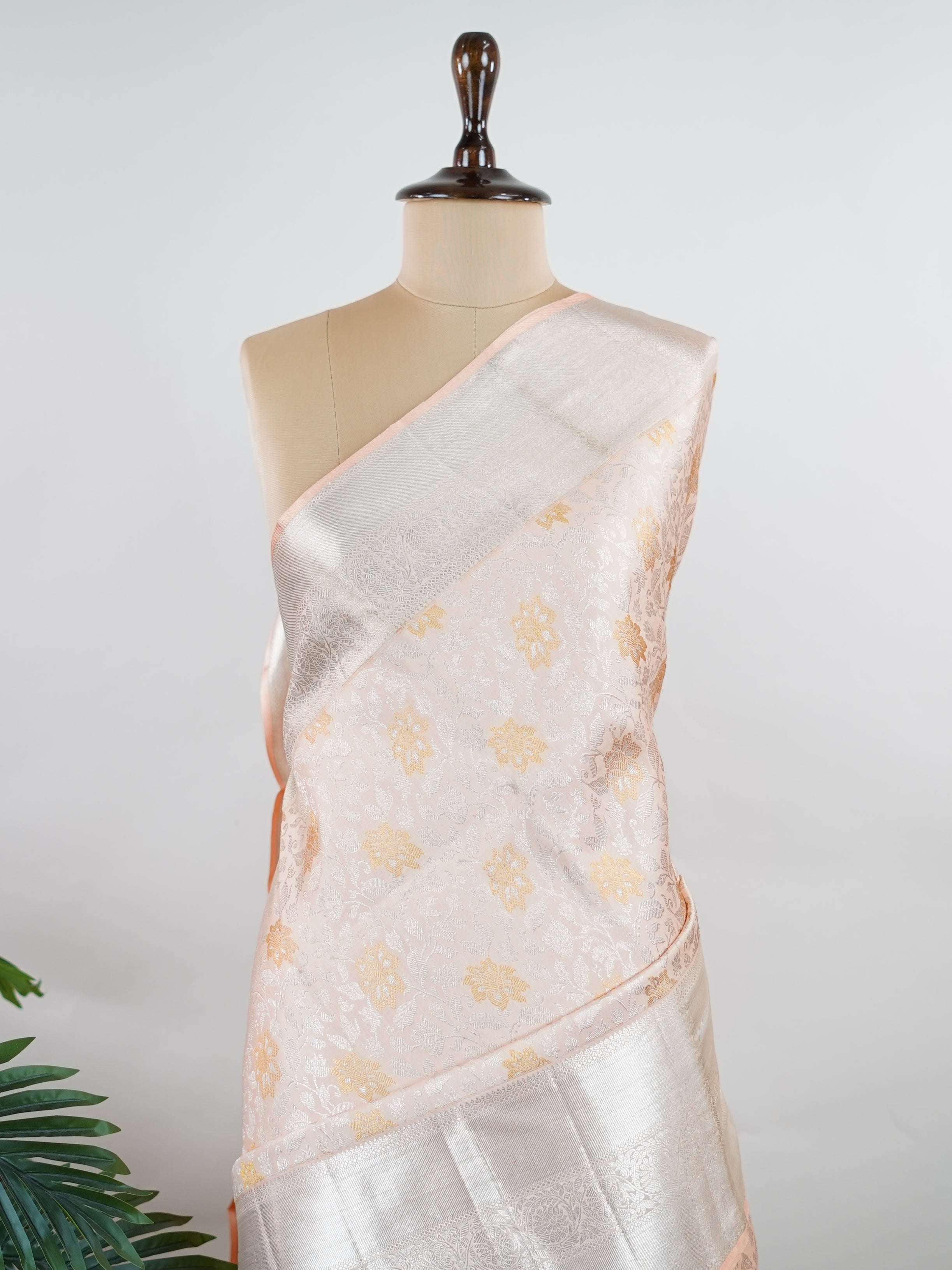 A masterpiece from Kanchipuram, this Kanjivaram saree in Ivory is a tribute to India's rich handloom legacy. The Pure Zari weaving and Buttis motifs make it a perfect choice for brides and celebrations. Every thread speaks of elegance, tradition, and the skilled hands that bring this saree to life.