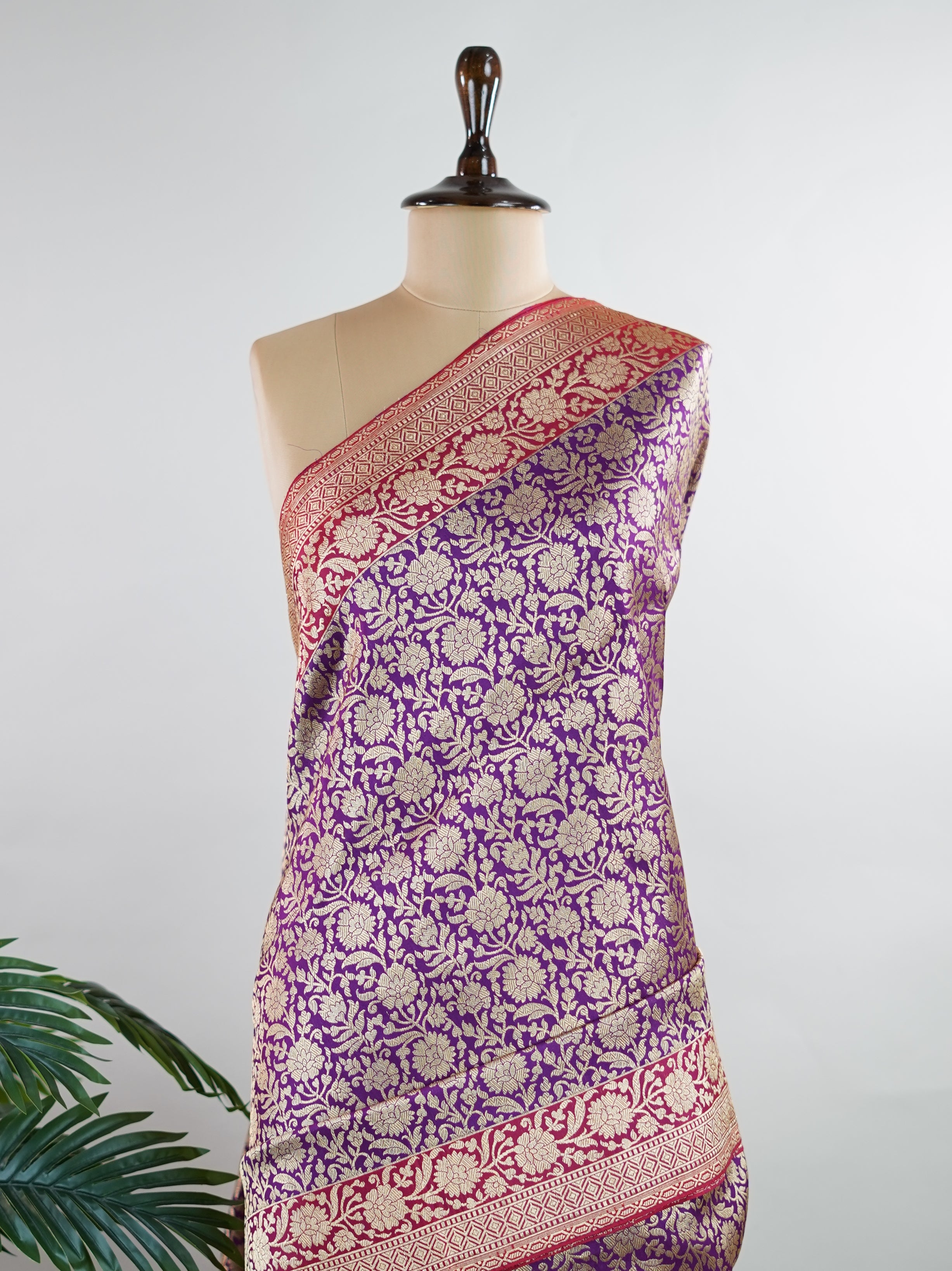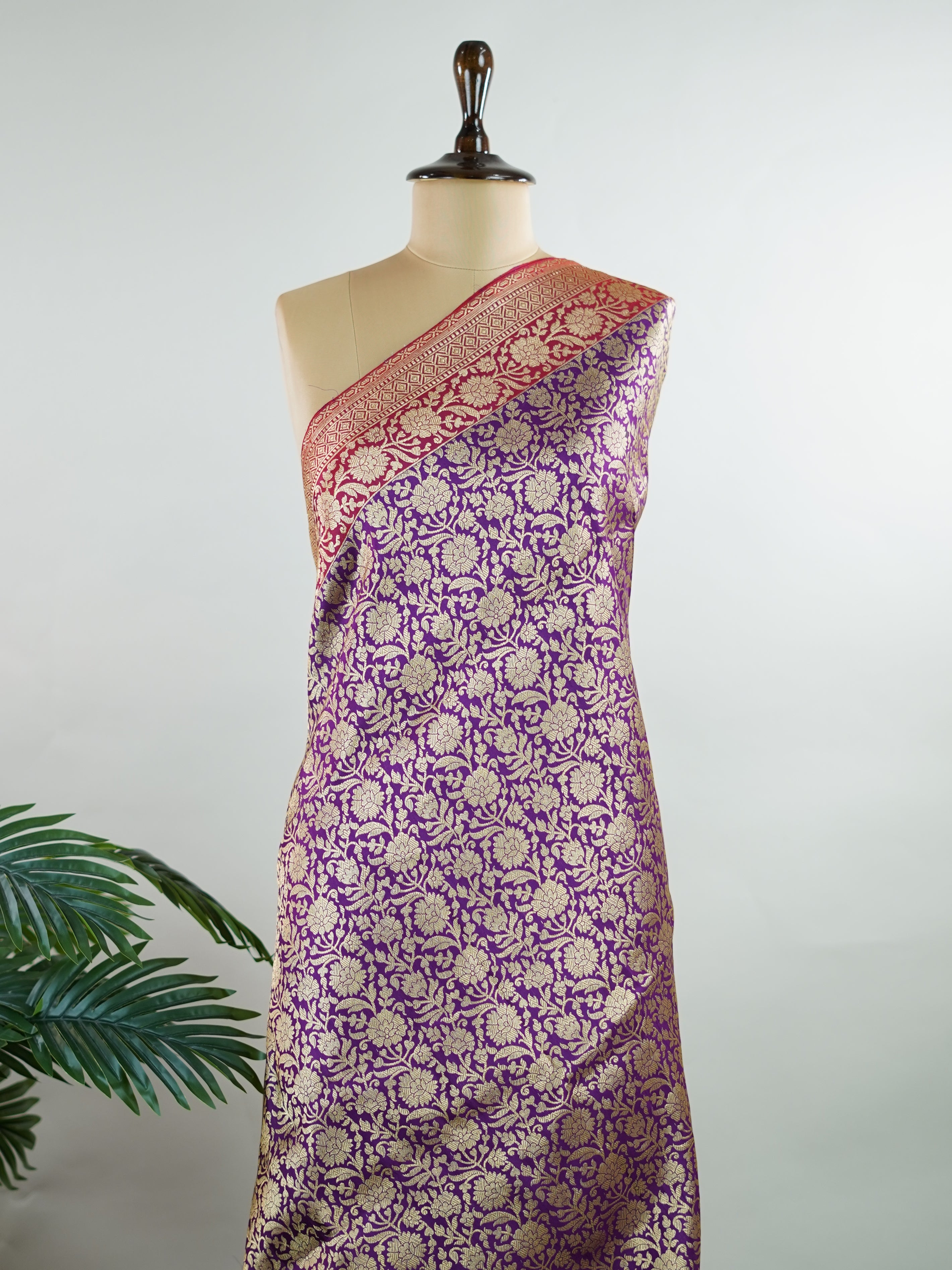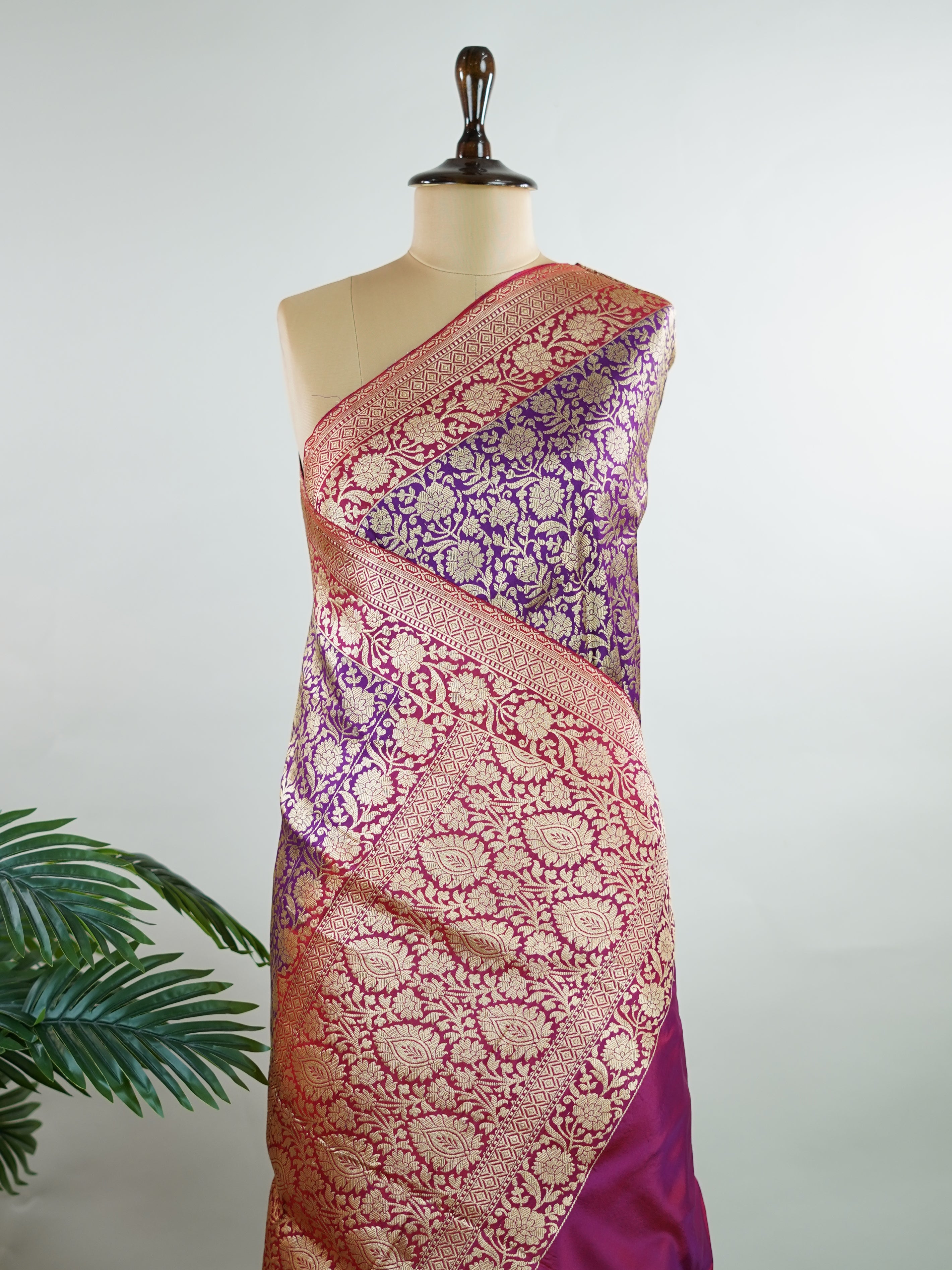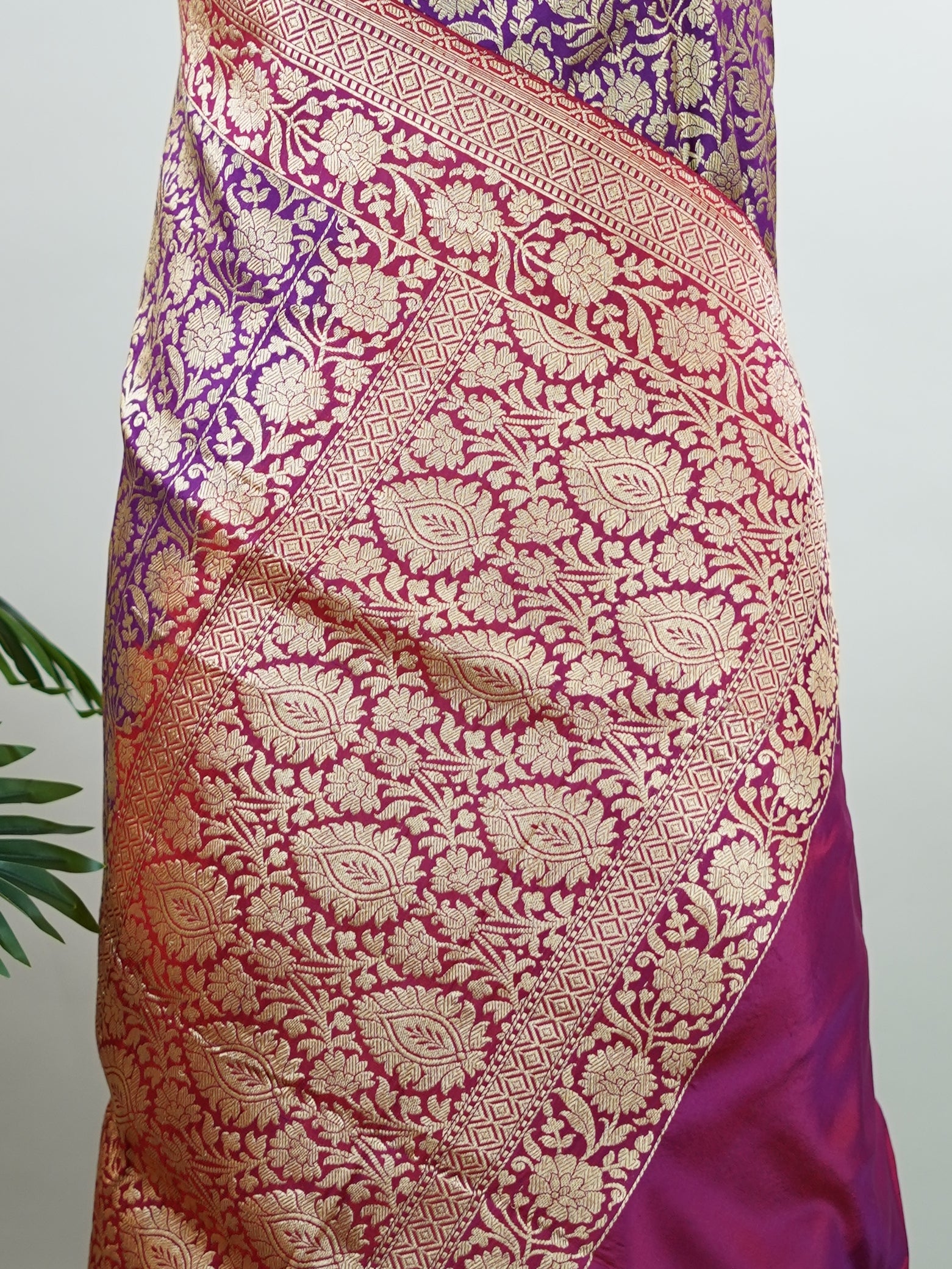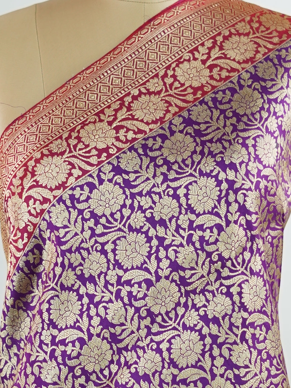 This stunning saree, Vidhya, is made from 100% pure Katan silk, known for its luxurious softness and brilliance. Adorned with intricate Zari work, it displays a captivating blend of colours that represent wisdom and knowledge. Ideal for cultural celebrations, this handloom creation showcases the rich tradition of Varanasi weaving. Wrap yourself in this enchanting saree that radiates sophistication and grace.