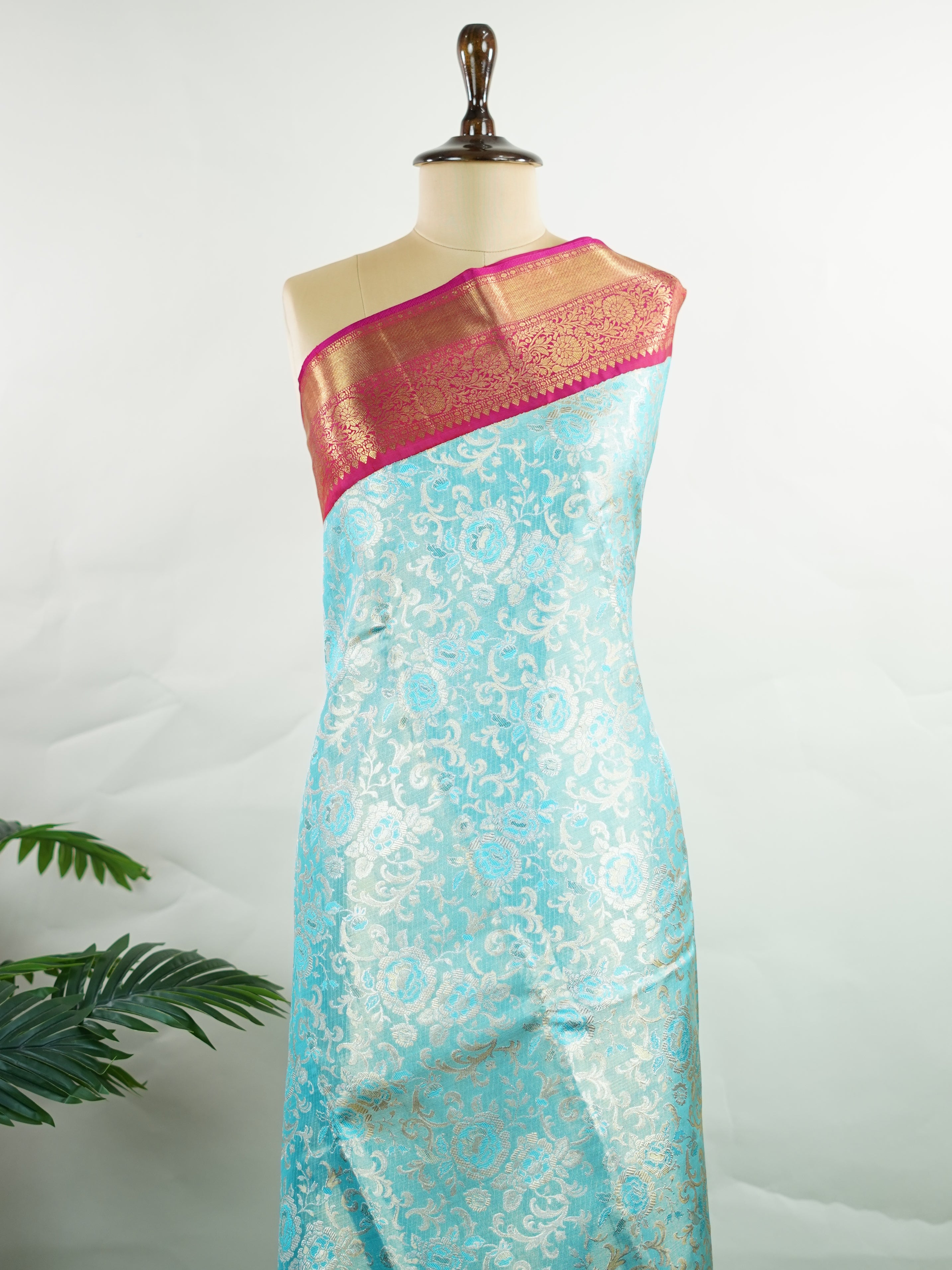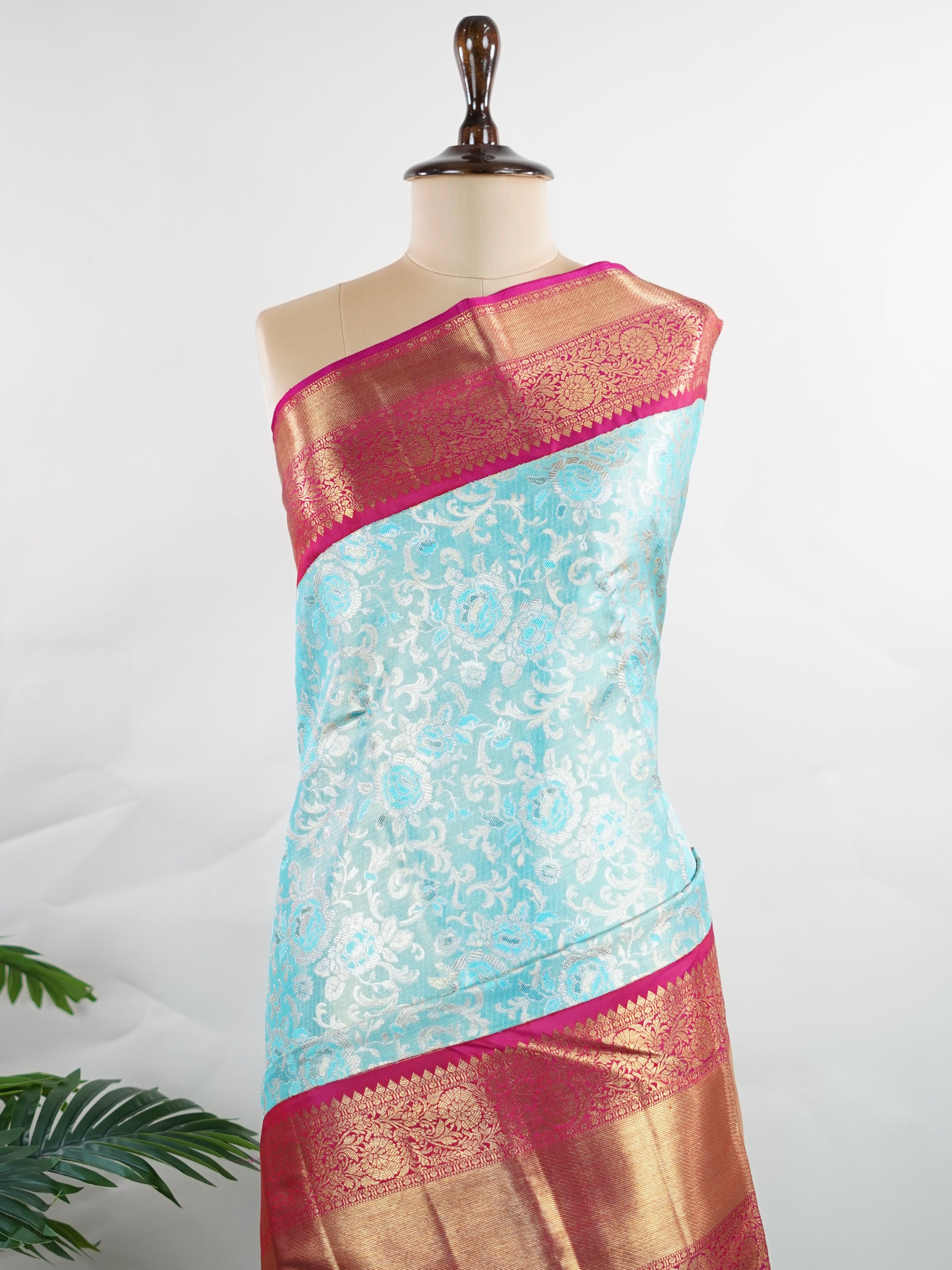 A masterpiece from Maharashtra, this 100% Pure Silk saree in Aqua Green is a tribute to India's rich handloom legacy. The Pure Zari weaving and Buttis motifs make it a perfect choice for brides and celebrations. Every thread speaks of elegance, tradition, and the skilled hands that bring this saree to life.