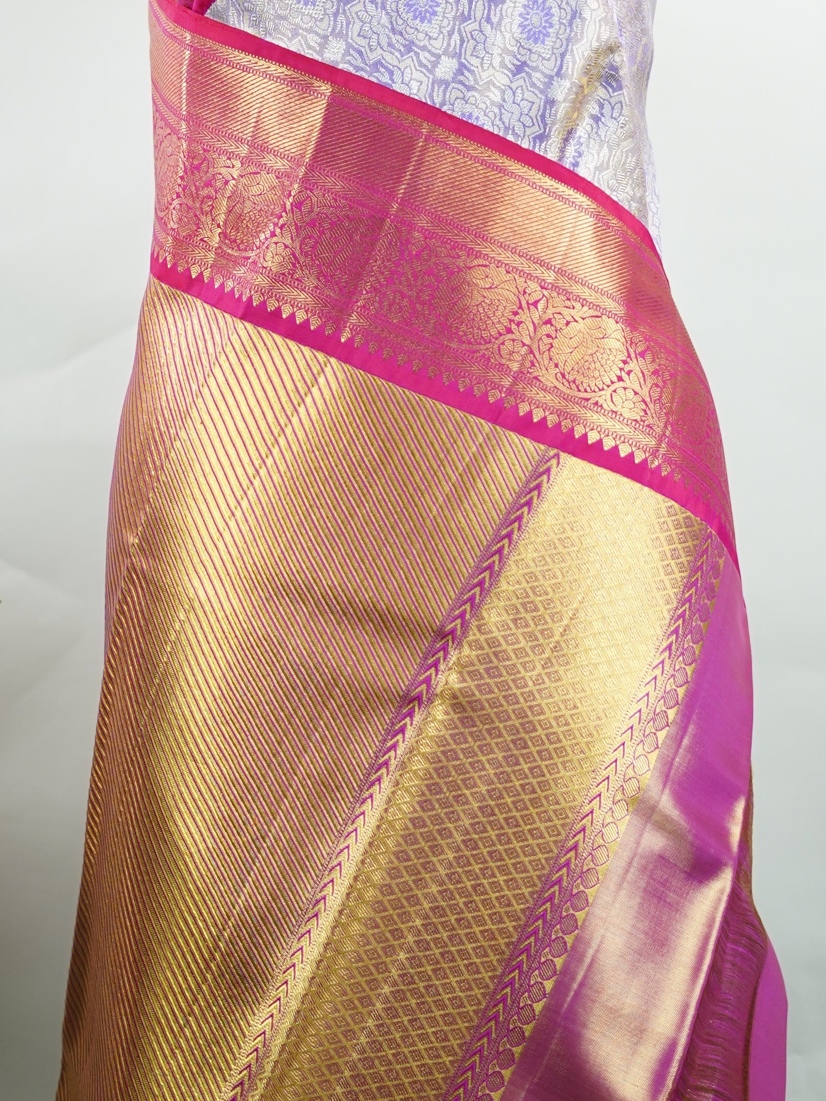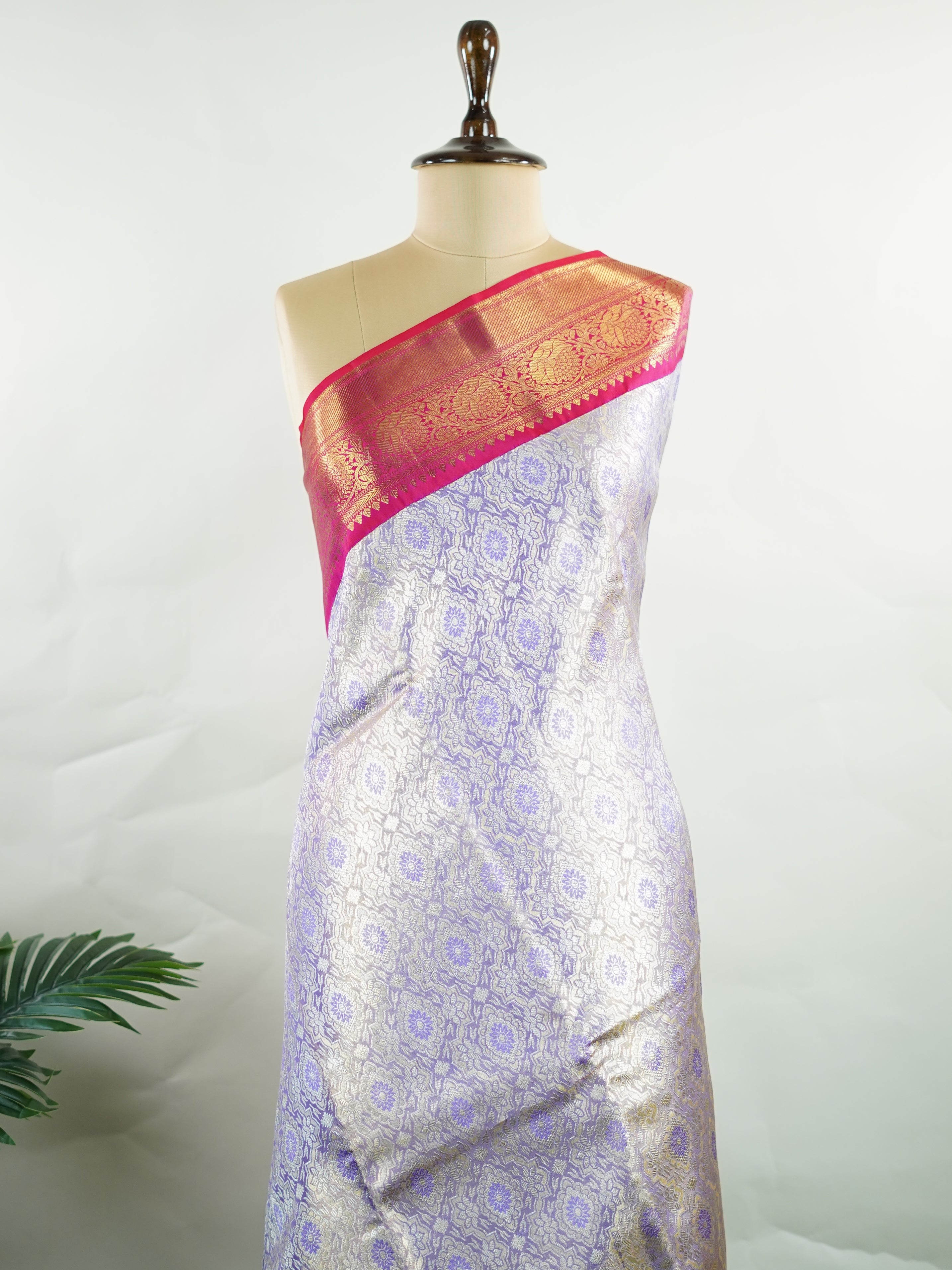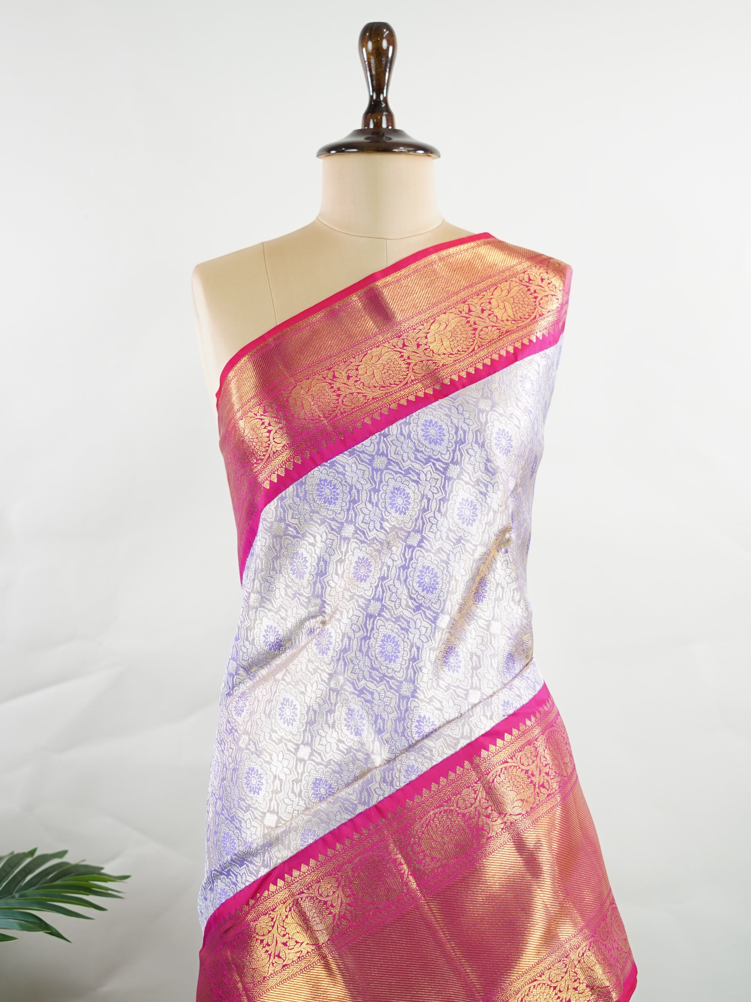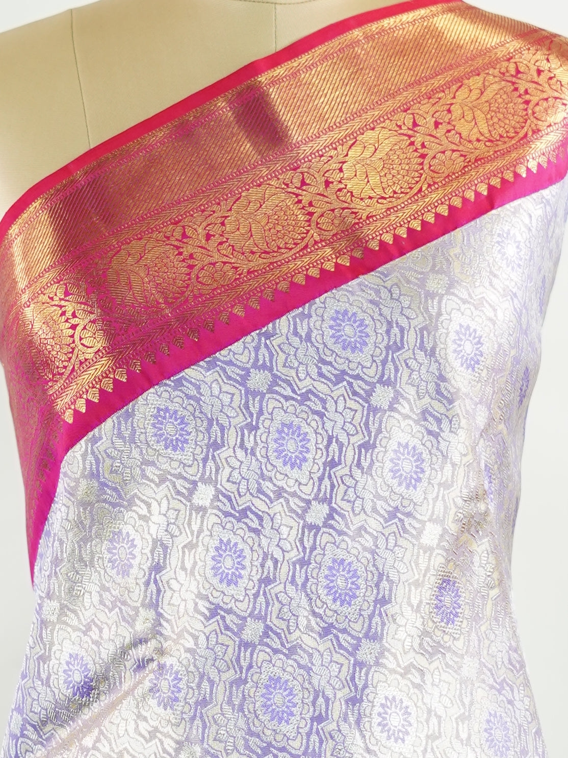 Handwoven by skilled artisans of Maharashtra, this 100% Pure Silk saree in Lilac blends traditional elegance with intricate Pure Zari zari work. A truly stunning drape for special occasions. The interplay of colors and craftsmanship makes it a treasured piece for every saree connoisseur.