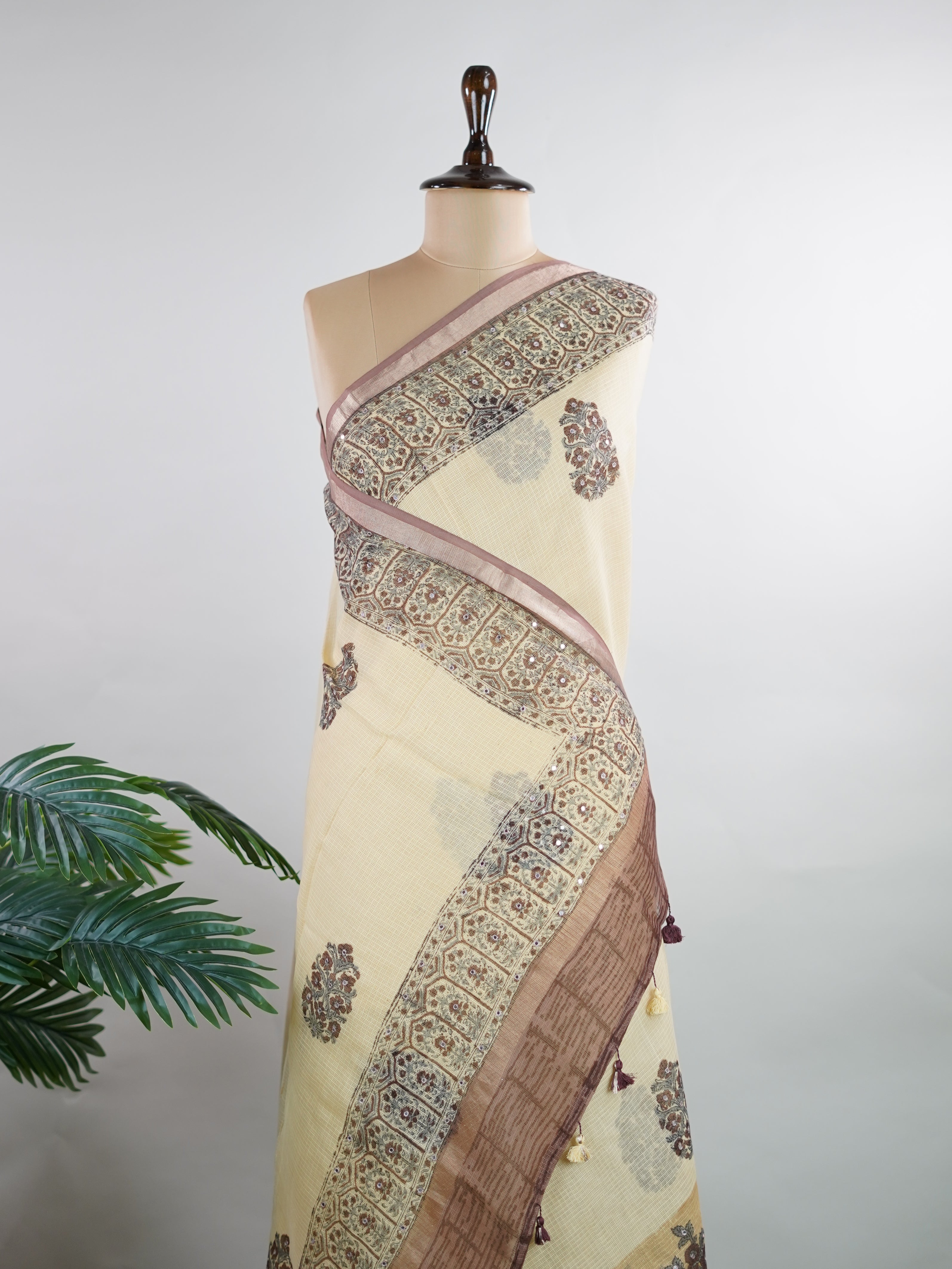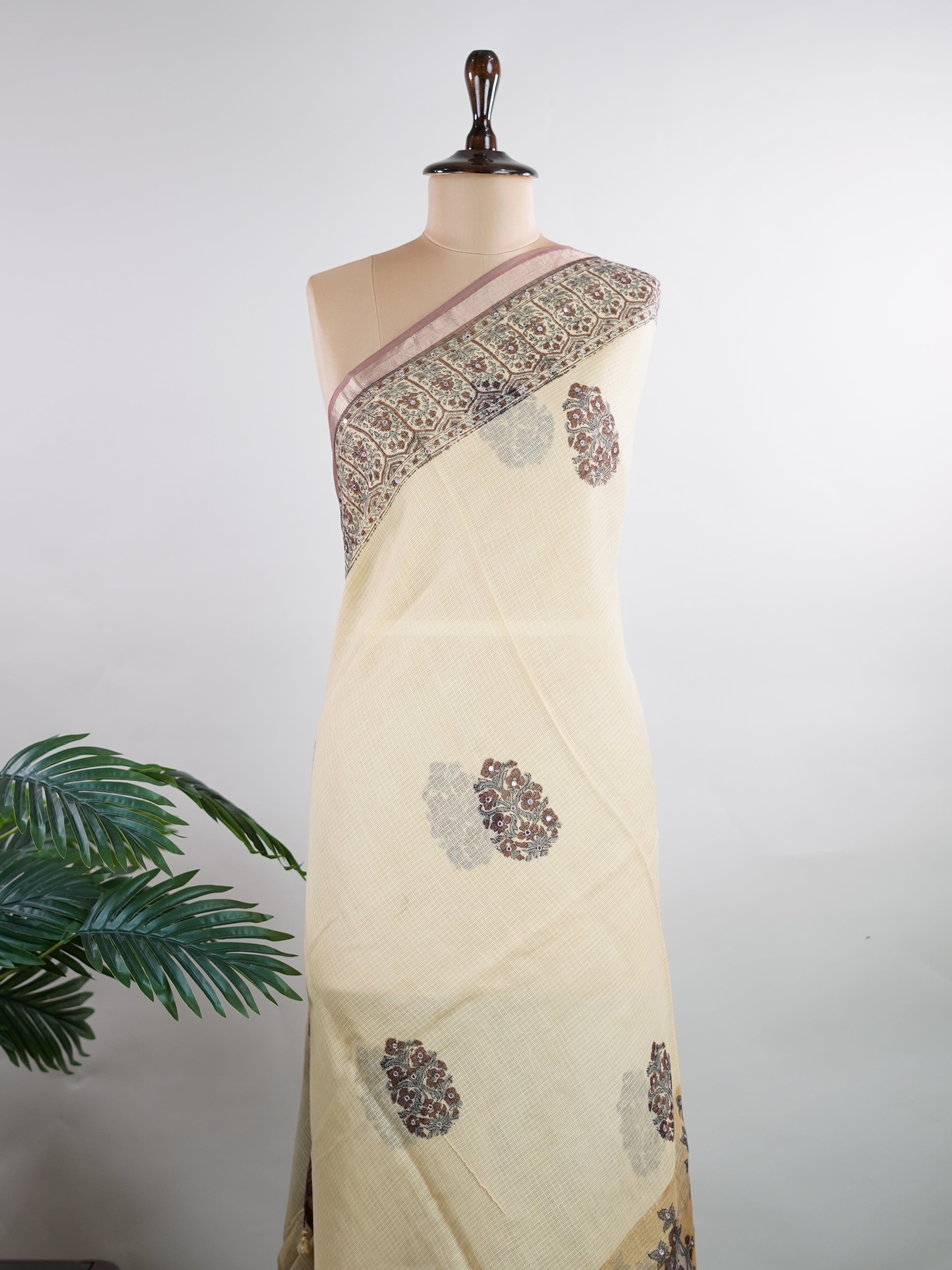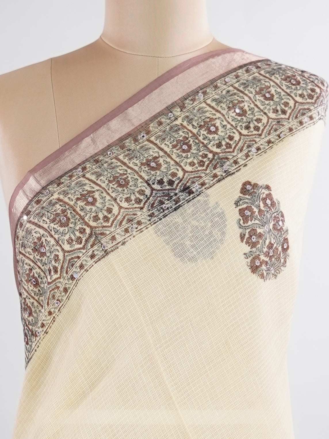 A breezy Cotton Kota Doria saree adorned with delicate handblock prints and glistening mirror work—light as air, rich in tradition.
