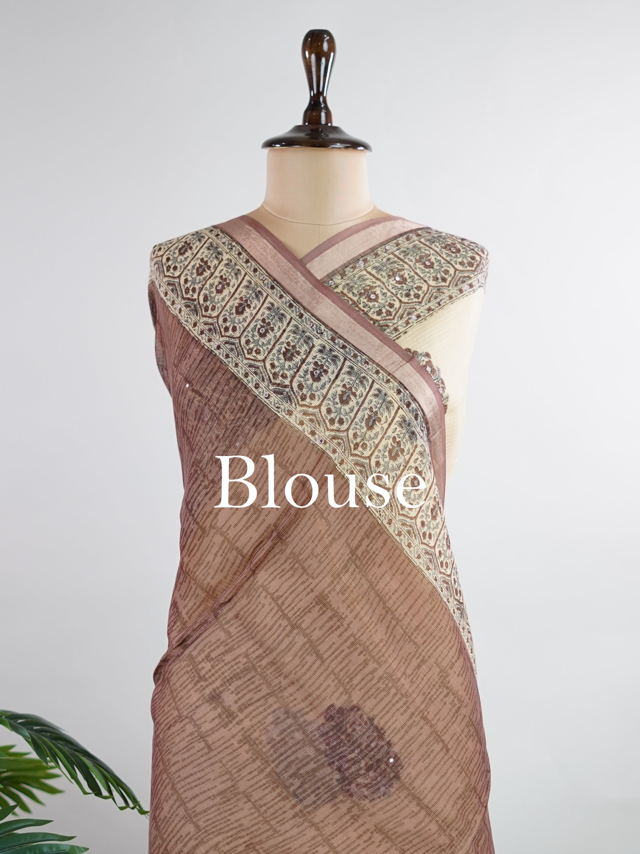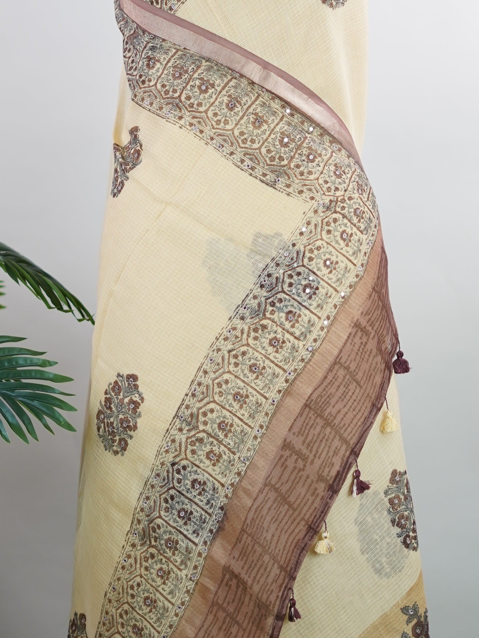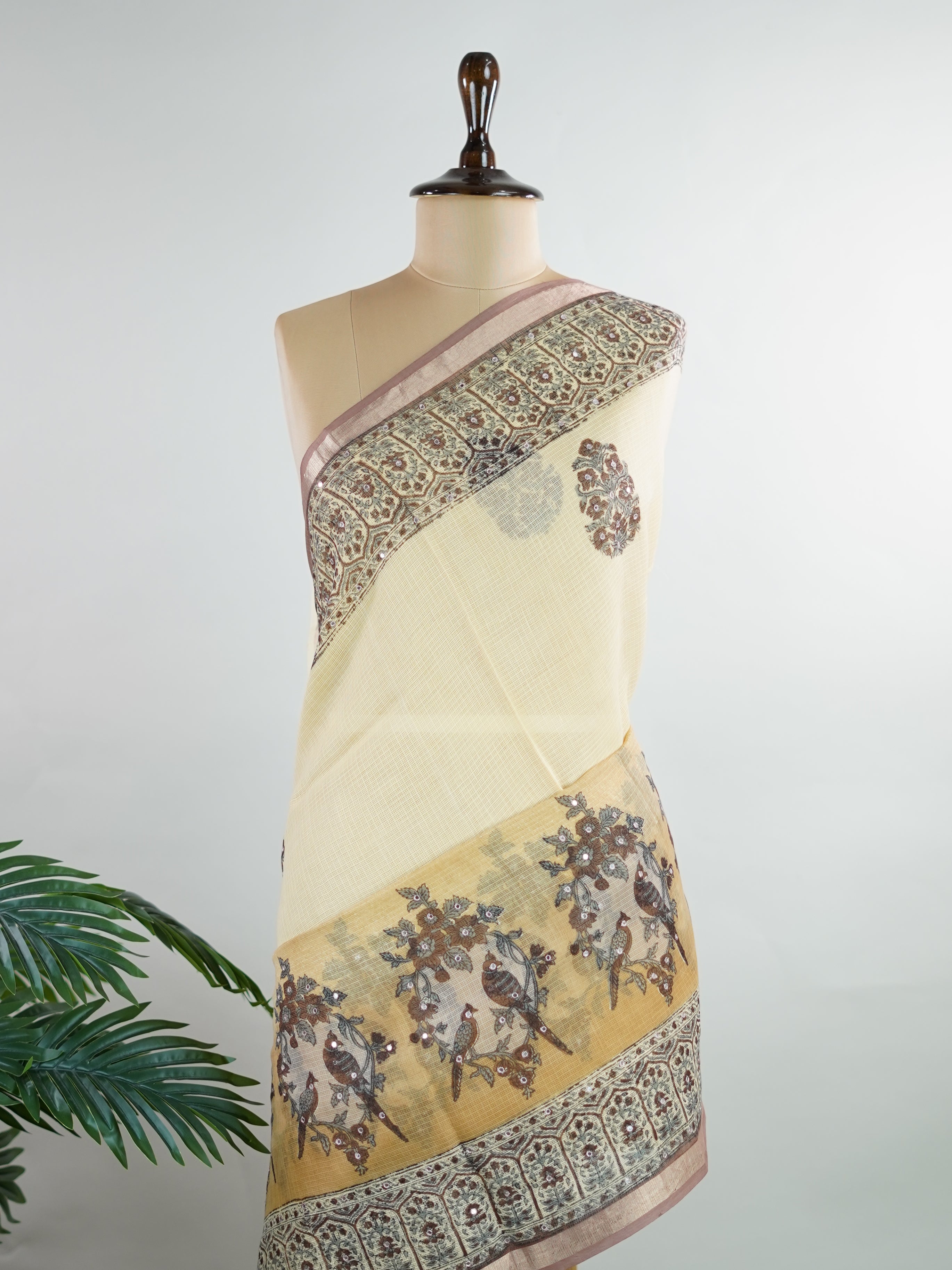 A breezy Cotton Kota Doria saree adorned with delicate handblock prints and glistening mirror work—light as air, rich in tradition.