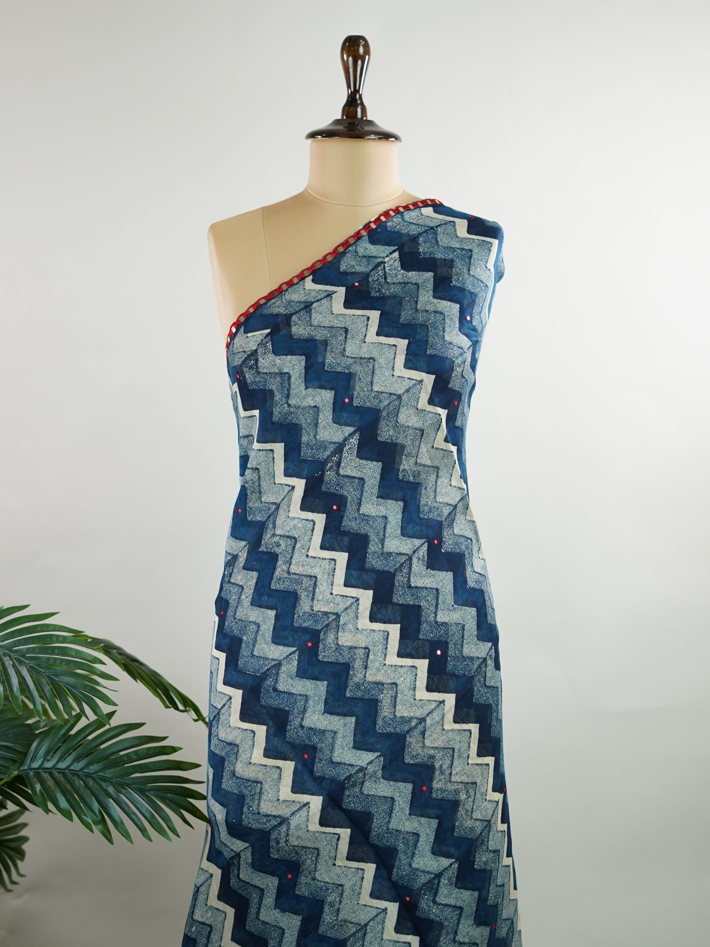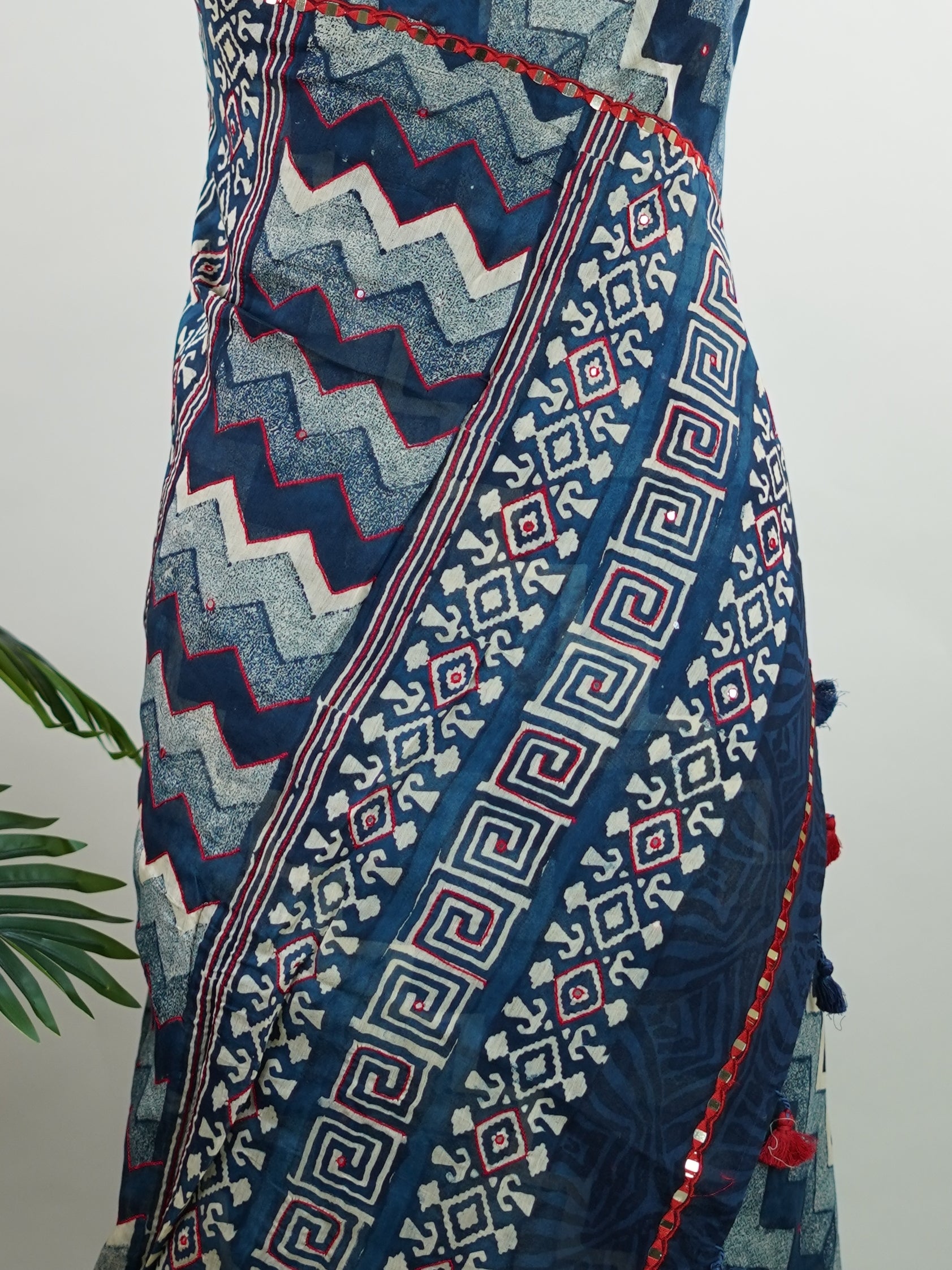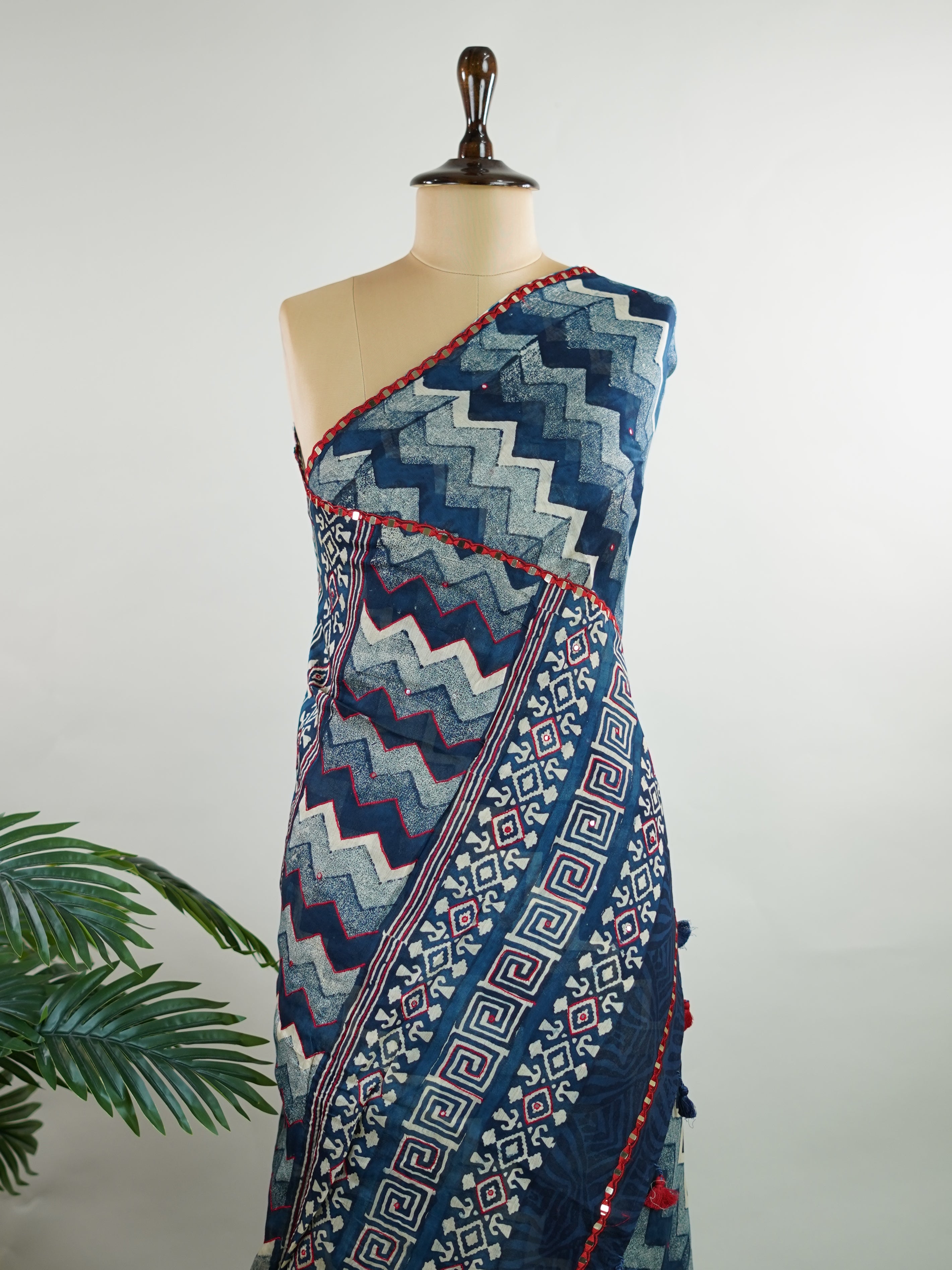 A breezy Cotton Kota Doria saree adorned with delicate handblock prints and glistening mirror work—light as air, rich in tradition.