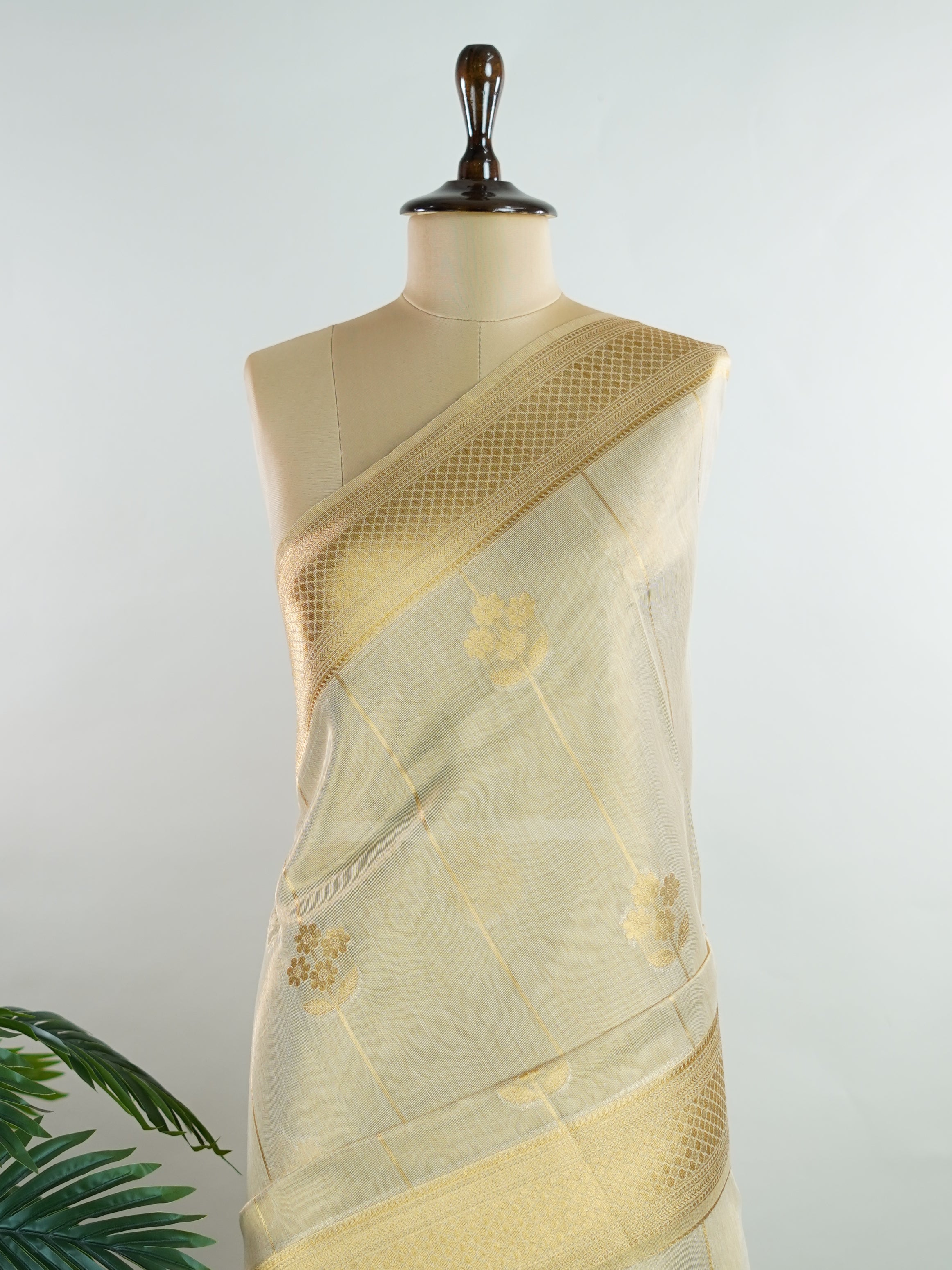 This Kora Semi Tissue saree in rich gold features elegant stripes woven with fine zari. Lightweight and luminous, it captures the essence of festive finesse. Crafted in Varanasi, it drapes with ease and radiance. A timeless choice for celebrations with subtle grandeur. #KoraSemiTissue #GoldStripes #FineZari #VaranasiWeaves #ManoranjithamSarees