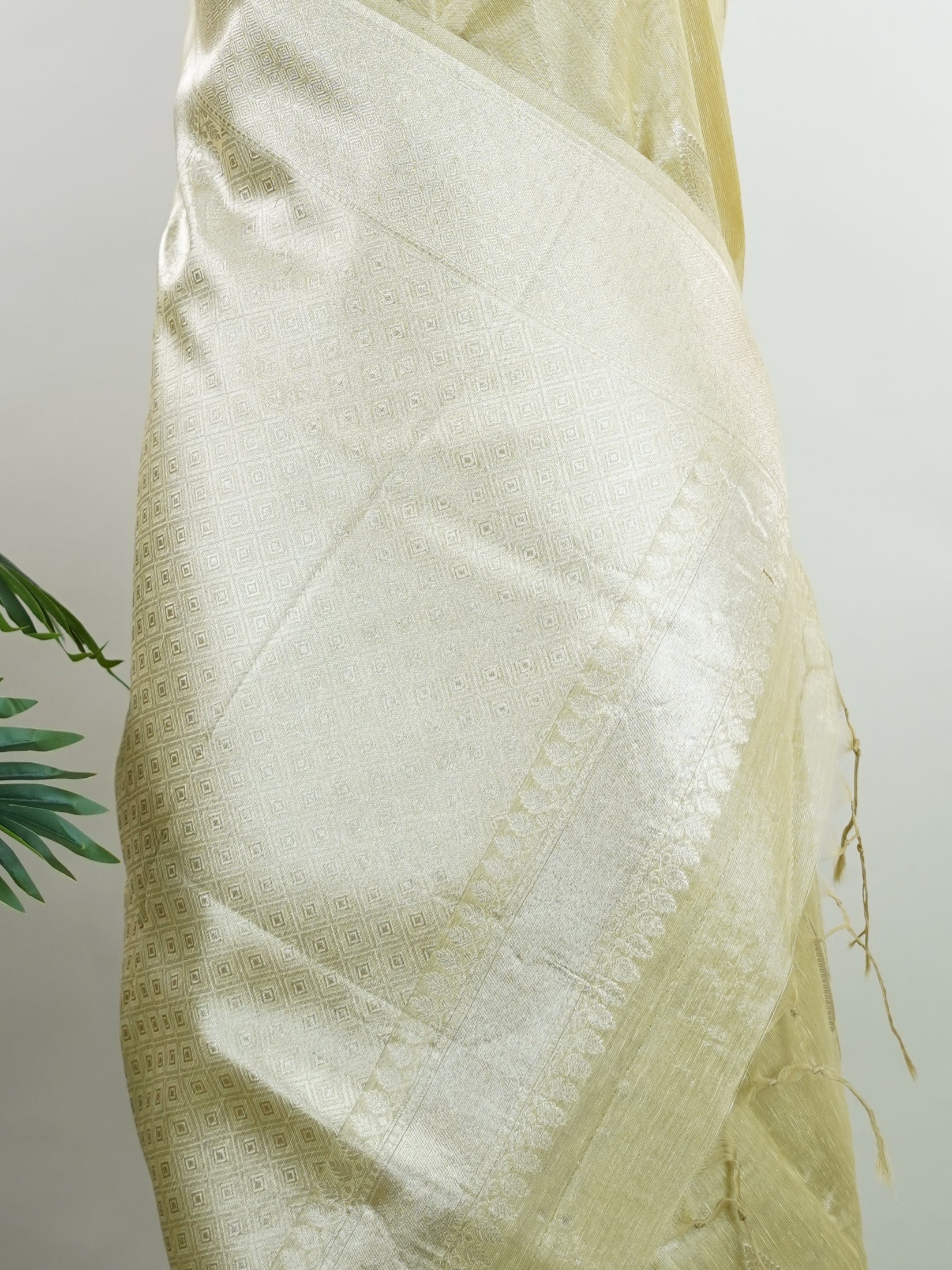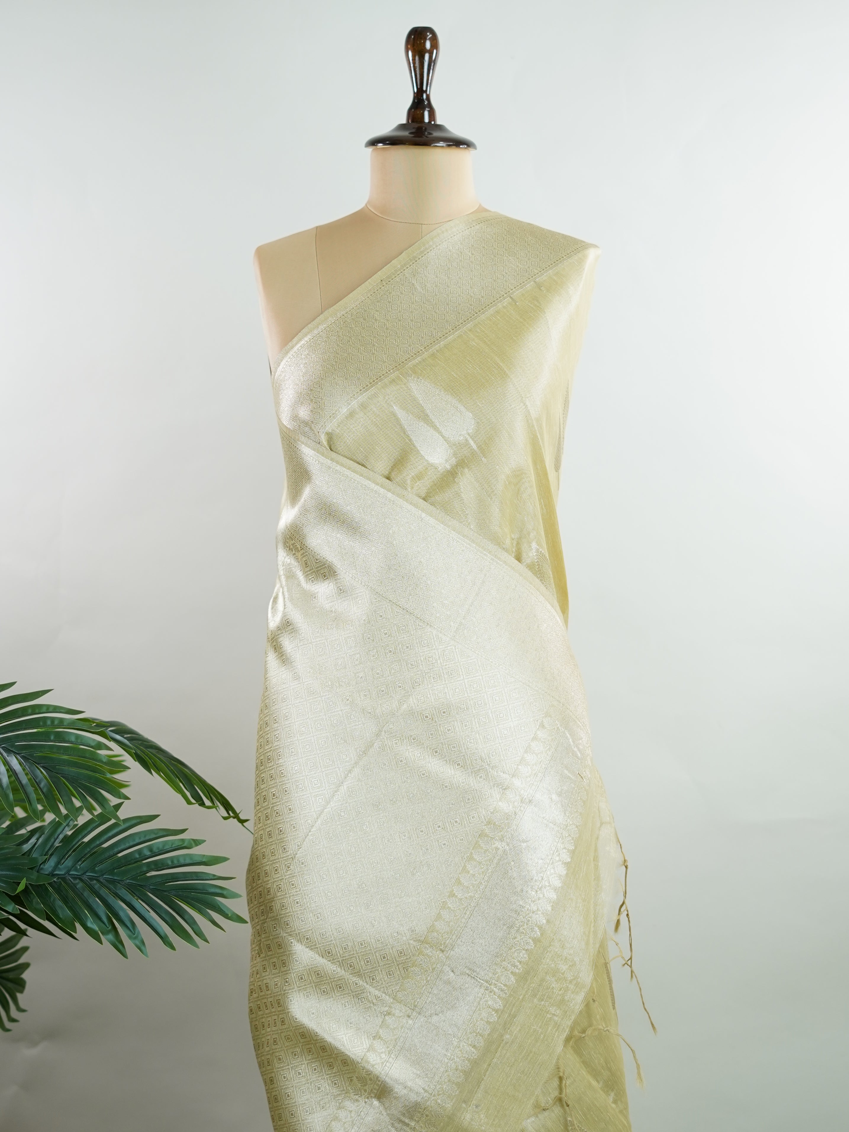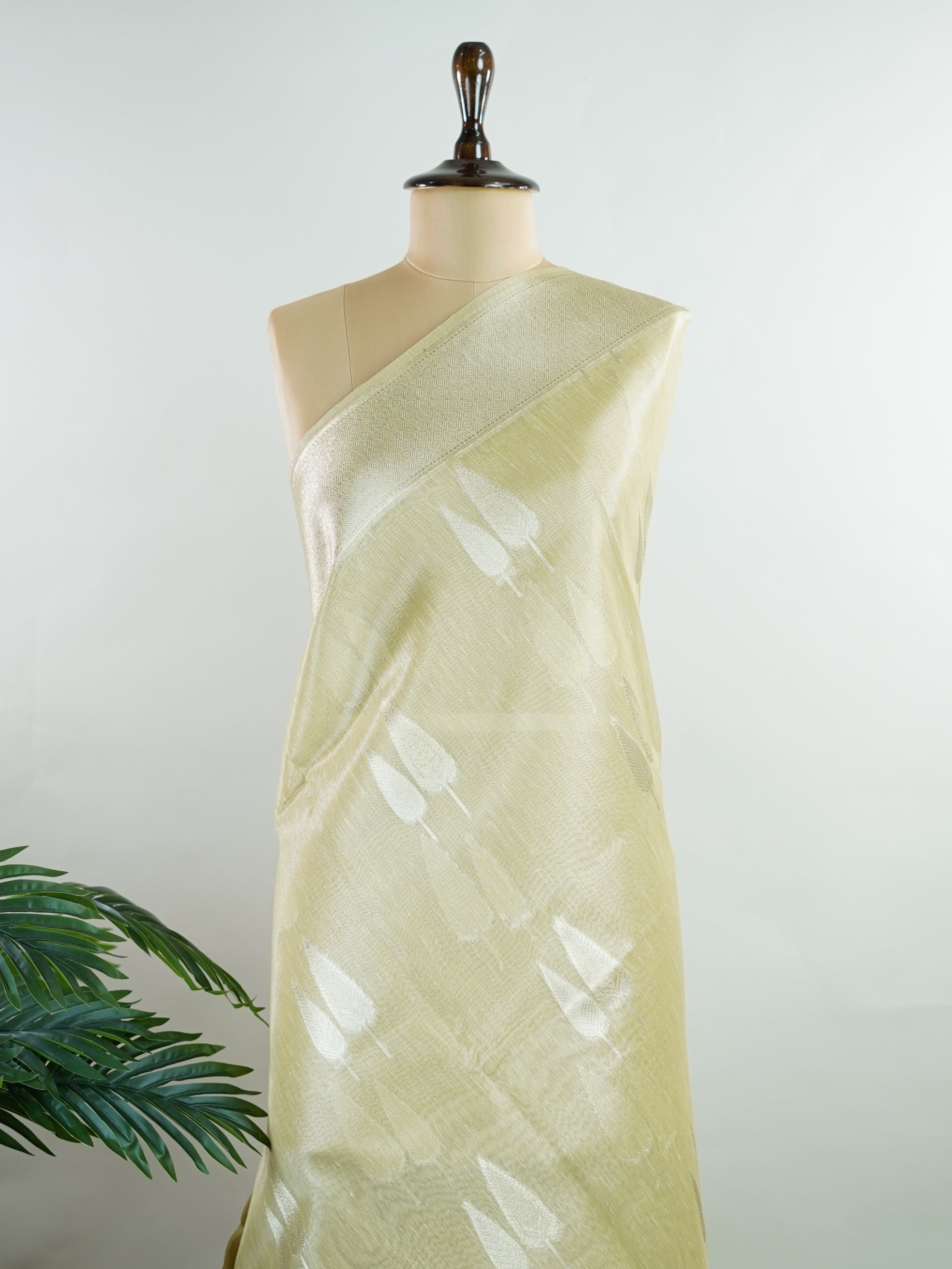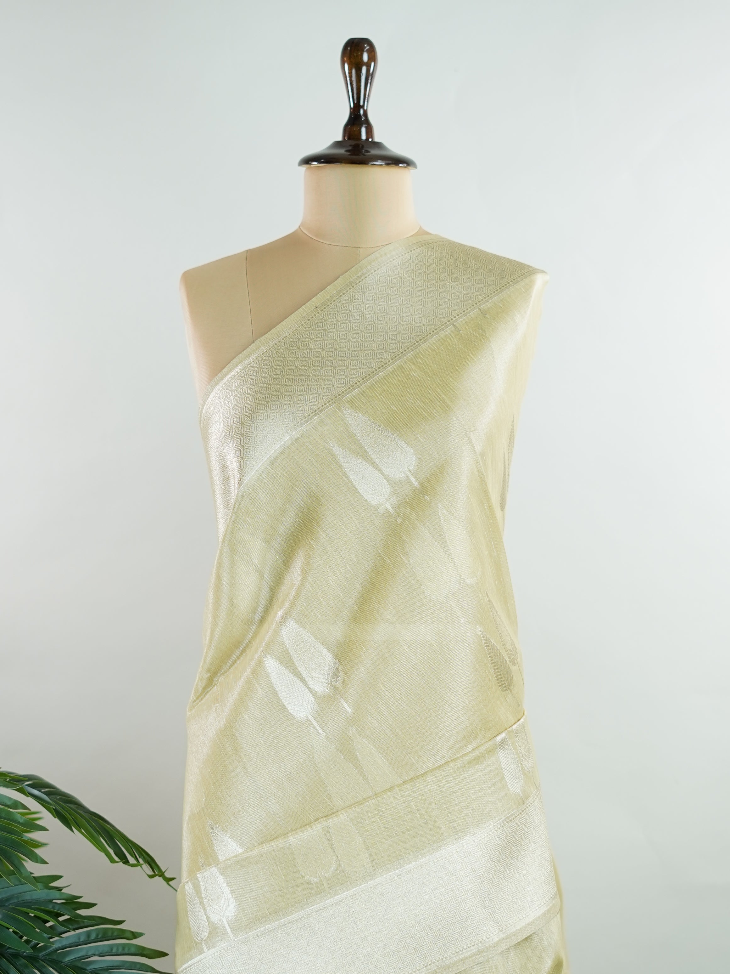 Drenched in gold, this Semi Tissue saree shimmers with floral weave detailing and fine zari. Its lightweight texture and luminous finish make it a festive favourite. Crafted in Varanasi, it carries elegance in every thread. Ideal for weddings, receptions, and moments that deserve radiance. #SemiTissue #GoldenGlow #FloralWeave #FineZari #ManoranjithamSarees