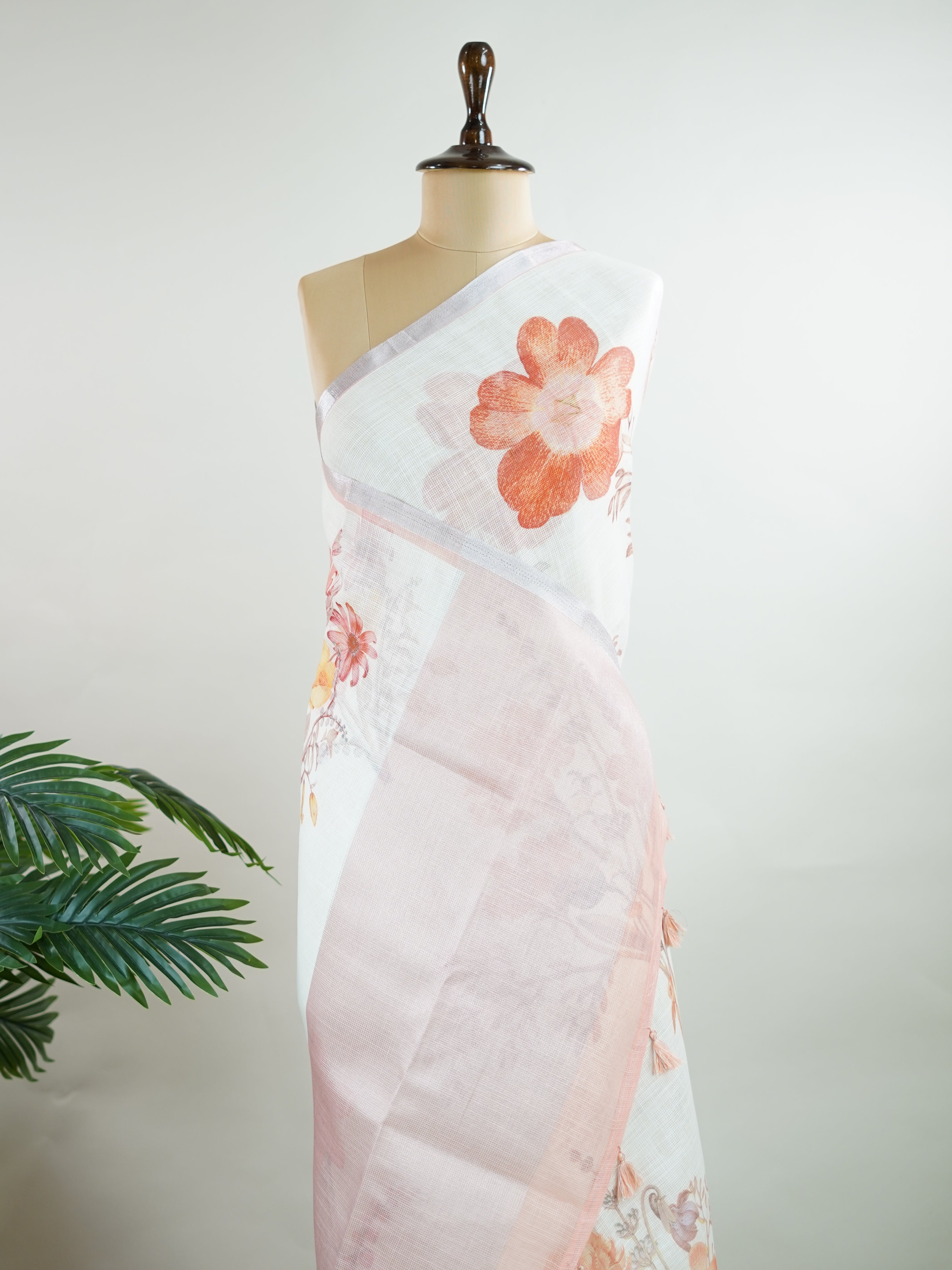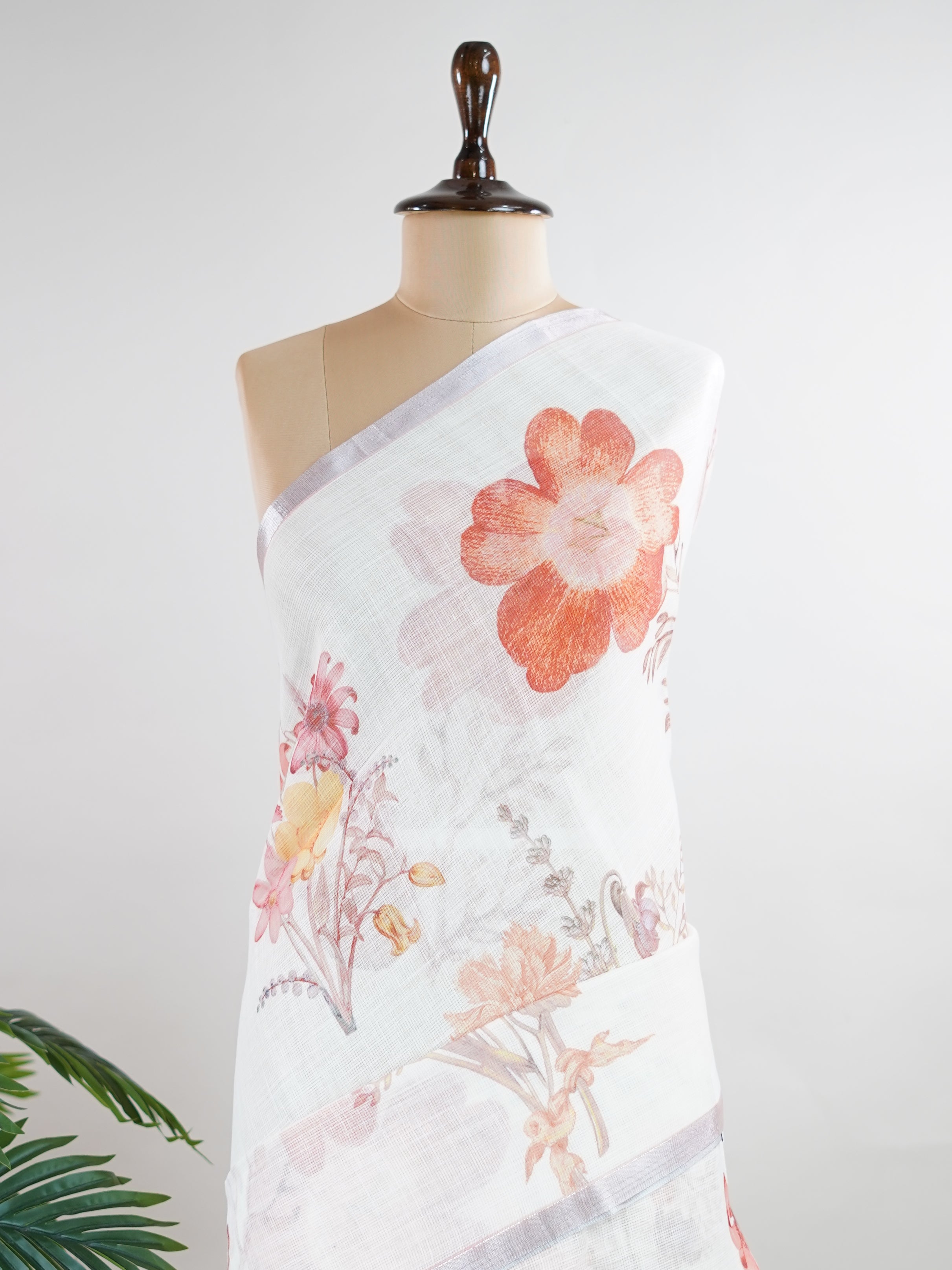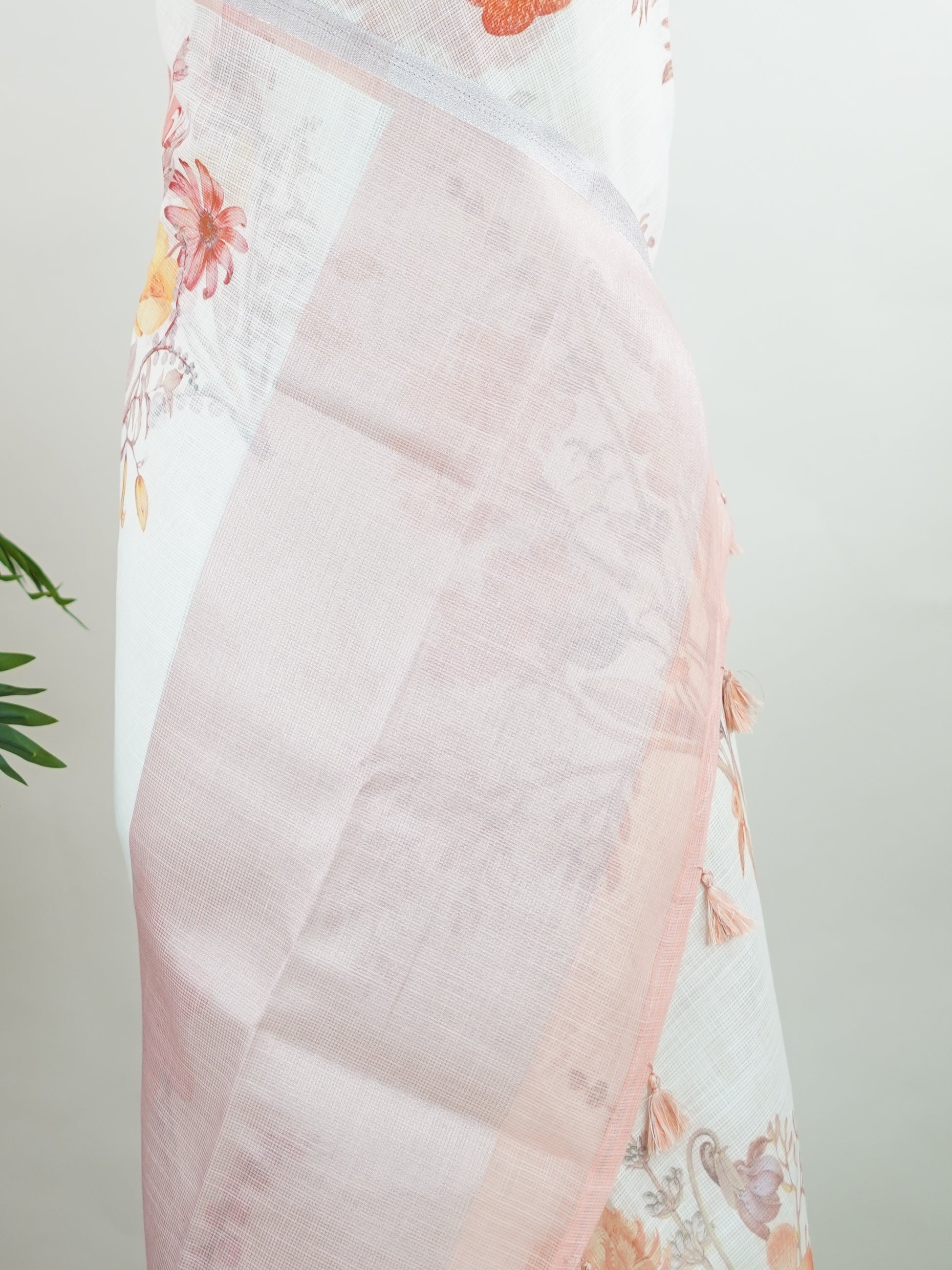 A pristine white base adorned with multicolour floral motifs makes this Silk Kota saree a picture of elegance.