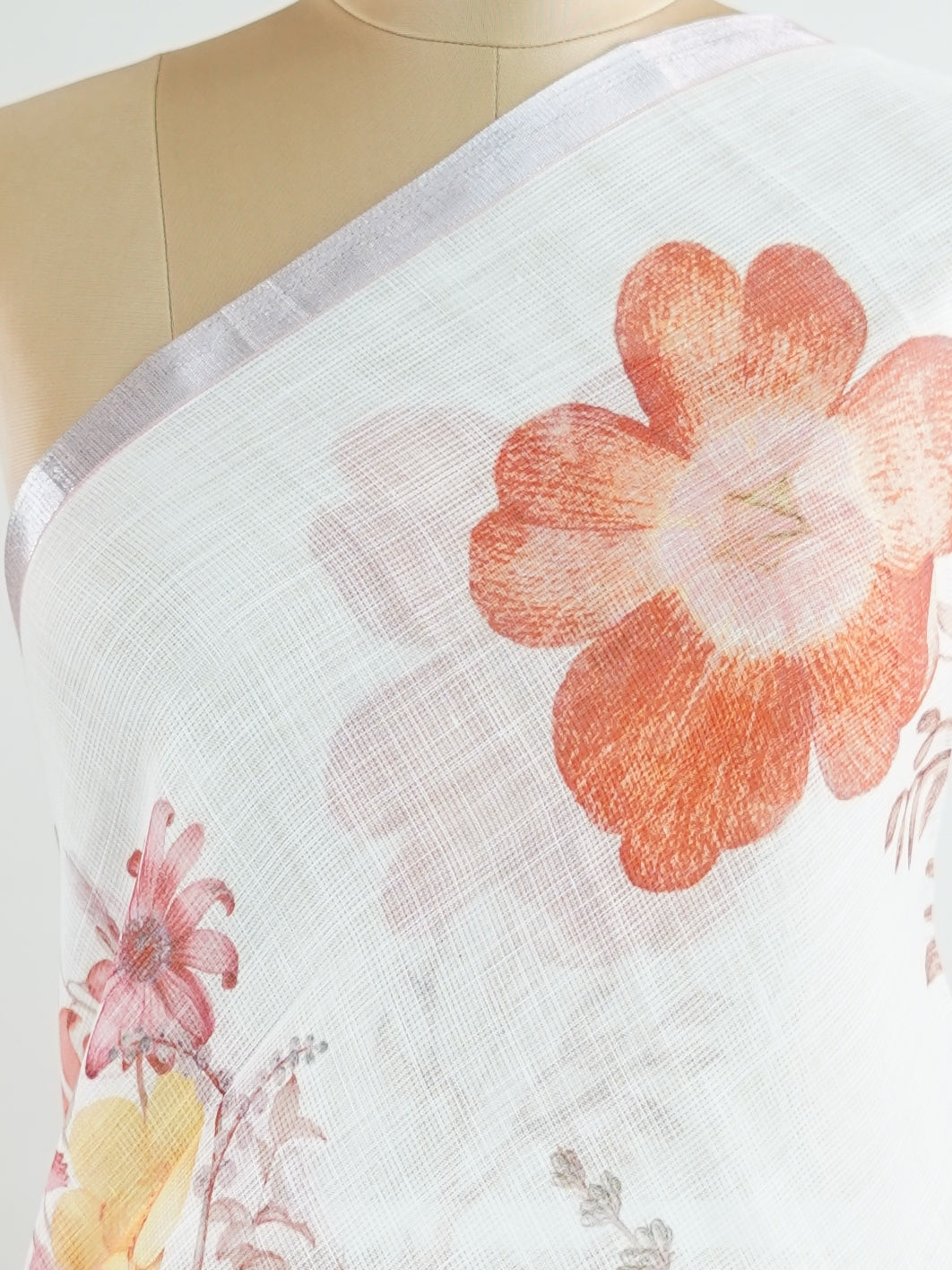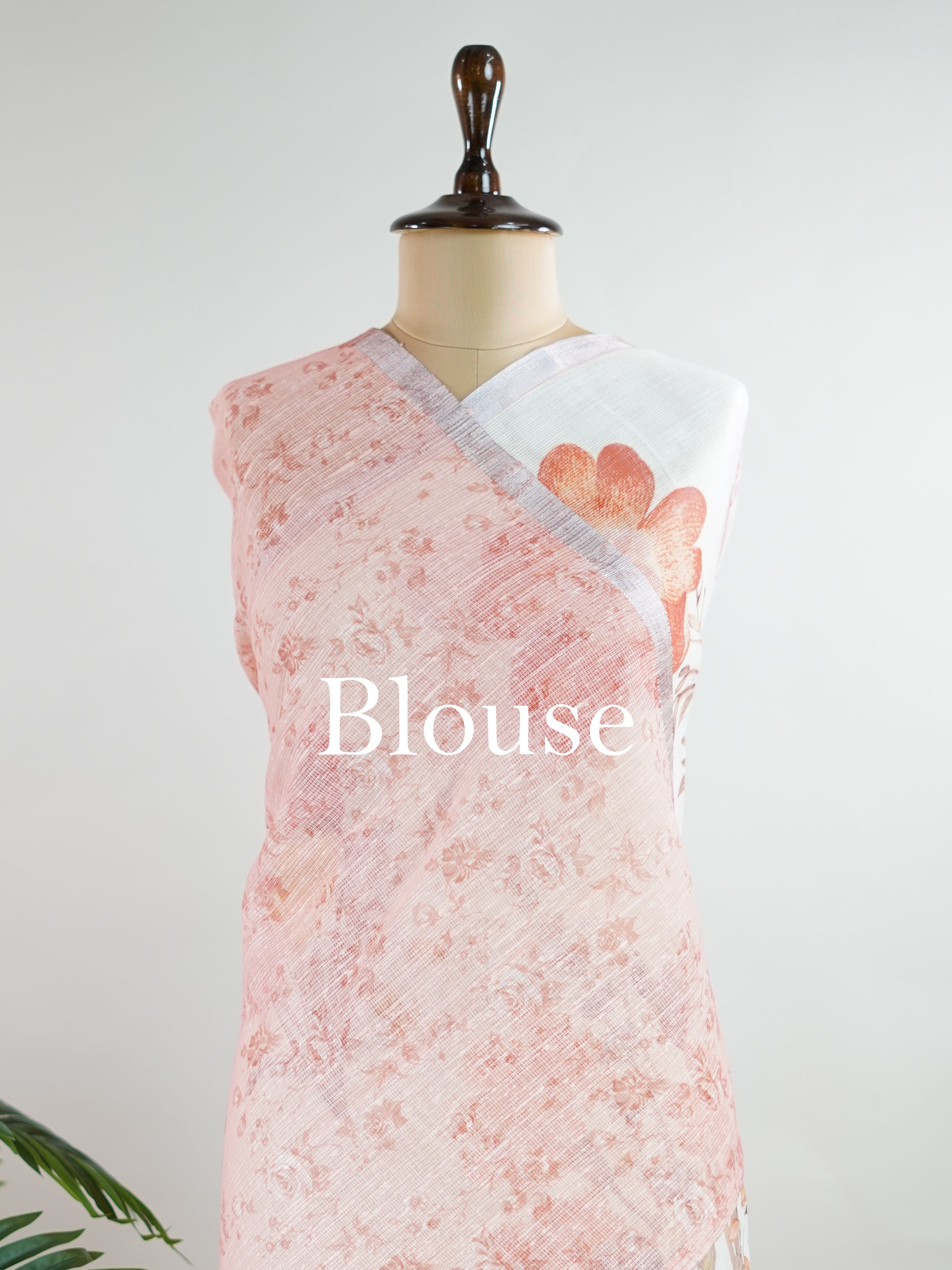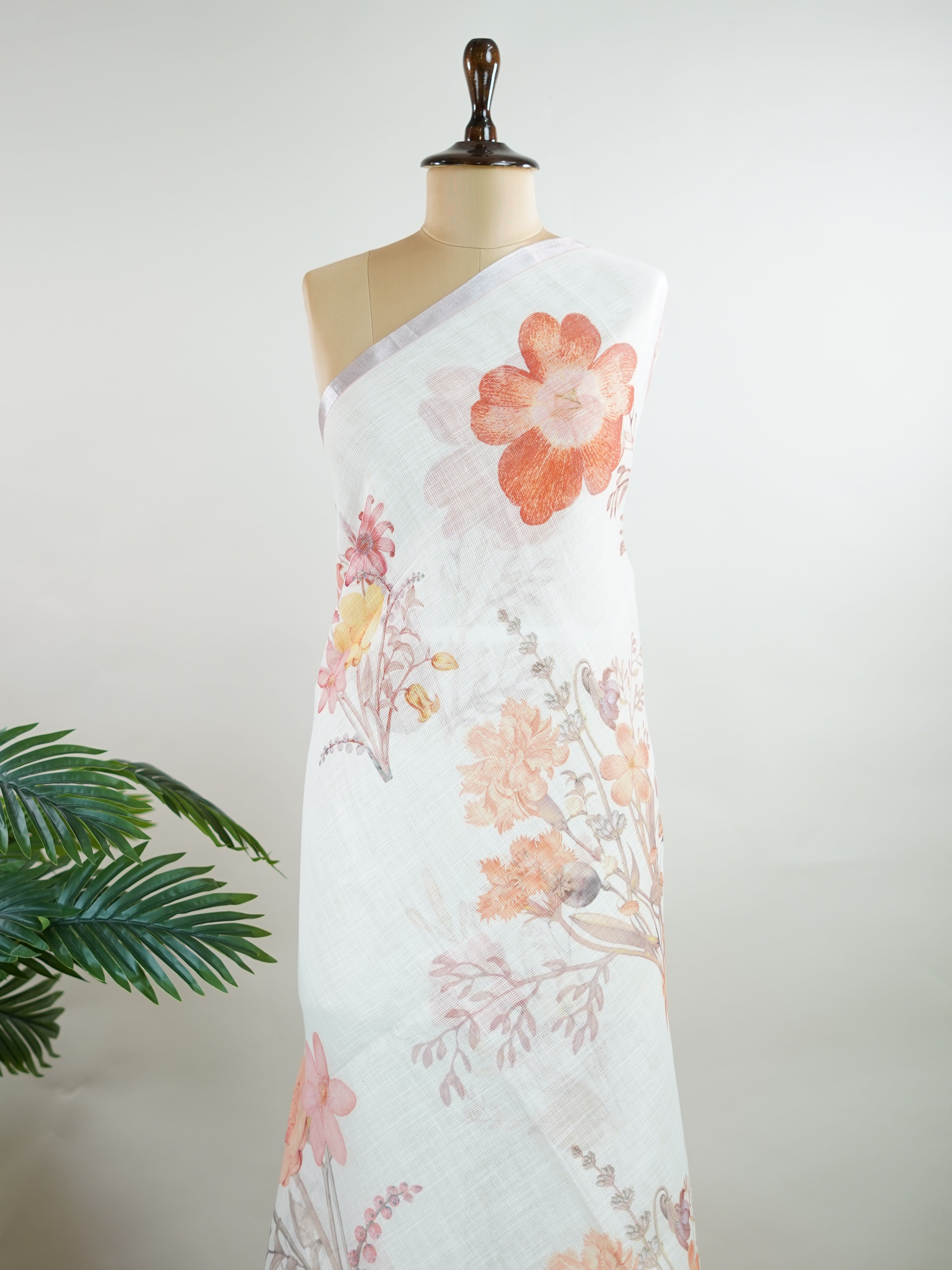 A pristine white base adorned with multicolour floral motifs makes this Silk Kota saree a picture of elegance.