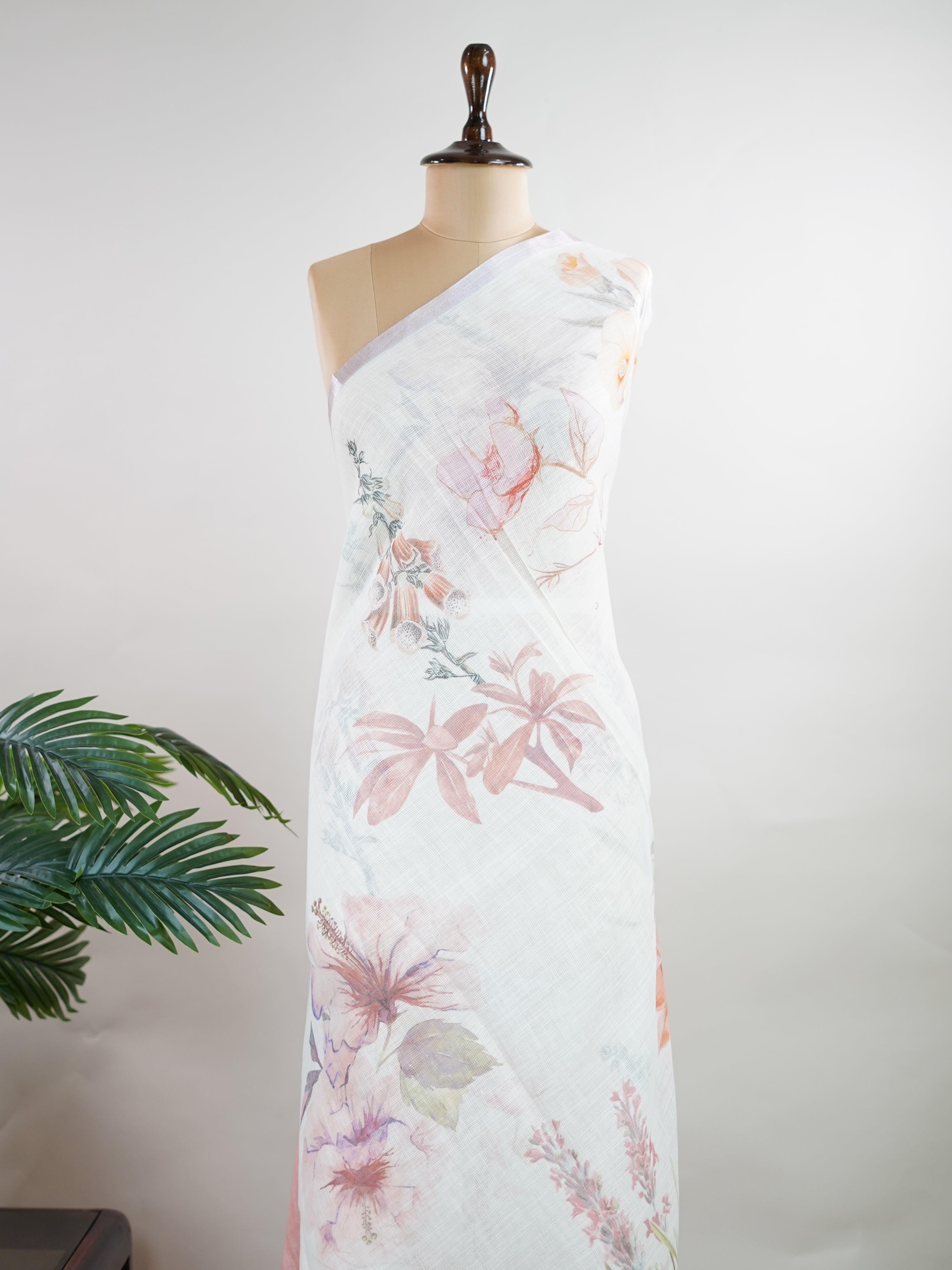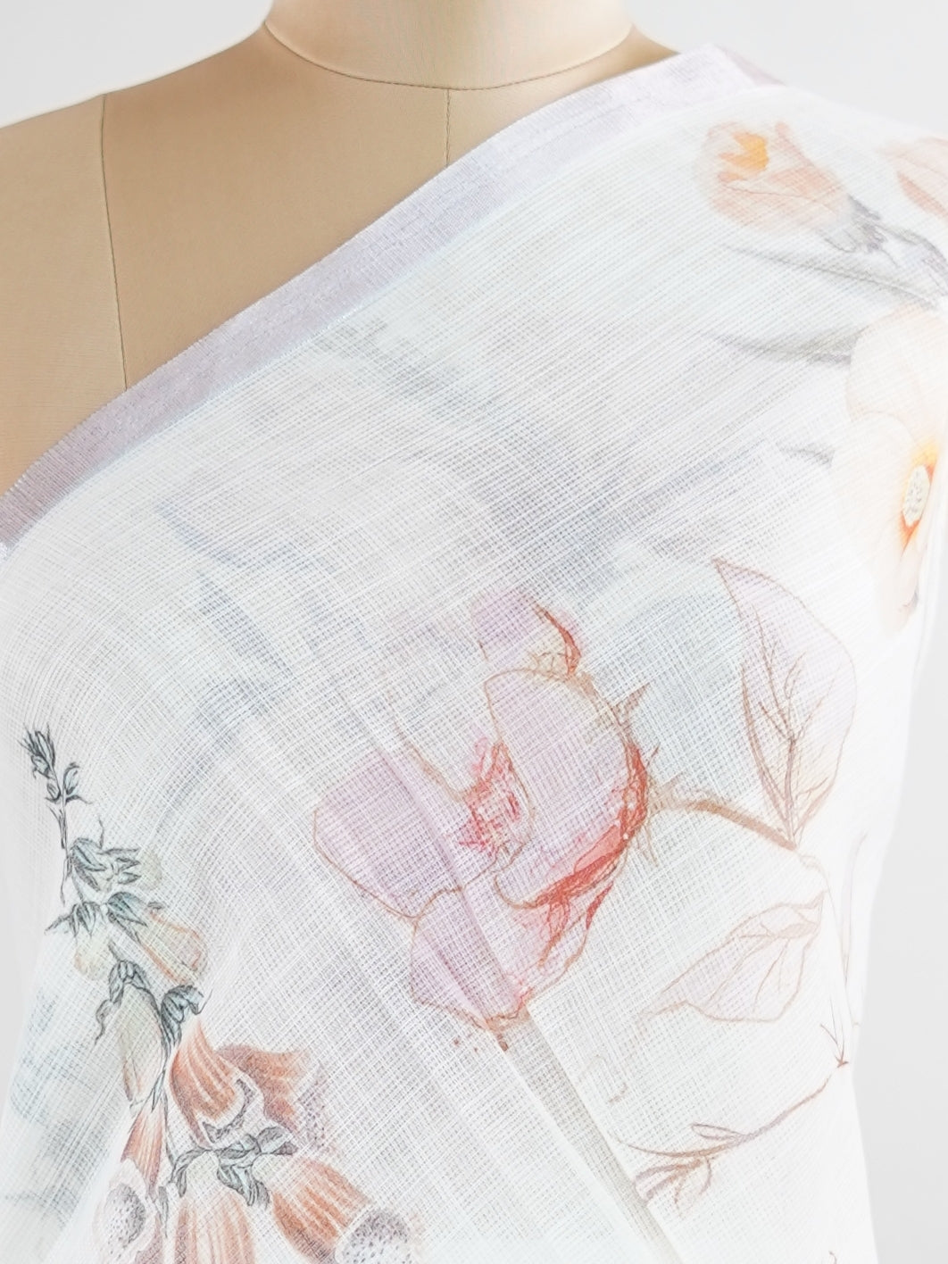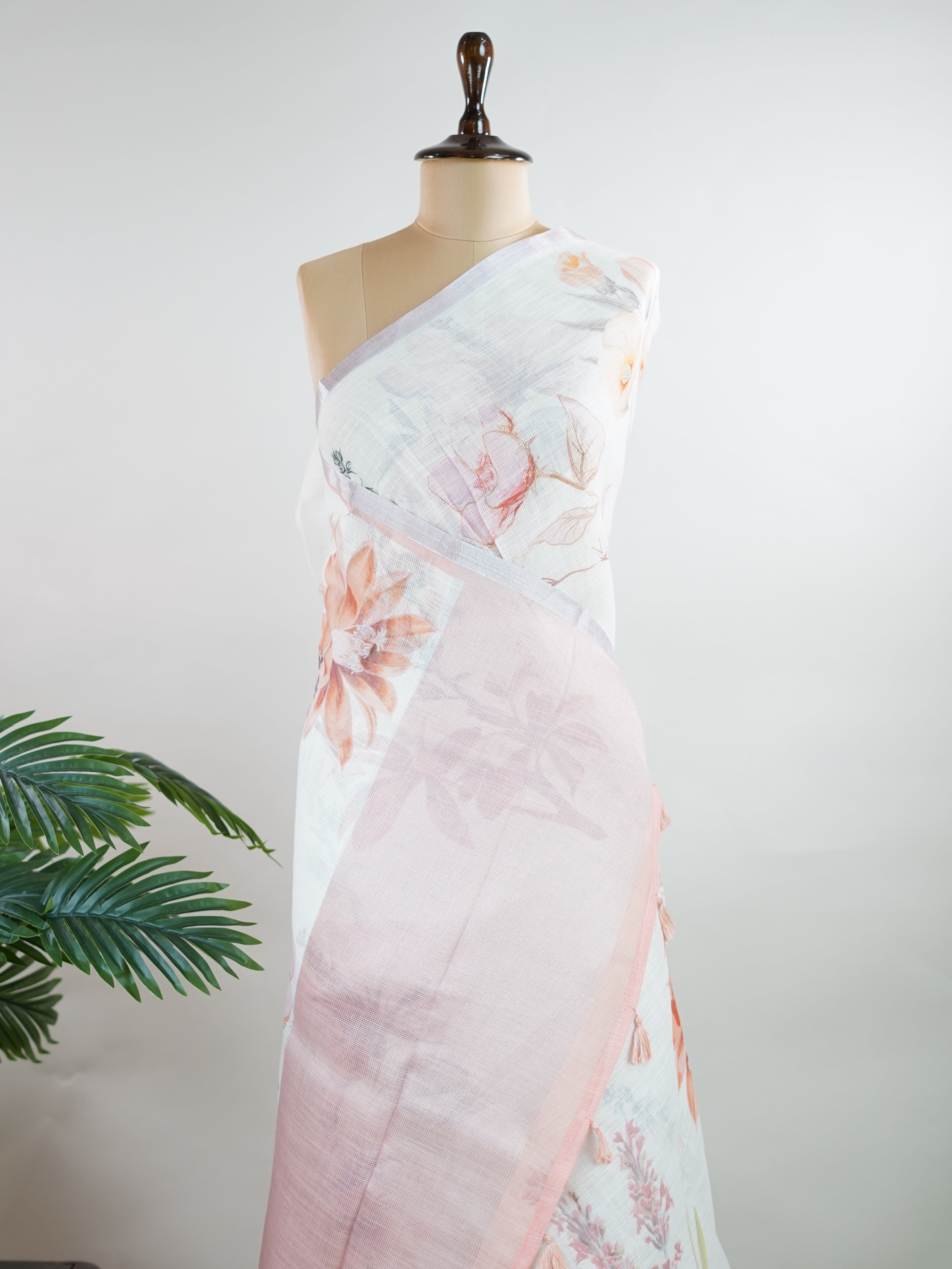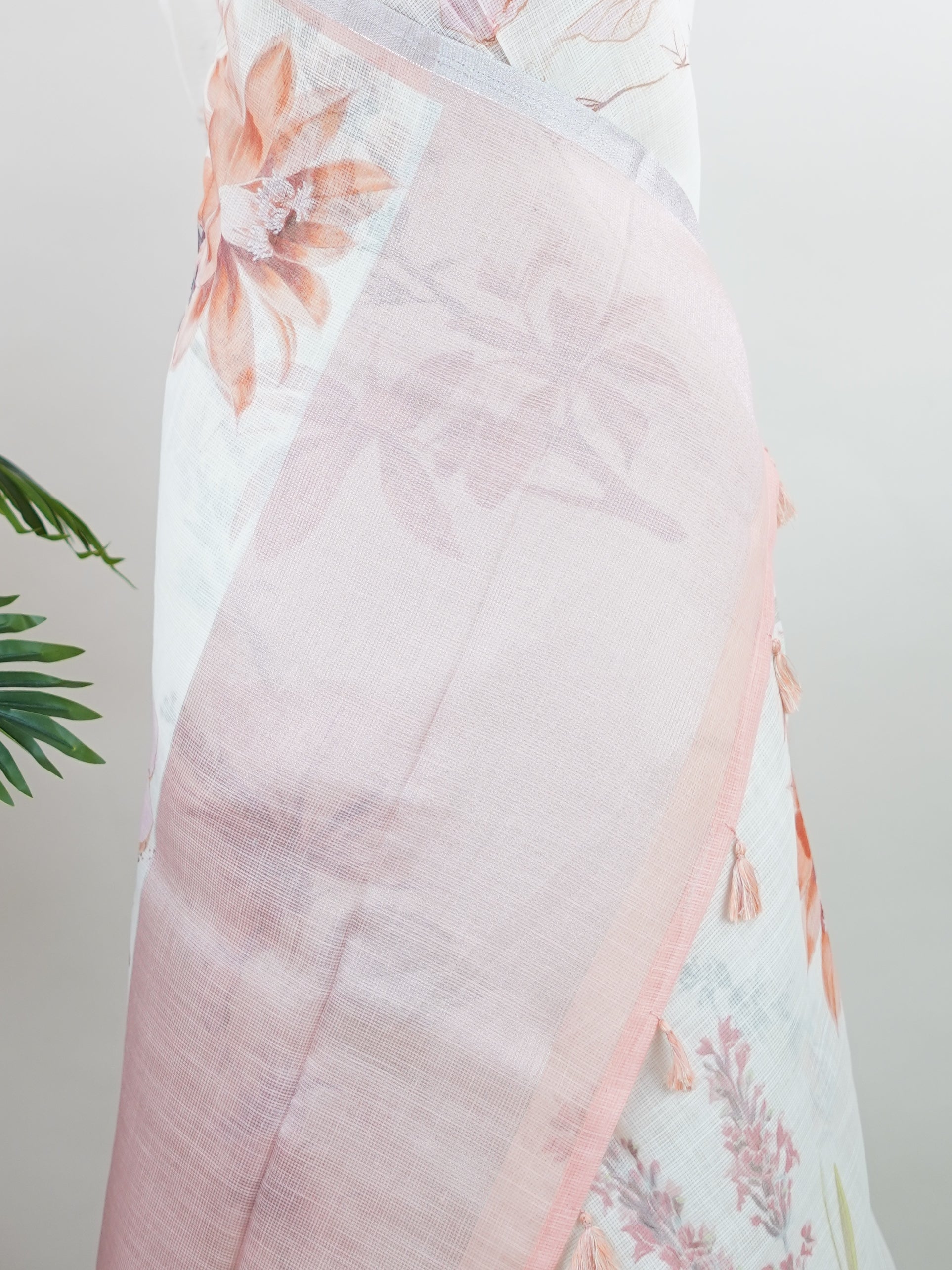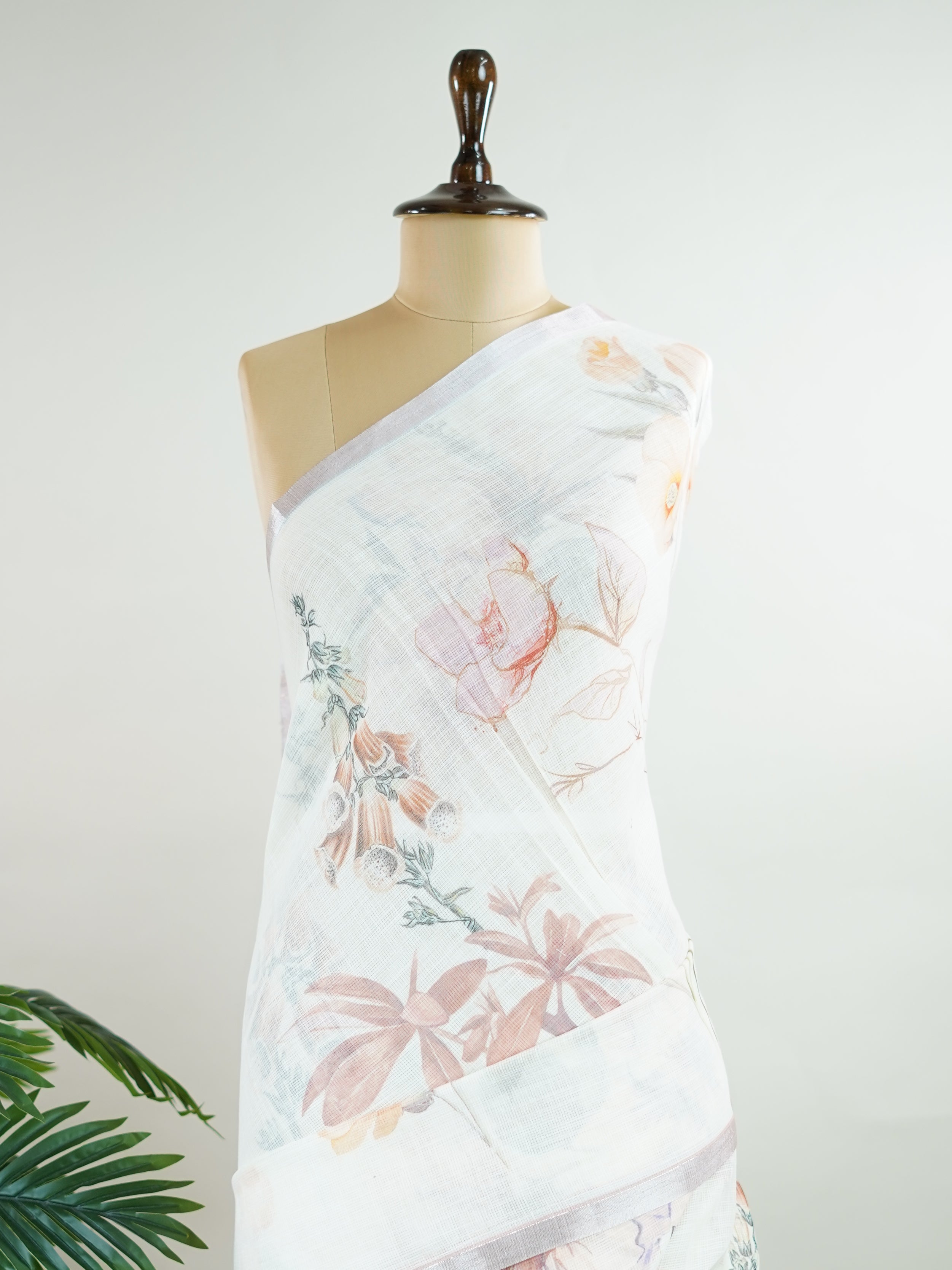 A pristine white base adorned with multicolour floral motifs makes this Silk Kota saree a picture of elegance.