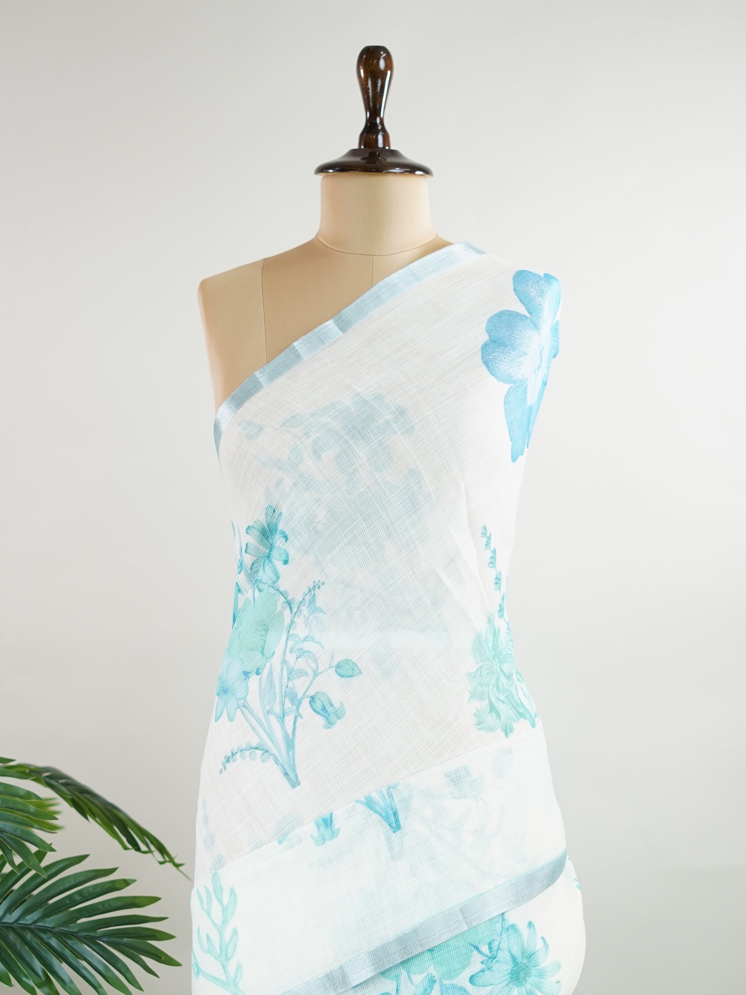 A pristine white base adorned with multicolour floral motifs makes this Silk Kota saree a picture of elegance.