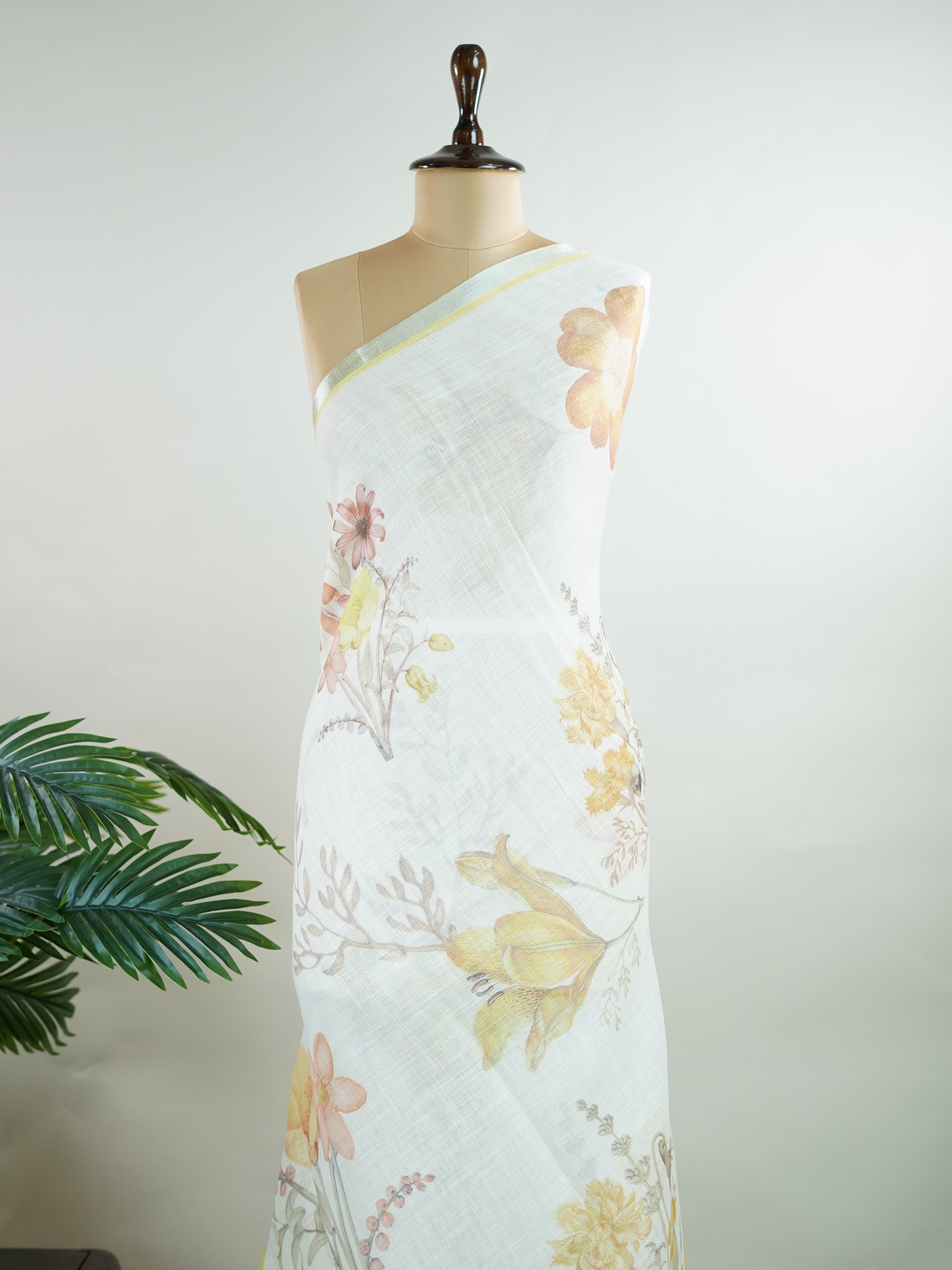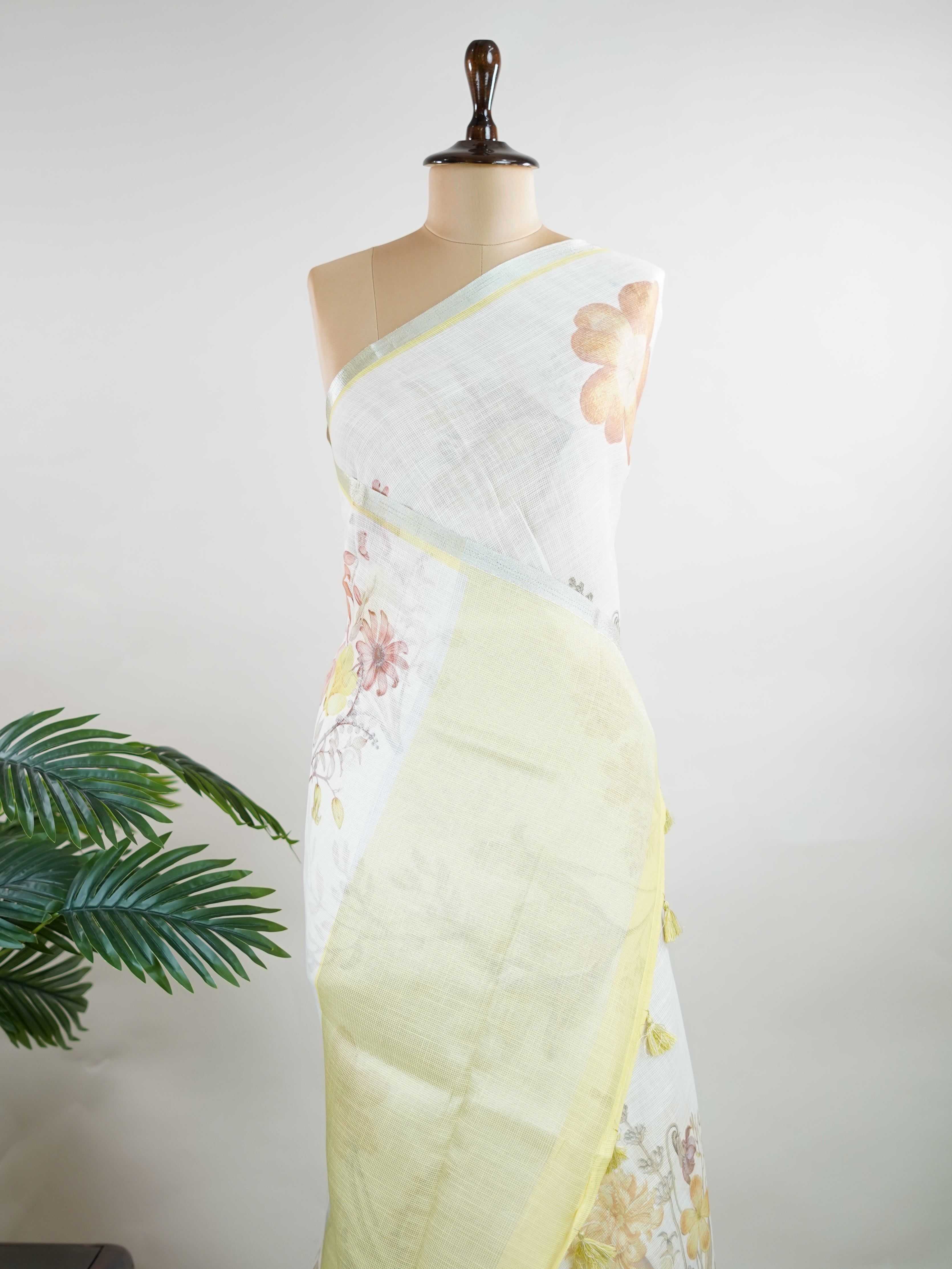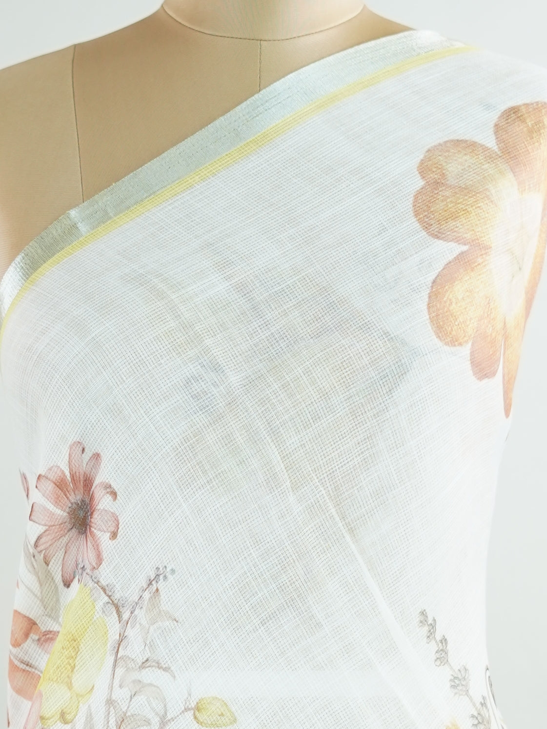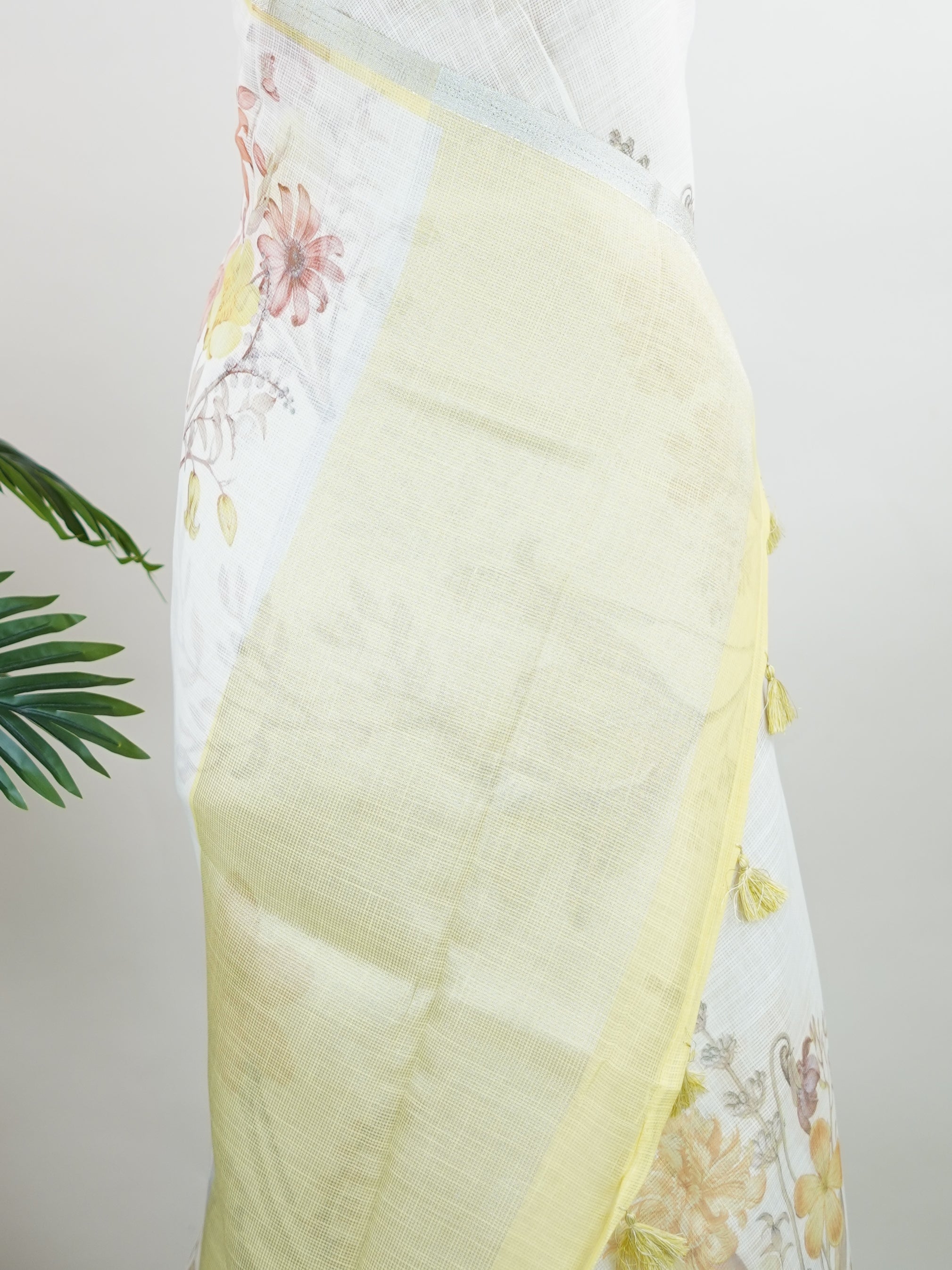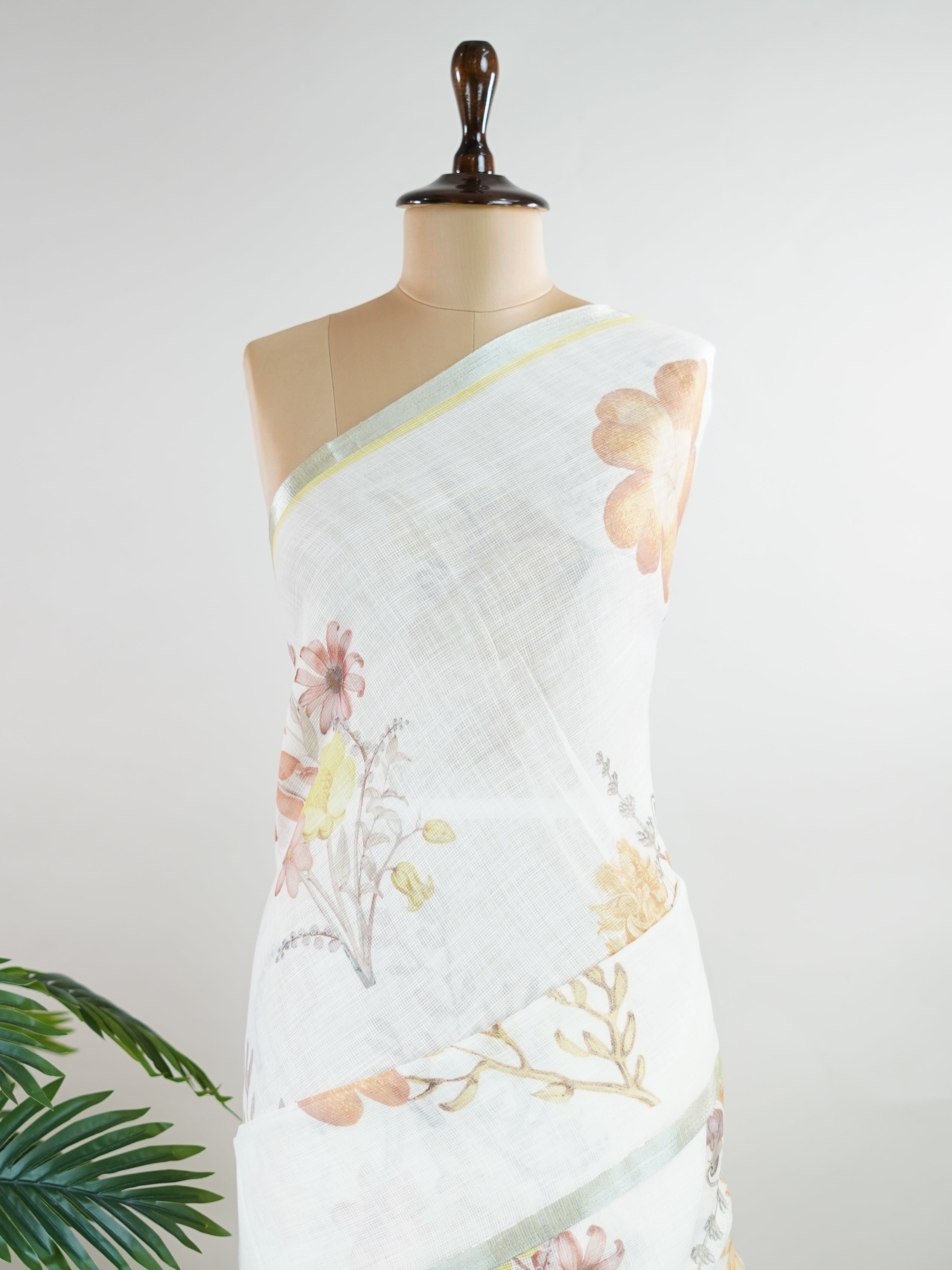 A pristine white base adorned with multicolour floral motifs makes this Silk Kota saree a picture of elegance.