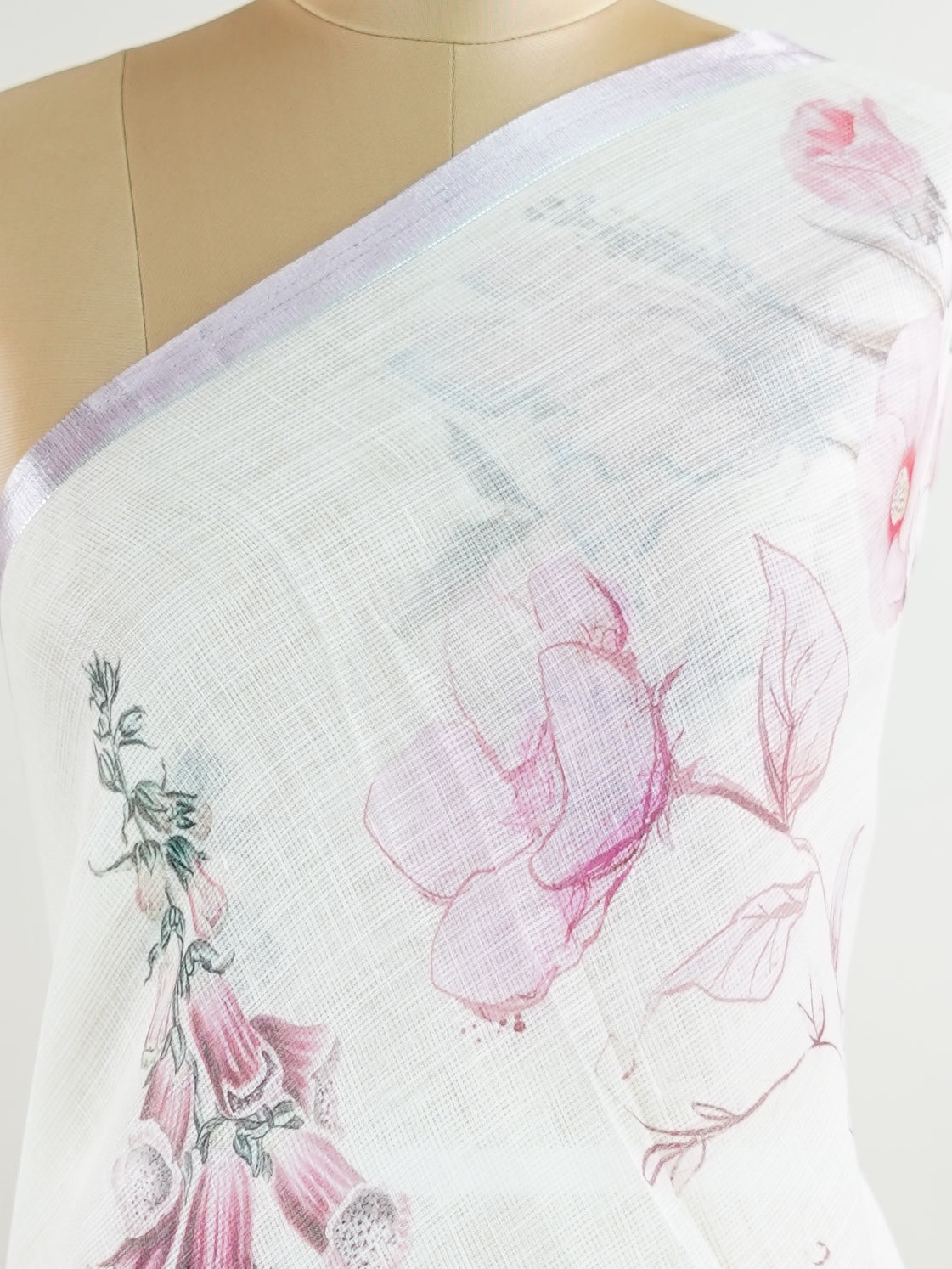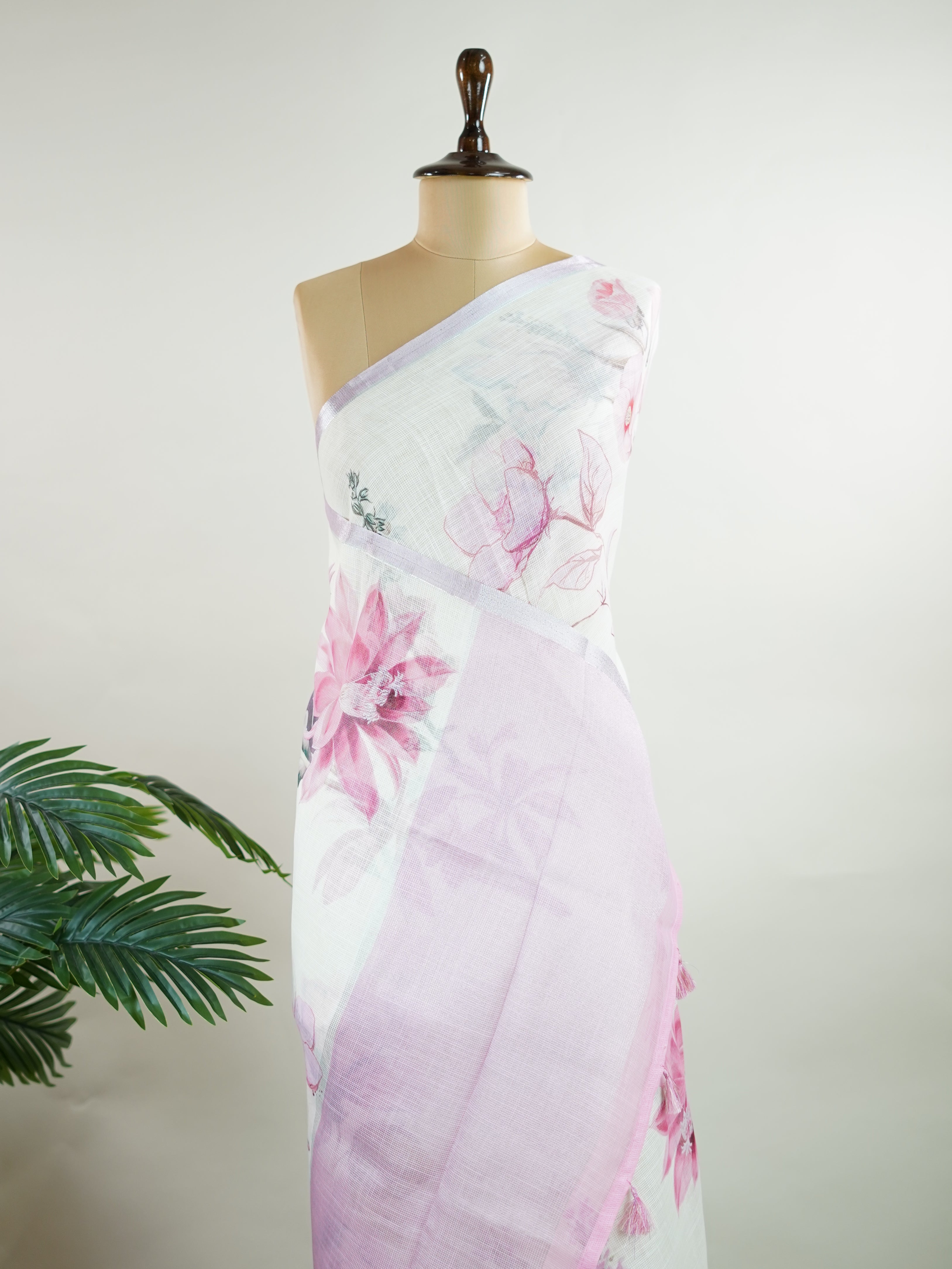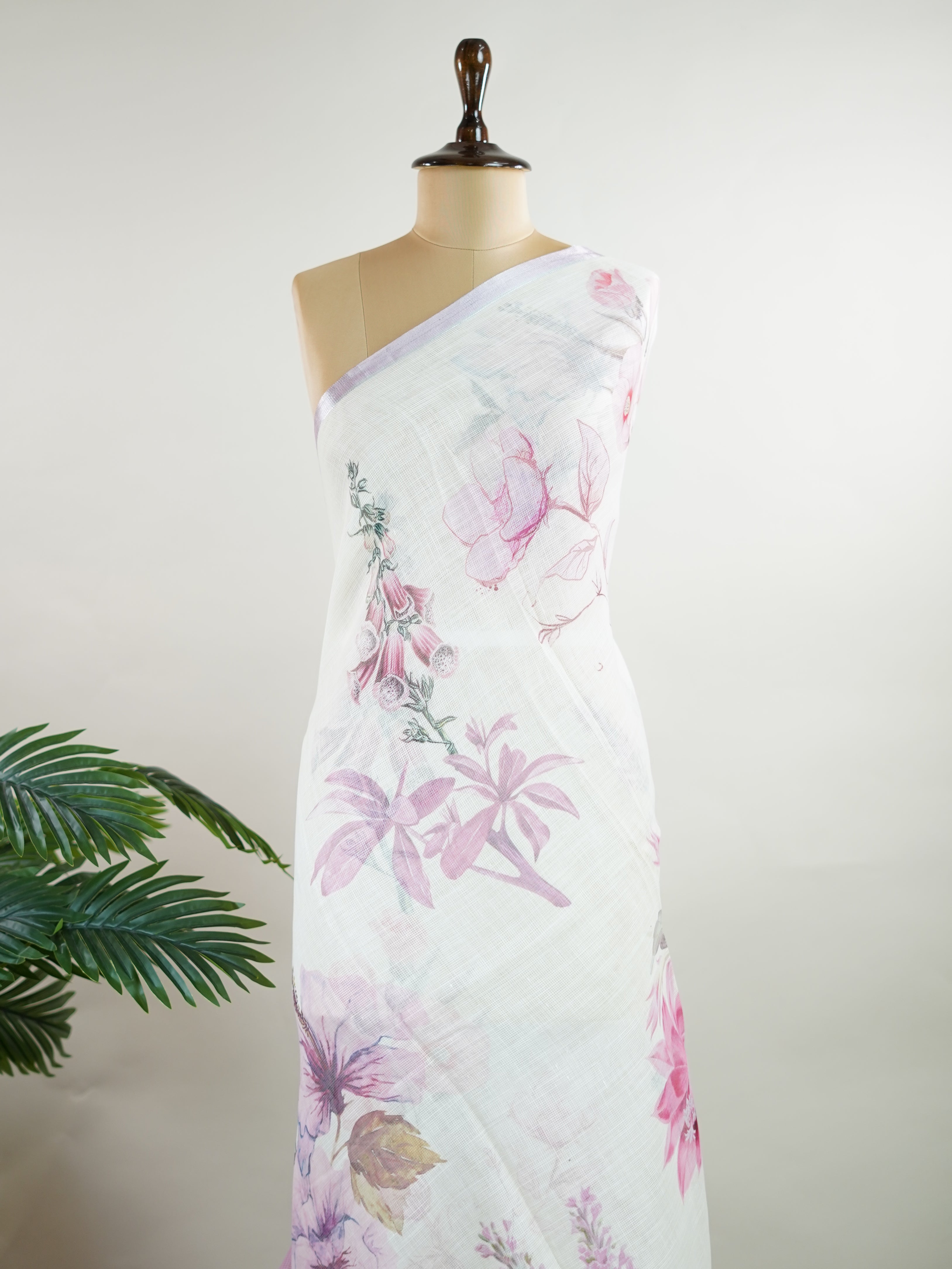 A pristine white base adorned with multicolour floral motifs makes this Silk Kota saree a picture of elegance.