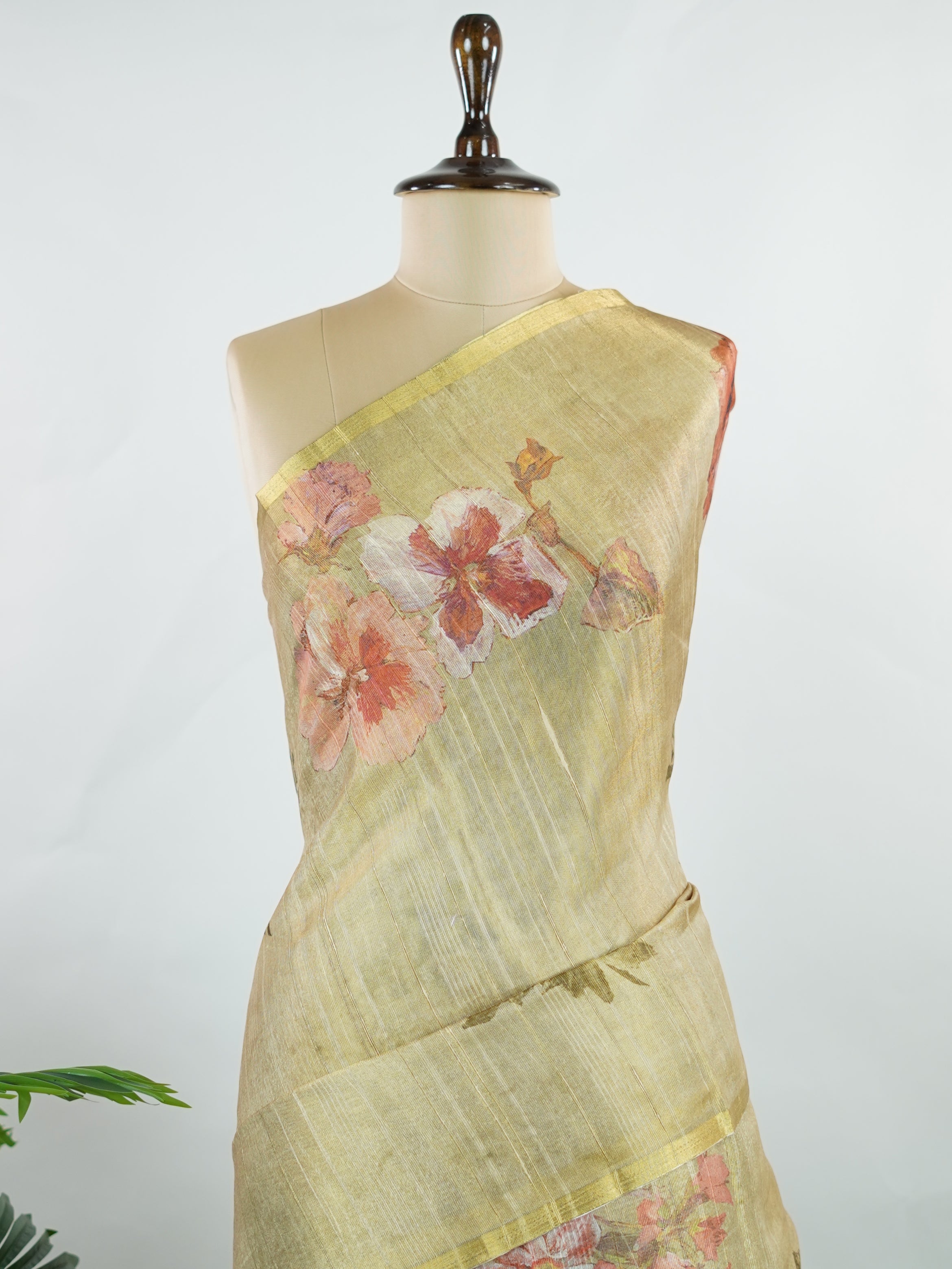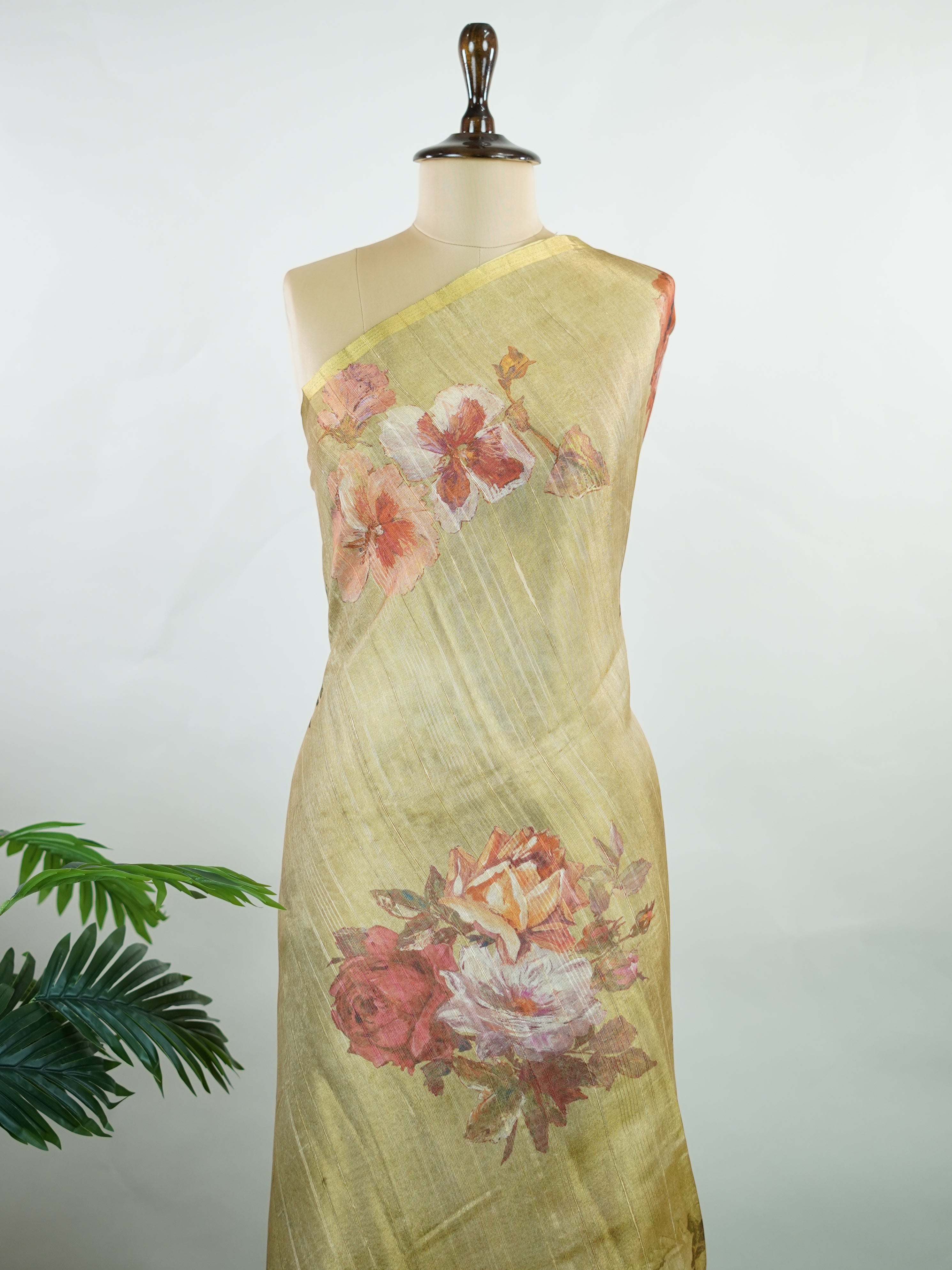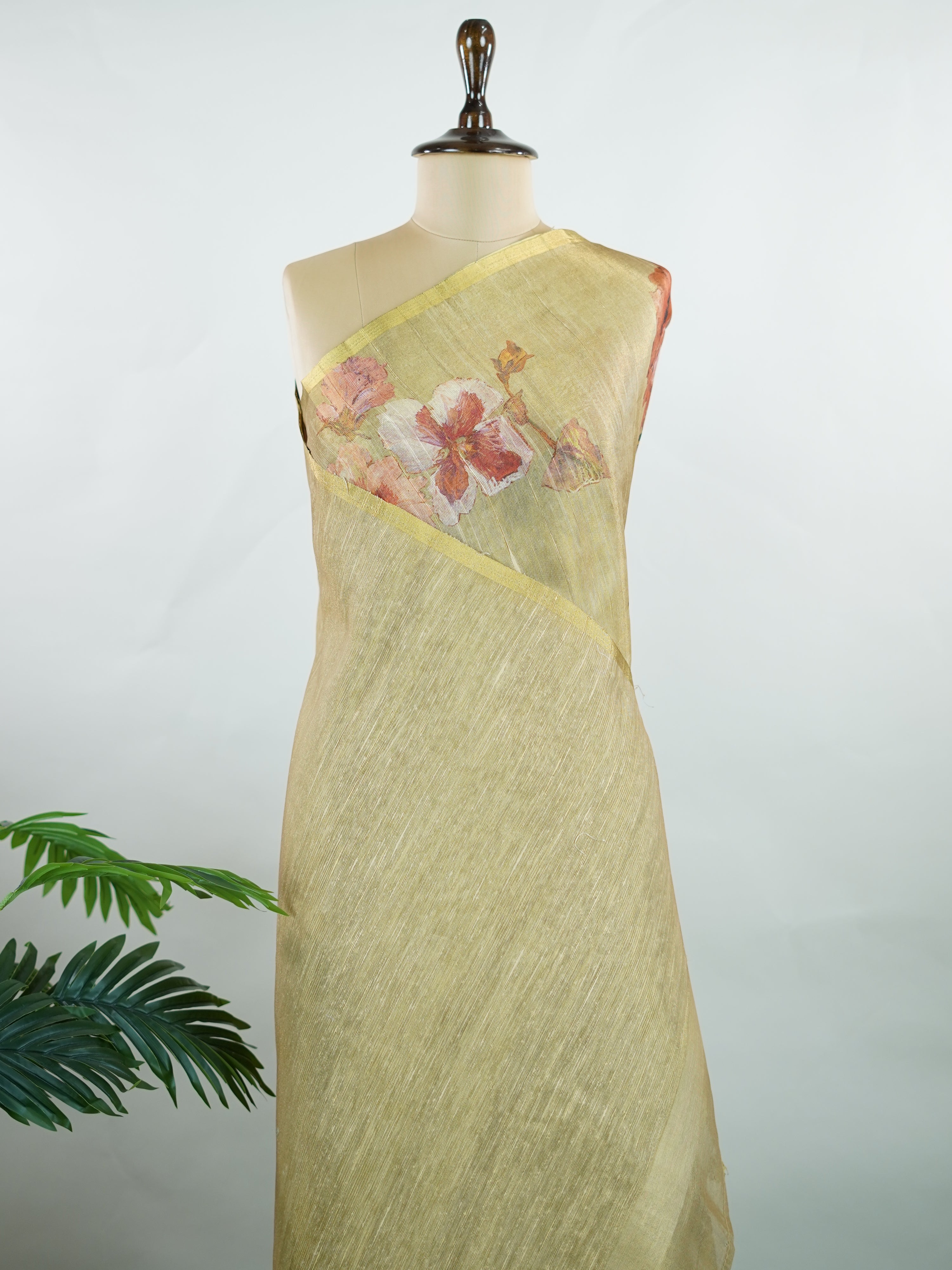 This semi linen tissue saree blends the crisp texture of linen with the soft shimmer of tissue, brought to life through vibrant digital prints. Lightweight and breathable, it’s perfect for daytime elegance with a touch of contemporary flair.