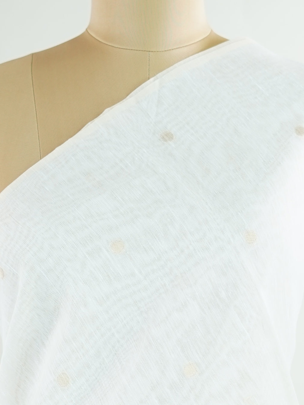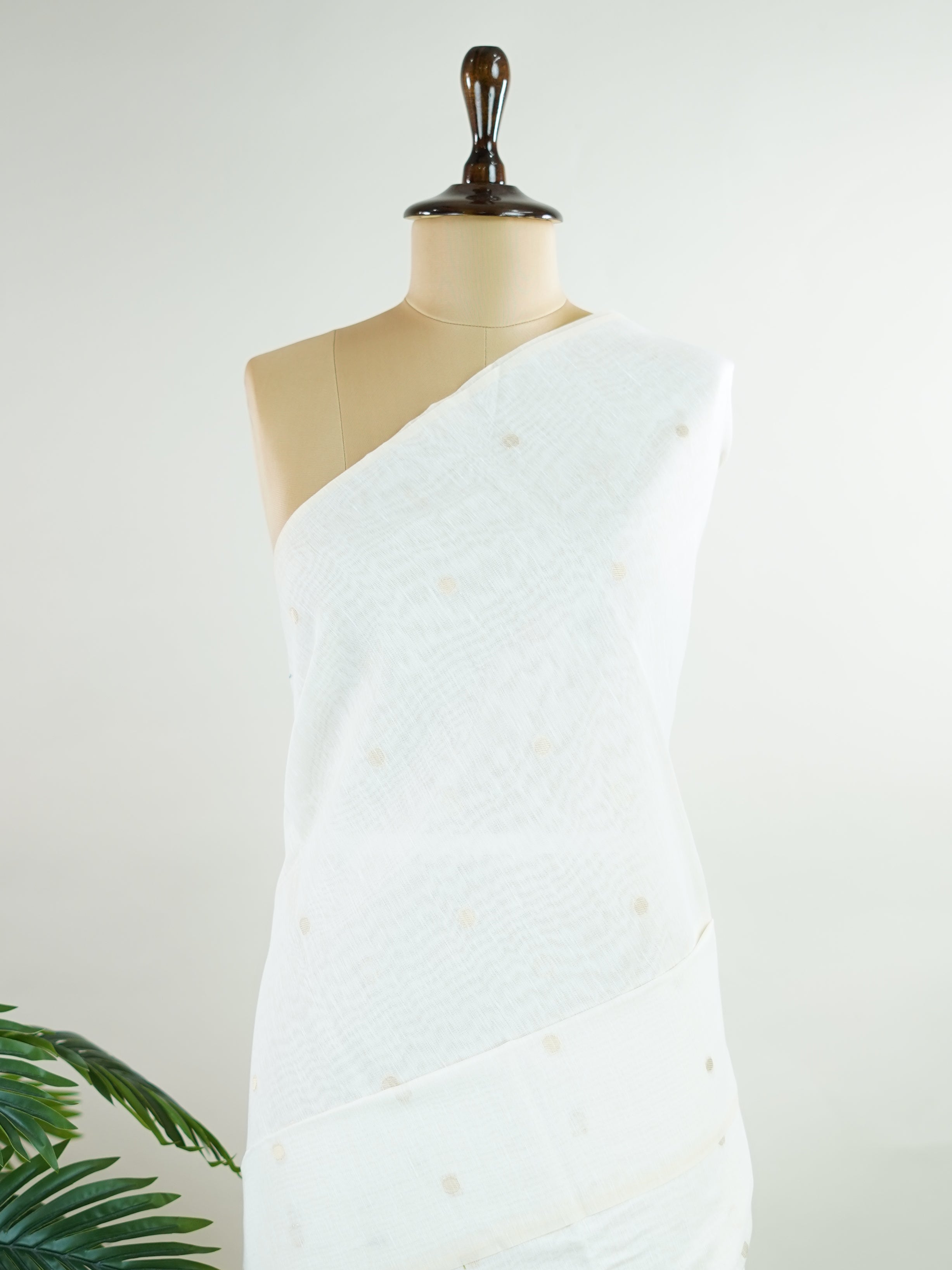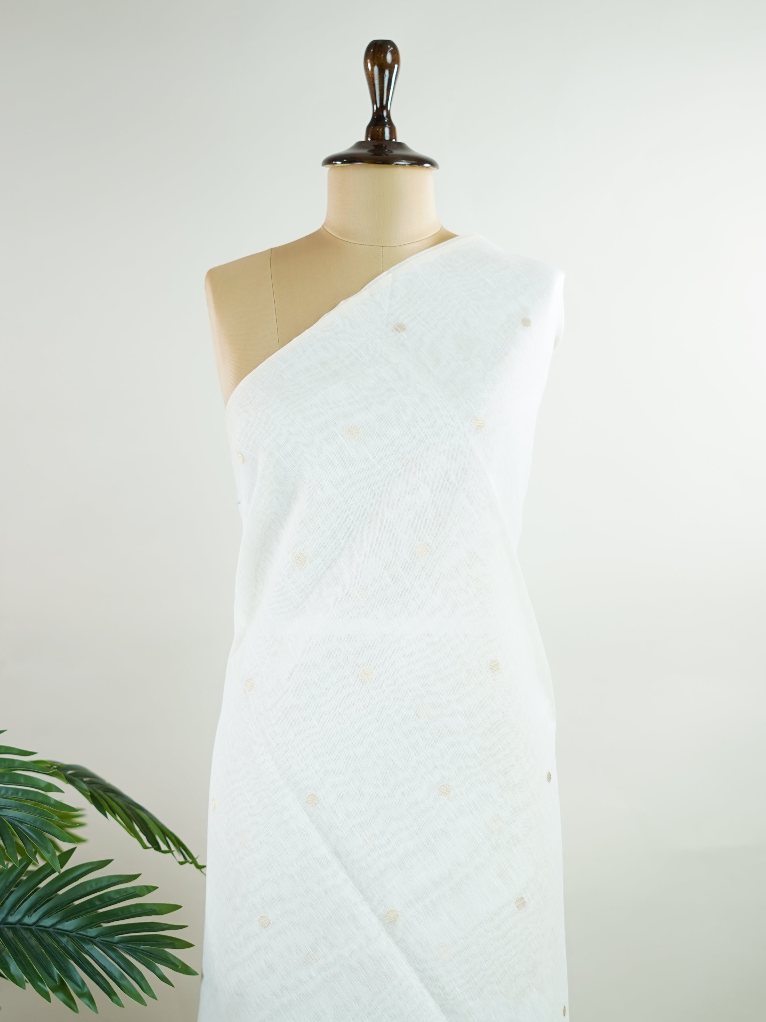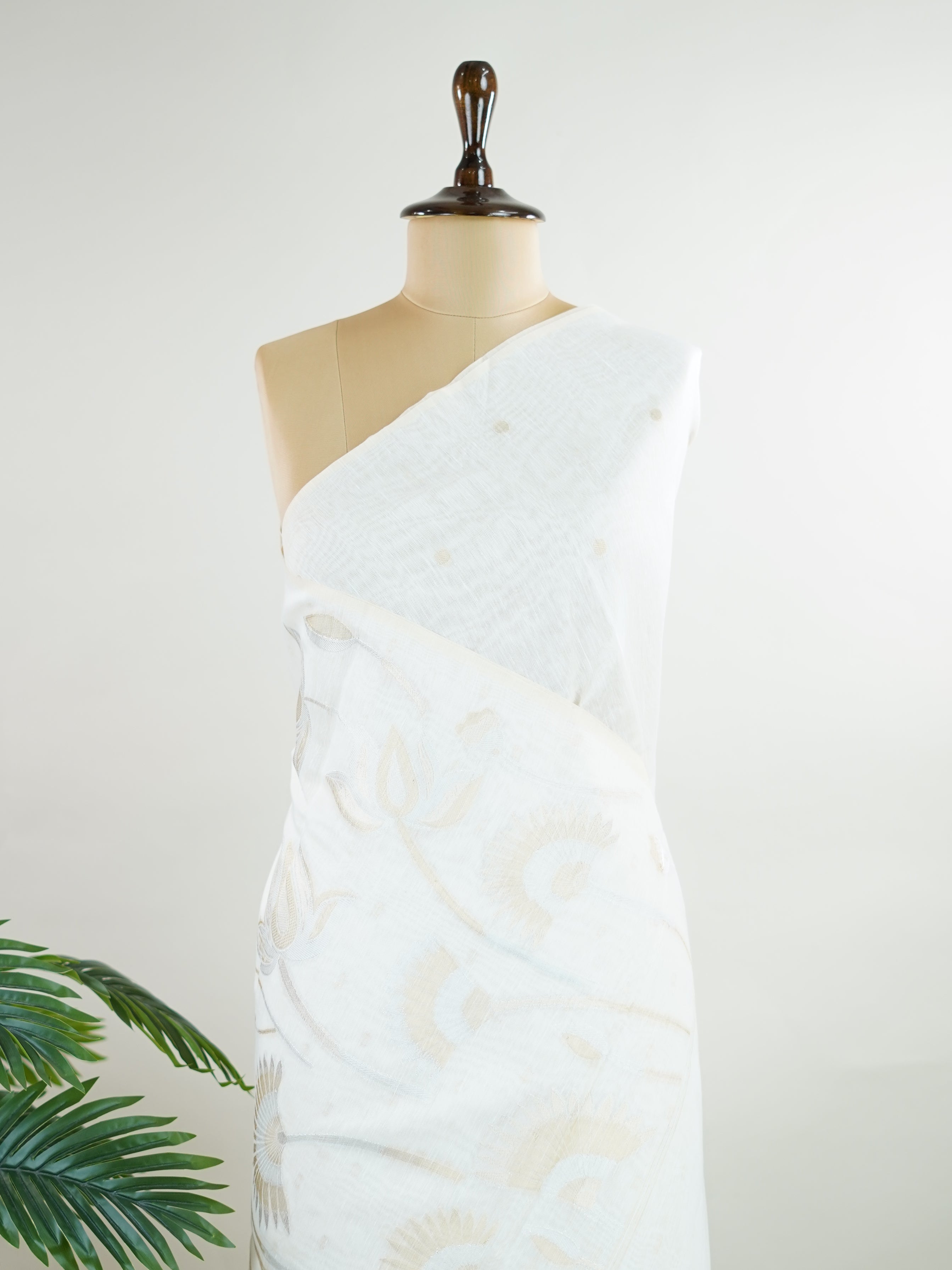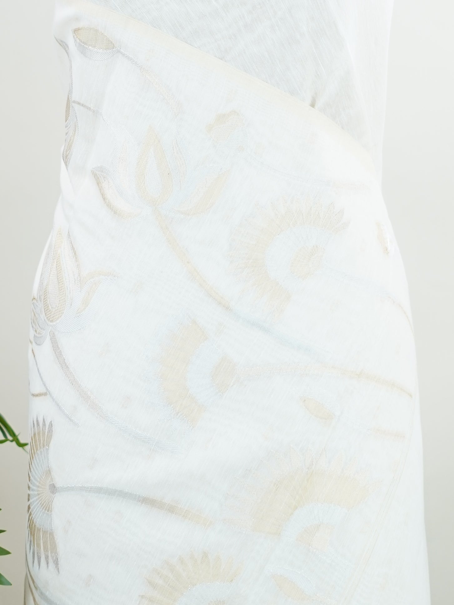 This Linen Cotton saree in cream glows softly with golden floral zari weaves.