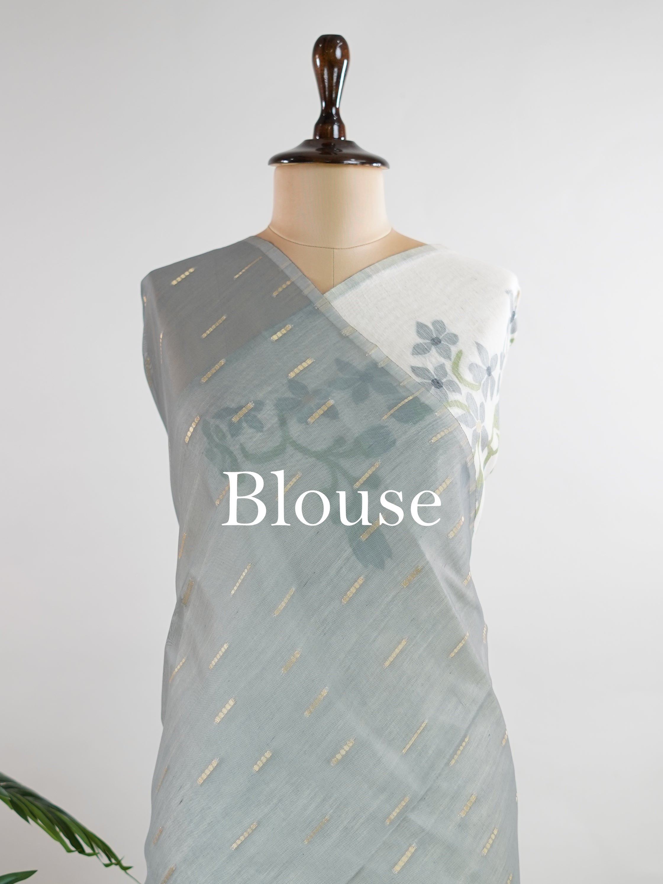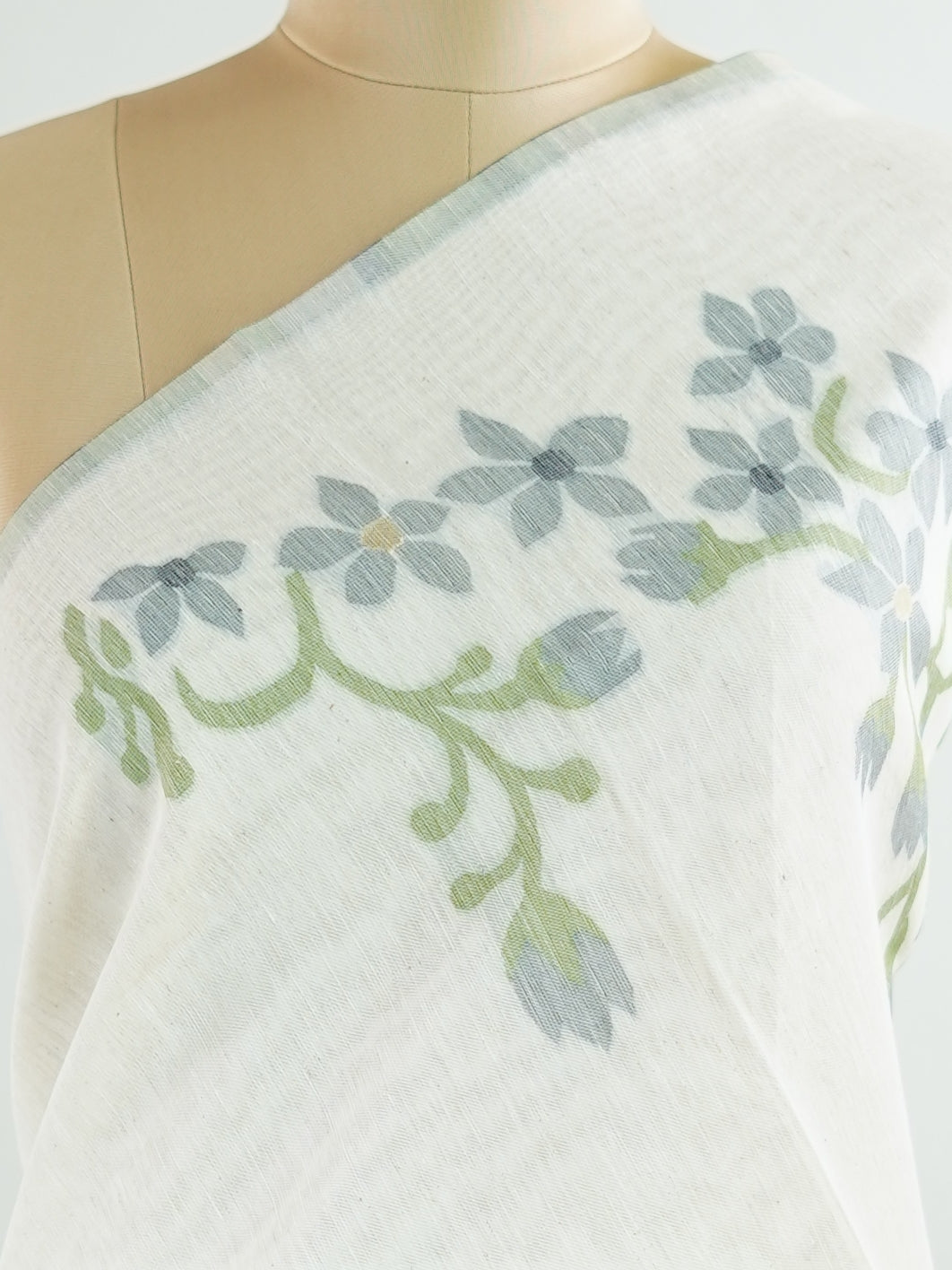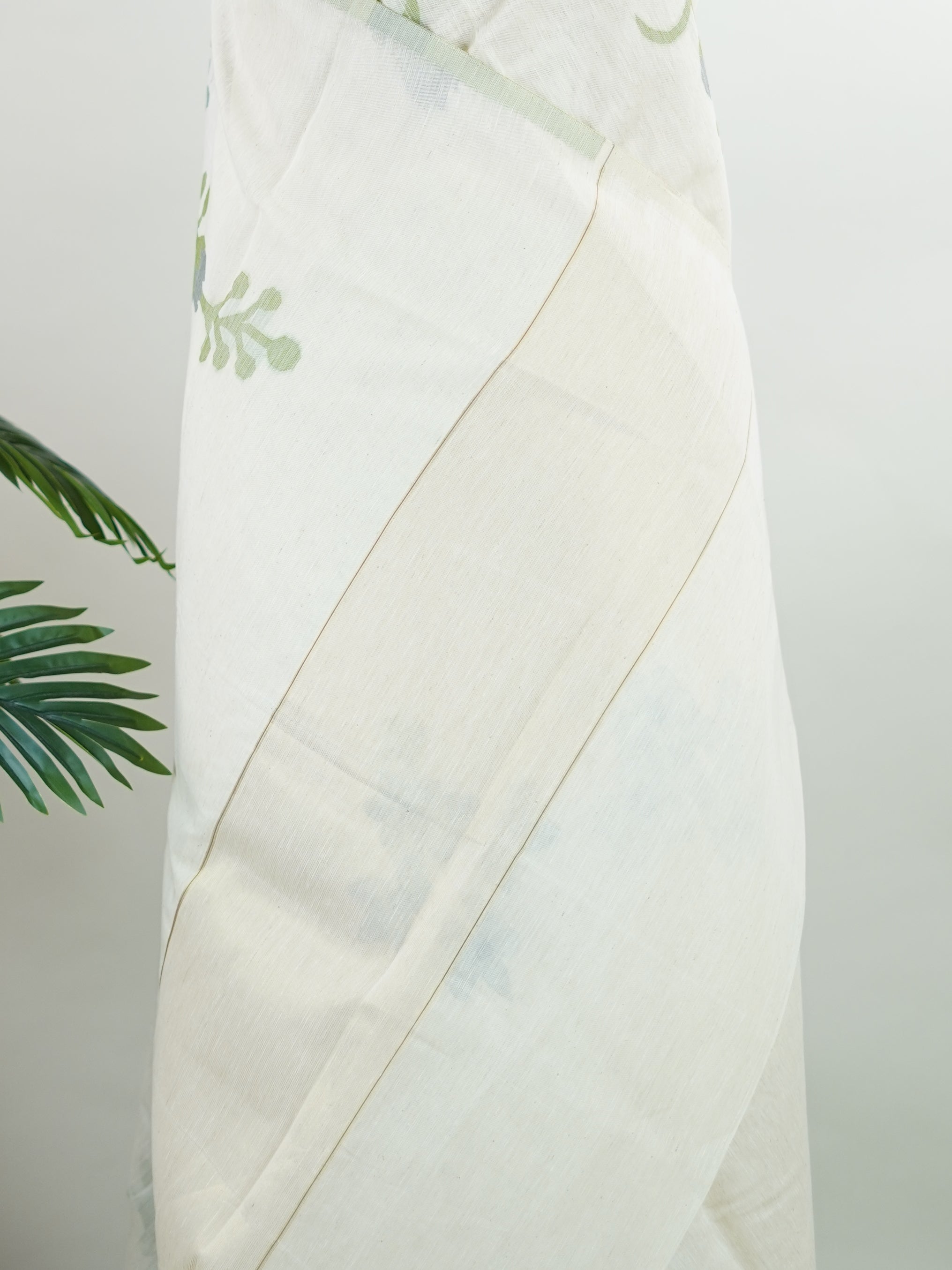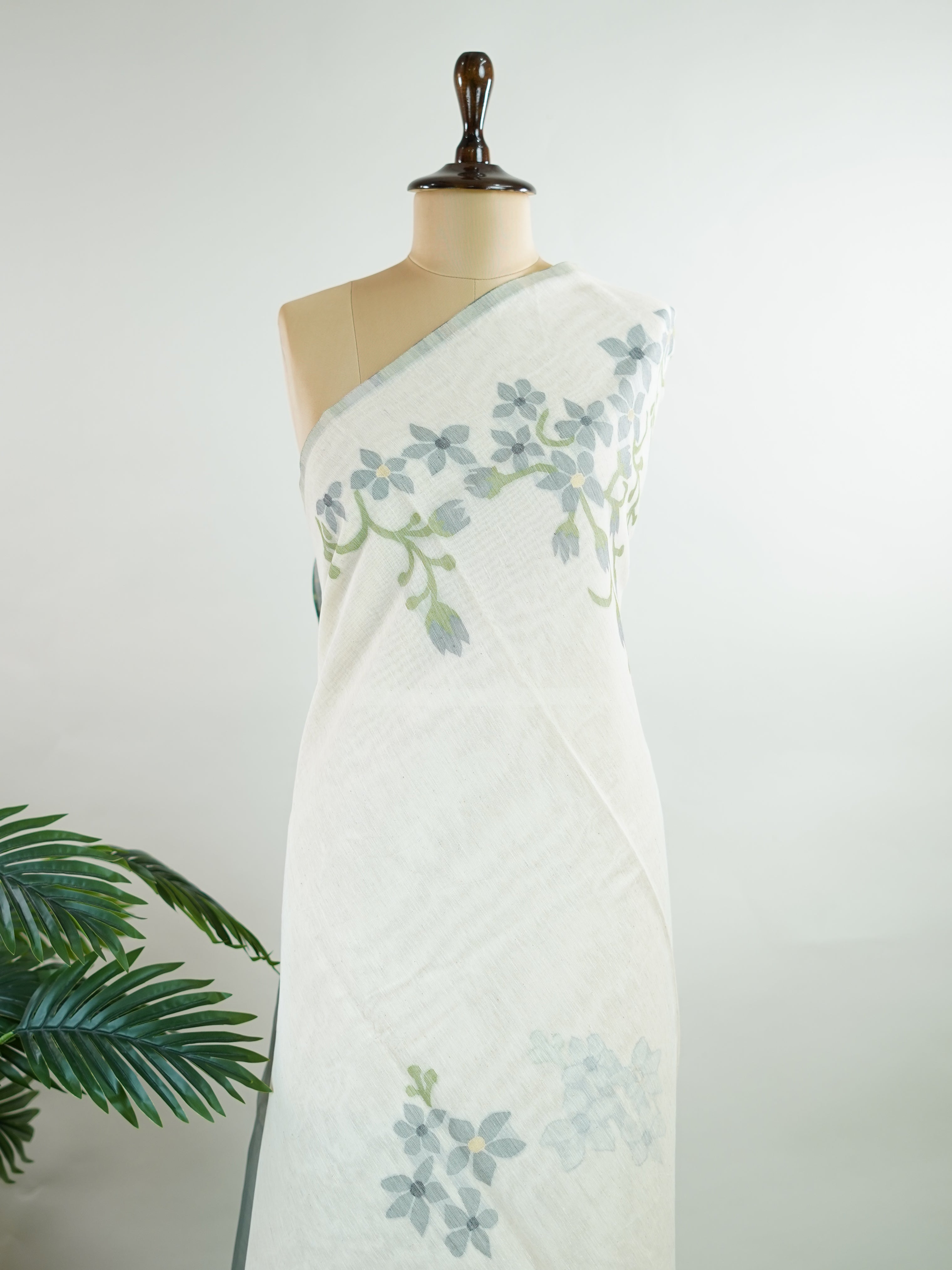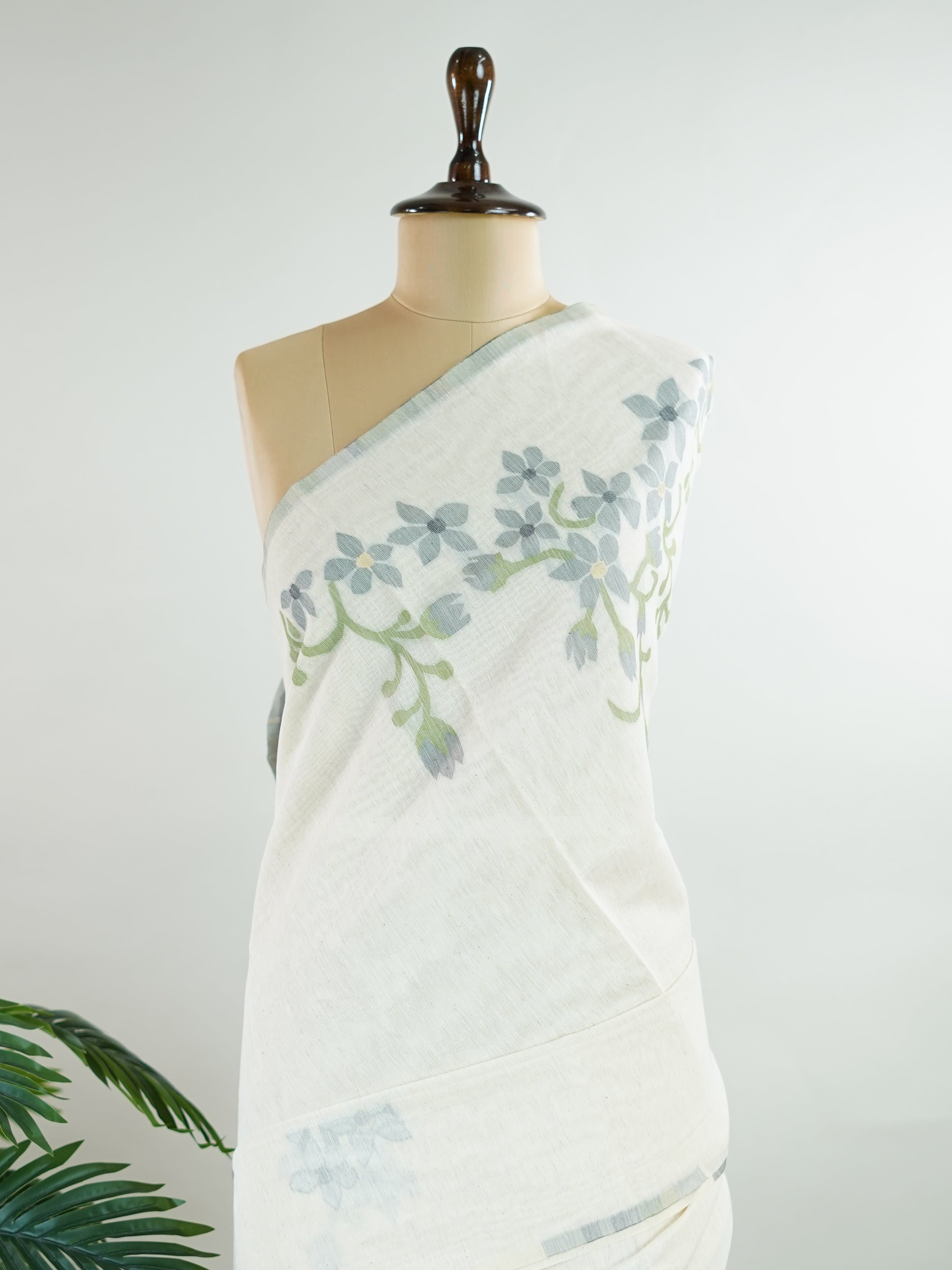 Floral motifs bloom gently across the body, untouched by zari for a pure, minimal look.