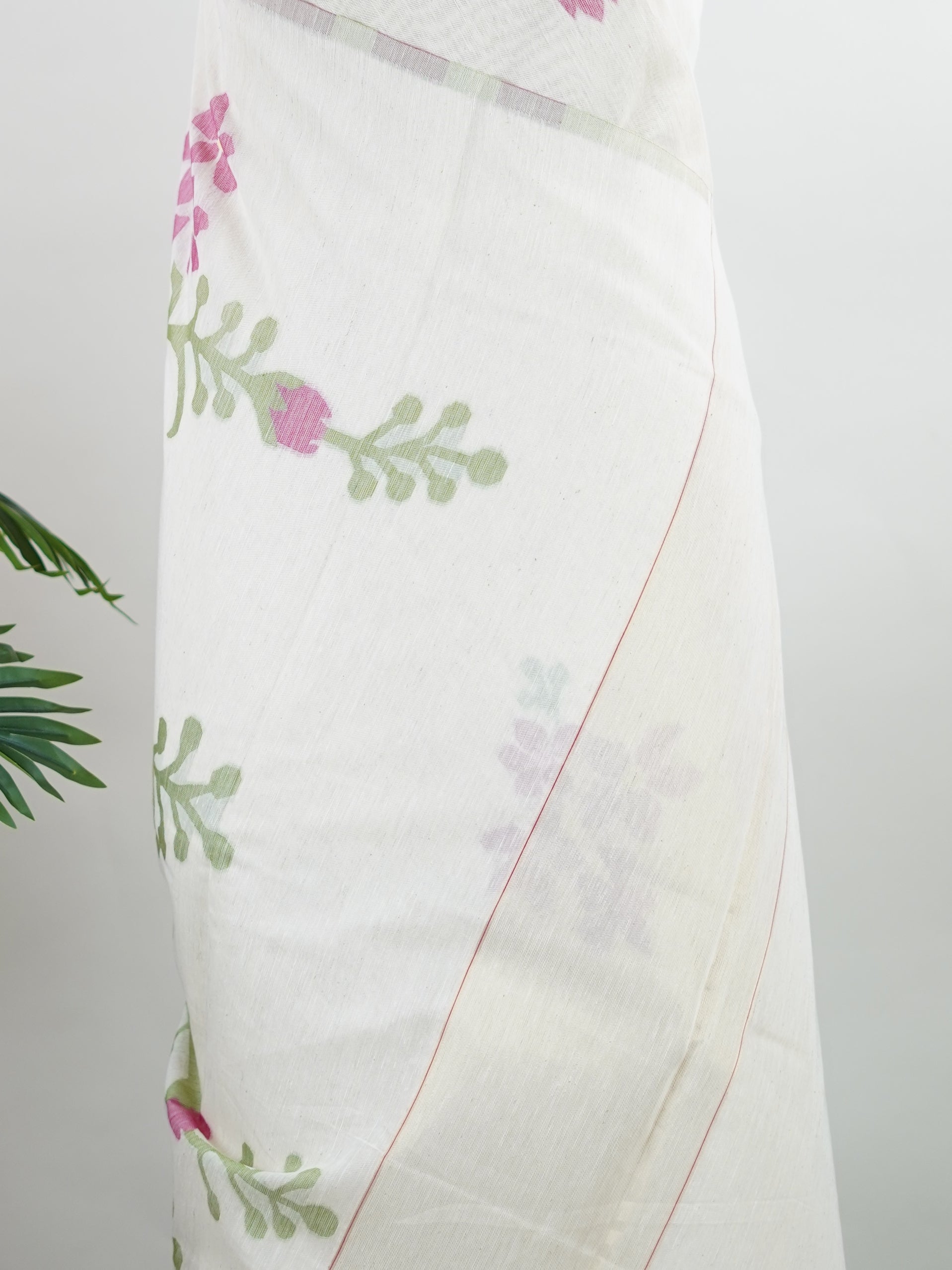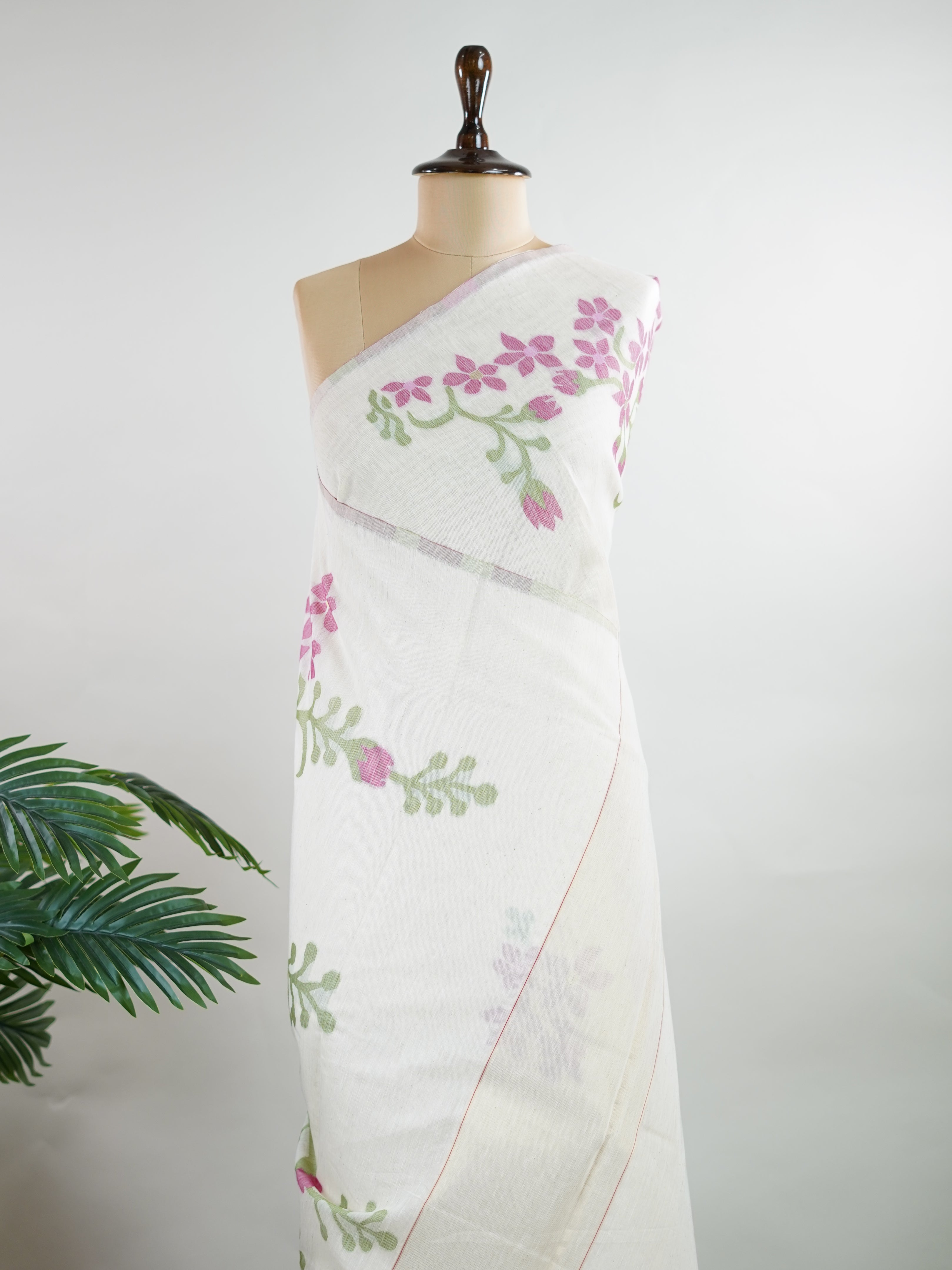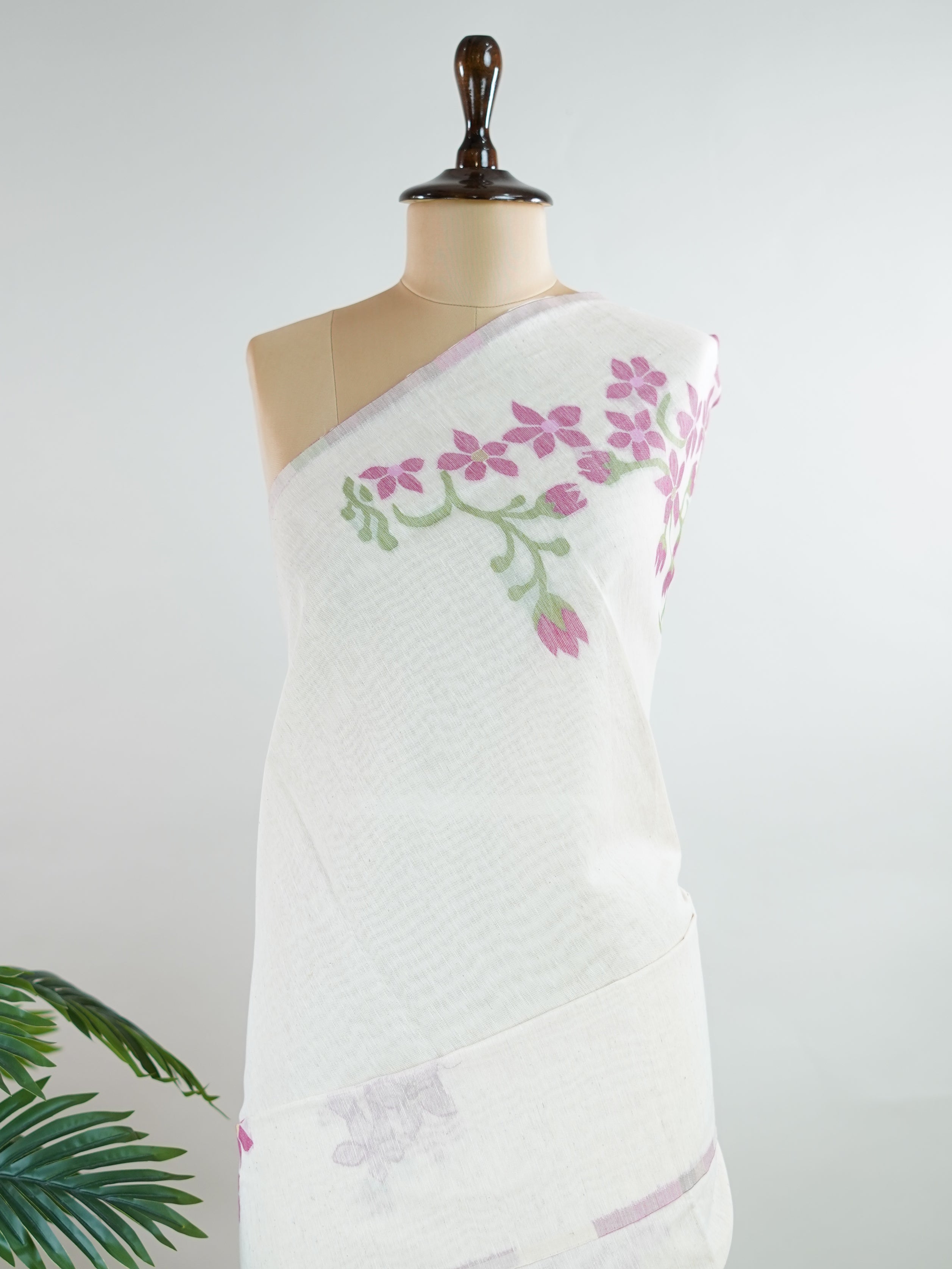 Floral motifs bloom gently across the body, untouched by zari for a pure, minimal look.