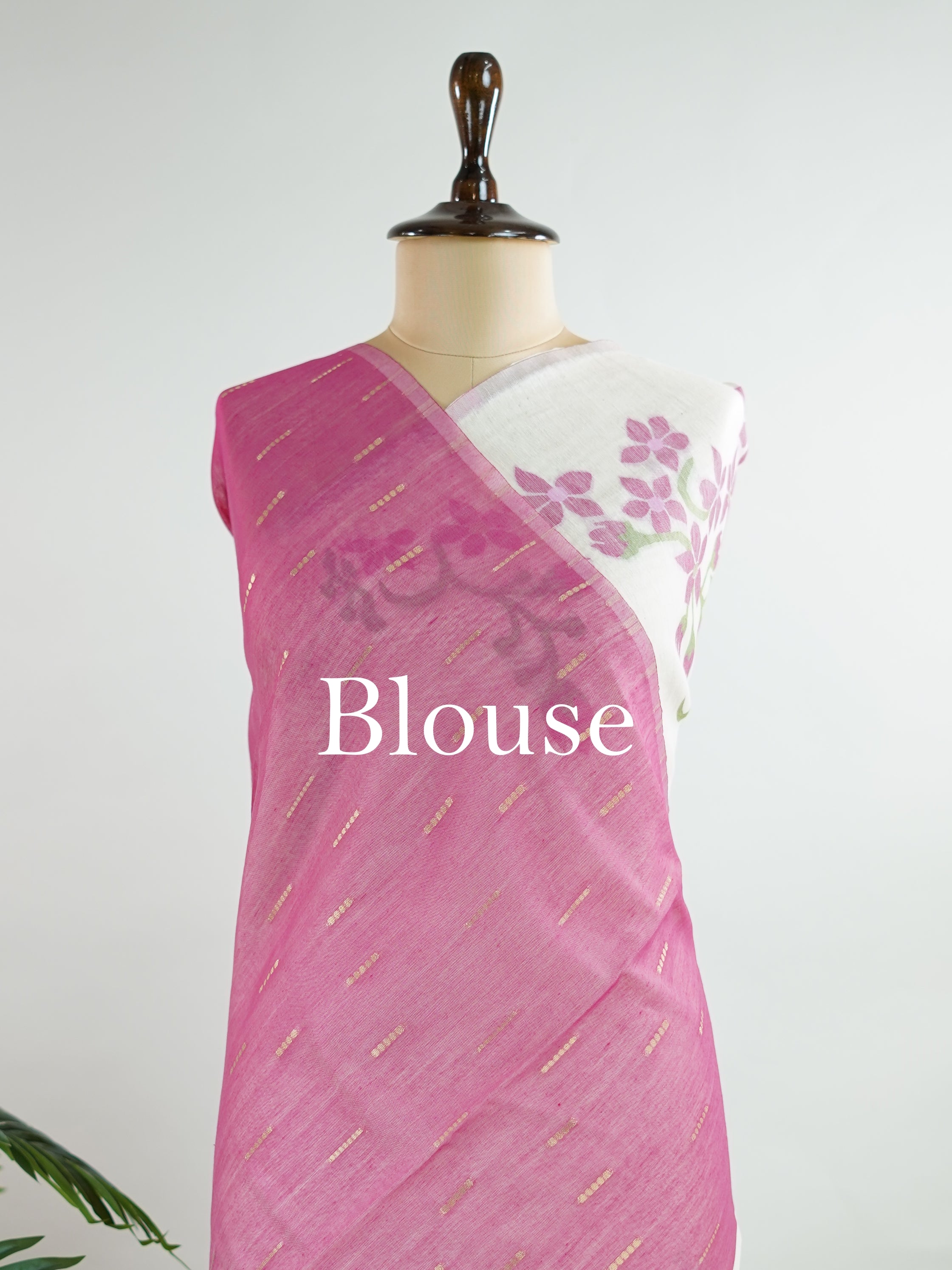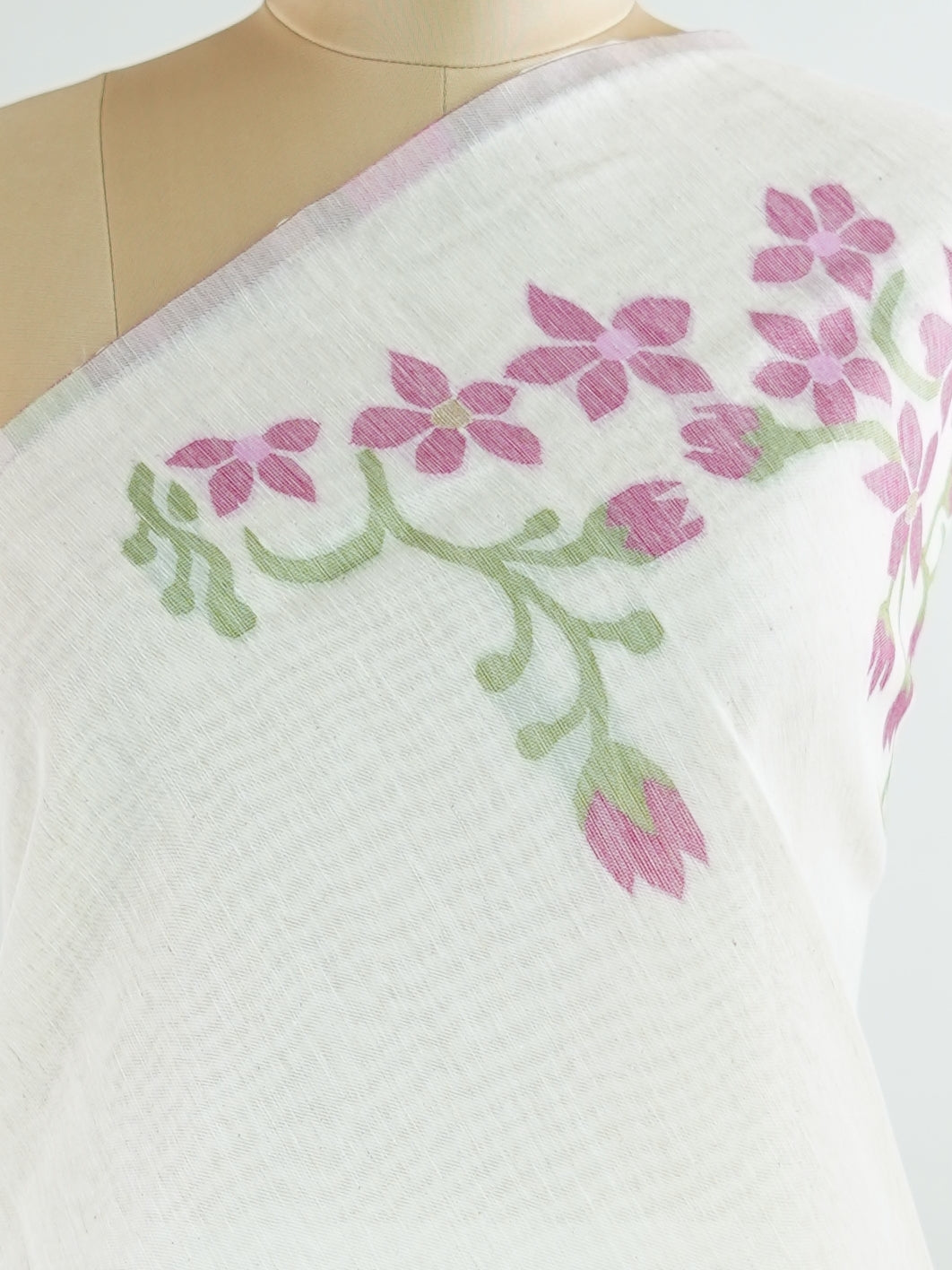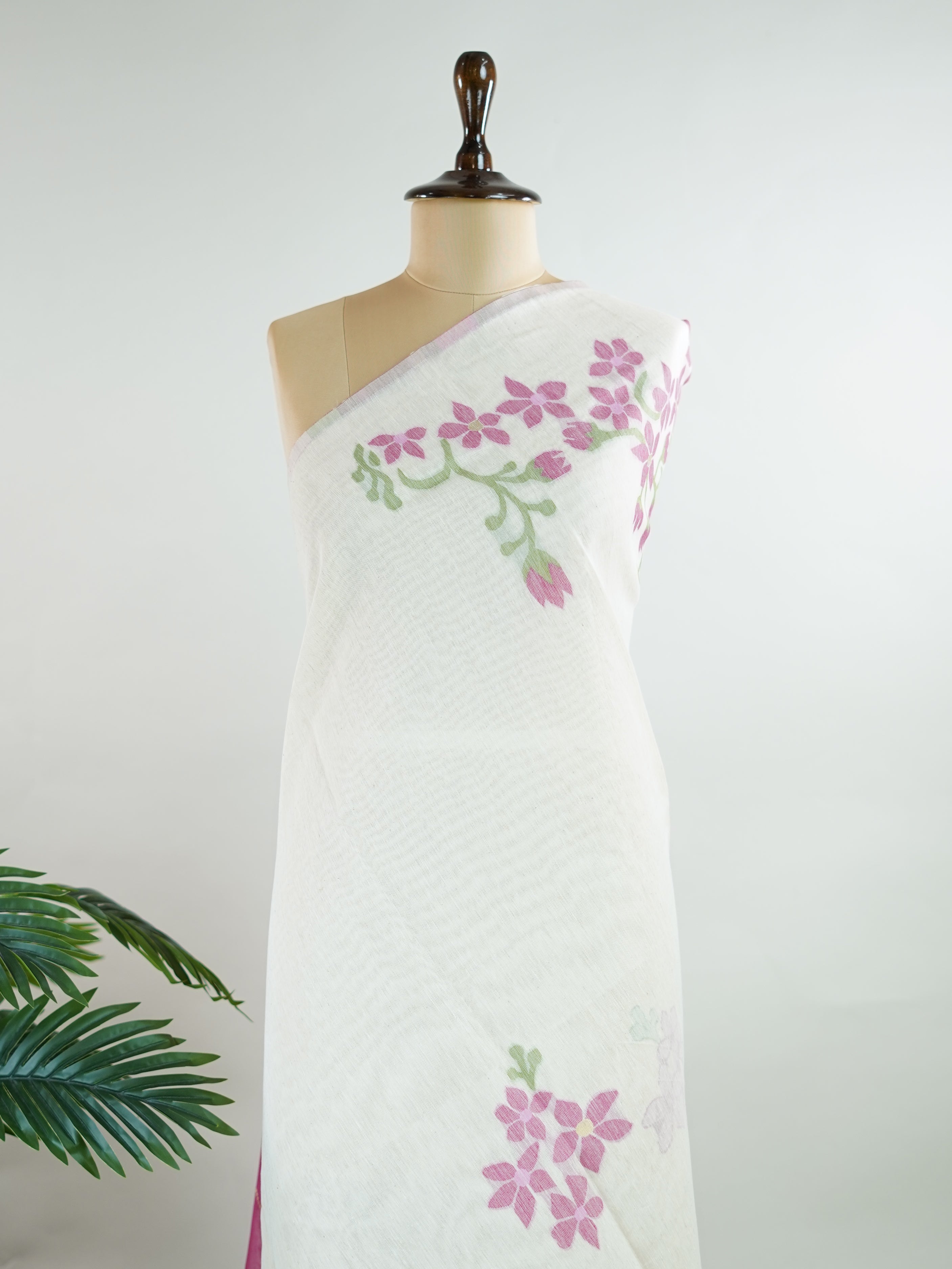 Floral motifs bloom gently across the body, untouched by zari for a pure, minimal look.