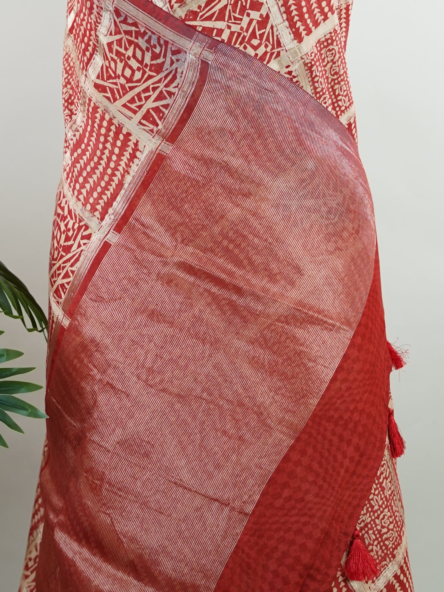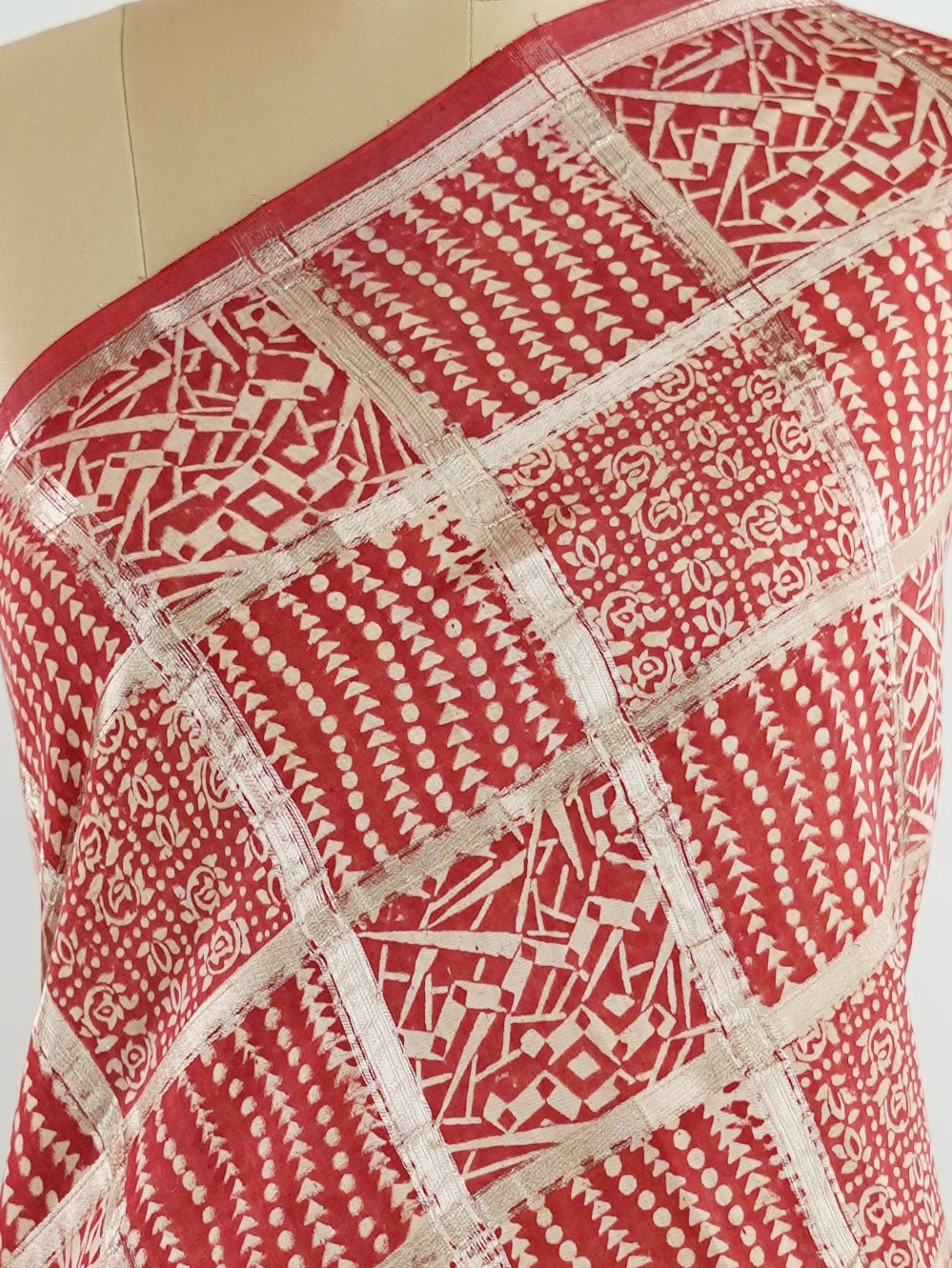 A bold red saree adorned with glinting gold block prints – vibrant yet graceful.