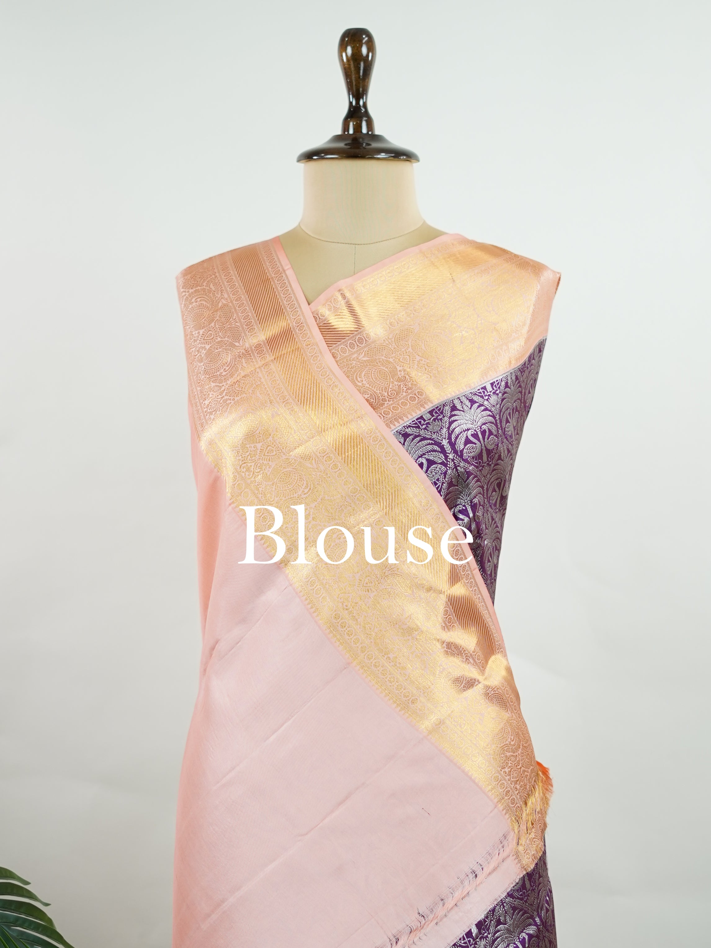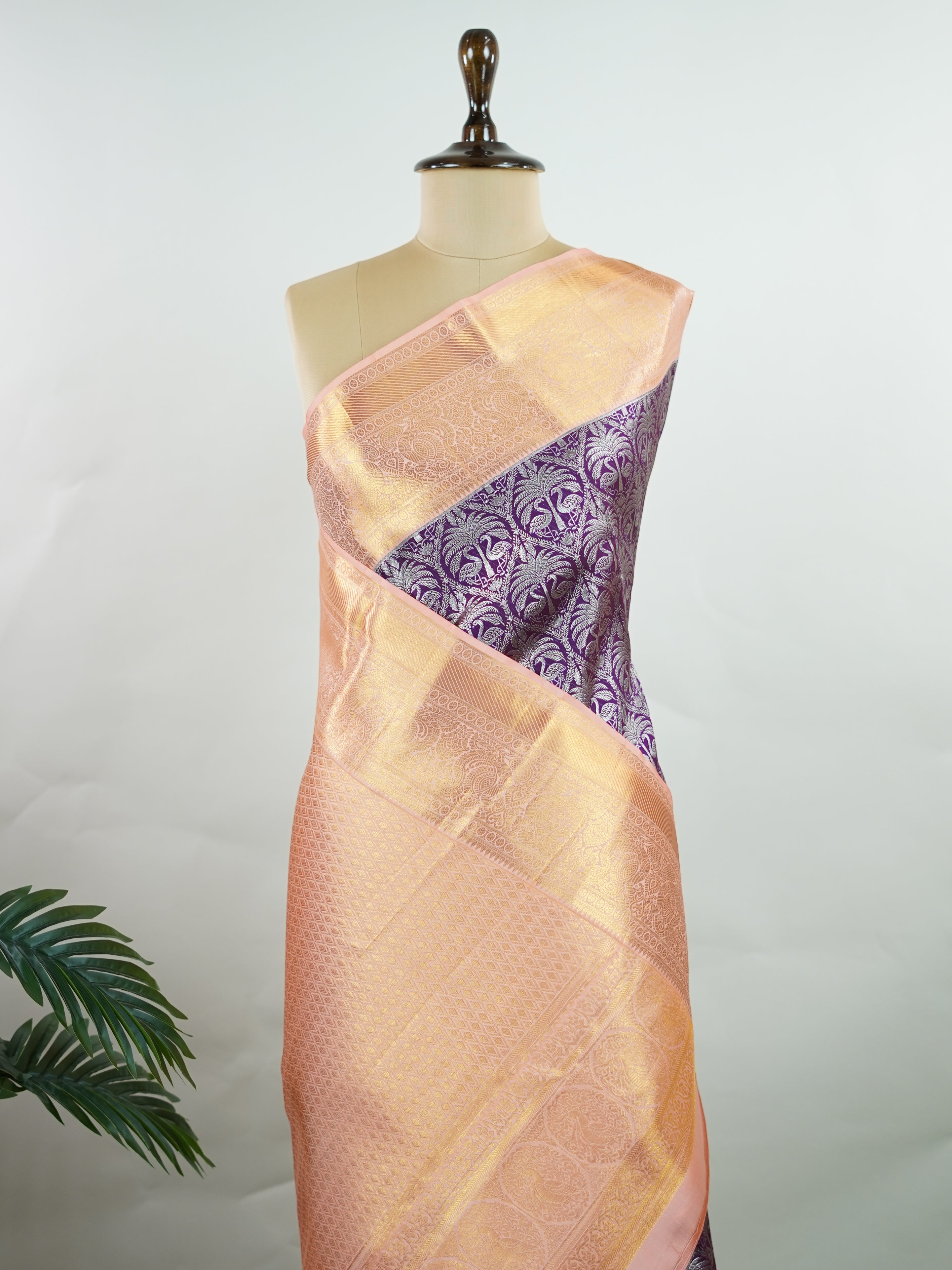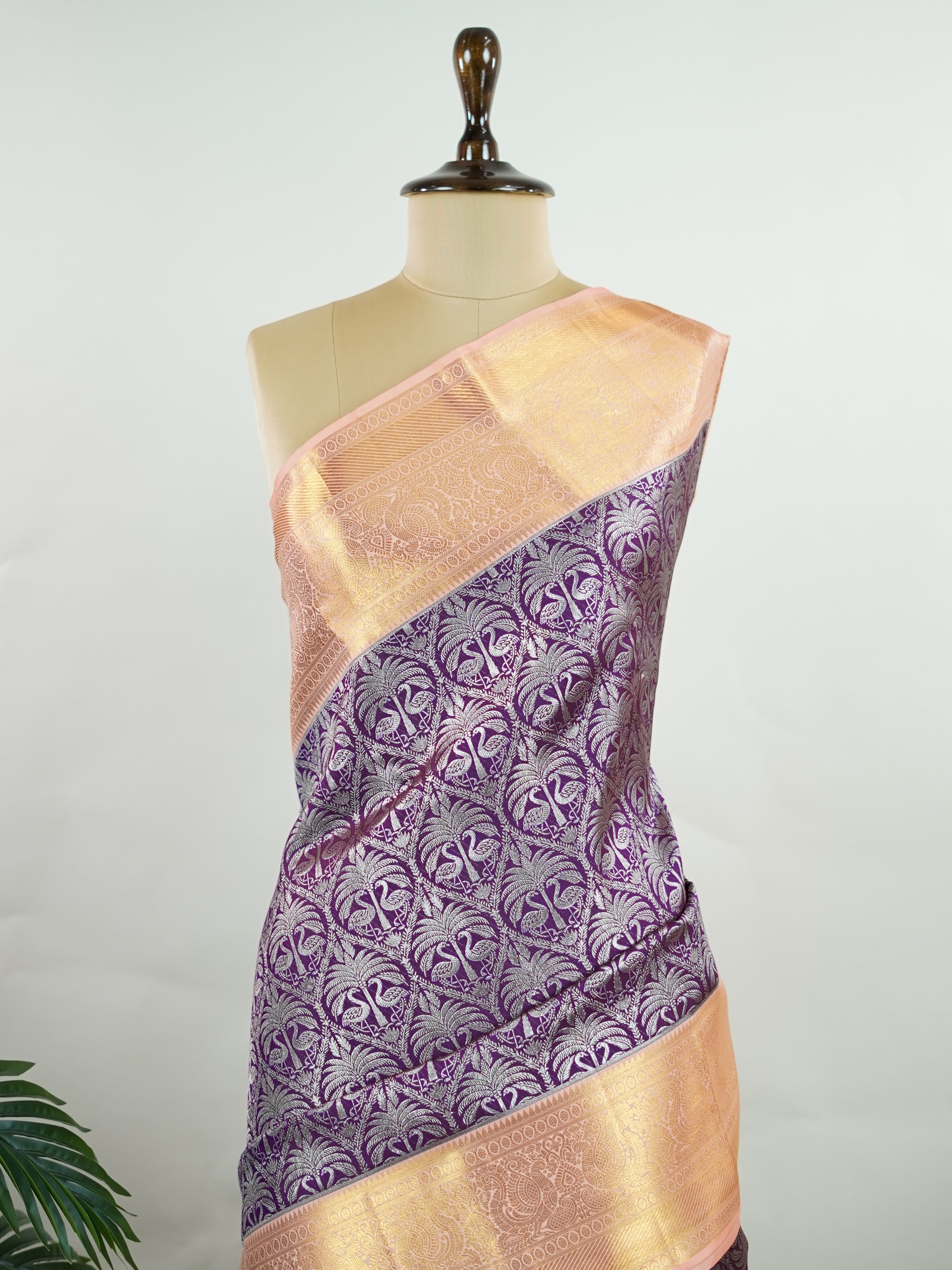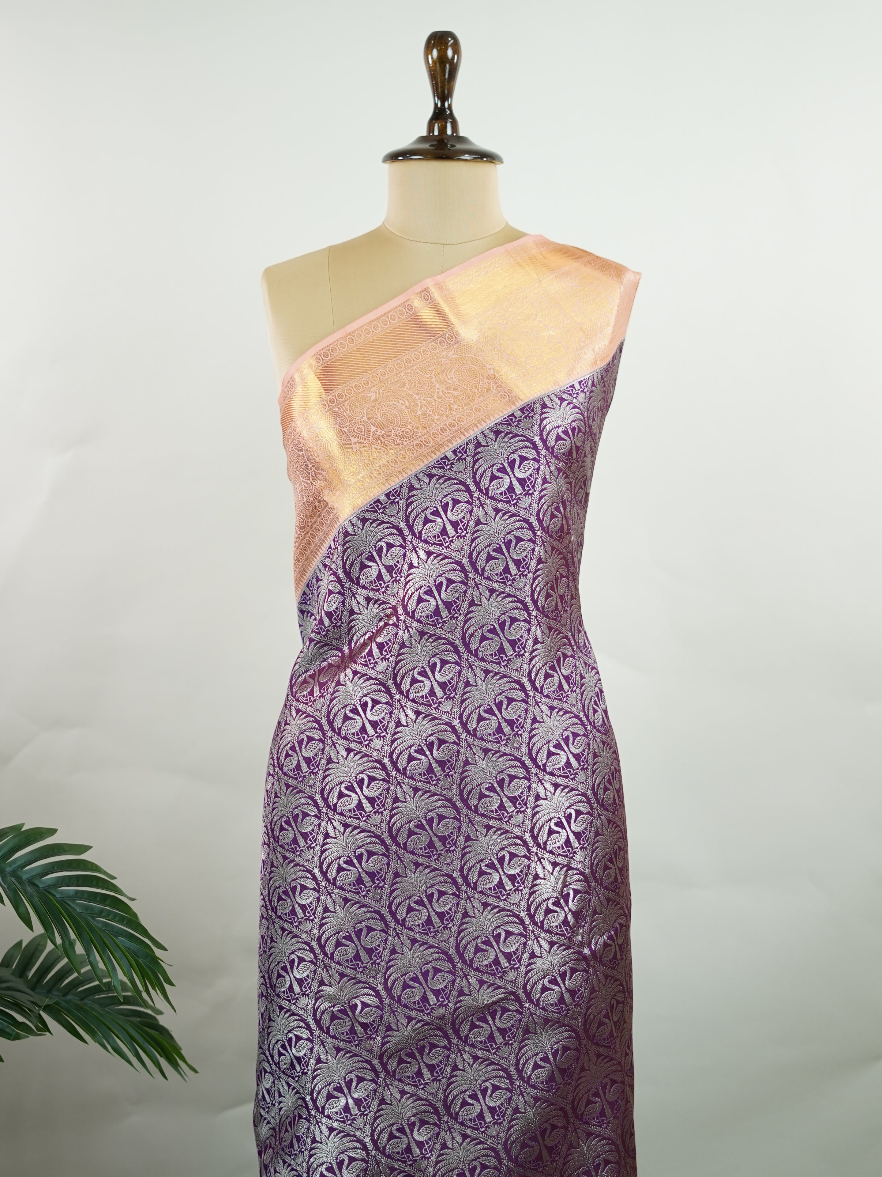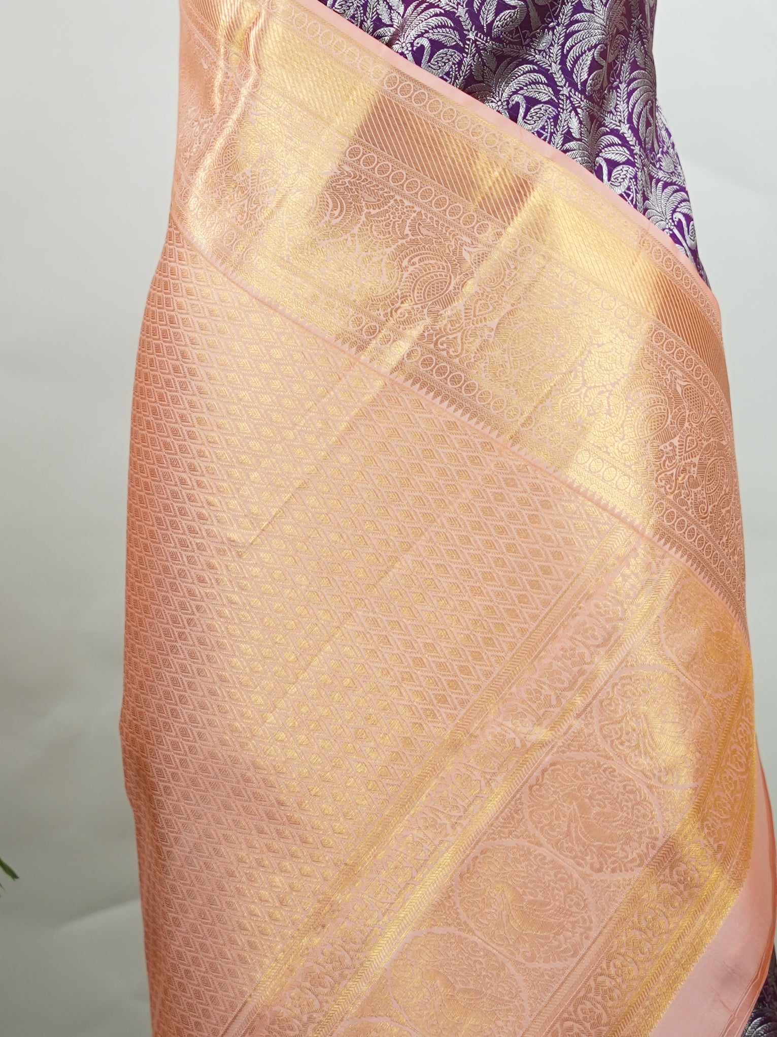 A rich dark magenta silk saree with peach borders, adorned with delicate silver zari buttas that glisten across the weave. The vibrant contrast exudes grace and tradition. Handwoven in Kanchipuram with 100% pure silk, it's perfect for weddings and festive celebrations. A timeless drape for treasured moments. #ManoranjithamSilks #KanjivaramHandloom #PureSilkSaree #BridalElegance #TimelessTradition