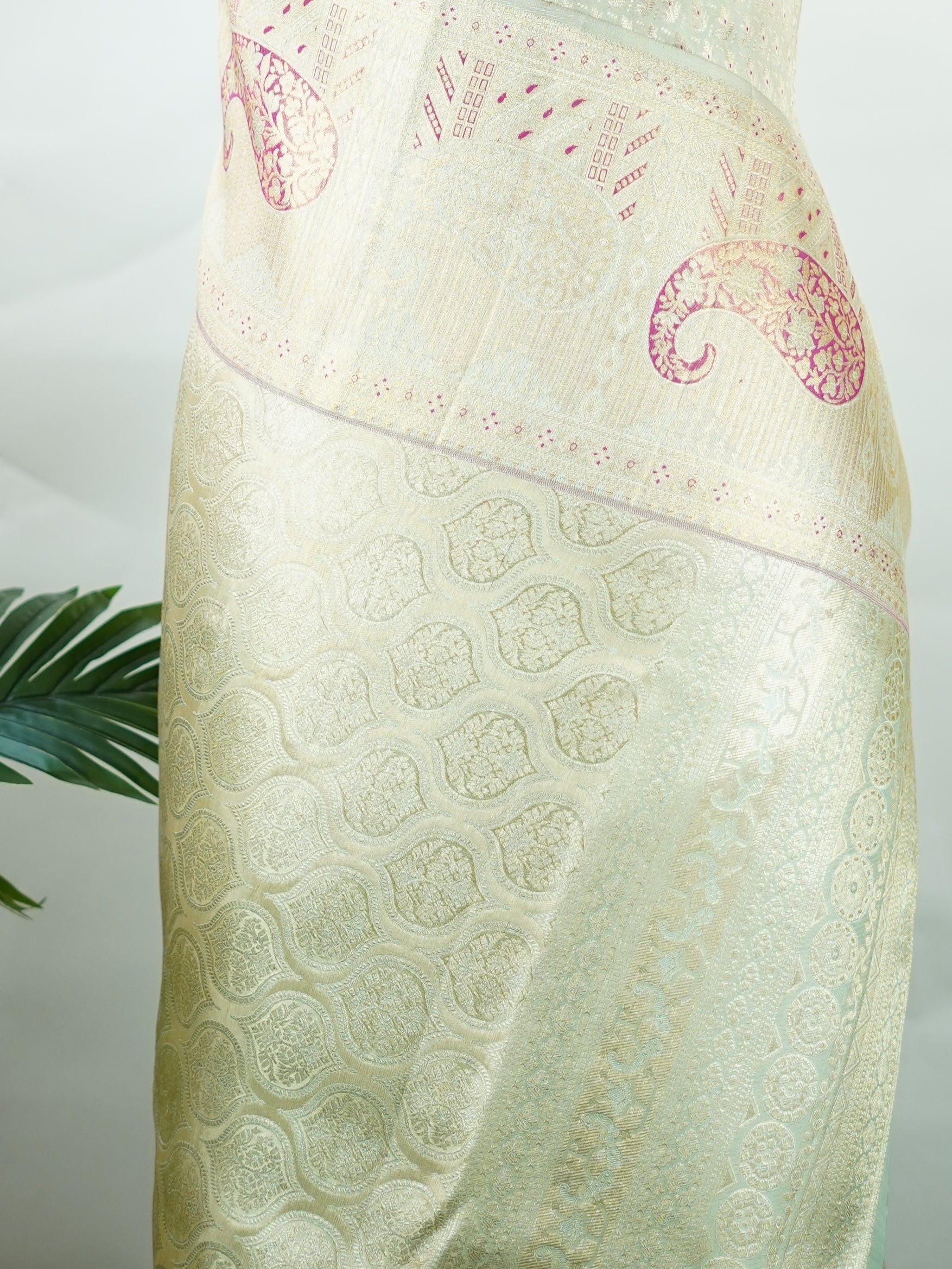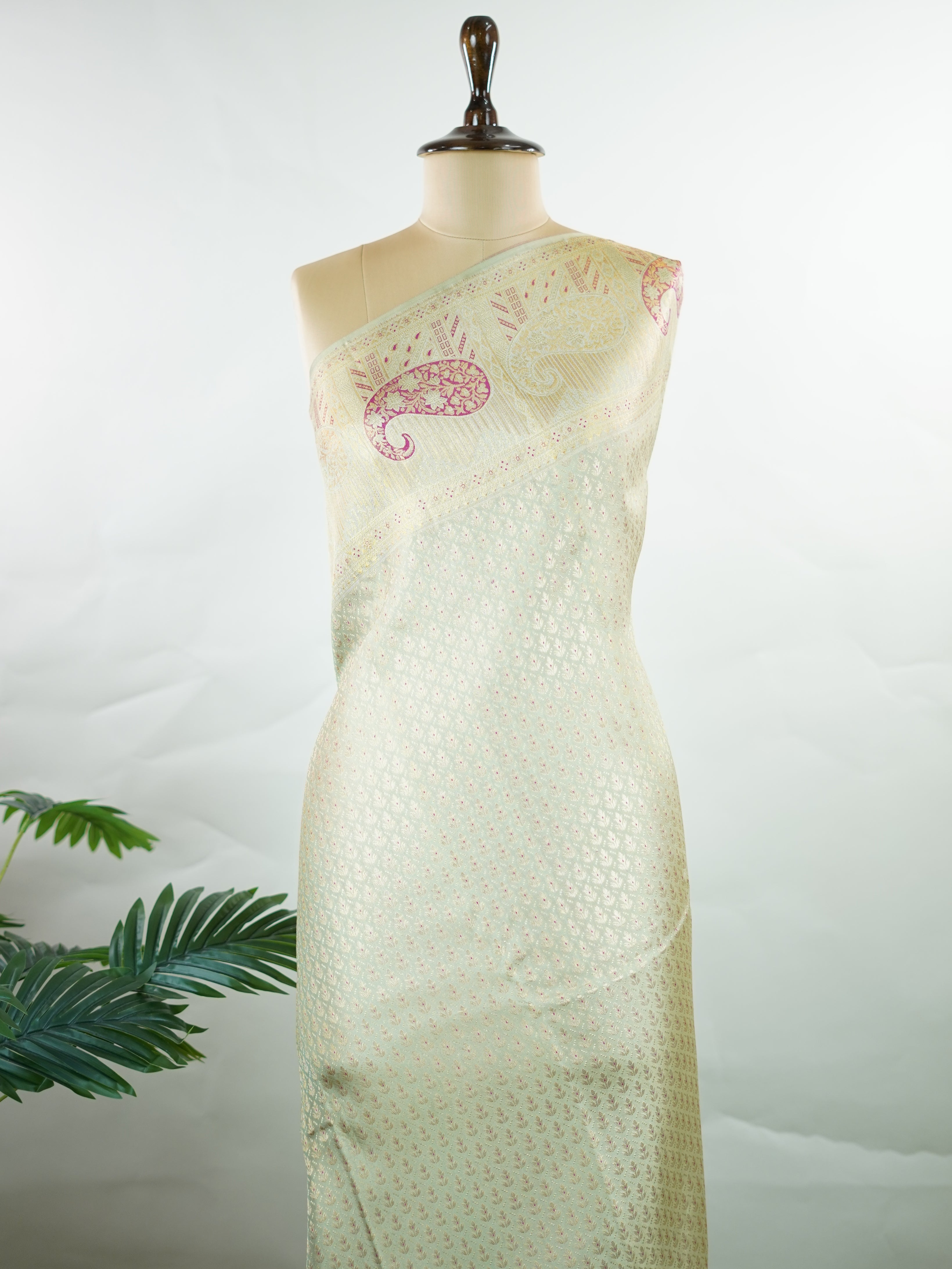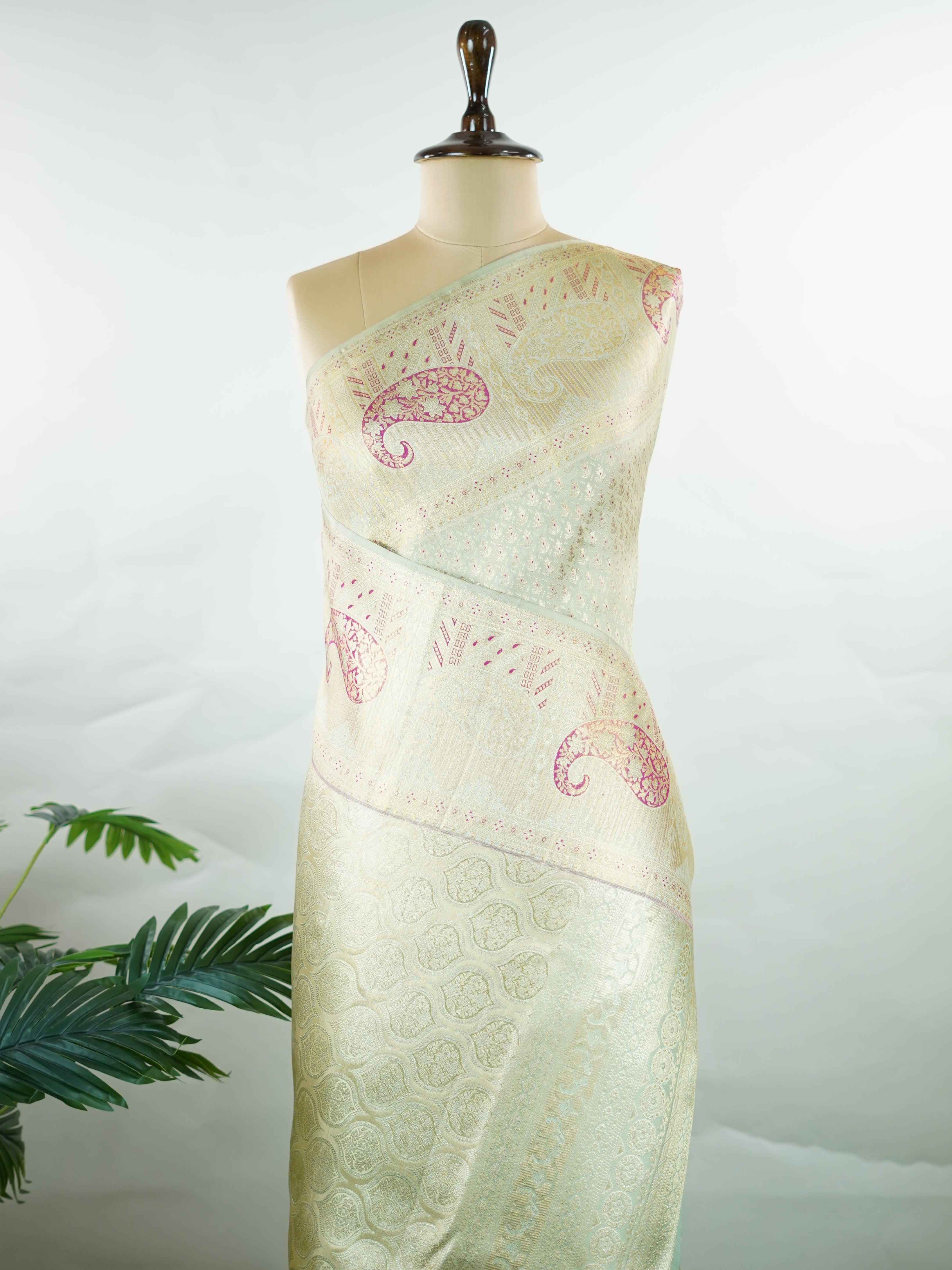 A striking teal silk saree with magenta borders, adorned with shimmering gold zari buttas across the weave. The bold contrast brings festive grandeur to timeless tradition. Handwoven in Kanchipuram with 100% pure silk, it's perfect for weddings and special celebrations. A drape that embodies elegance and heritage. #ManoranjithamSilks #KanjivaramHandloom #PureSilkSaree #BridalElegance #TimelessTradition