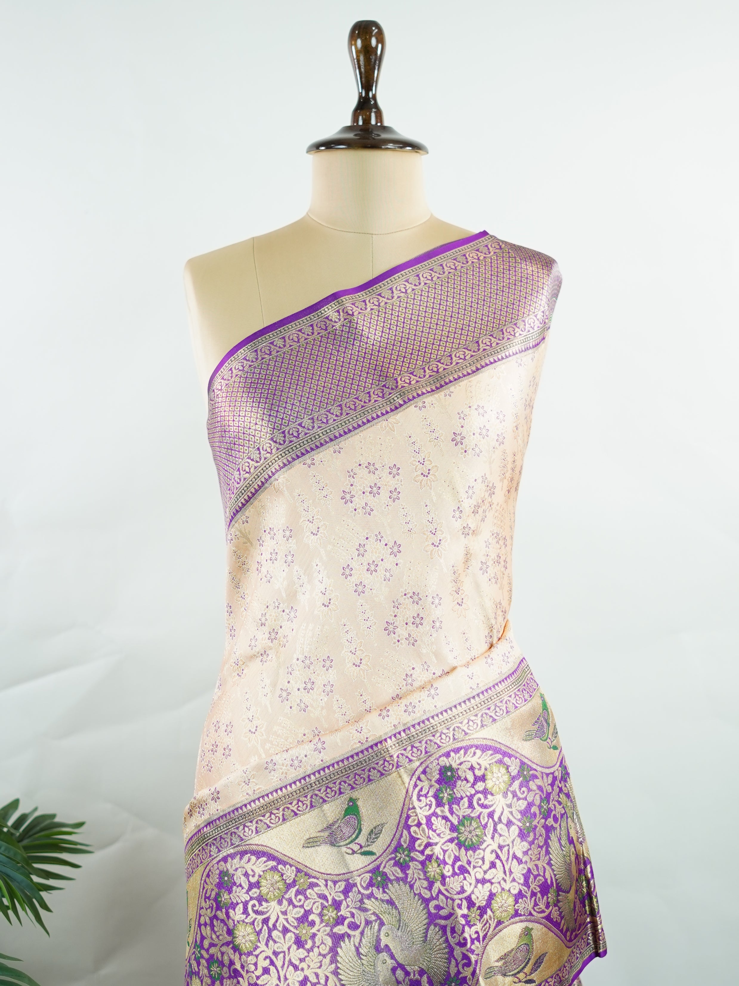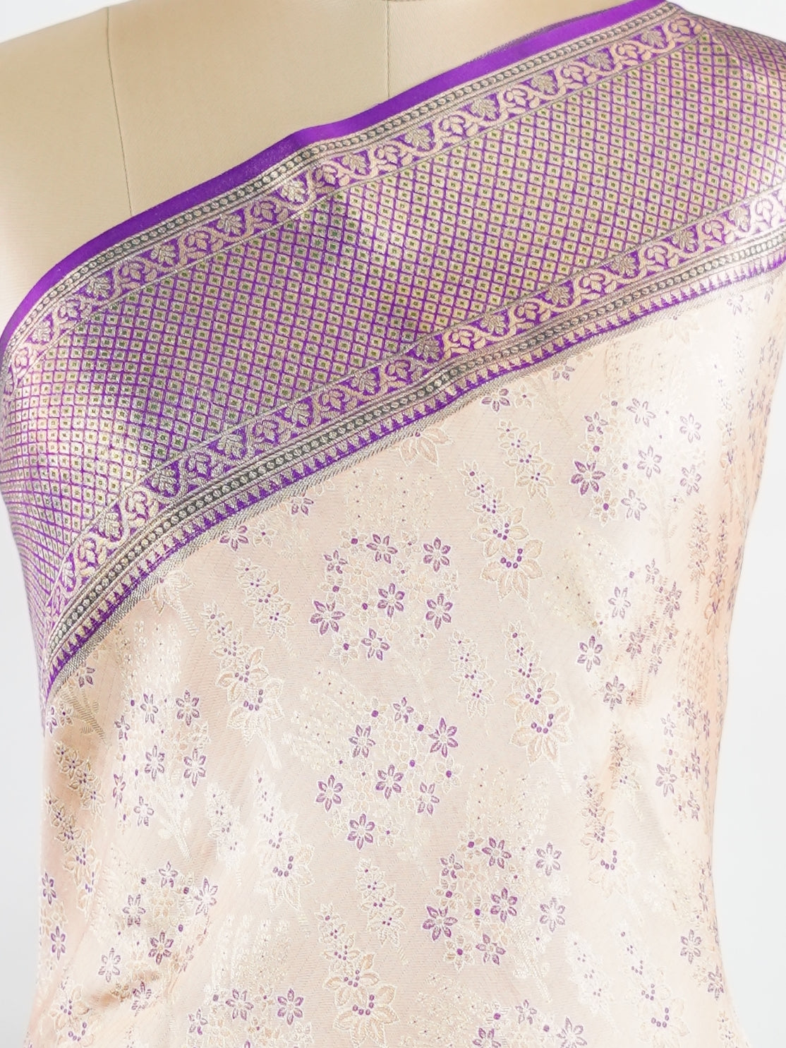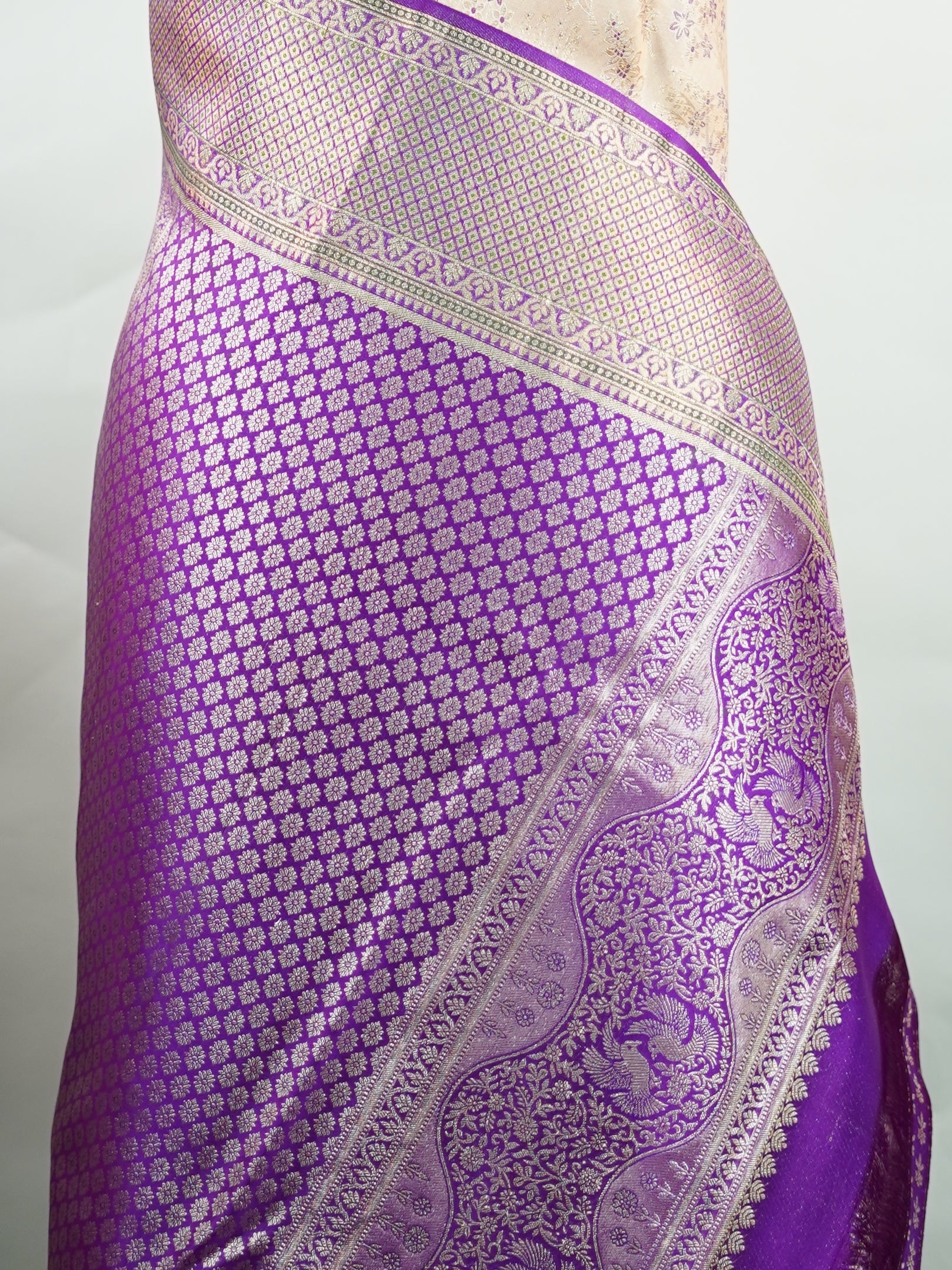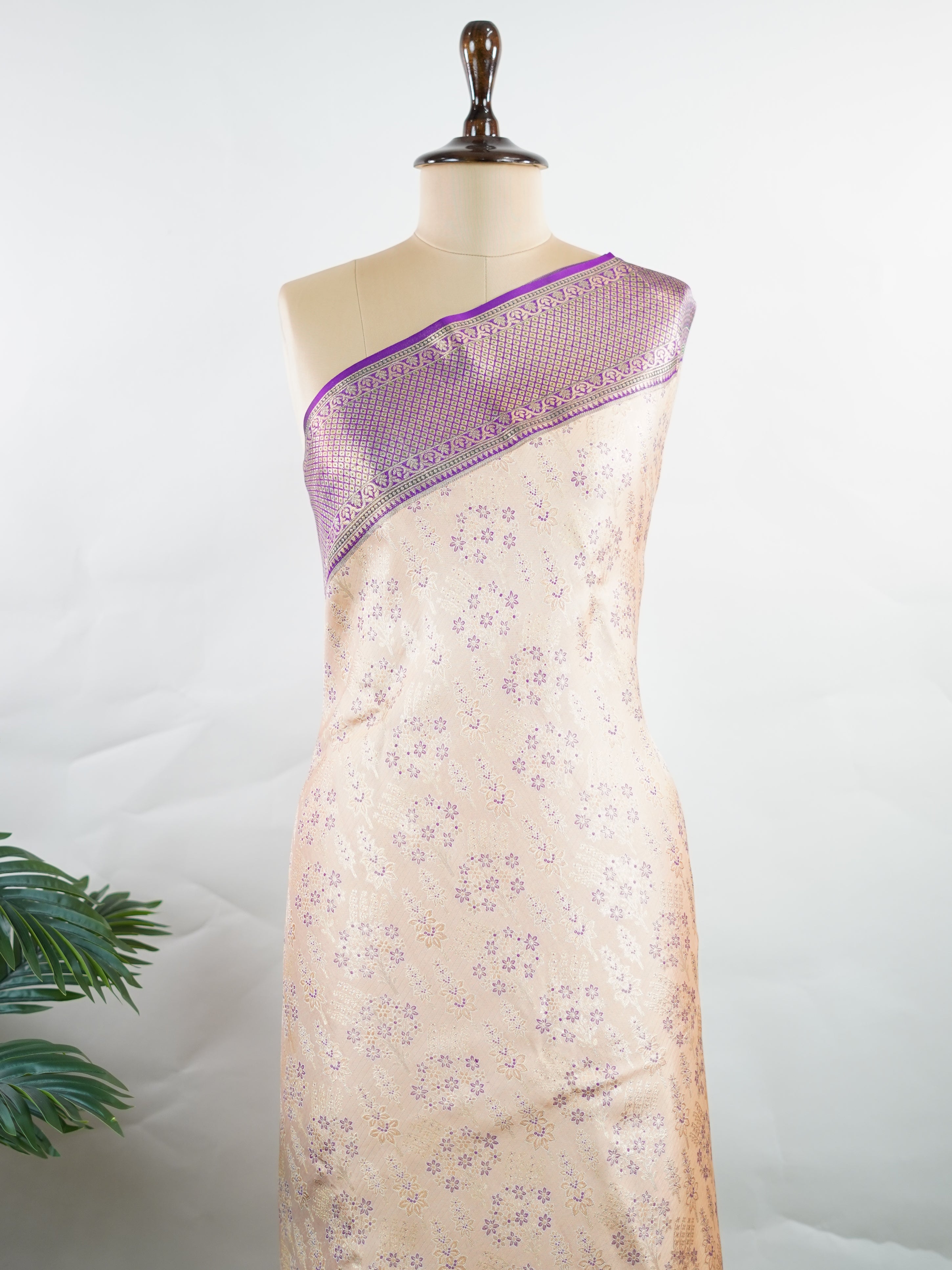 A soft peach silk saree with vibrant magenta borders, adorned with gold and silver zari buttas that shimmer delicately. The graceful contrast blends elegance with timeless tradition. Handwoven in Kanchipuram with 100% pure silk, it's perfect for weddings and festive celebrations. A drape that carries beauty across generations. #ManoranjithamSilks #KanjivaramHandloom #PureSilkSaree #BridalElegance #TimelessTradition