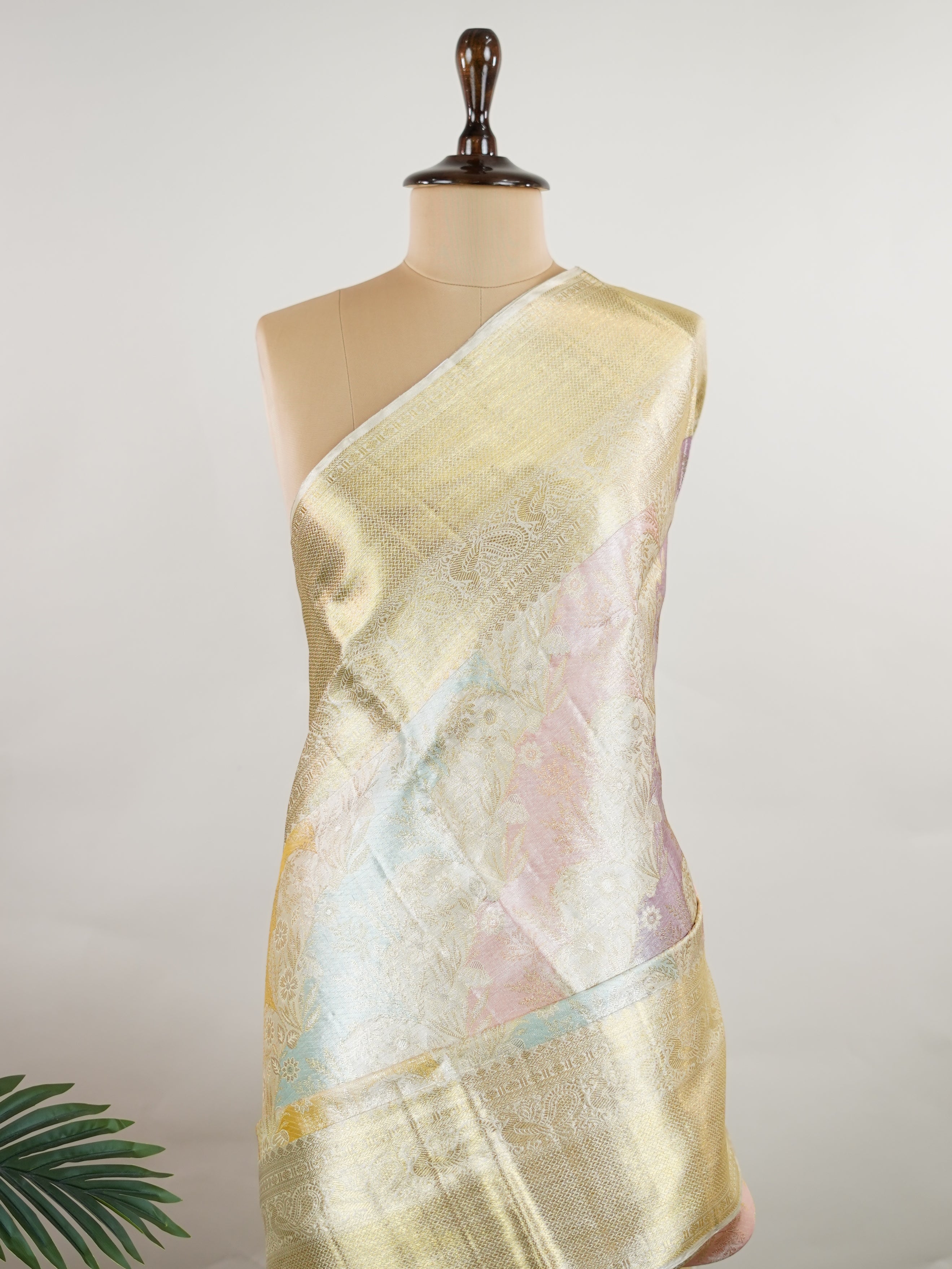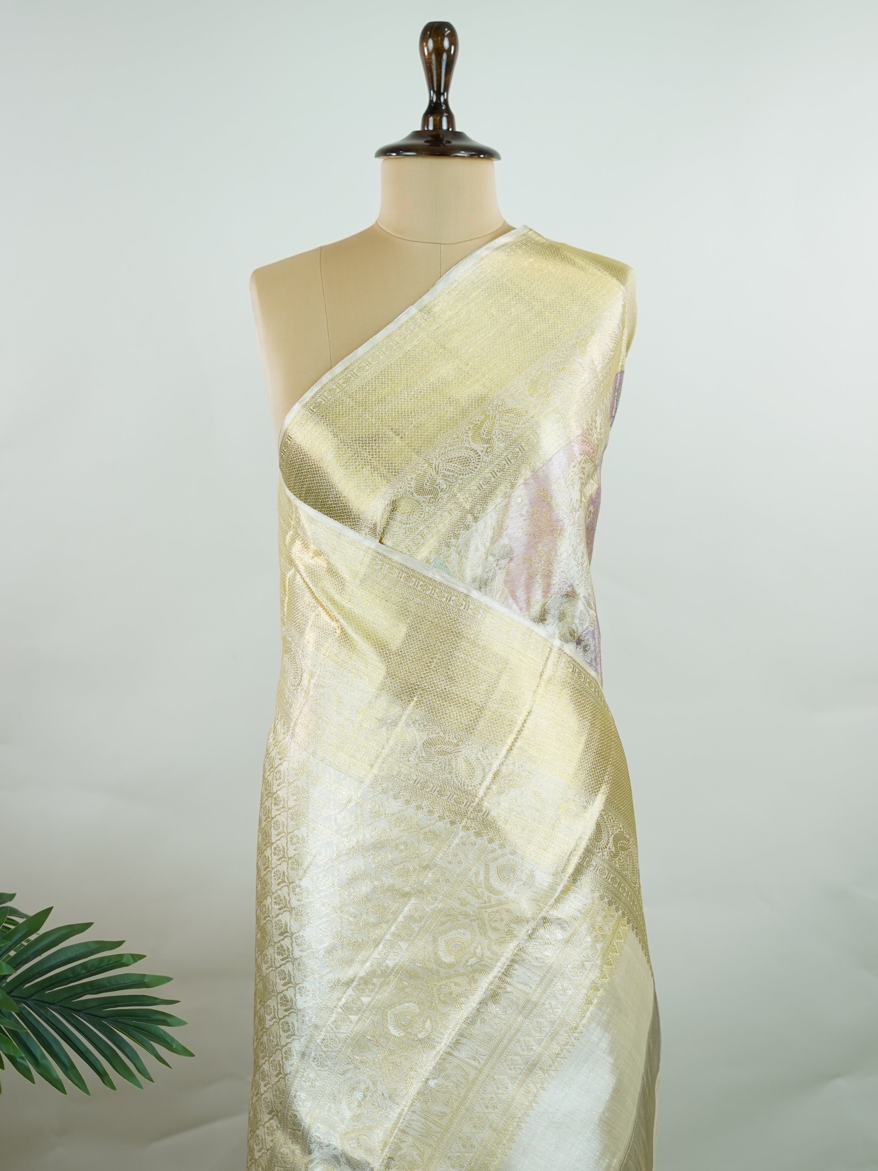 A timeless treasure for the bride, this pure handloom Kanjivaram saree radiates grandeur with every thread. Woven by master weavers, it carries the weight of tradition and the shimmer of celebration. With its bold zari work and majestic drape, it is crafted to make a bride feel divine on her most special day. An heirloom in the making, steeped in culture and grace.