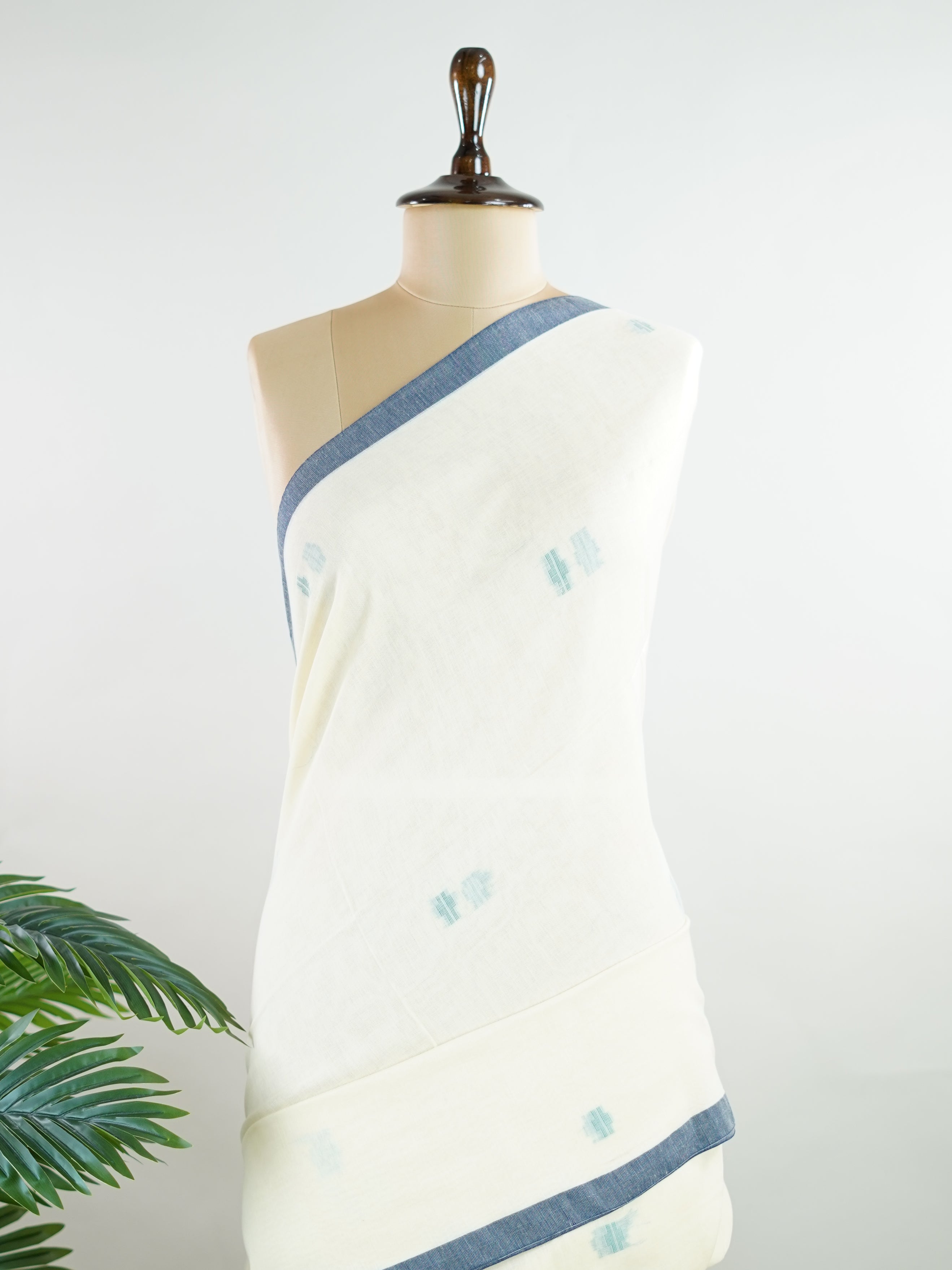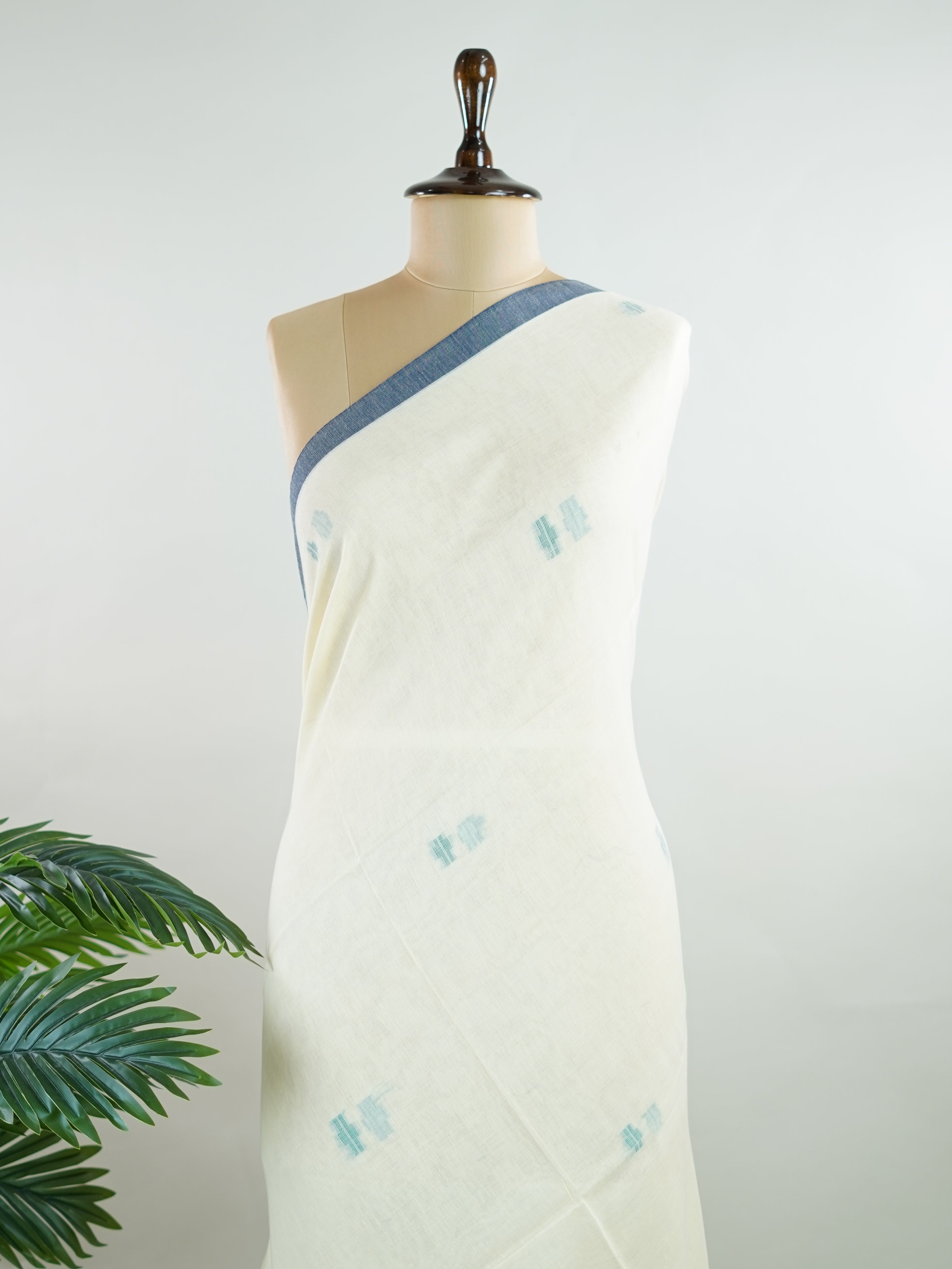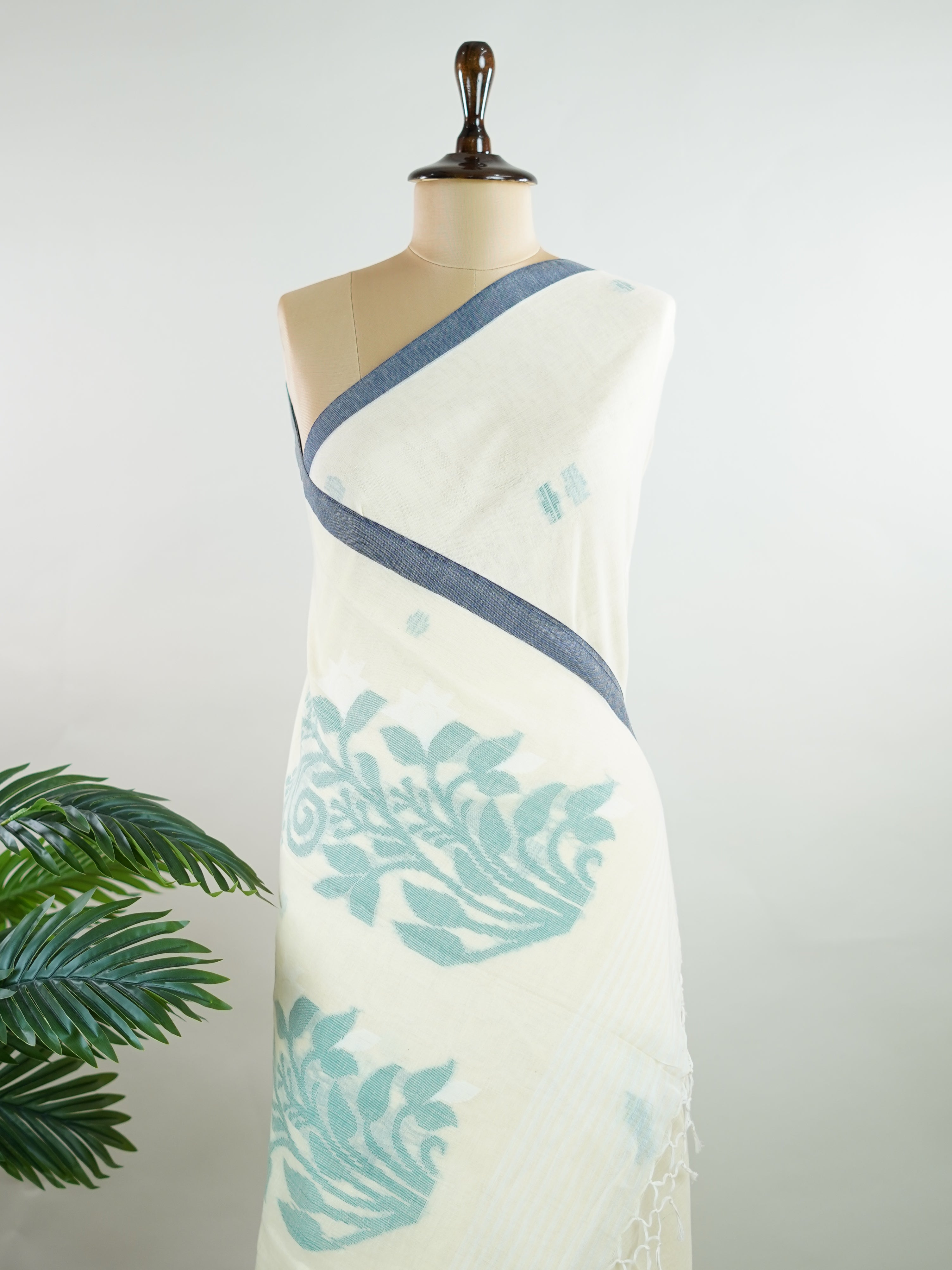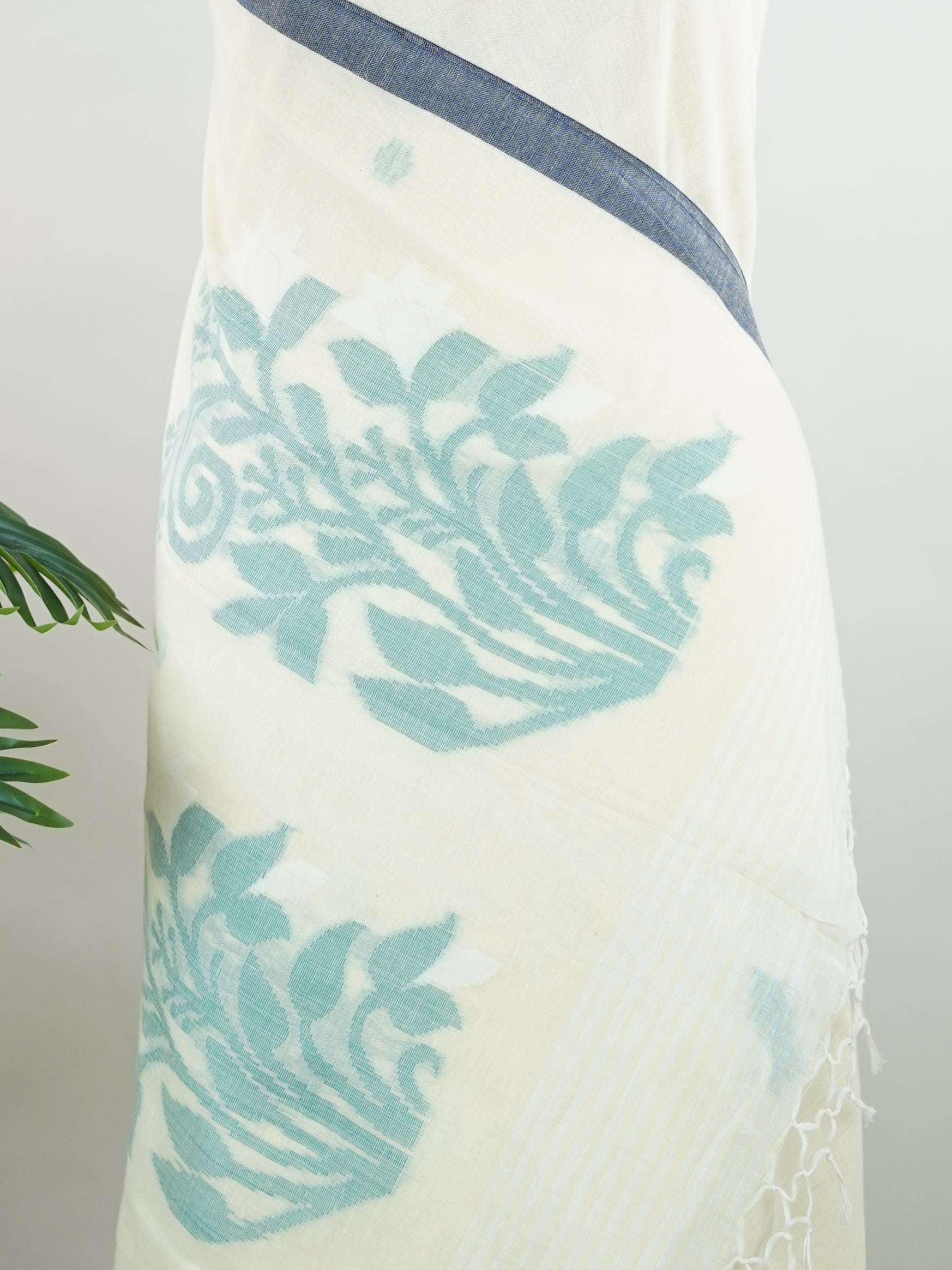 Woven with care in the looms of West Bengal, this 100% pure cotton saree blends everyday comfort with understated elegance. Fine zari floral designs shimmer softly against the breathable fabric, while the small border adds a touch of refinement. Lightweight and timeless, it’s perfect for summer gatherings and quiet celebrations