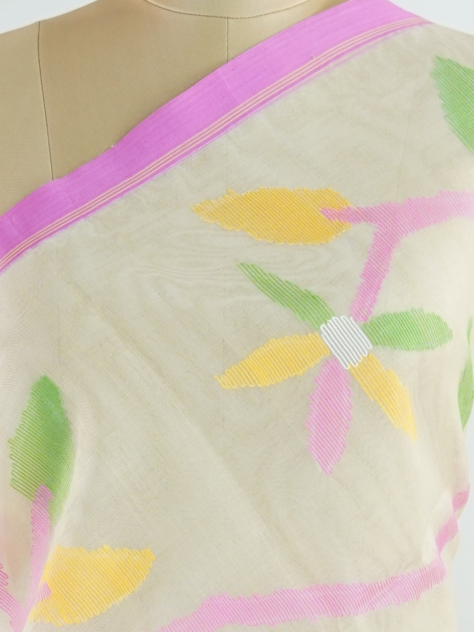 Woven with care in the looms of West Bengal, this 100% pure cotton saree blends everyday comfort with understated elegance. Fine zari floral designs shimmer softly against the breathable fabric, while the small border adds a touch of refinement. Lightweight and timeless, it’s perfect for summer gatherings and quiet celebrations
