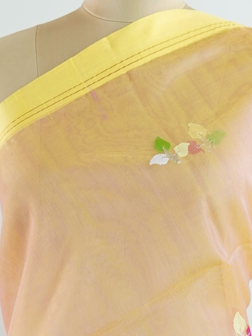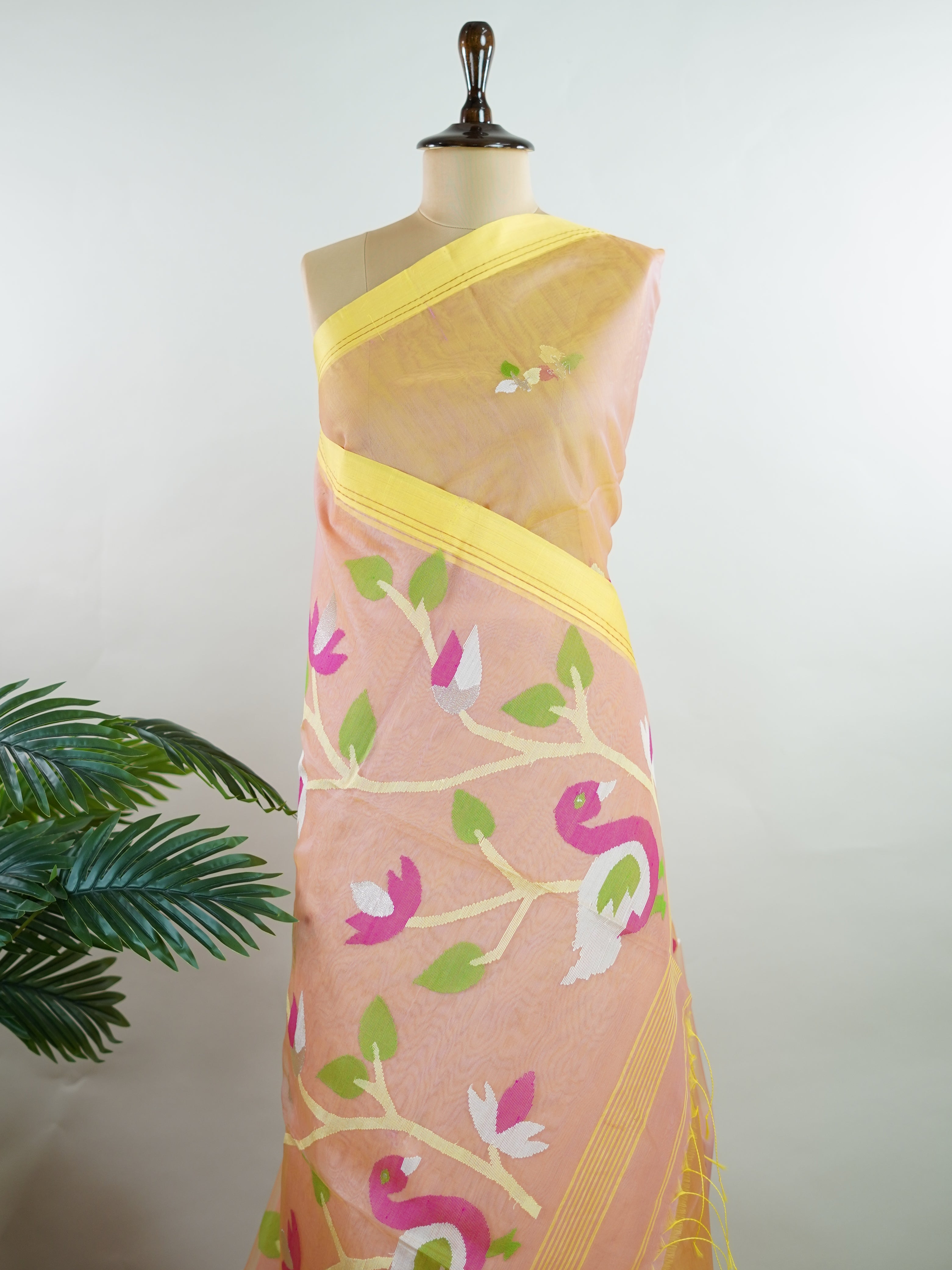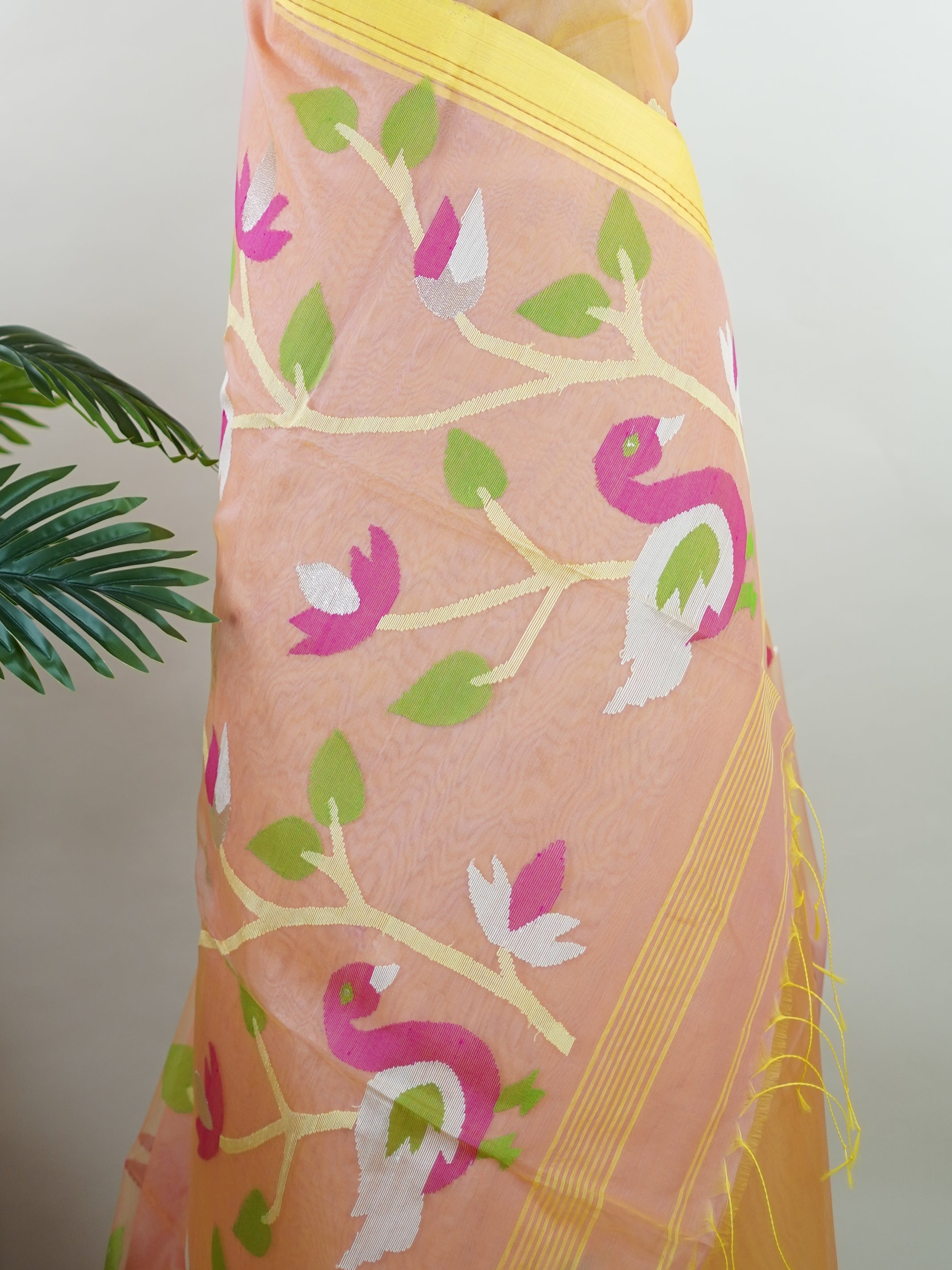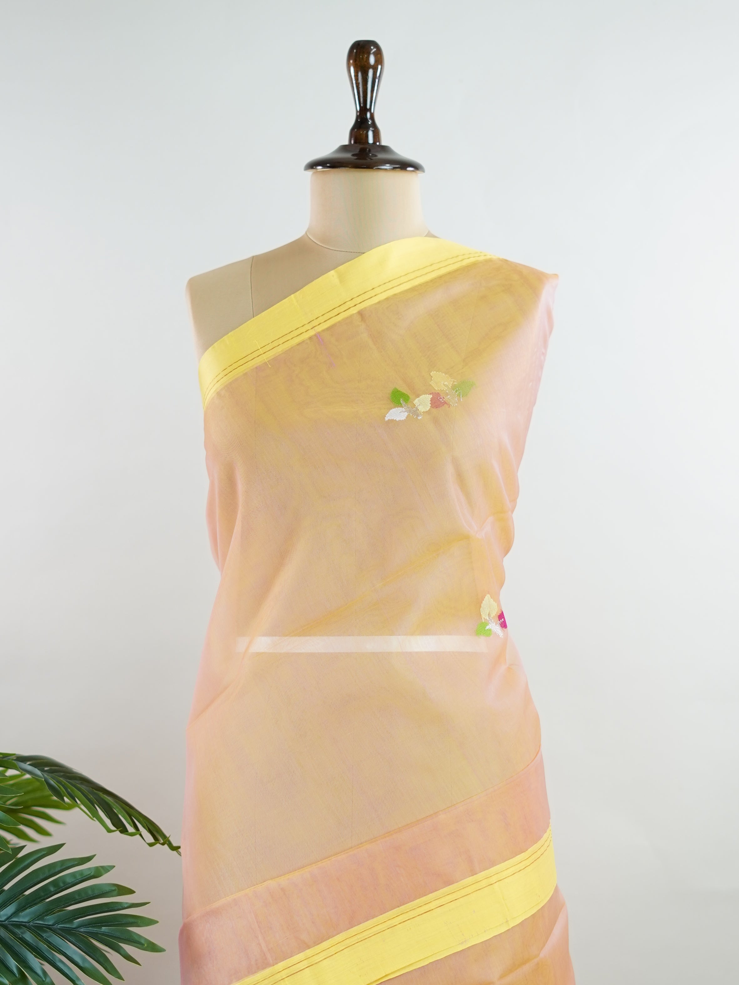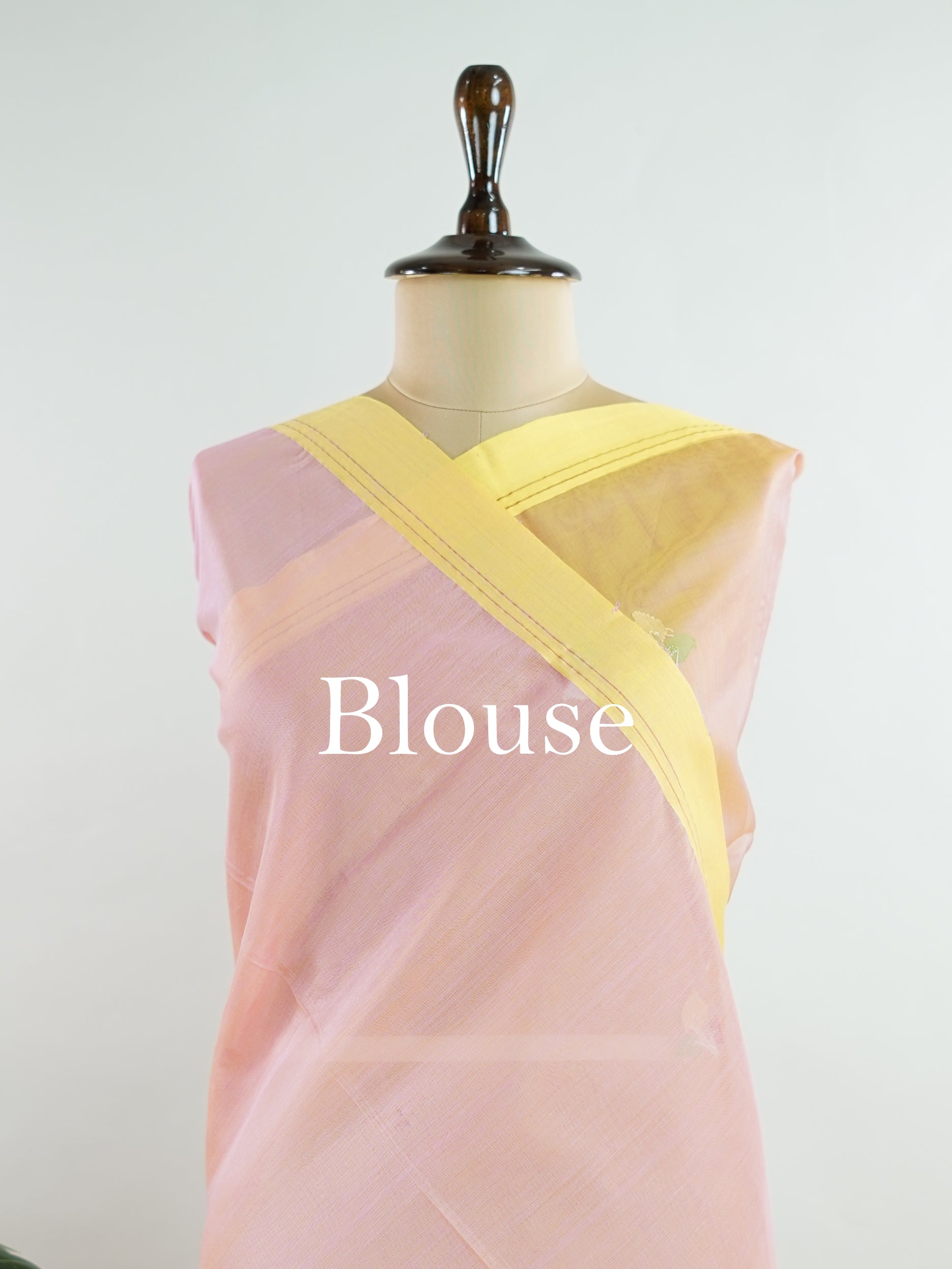 Woven with care in the looms of West Bengal, this 100% pure cotton saree blends everyday comfort with understated elegance. Fine zari floral designs shimmer softly against the breathable fabric, while the small border adds a touch of refinement. Lightweight and timeless, it’s perfect for summer gatherings and quiet celebrations
