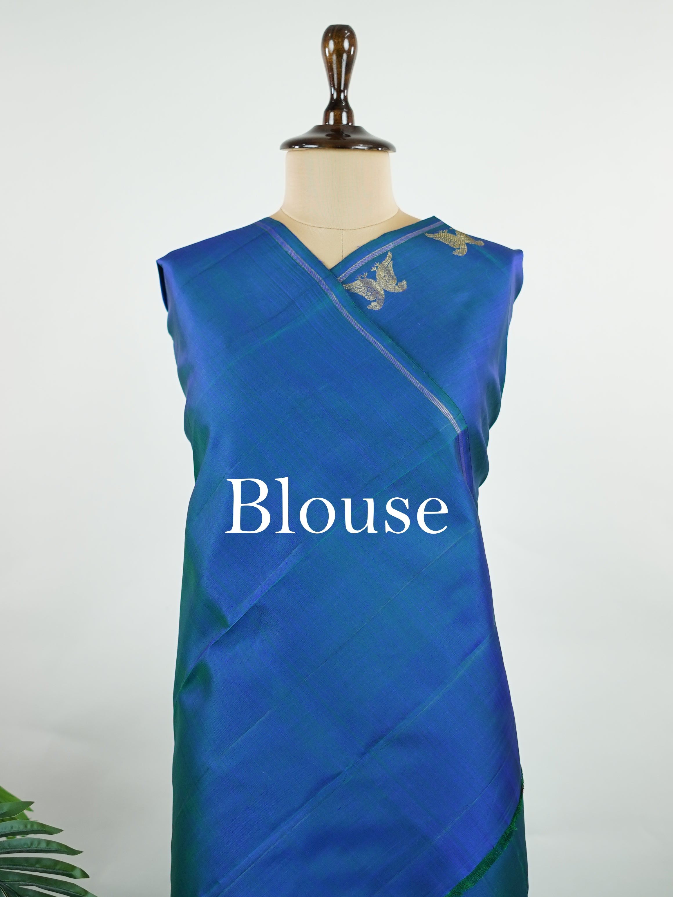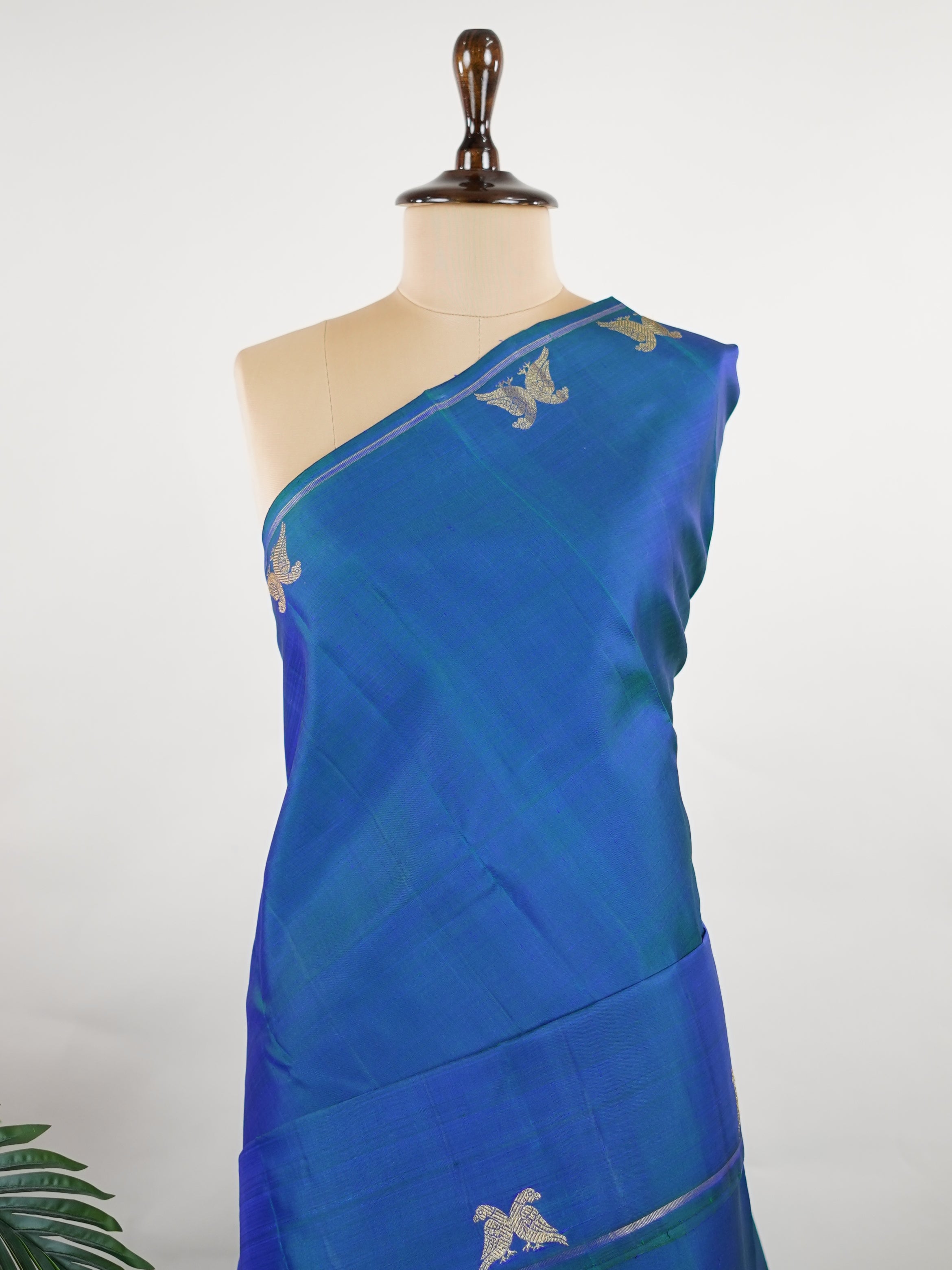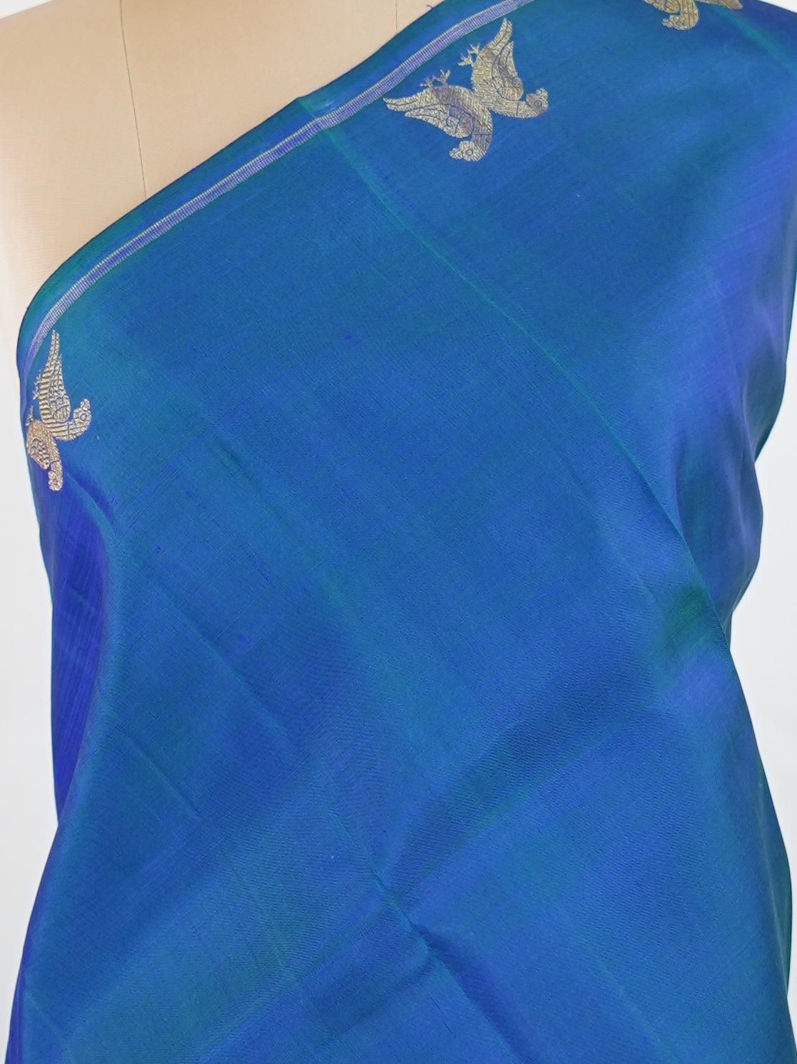 A rare gem from Kanchipuram, this 100% pure silk saree in peacock blue features a rich plain weave with radiant gold highlights. Its borderless silhouette brings a modern elegance while staying rooted in classic tradition.