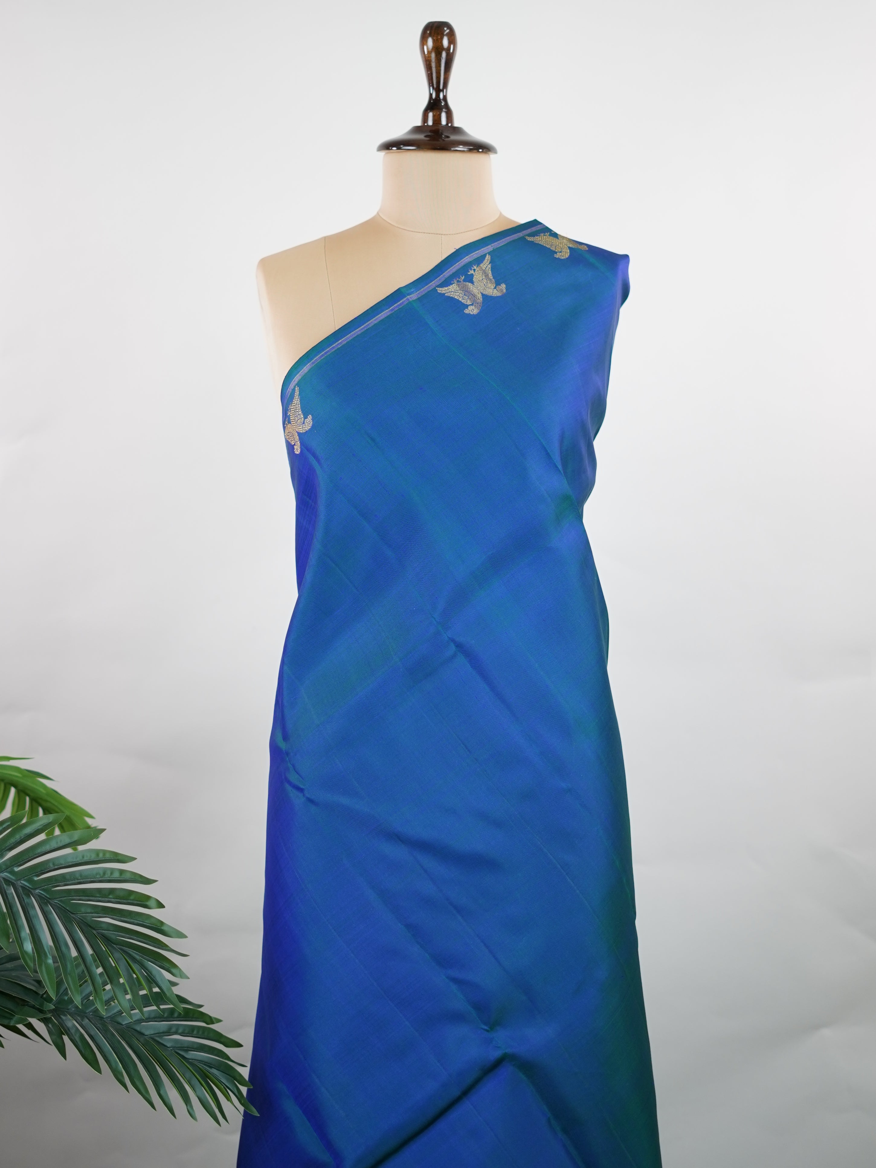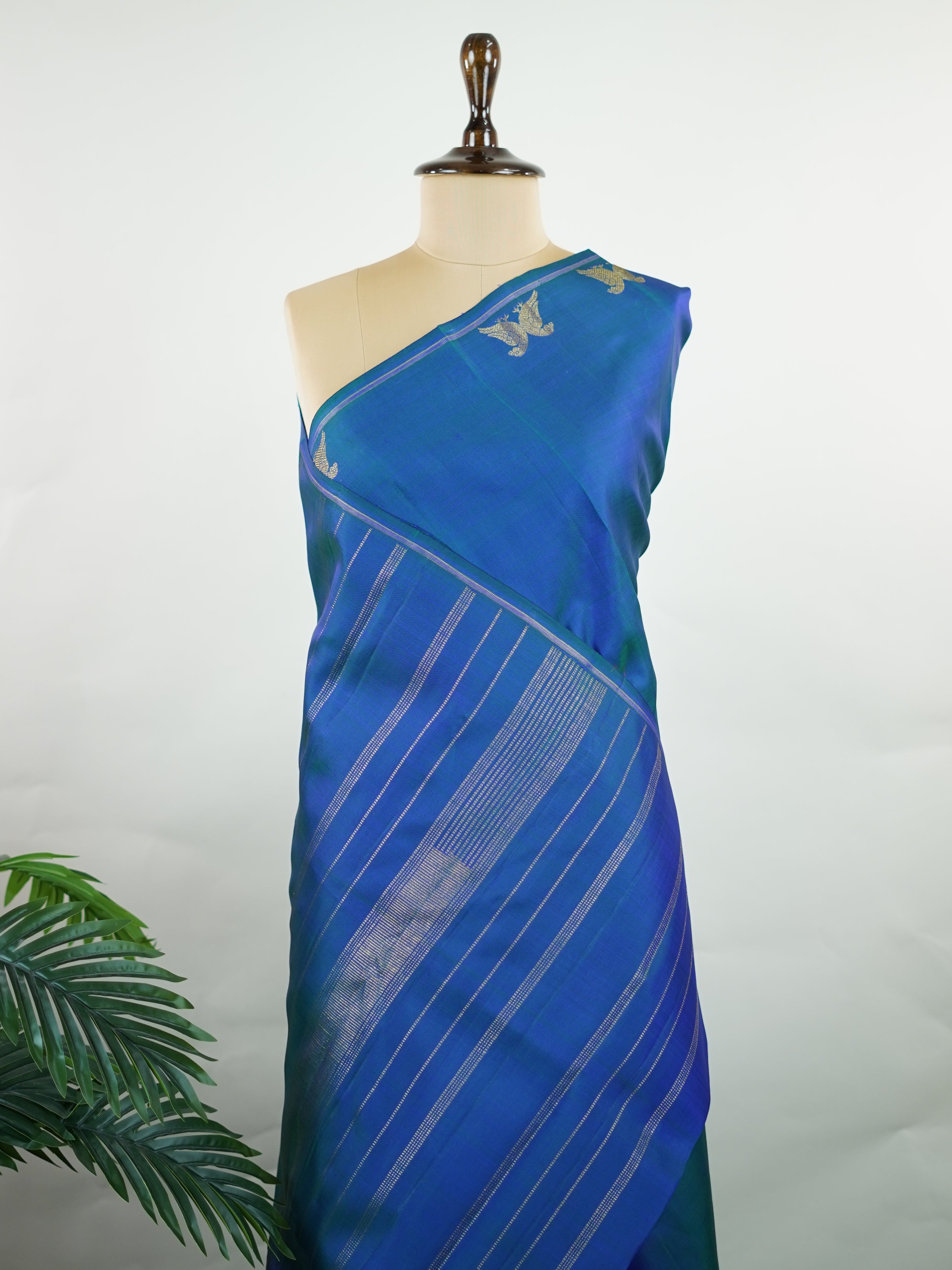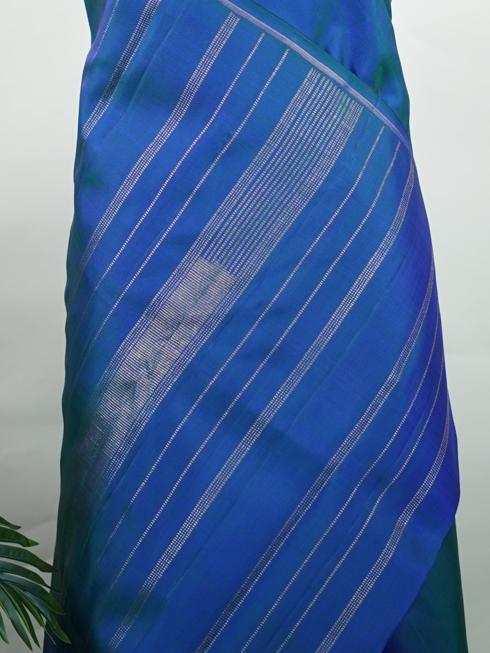 A rare gem from Kanchipuram, this 100% pure silk saree in peacock blue features a rich plain weave with radiant gold highlights. Its borderless silhouette brings a modern elegance while staying rooted in classic tradition.