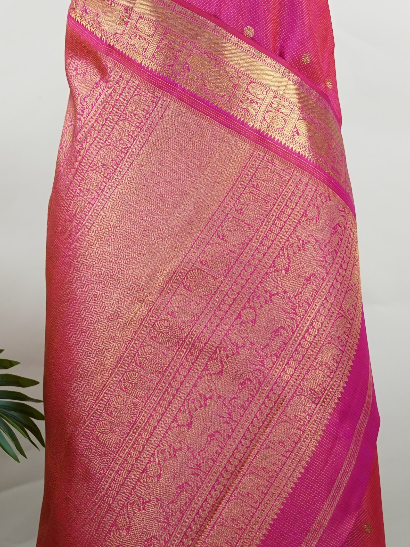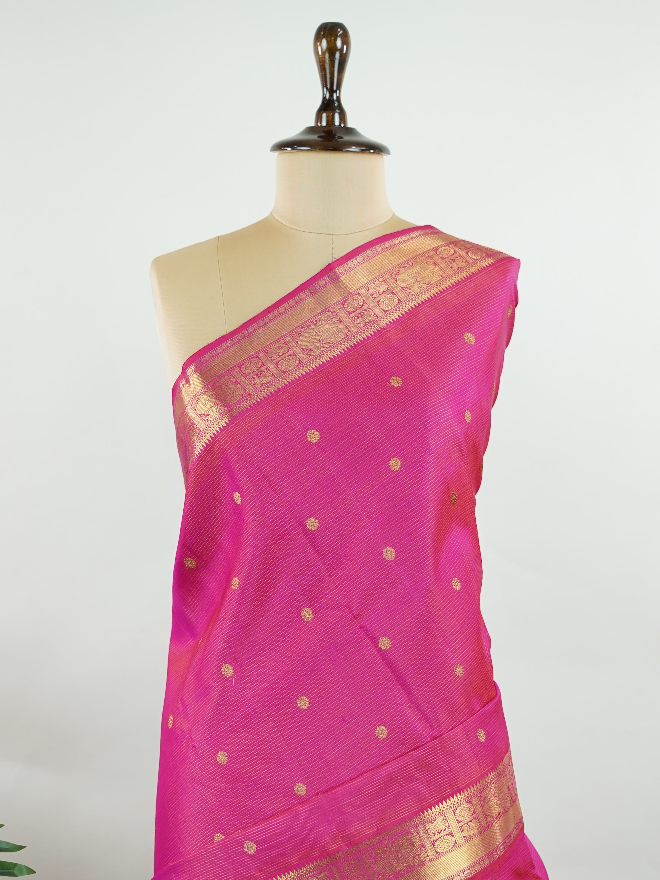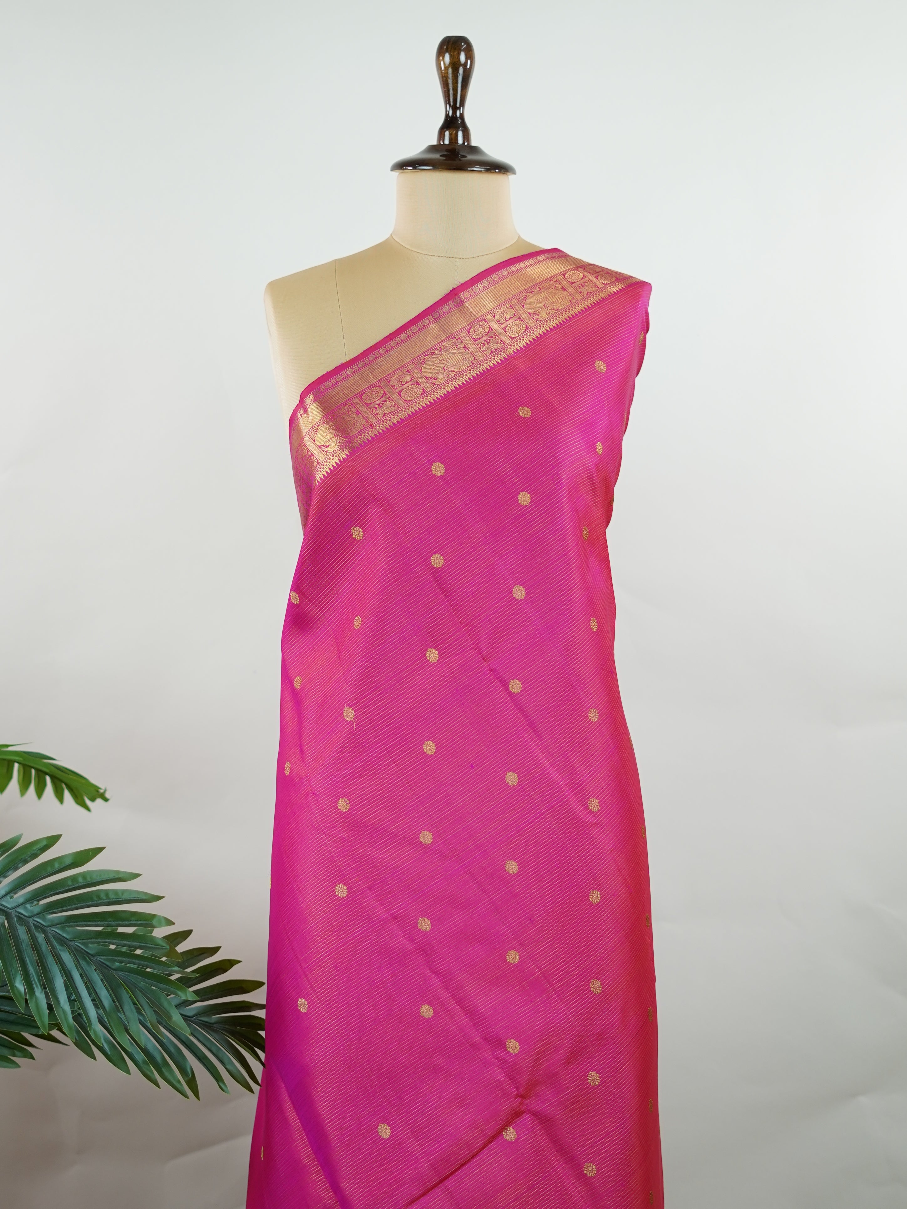 Woven in 100% pure silk, this pink Kanchipuram saree features the iconic Vairavoosi pattern with subtle gold zari and a medium border that balances richness with grace. A tribute to timeless handloom tradition, this drape speaks of heritage and fine artistry. An elegant choice for those who love bold hues in a refined frame. Crafted with devotion by Manoranjitham. #KanchipuramSilk #Manoranjitham #PureSilkSaree #Vairavoosi #HandloomElegance