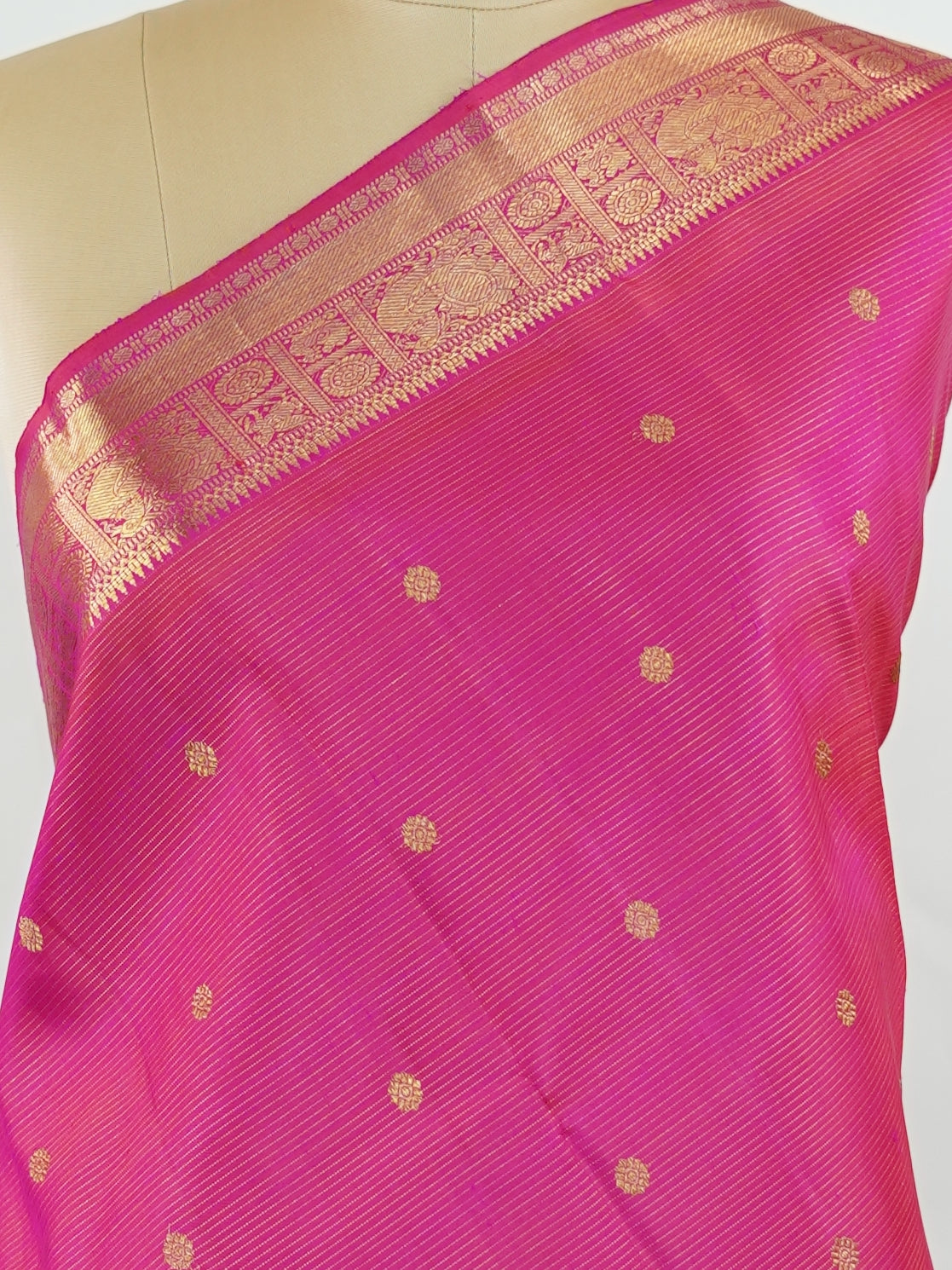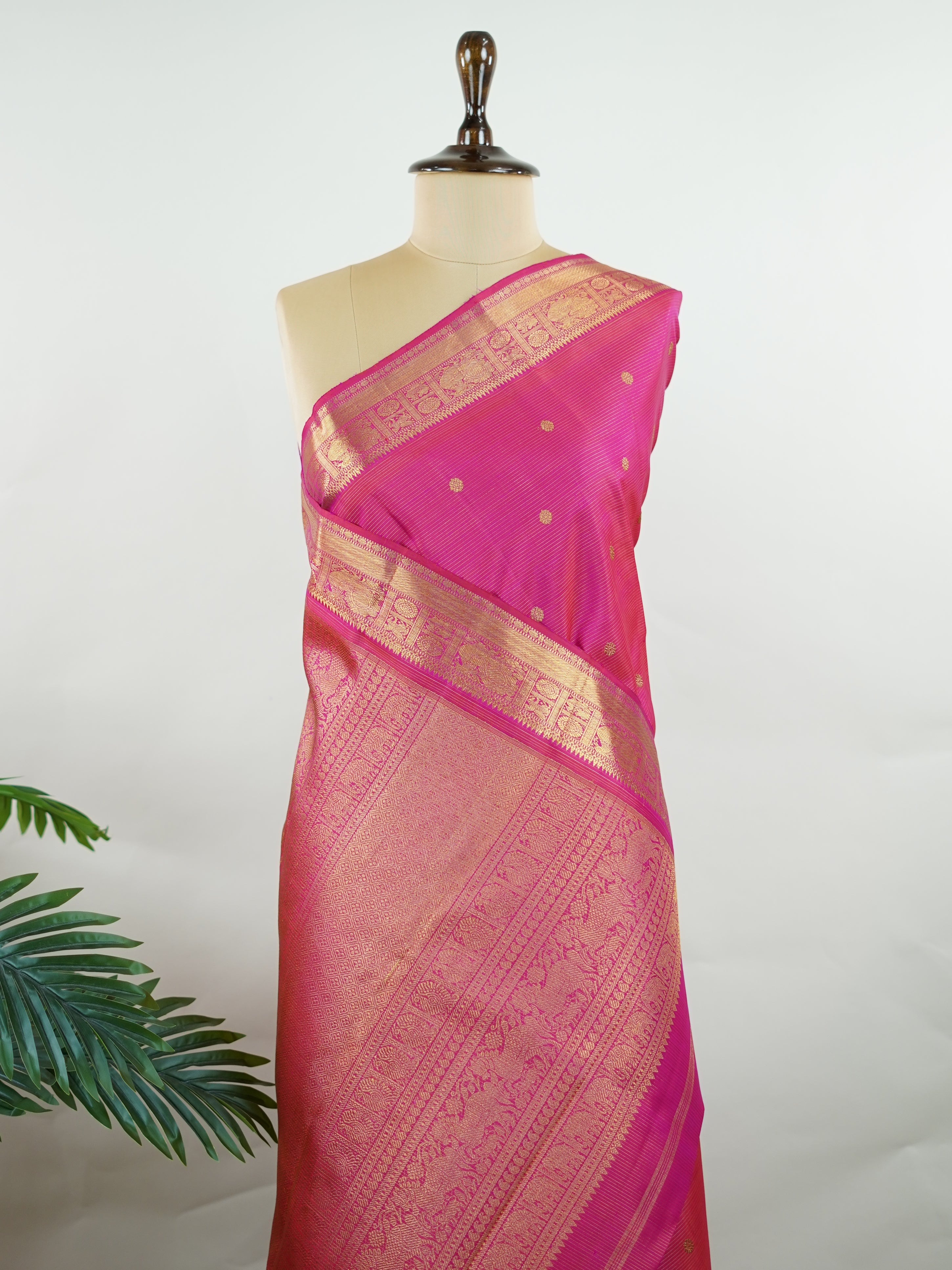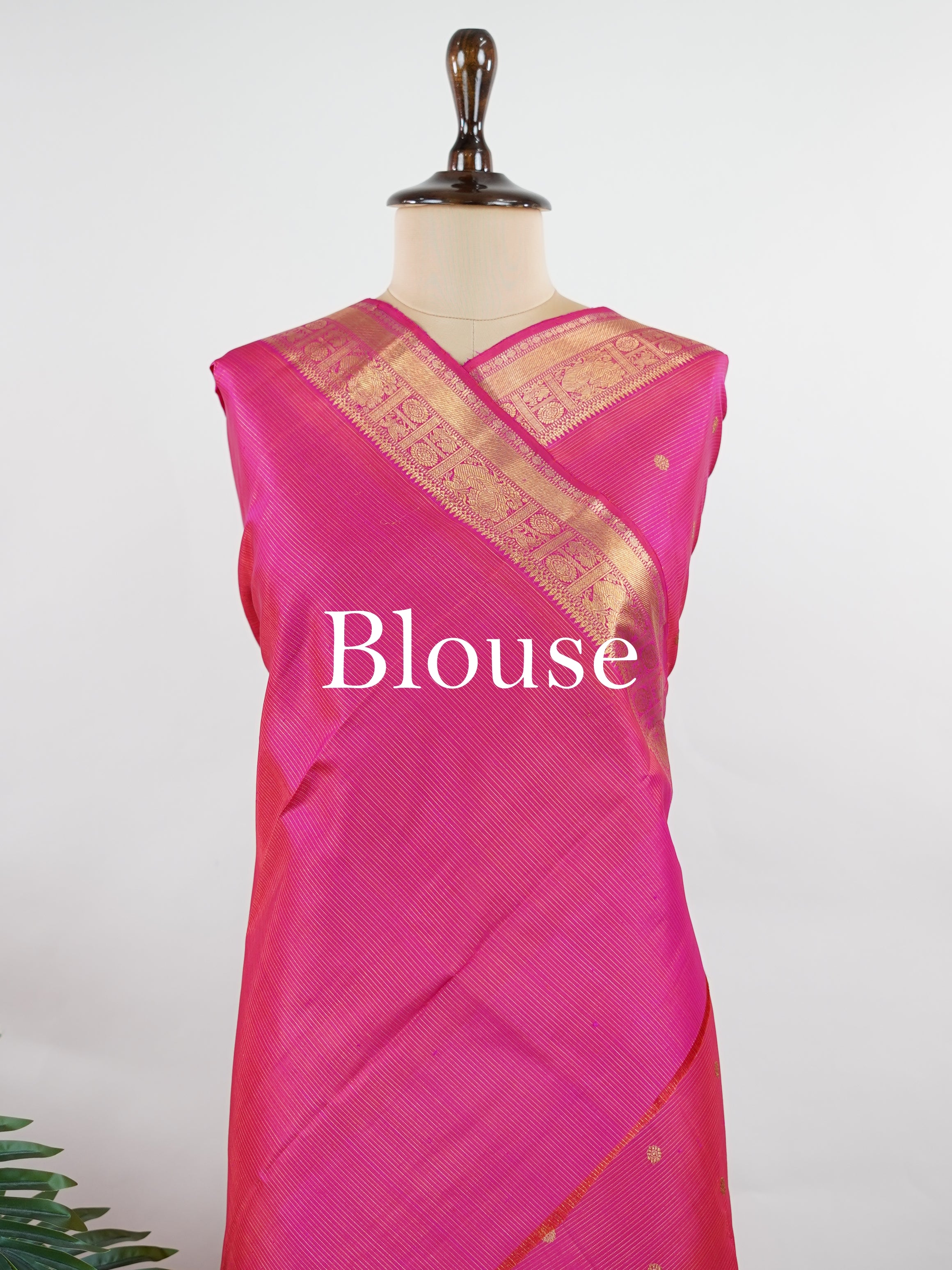 Woven in 100% pure silk, this pink Kanchipuram saree features the iconic Vairavoosi pattern with subtle gold zari and a medium border that balances richness with grace. A tribute to timeless handloom tradition, this drape speaks of heritage and fine artistry. An elegant choice for those who love bold hues in a refined frame. Crafted with devotion by Manoranjitham. #KanchipuramSilk #Manoranjitham #PureSilkSaree #Vairavoosi #HandloomElegance