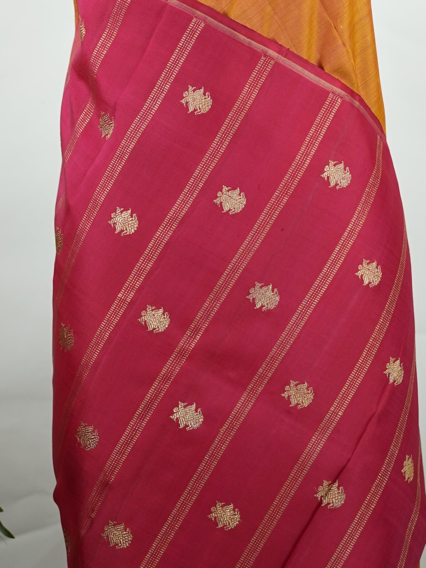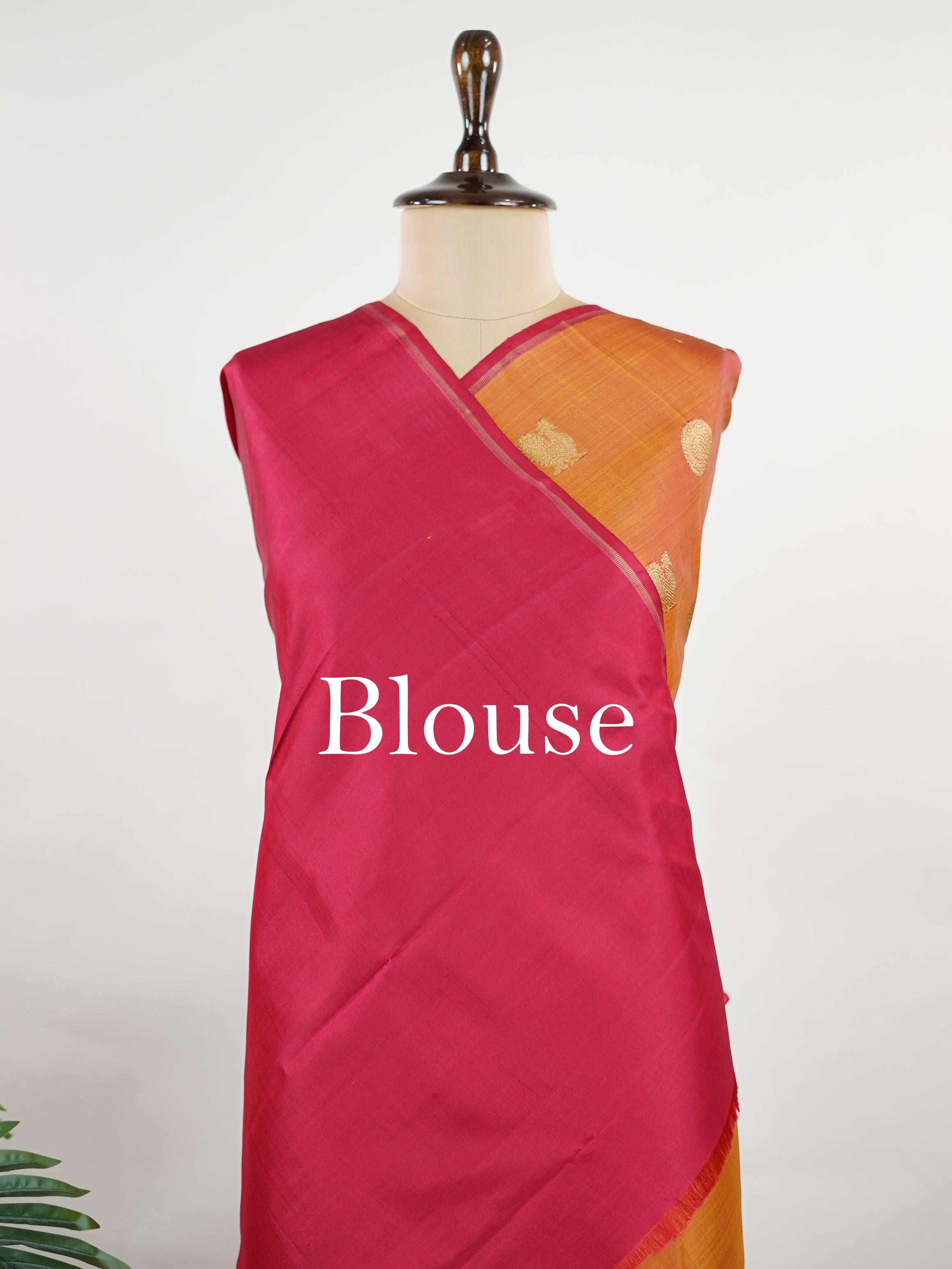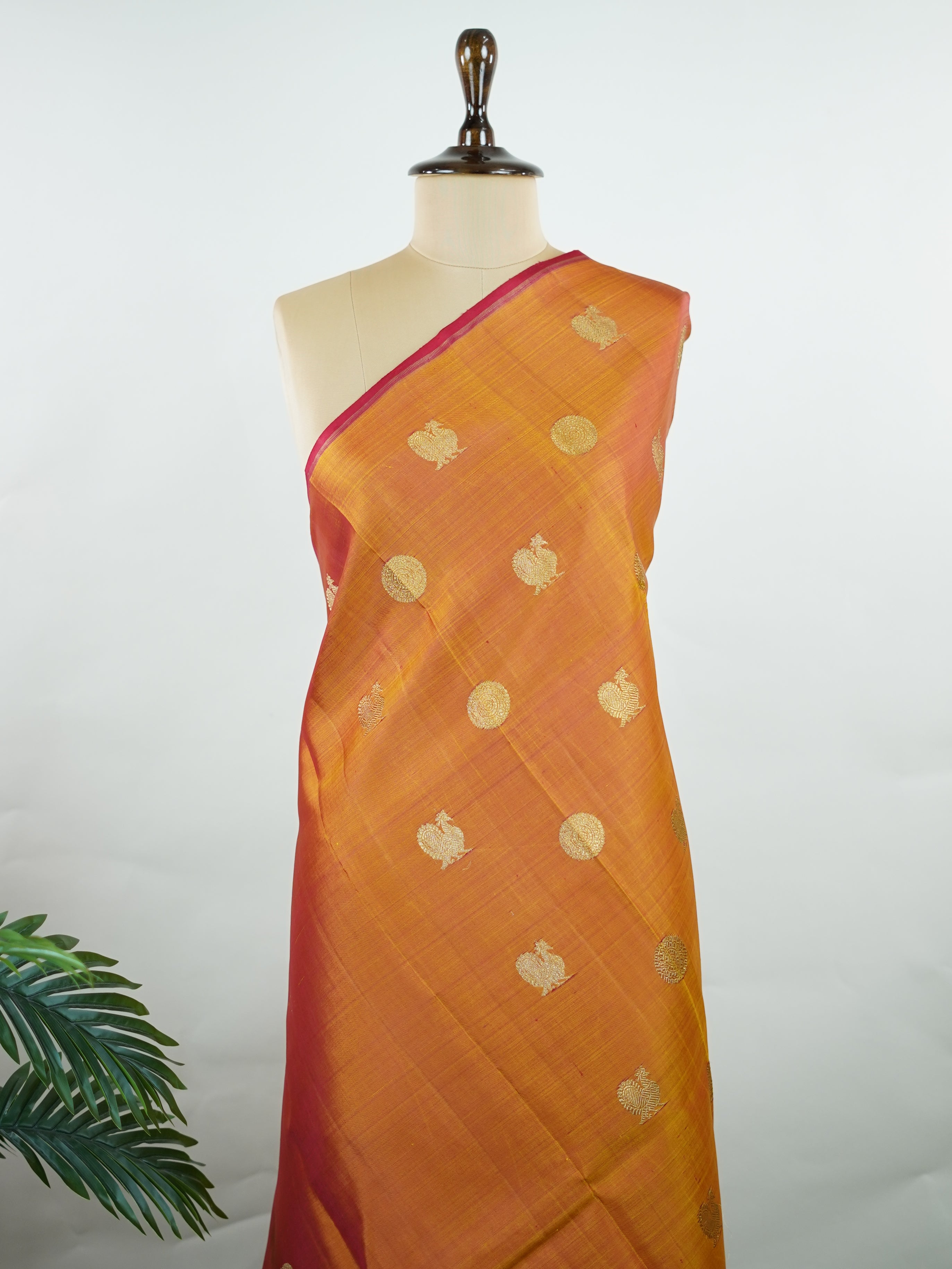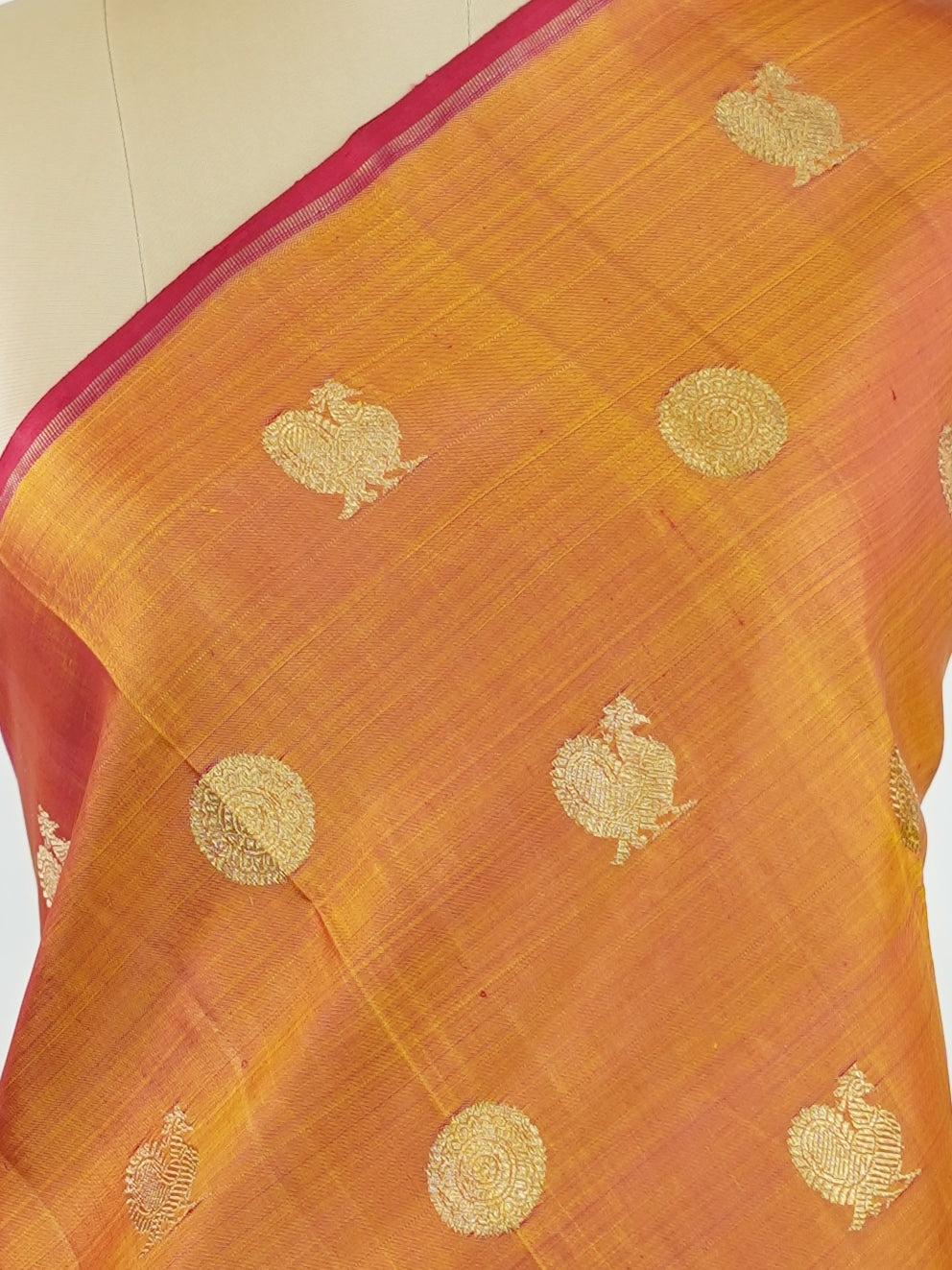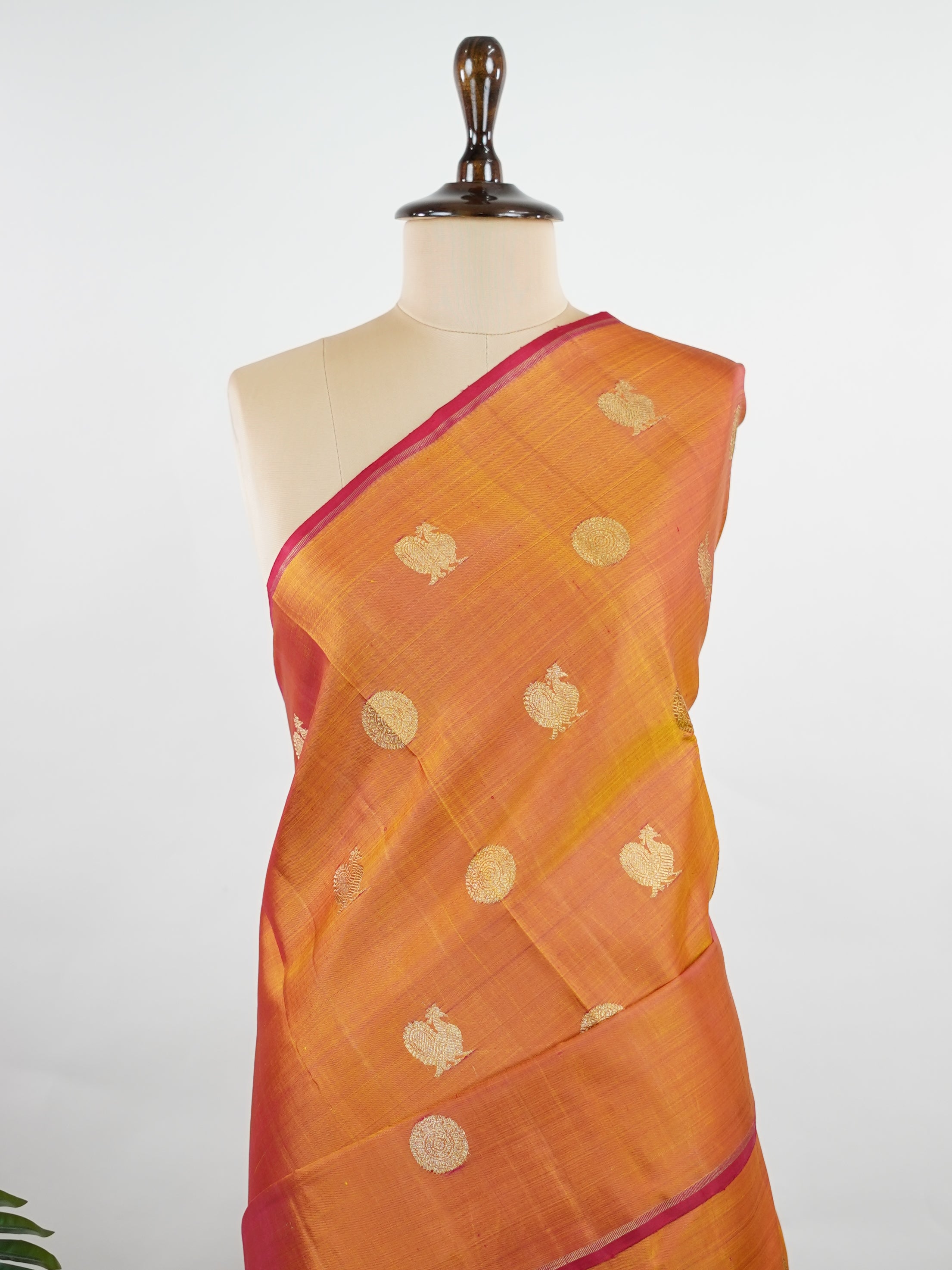 This orange Kanchipuram saree with red buttis and a borderless silhouette is a radiant choice in pure silk. Enhanced with pure zari, it carries festive joy and cultural memory in every inch. A lively drape for ceremonies and celebrations. #Manoranjitham #Buttisaree #BorderlessKanjivaram #PureSilkJoy #HandloomHeritage