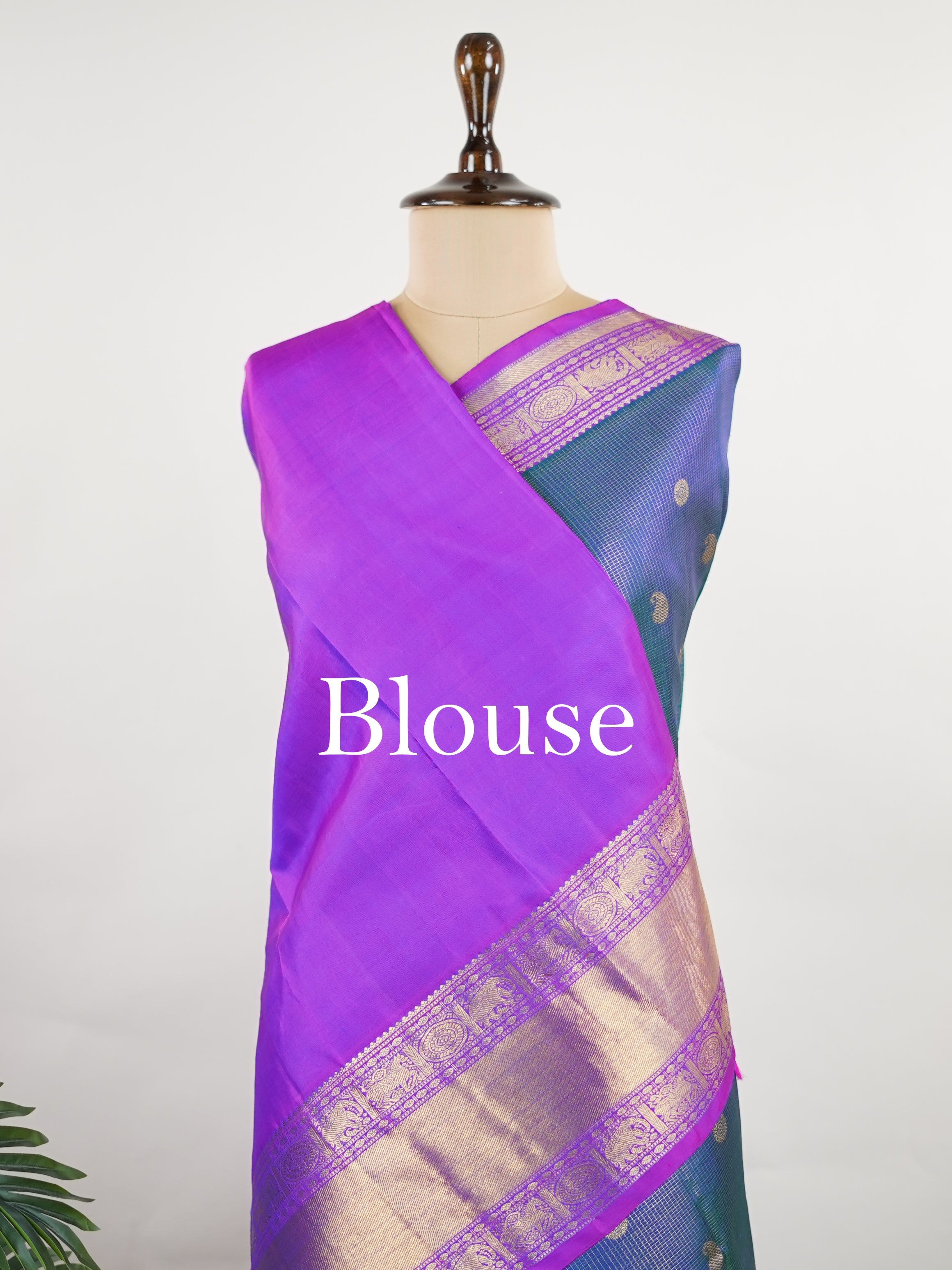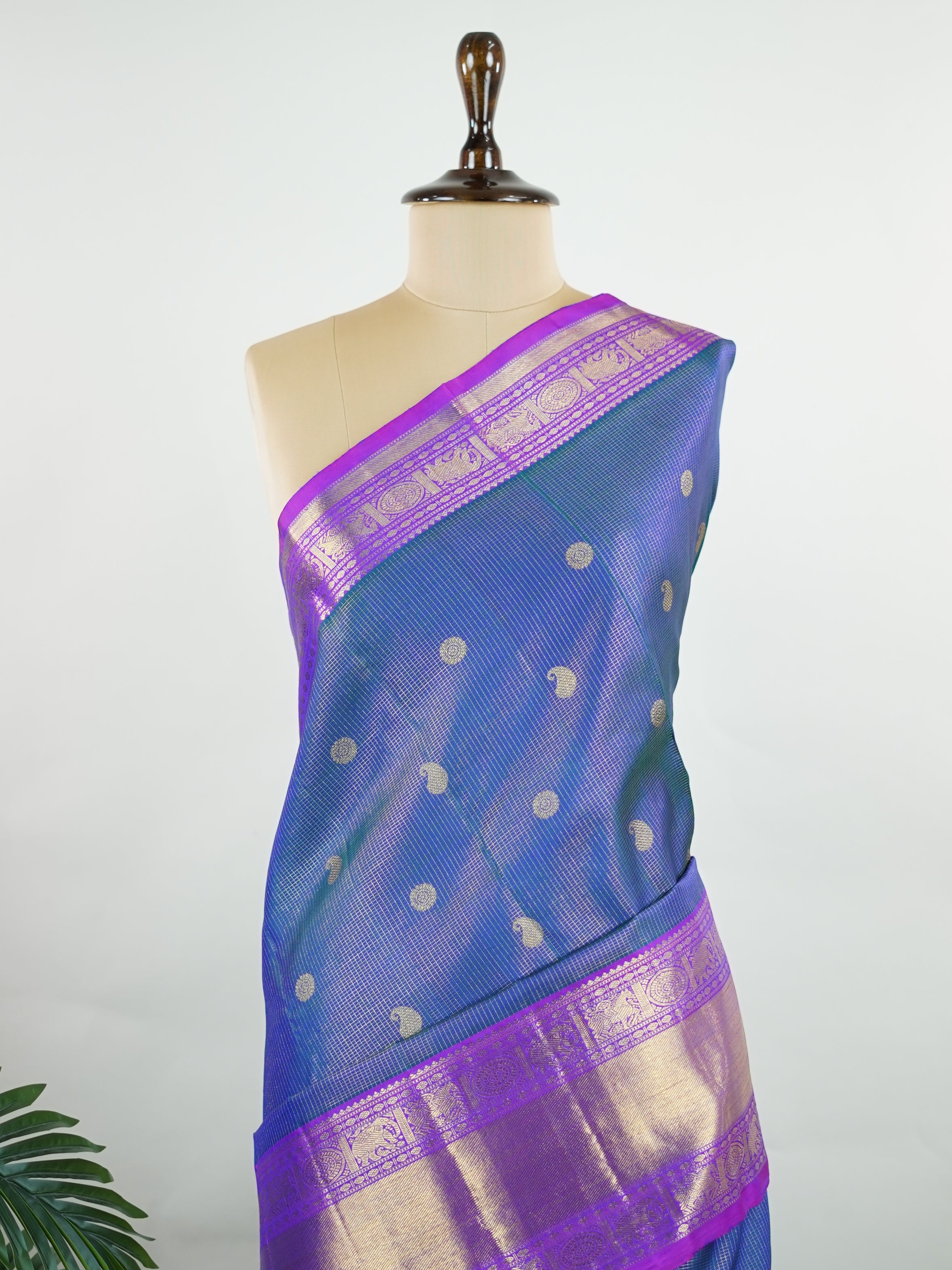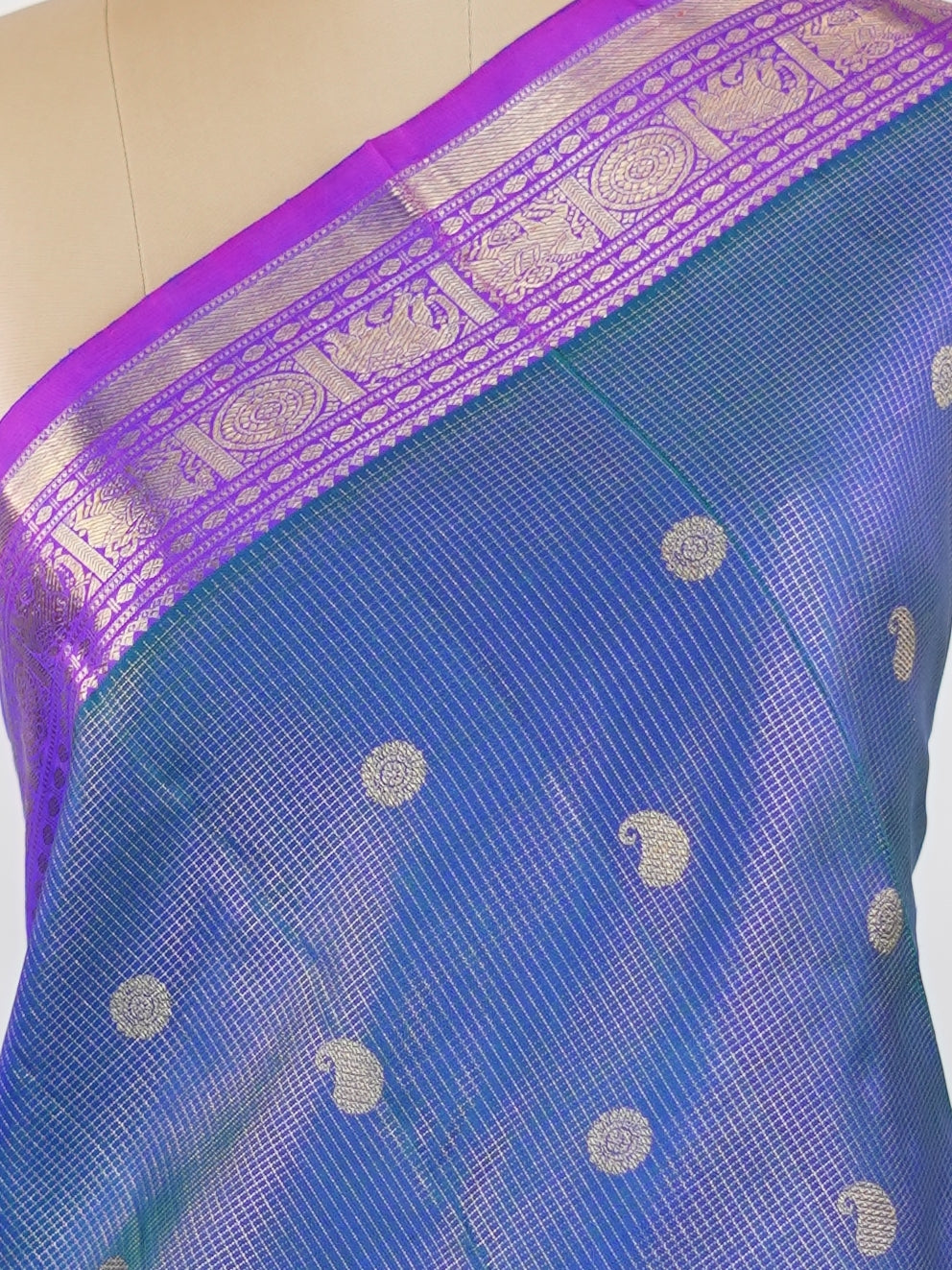 A bright blue saree in pure silk with pink accents, this Kanchipuram Oosikattam weave is completed with a medium border and pure zari shimmer. Traditional checks meet vibrant colours in this versatile festive drape. Handwoven with precision at Manoranjitham. #Manoranjitham #OosikattamSilk #KanjivaramTradition #ColourAndCraft #SilkWithSoul