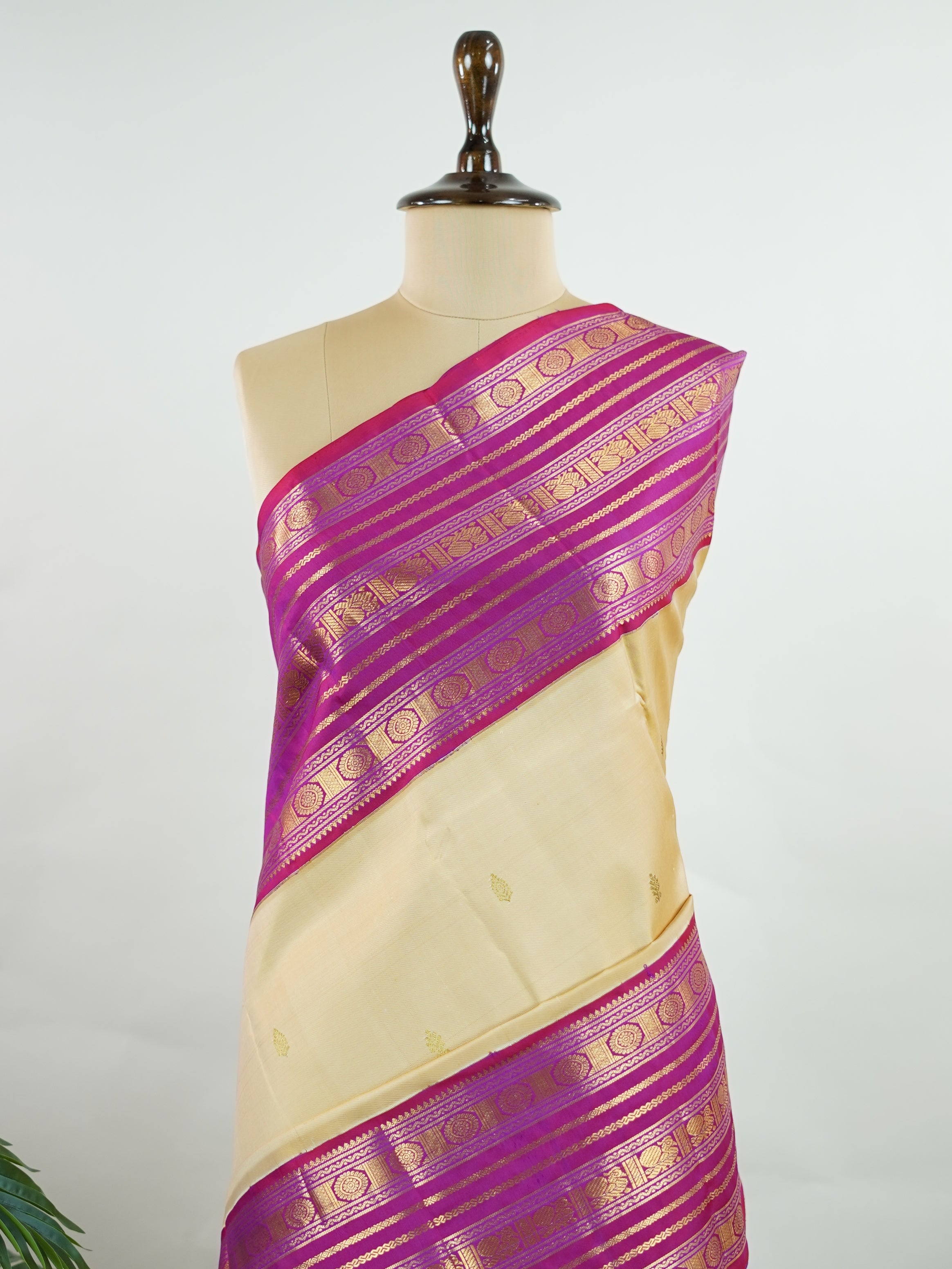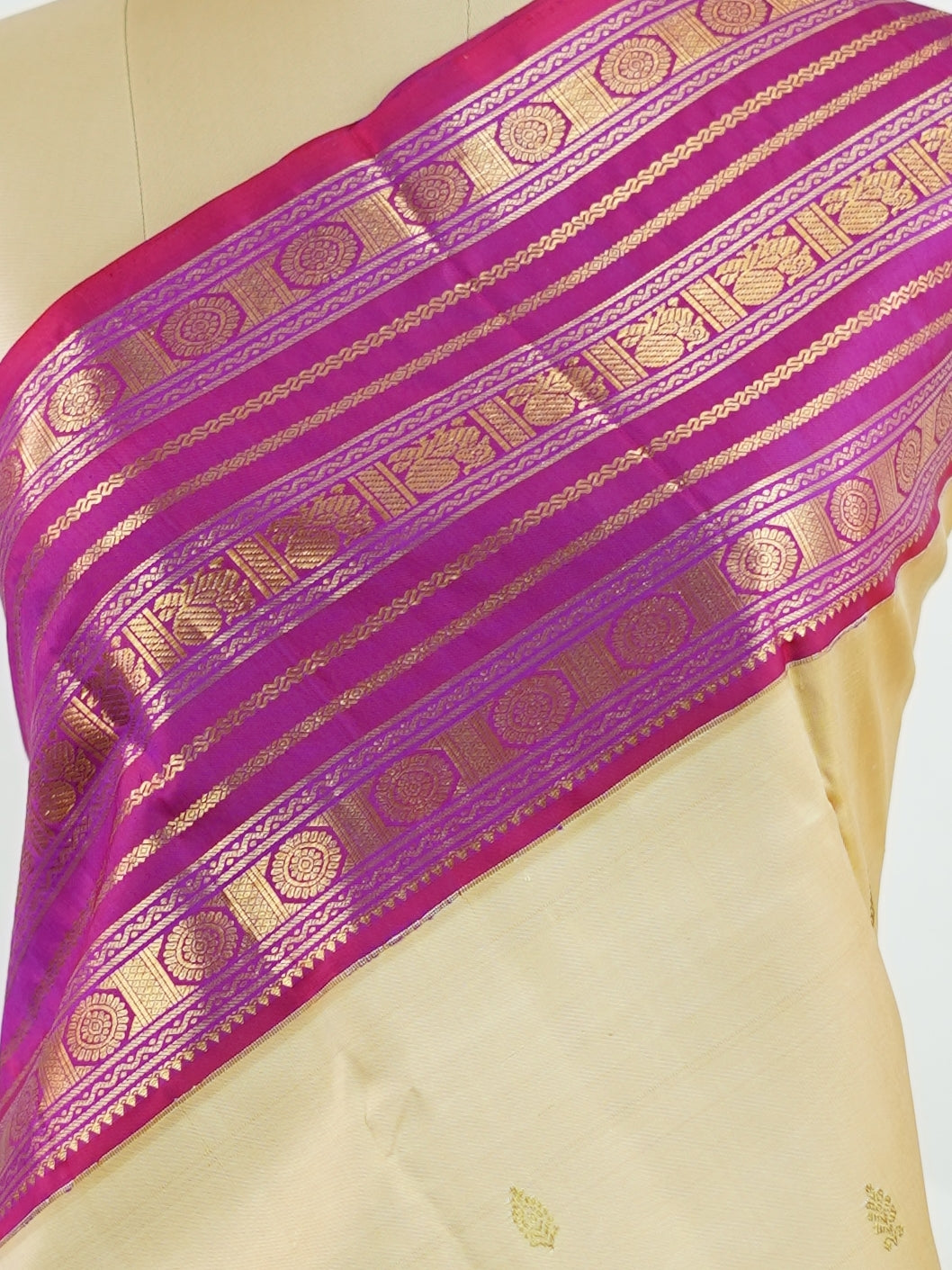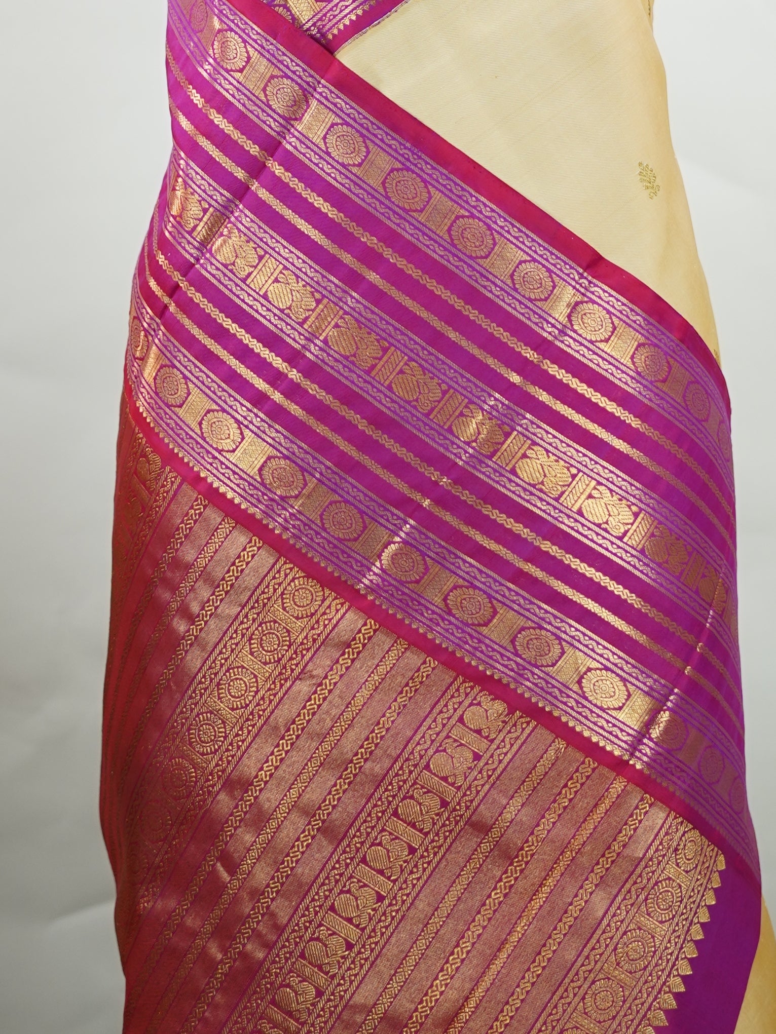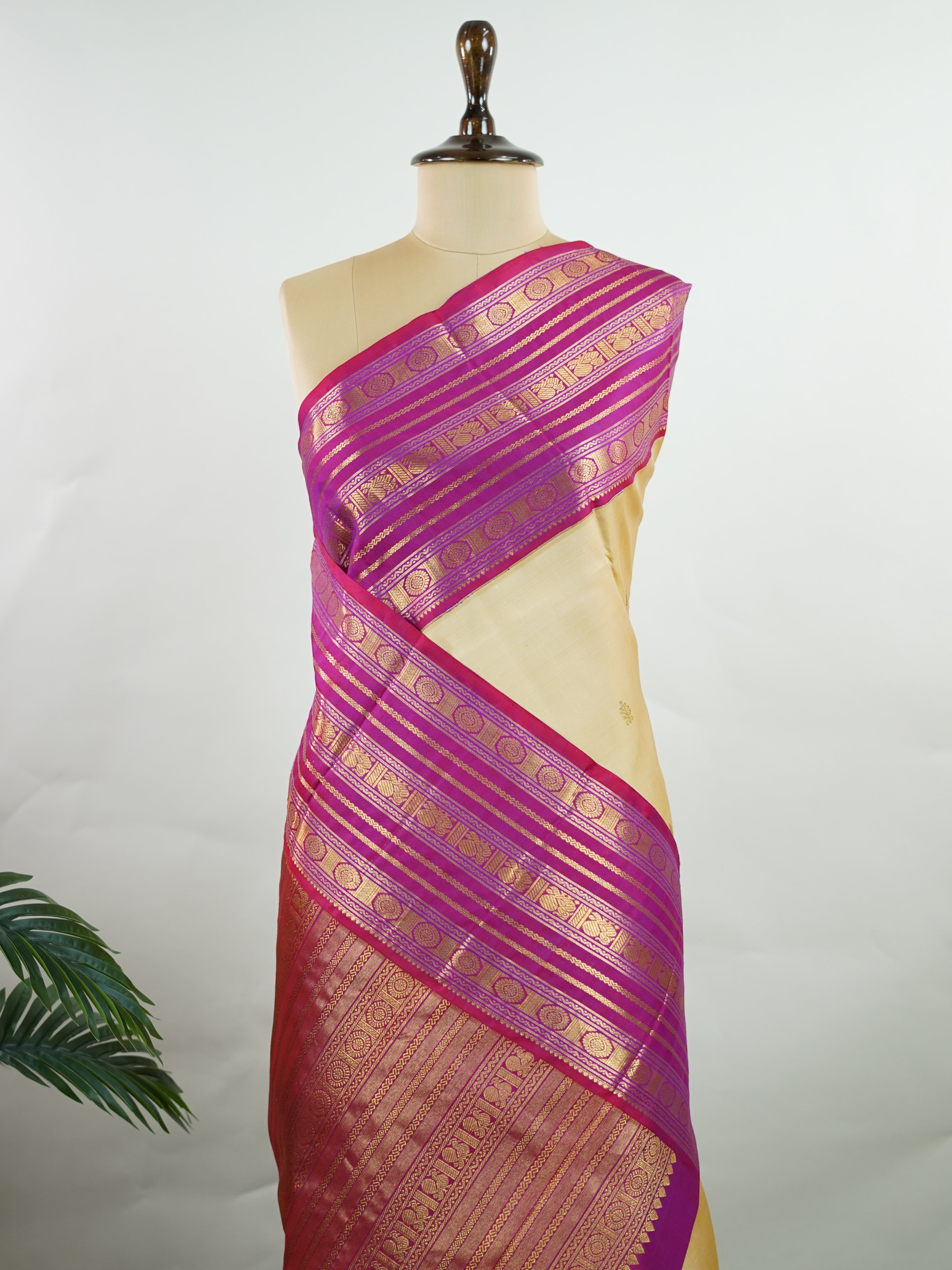 A soft beige Kanchipuram silk saree with pink Korvai contrasts and a majestic large border, woven with 2G zari for an opulent finish. Understated yet impactful, this is a drape that blends tenderness with grandeur. #Manoranjitham #KorvaiSilks #2GZari #BeigeSaree #KanchipuramWeaves