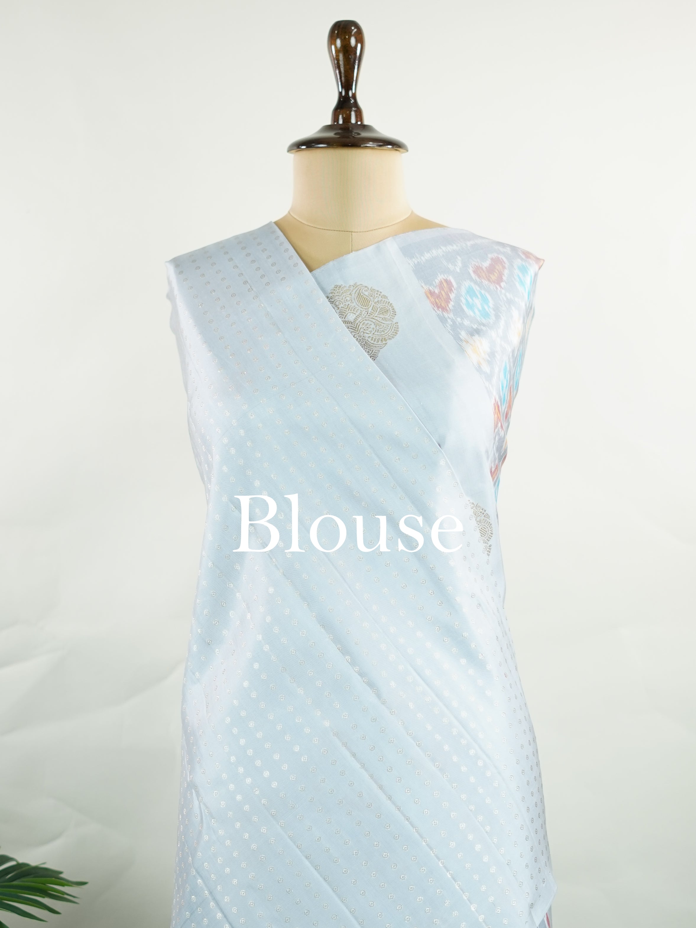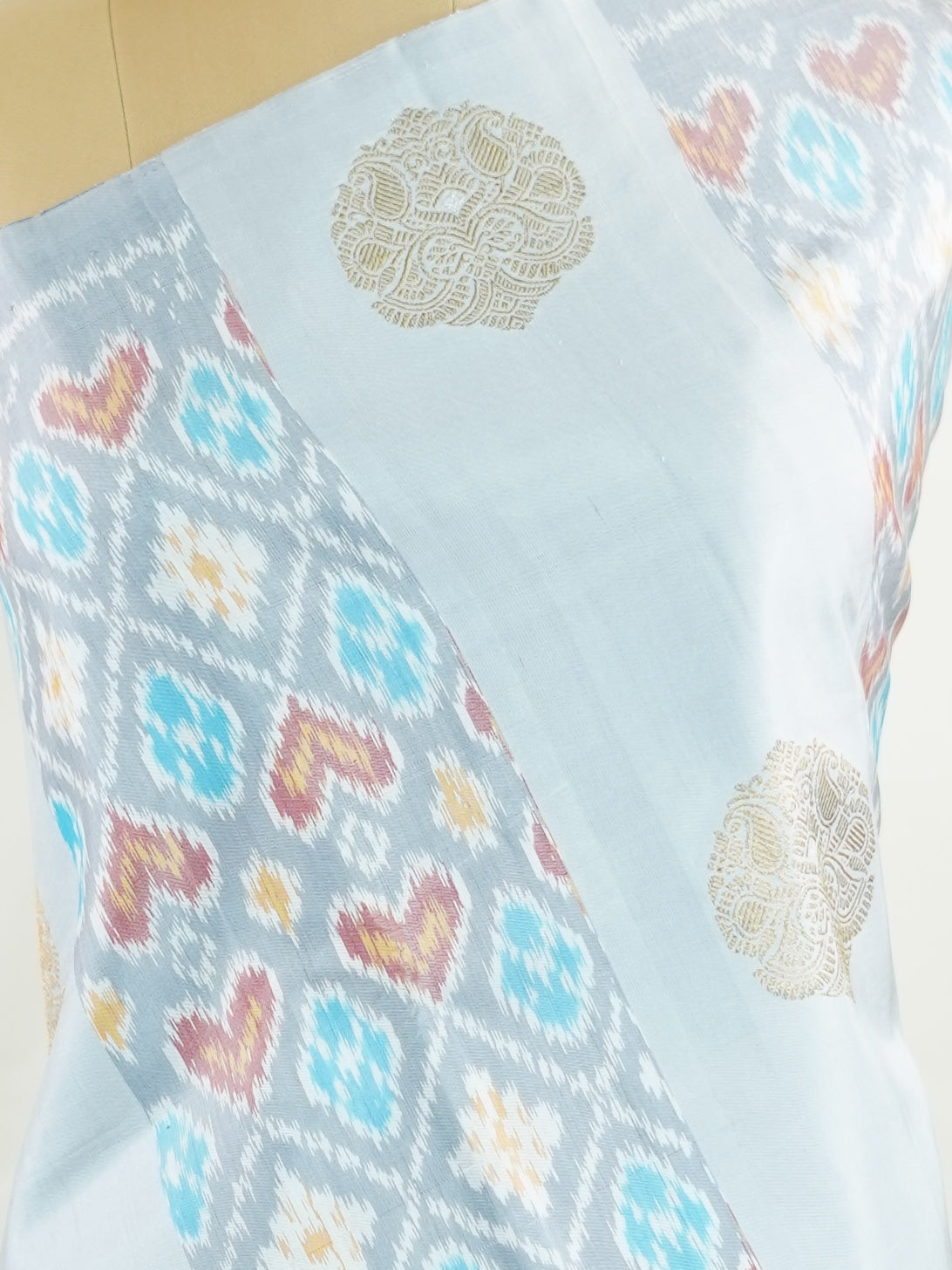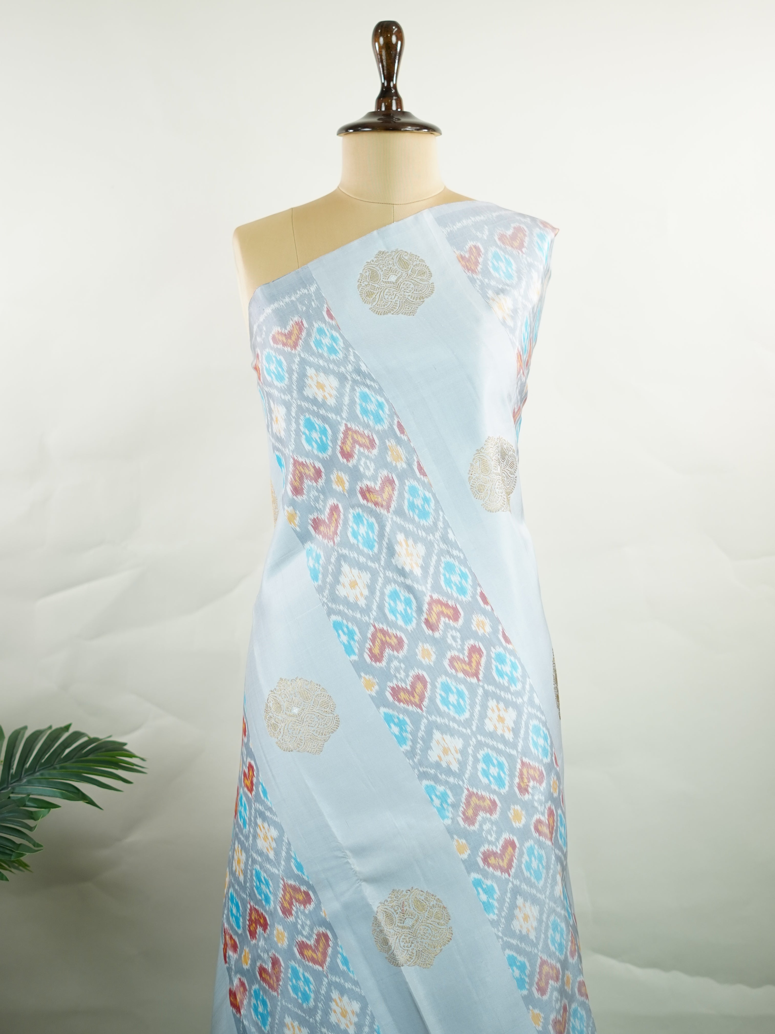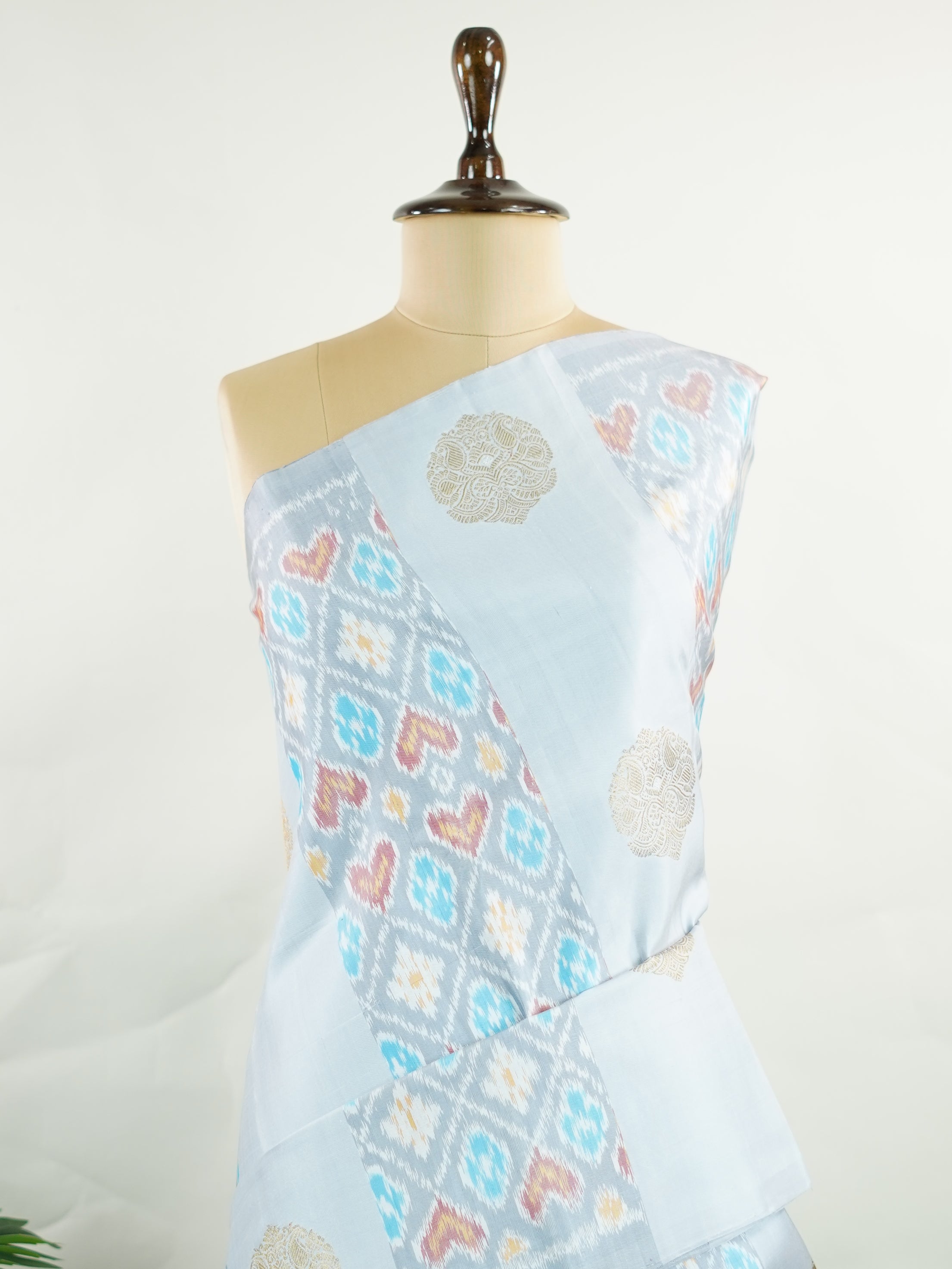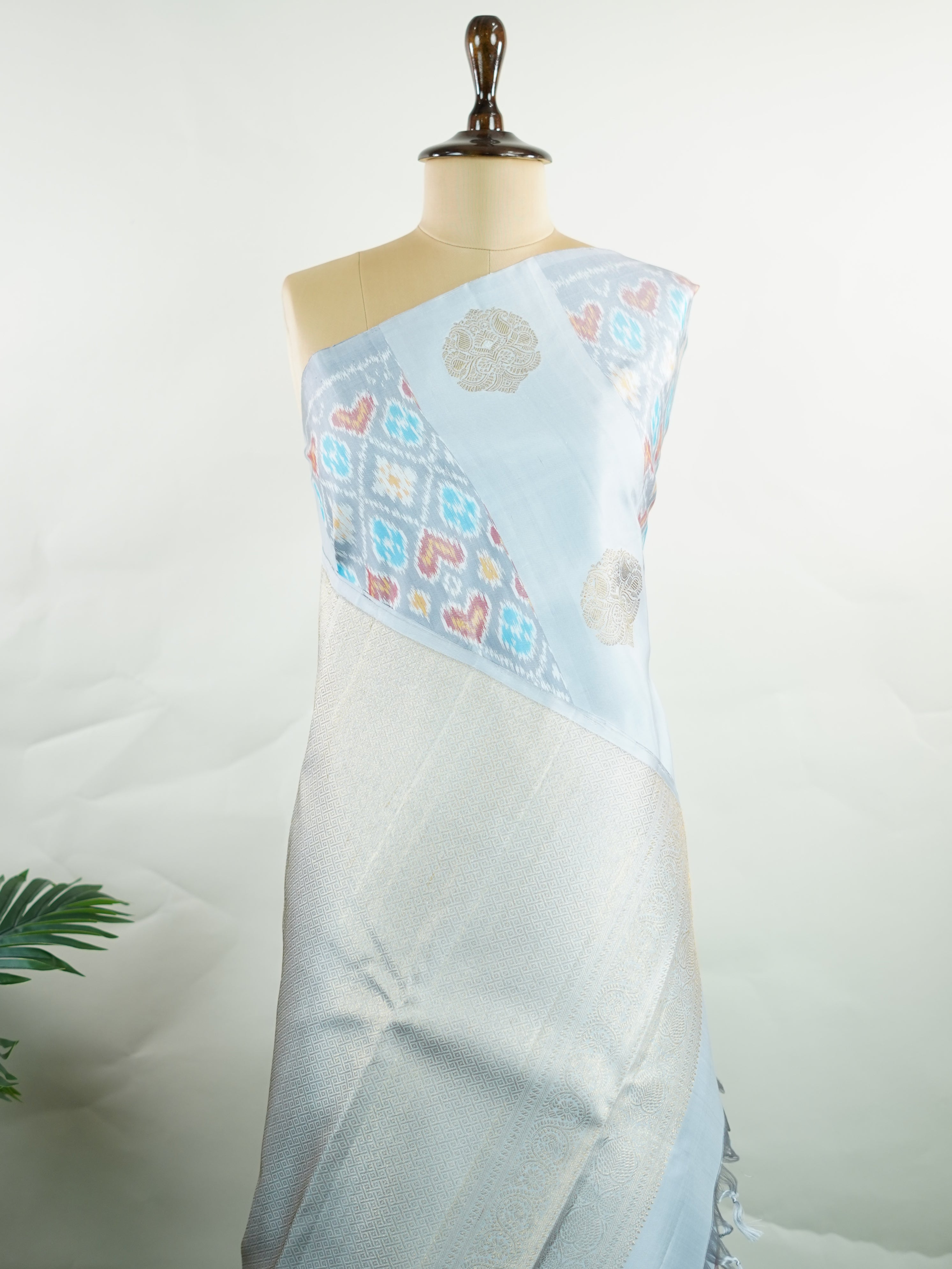 Understated elegance shines in this pure silk Kanjivaram where grey meets grey in a sophisticated monochrome palette. The Ikkat-inspired patterns add artistic depth, while rich zari elevates its grandeur. A saree for those who prefer quiet luxury over loud opulence.