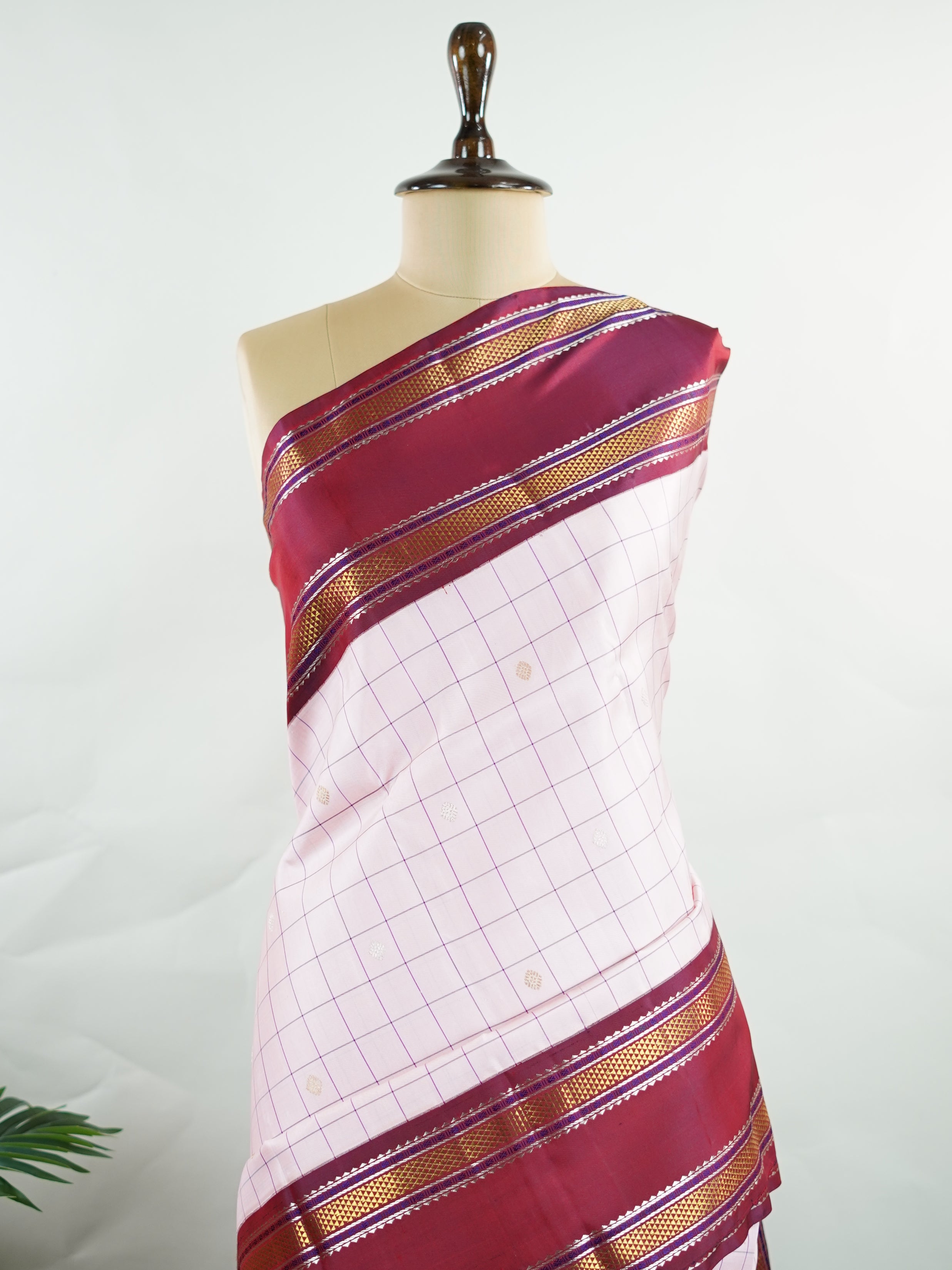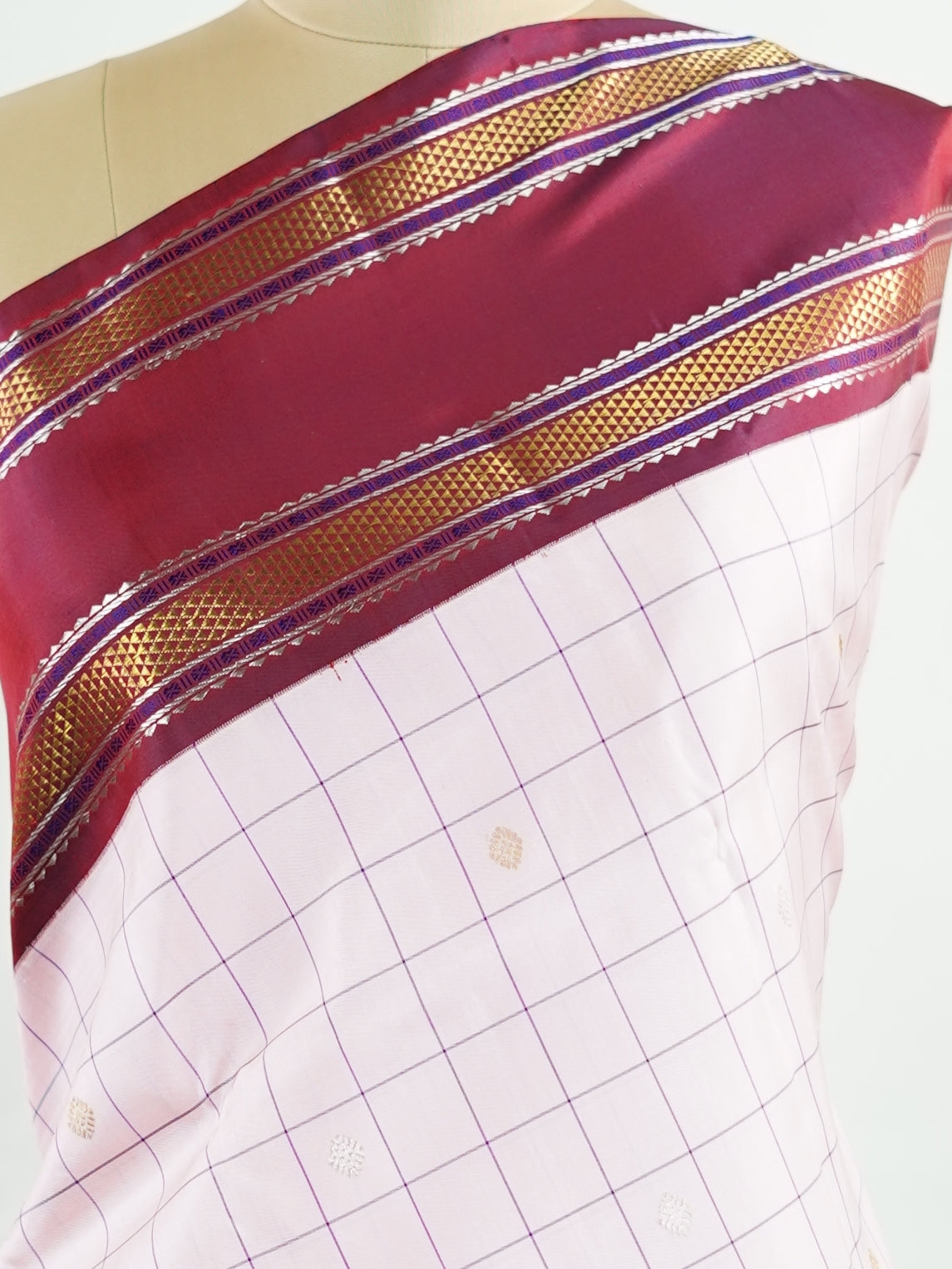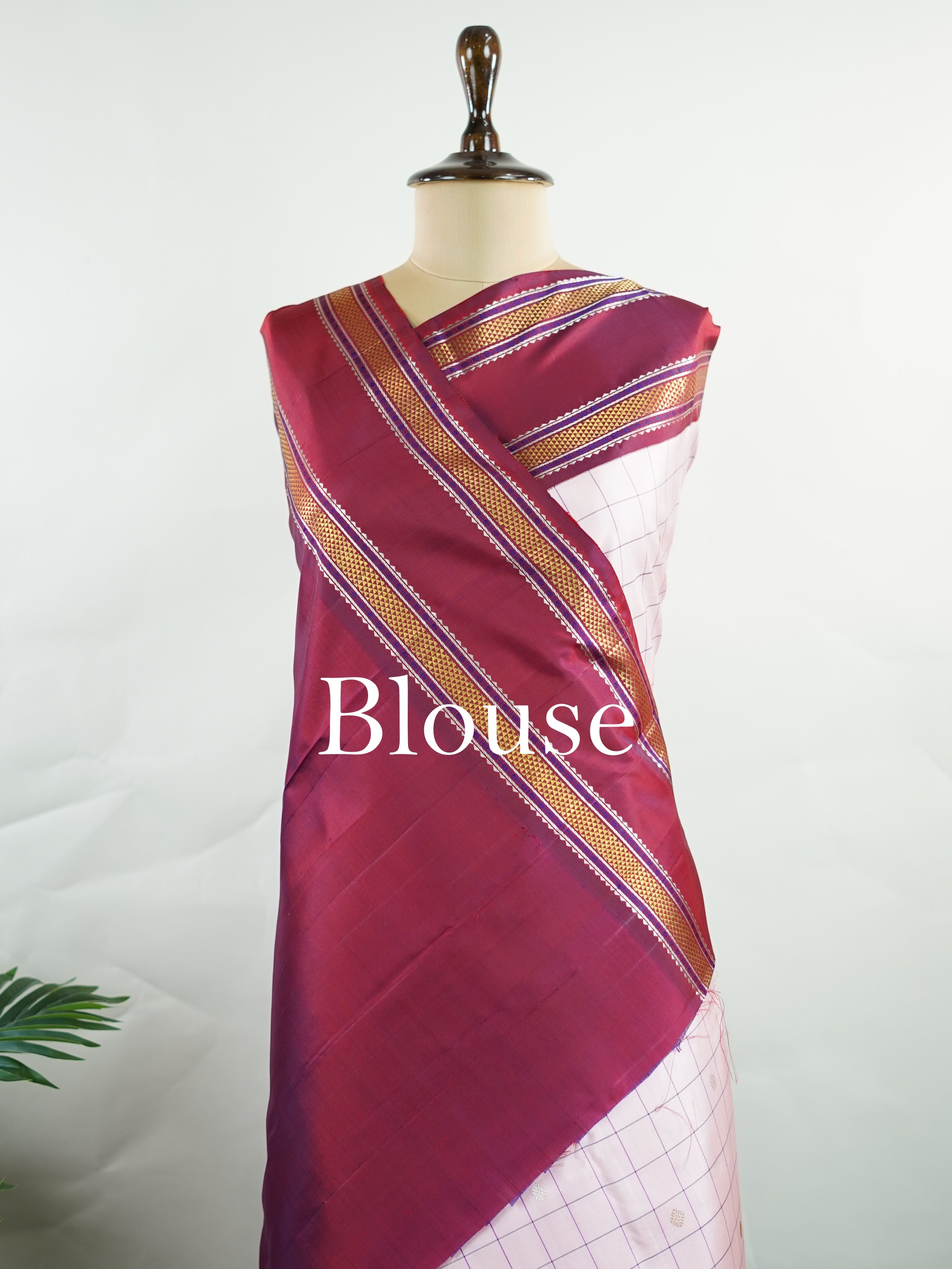 Radiant pink meets rich maroon in this pure silk Kanjivaram with bold kattan checks. The 2G zari borders glisten with grandeur, making it a favourite for festive occasions. Drapes with a majestic fall, creating a timeless bridal statement.