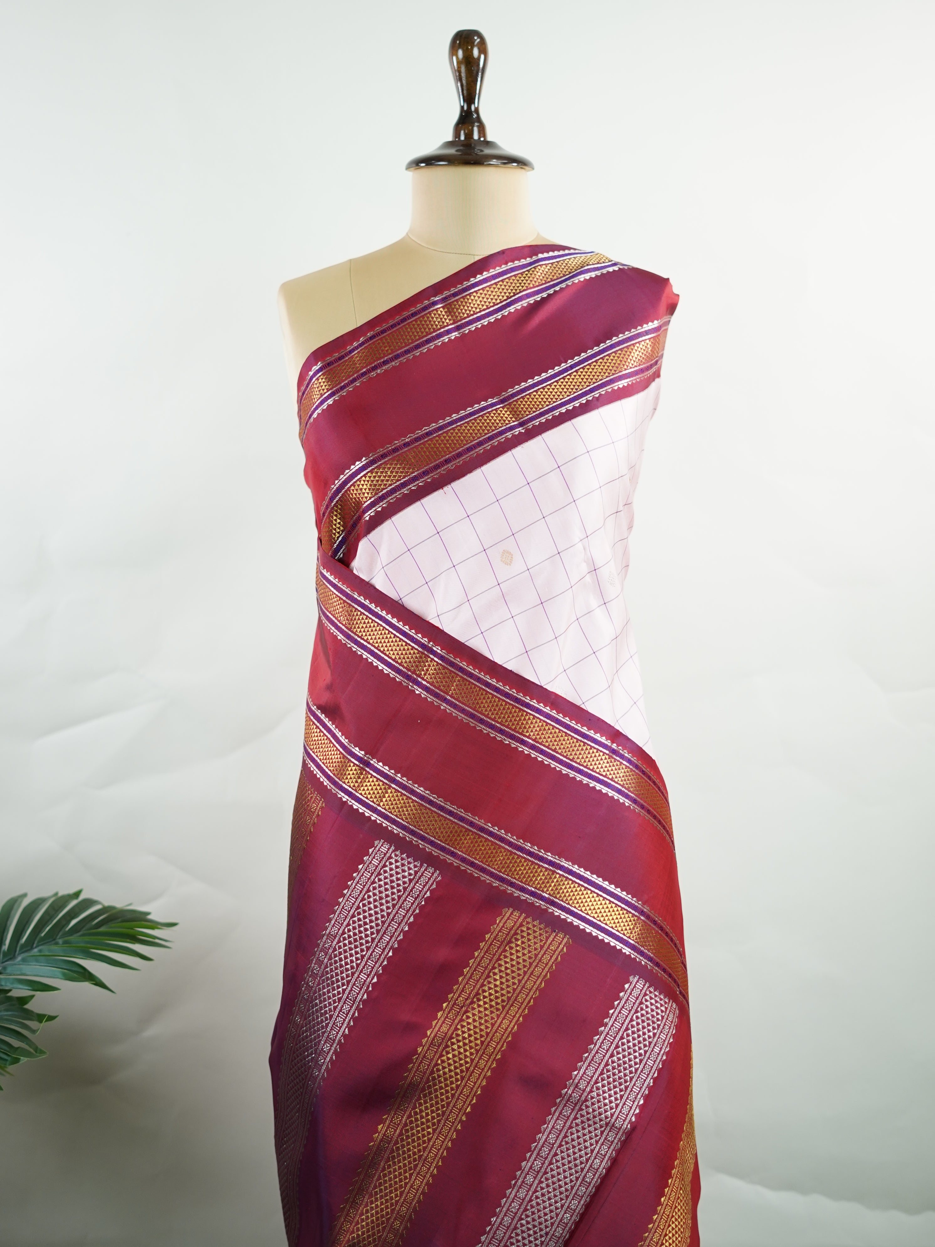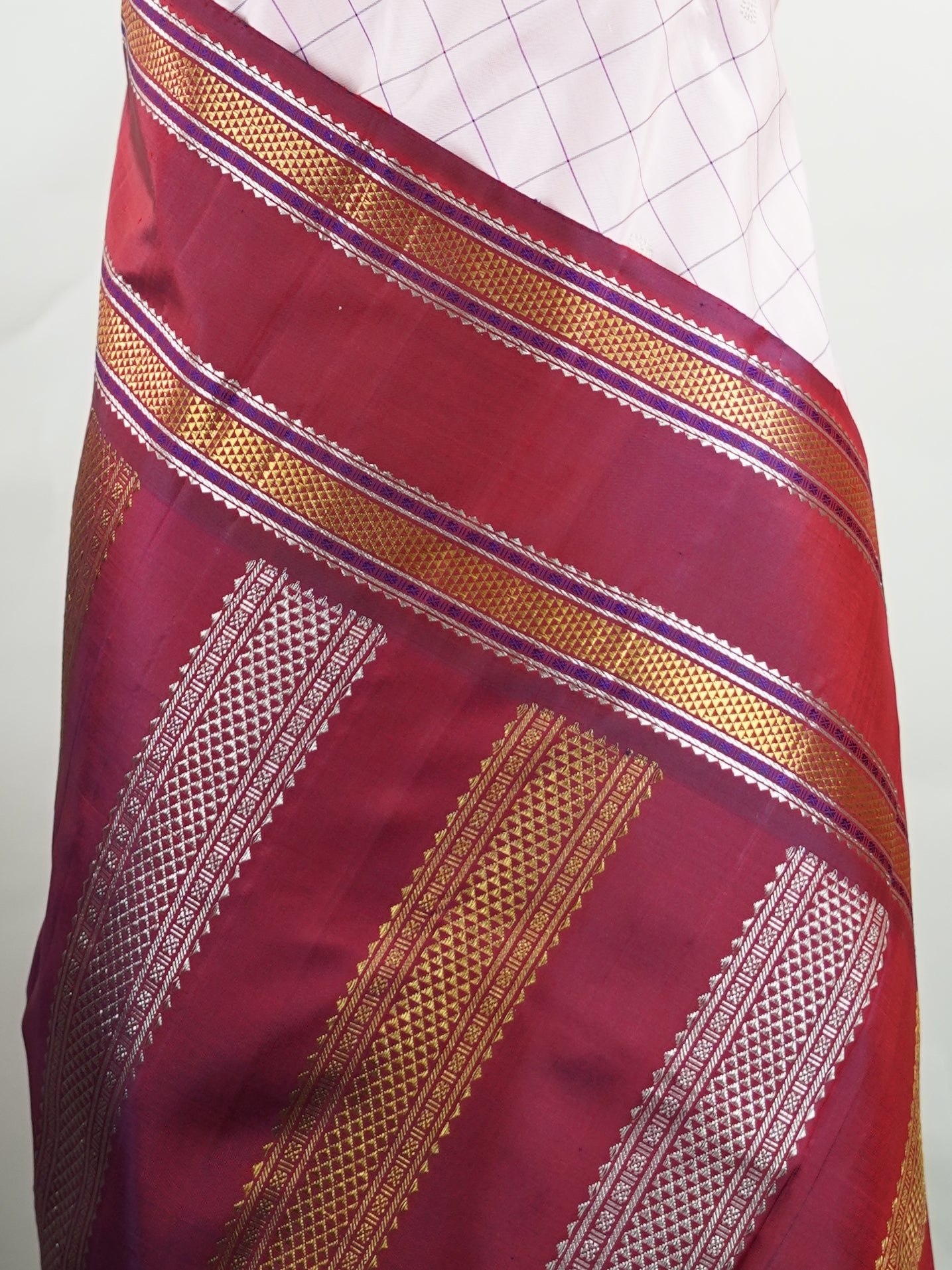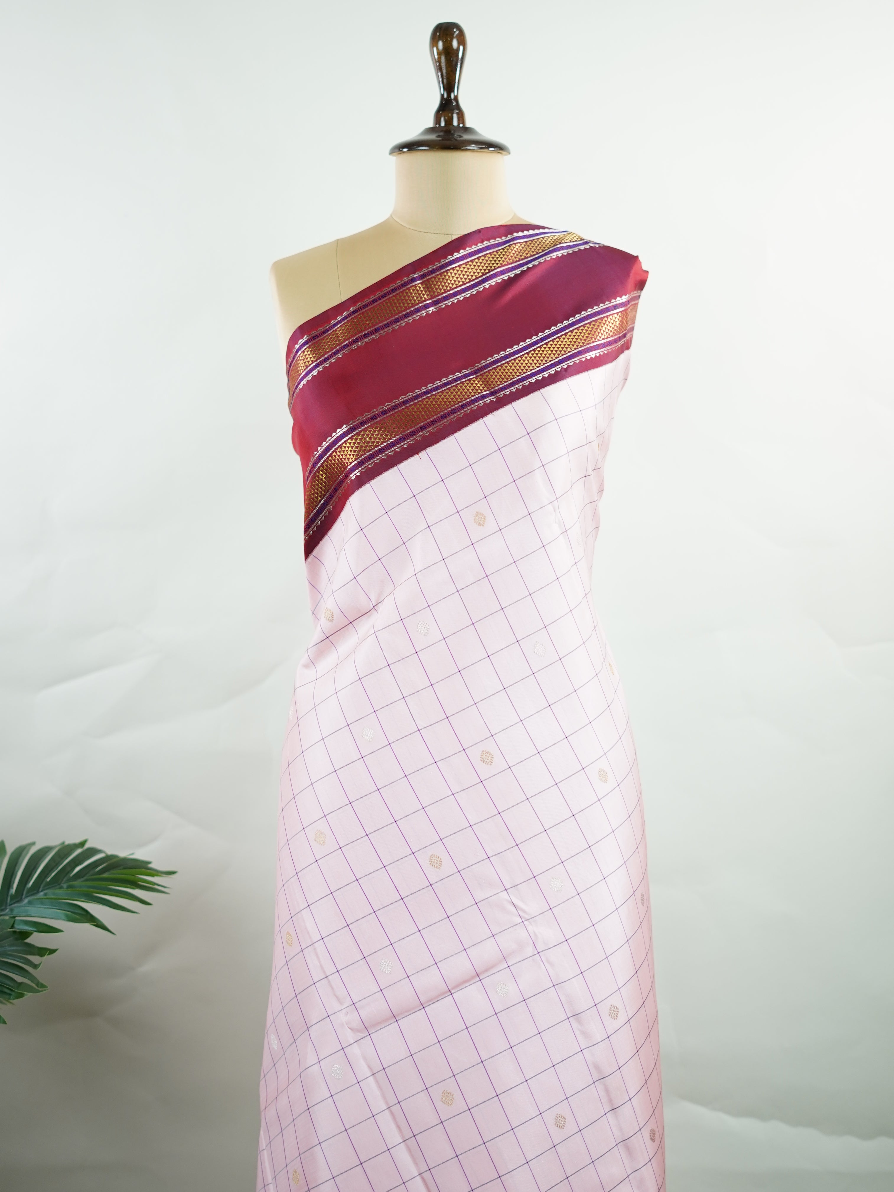 Radiant pink meets rich maroon in this pure silk Kanjivaram with bold kattan checks. The 2G zari borders glisten with grandeur, making it a favourite for festive occasions. Drapes with a majestic fall, creating a timeless bridal statement.