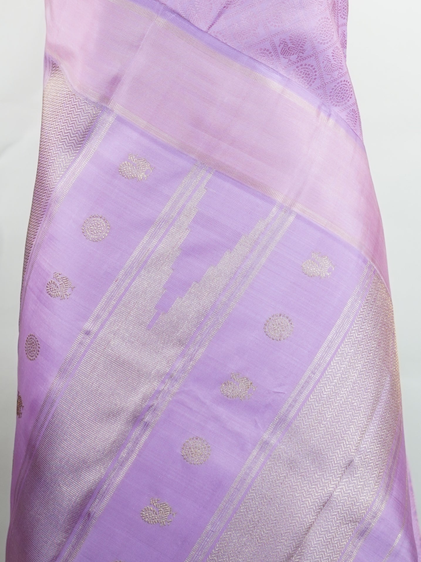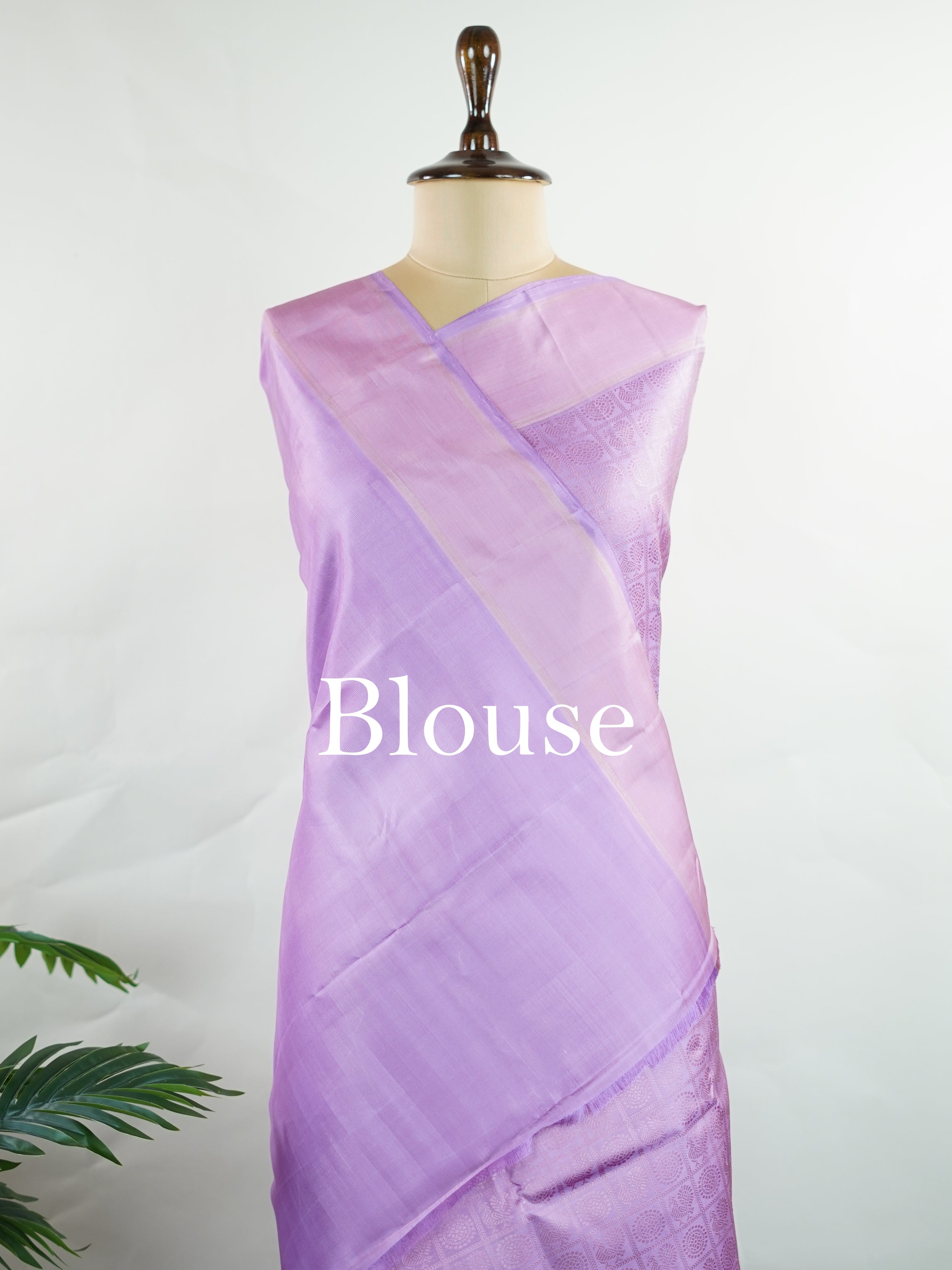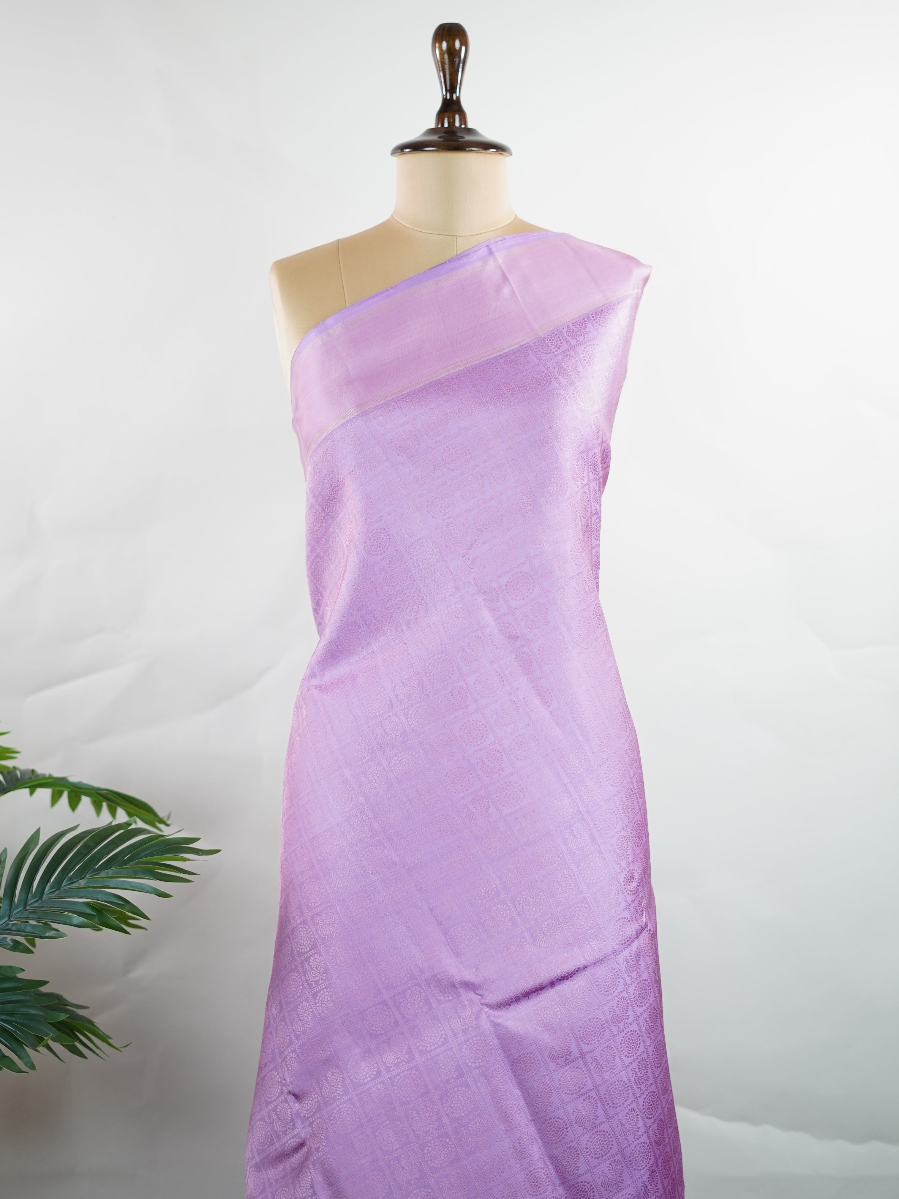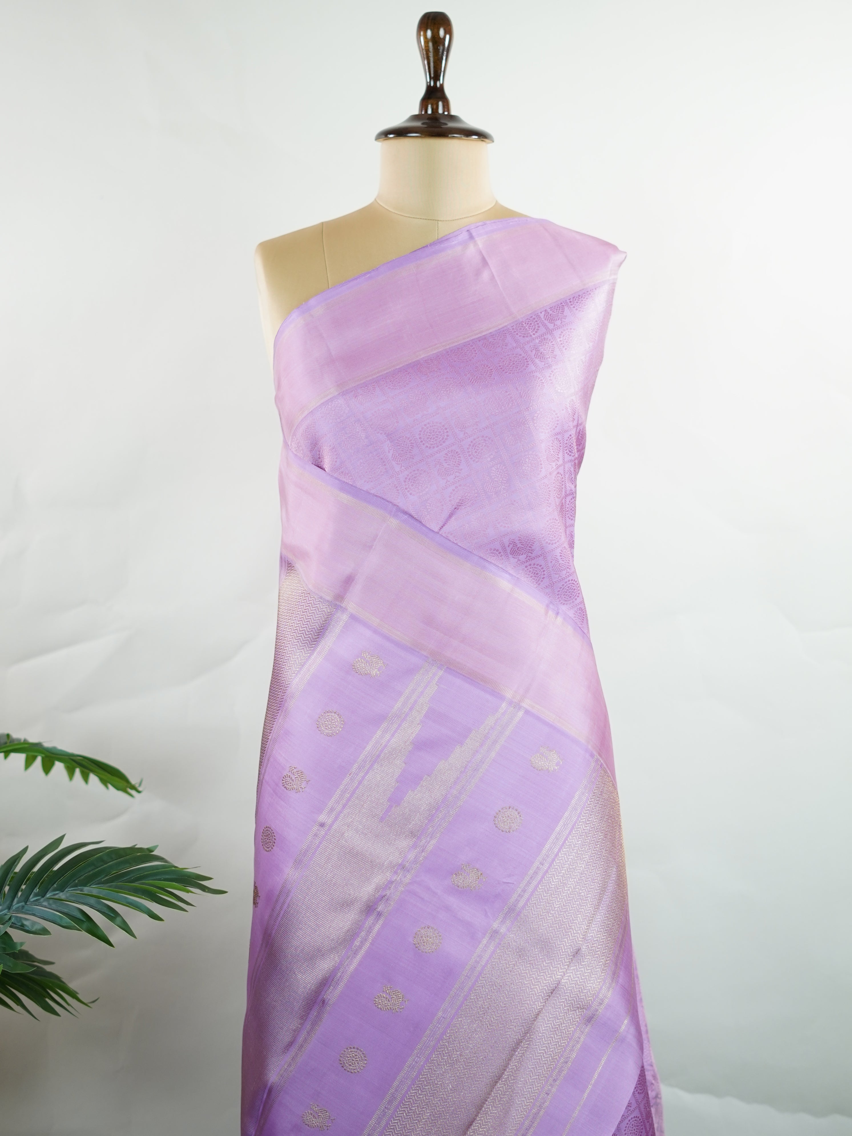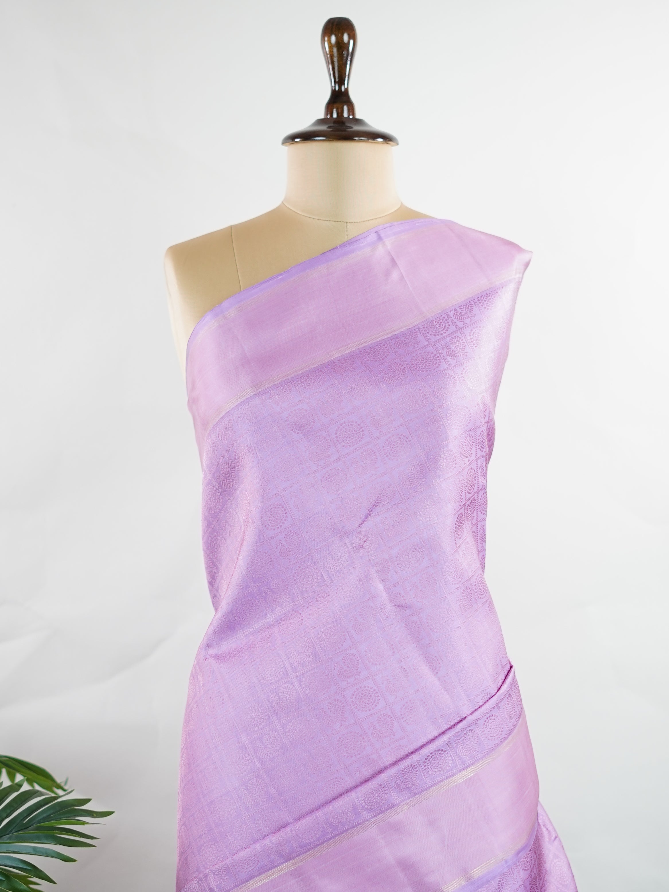 A rare lavender silk drape, adorned with traditional kattam checks and delicate buttas. The silver-gold zari glistens, casting a regal glow on this soft pastel beauty. Perfect for evening weddings where elegance speaks in hushed tones. An heirloom piece, woven with precision in the looms of Kanchipuram. #LavenderKanjivaram #KattamChecks #PureZari #HeritageSilks