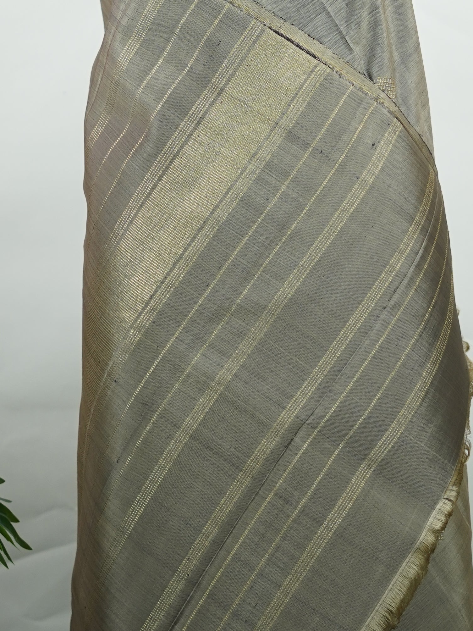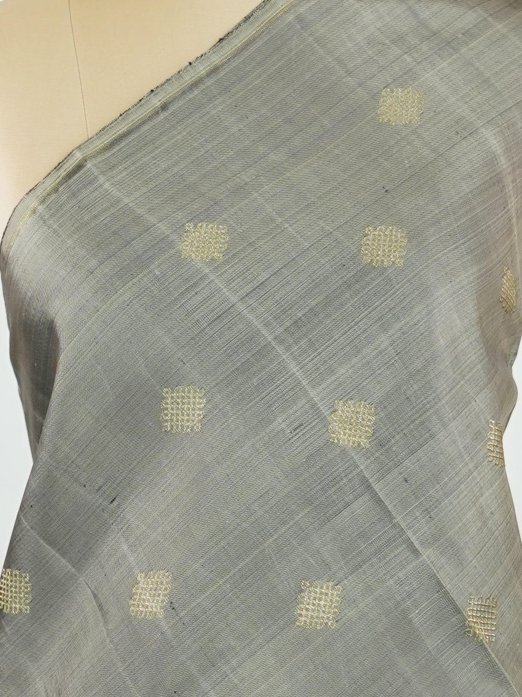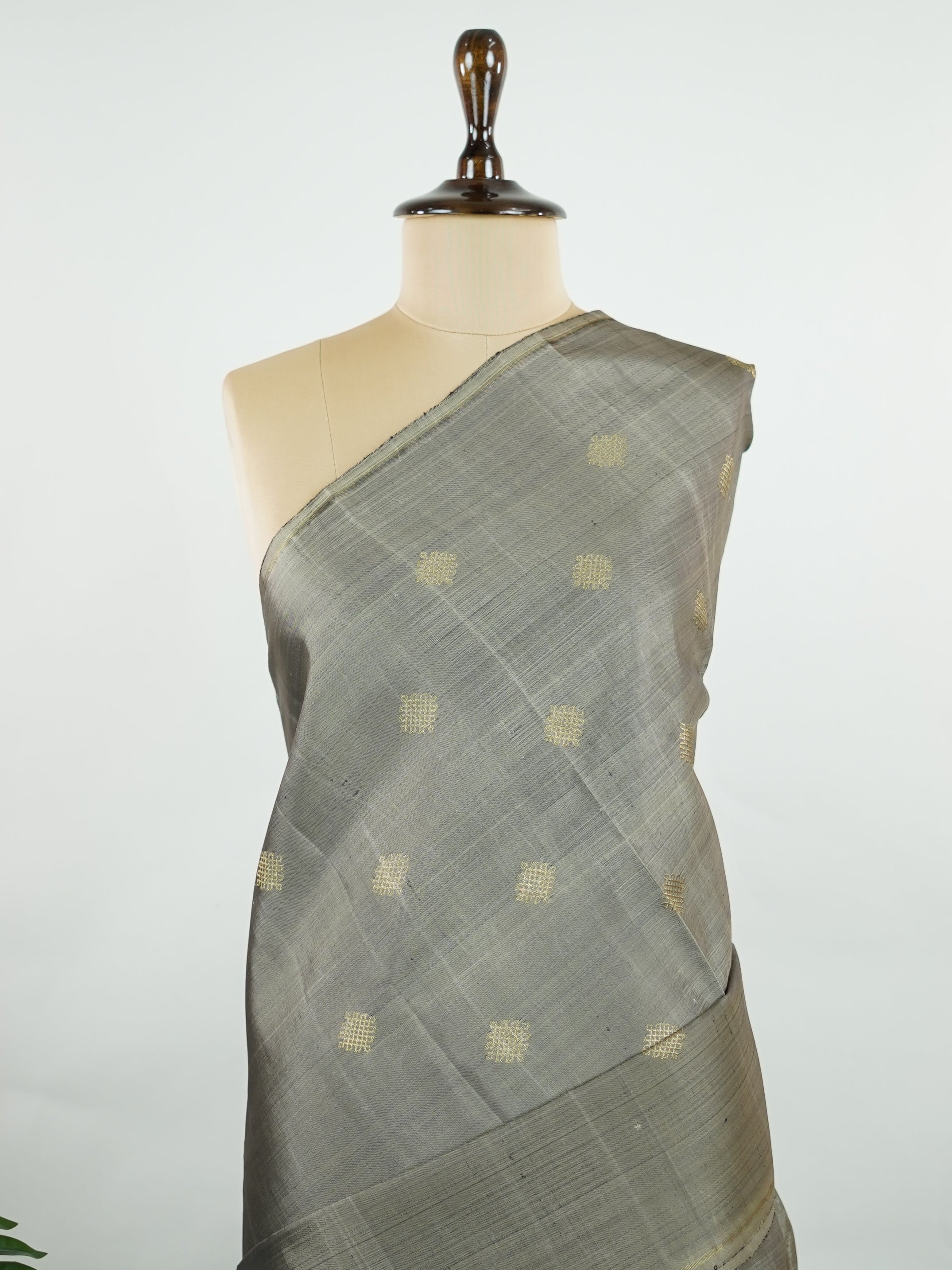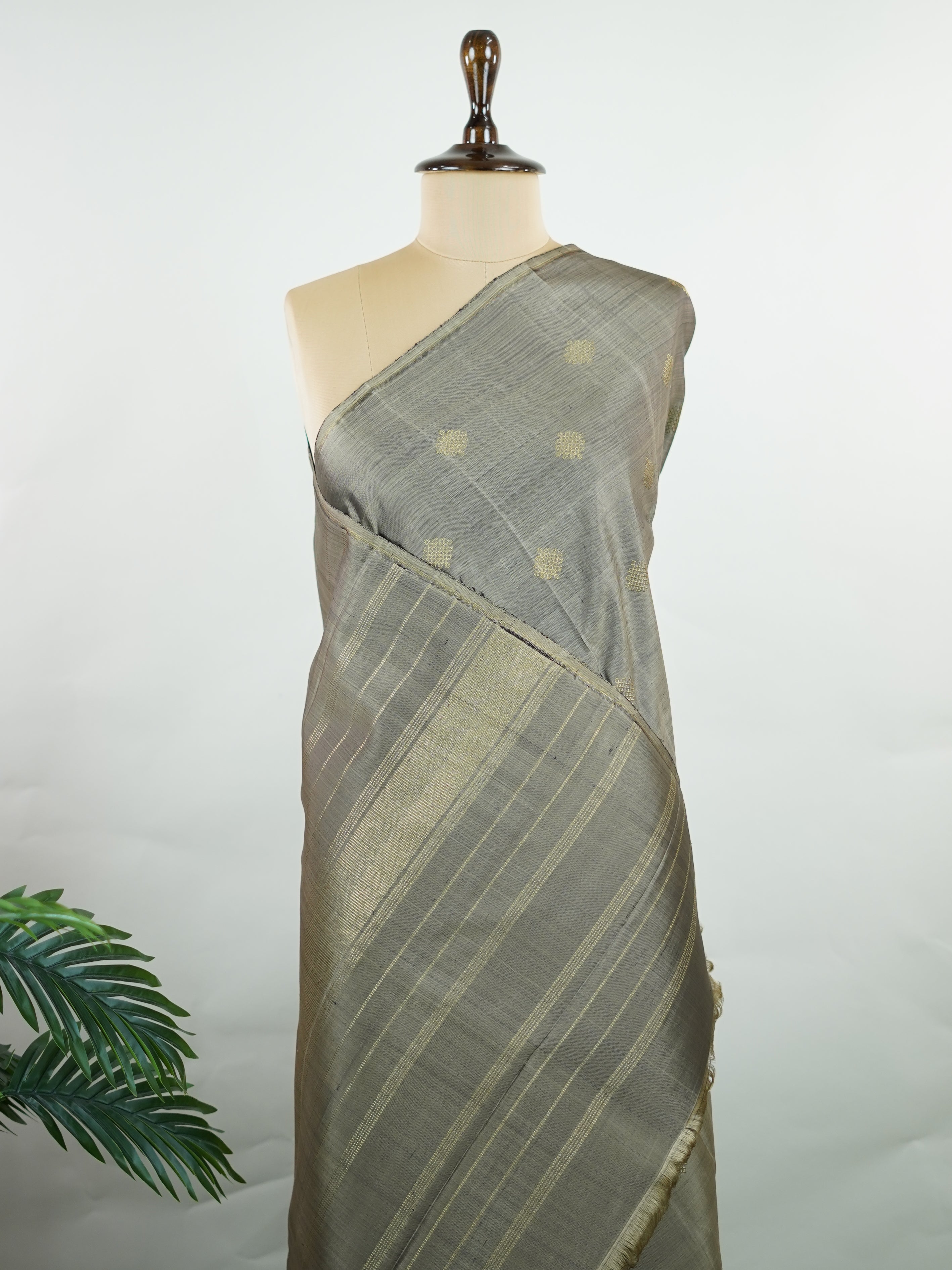 Soft grey silk enriched with intricate kolam buttas in pure zari. The muted tones radiate understated elegance for refined gatherings. Lightweight yet luxurious in drape. A subtle masterpiece for quiet sophistication. #GreySilkSaree #KolamButta #PureZariKanjivaram #MinimalLuxury