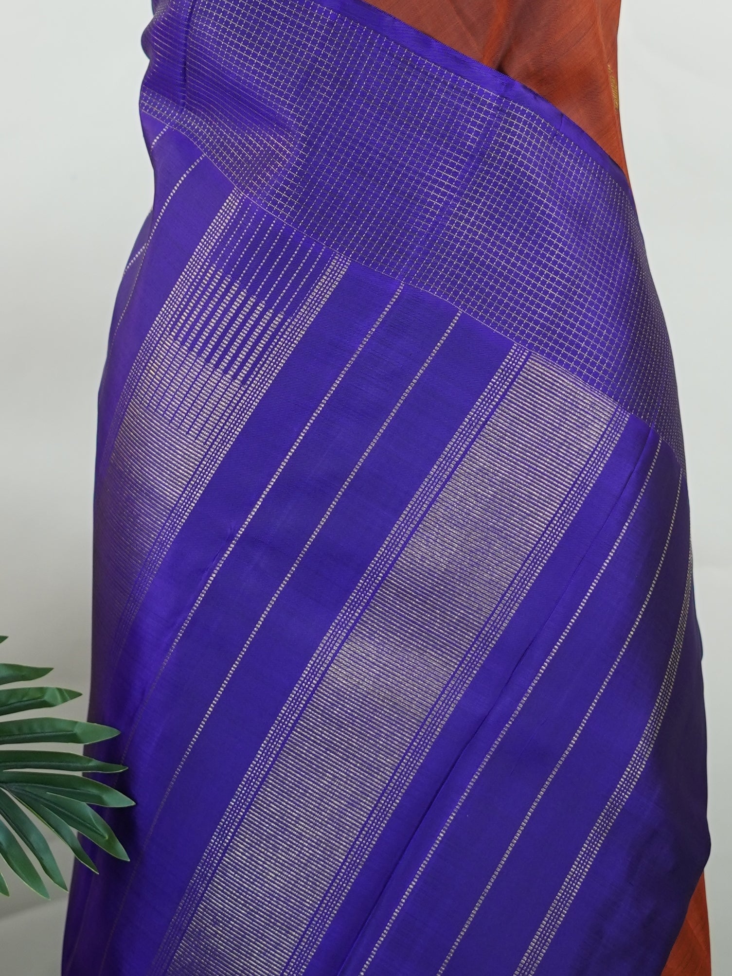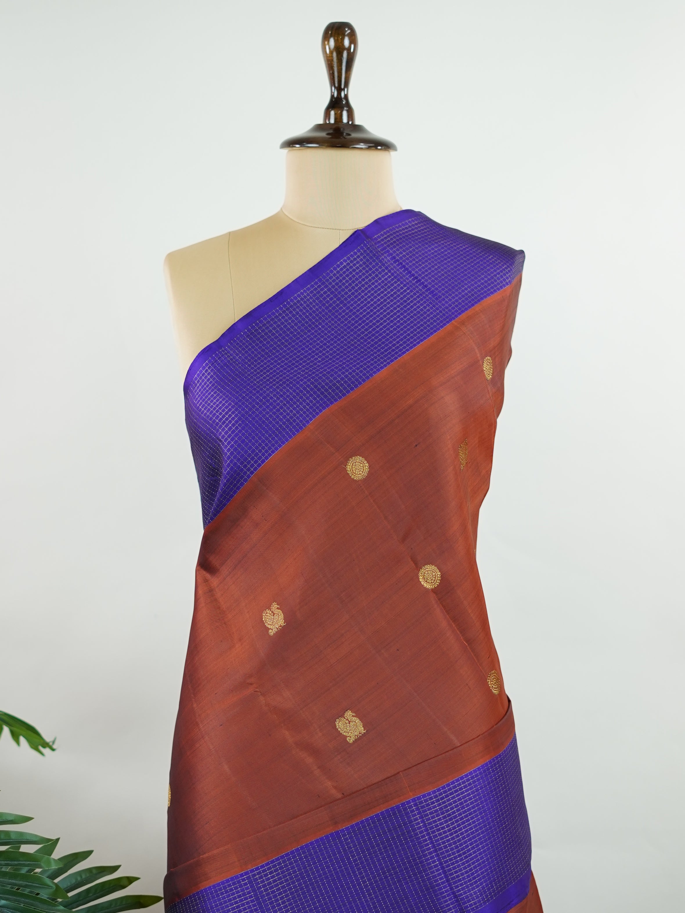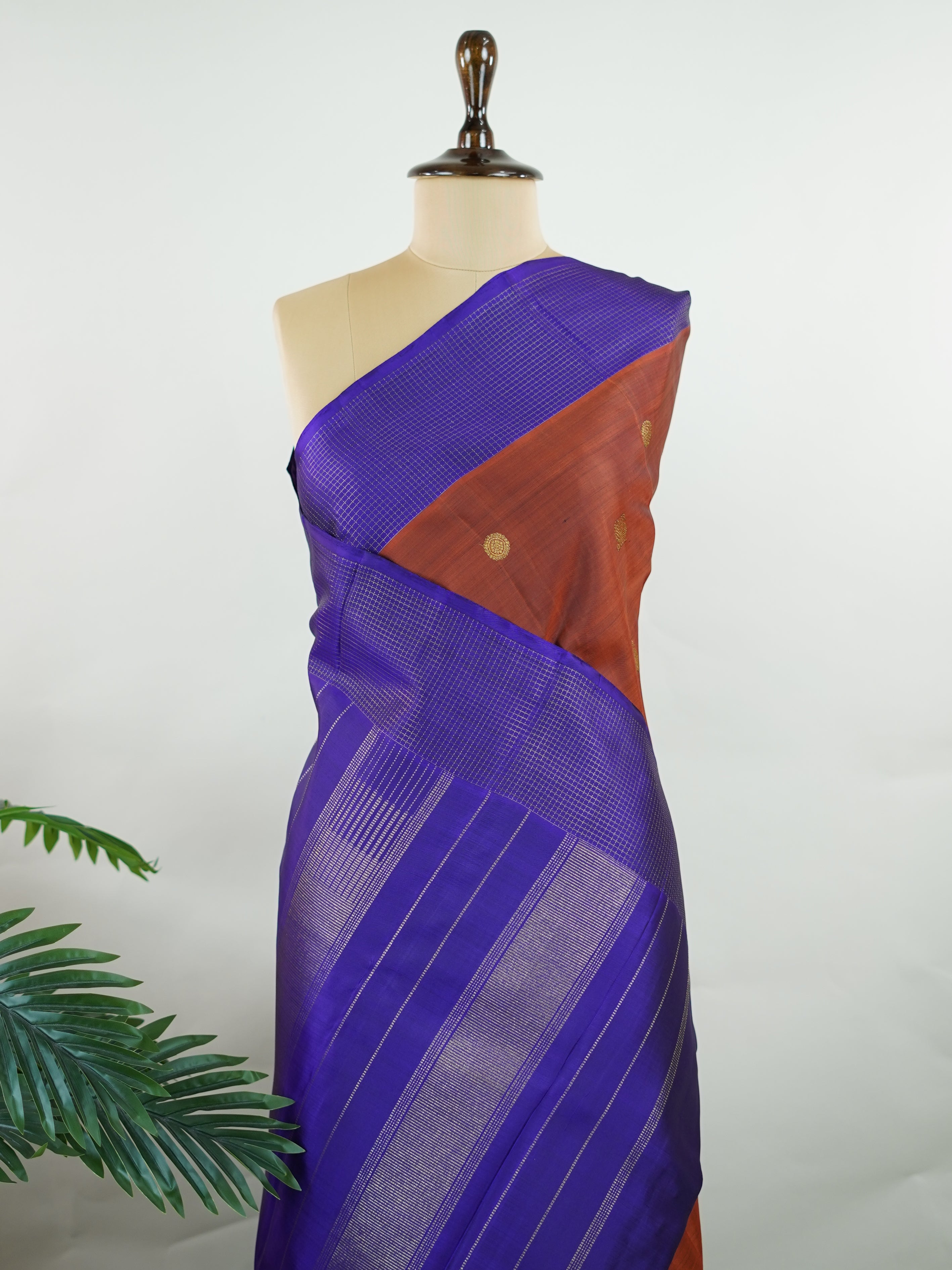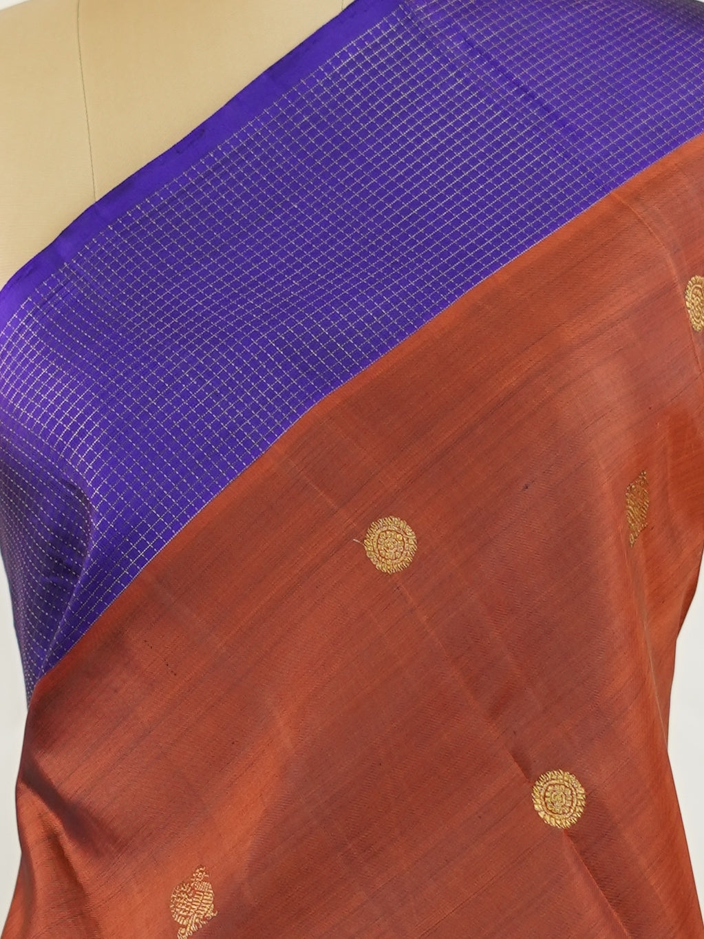 Rich brown silk meets regal purple in this Oosikattam masterpiece. The zari buttas sparkle subtly, adding festive warmth. Ideal for heritage celebrations and grand gatherings. A drape woven to command admiration. #BrownPurpleSilk #OosikattamDesign #PureZari #LuxuryTradition