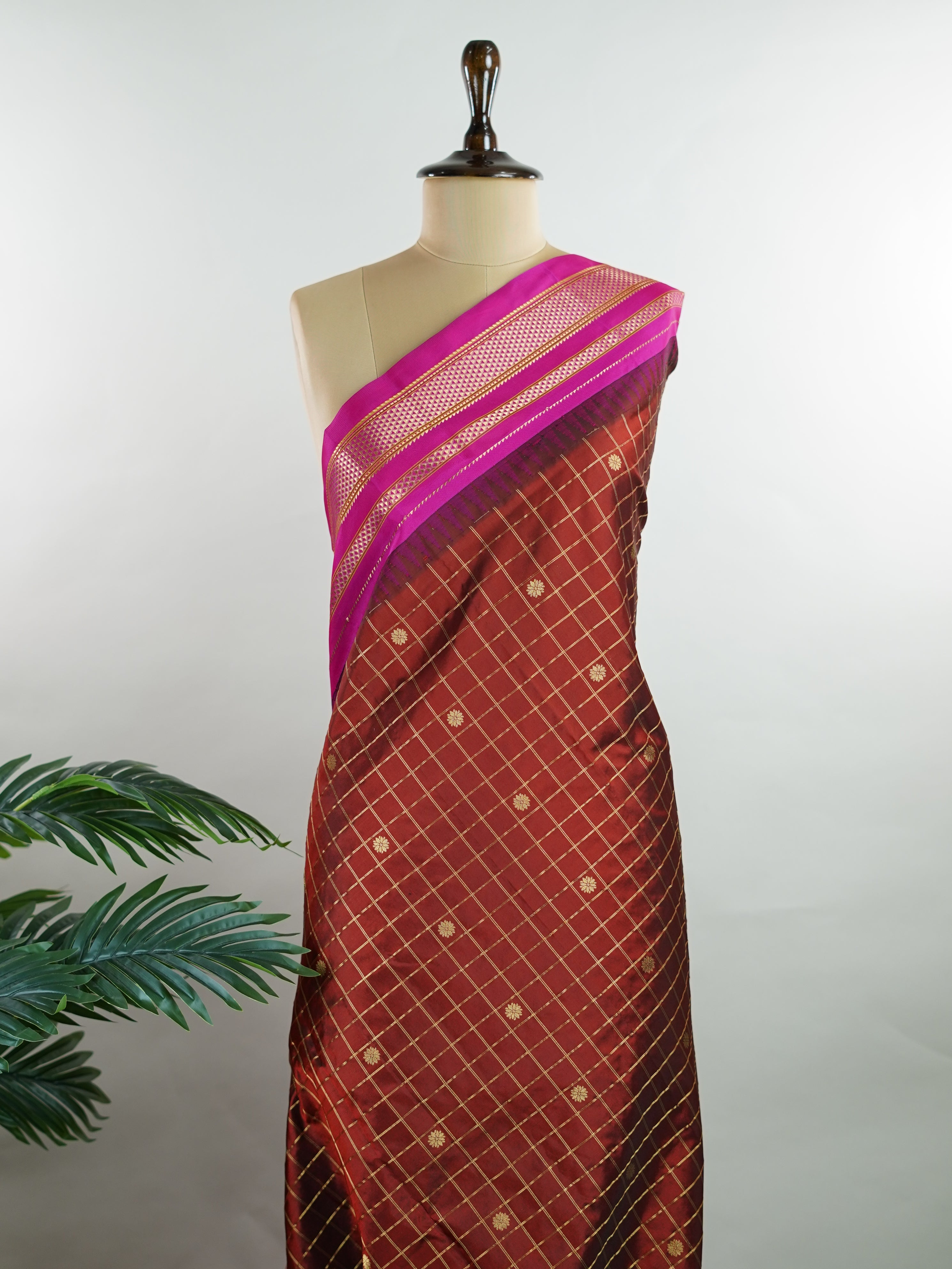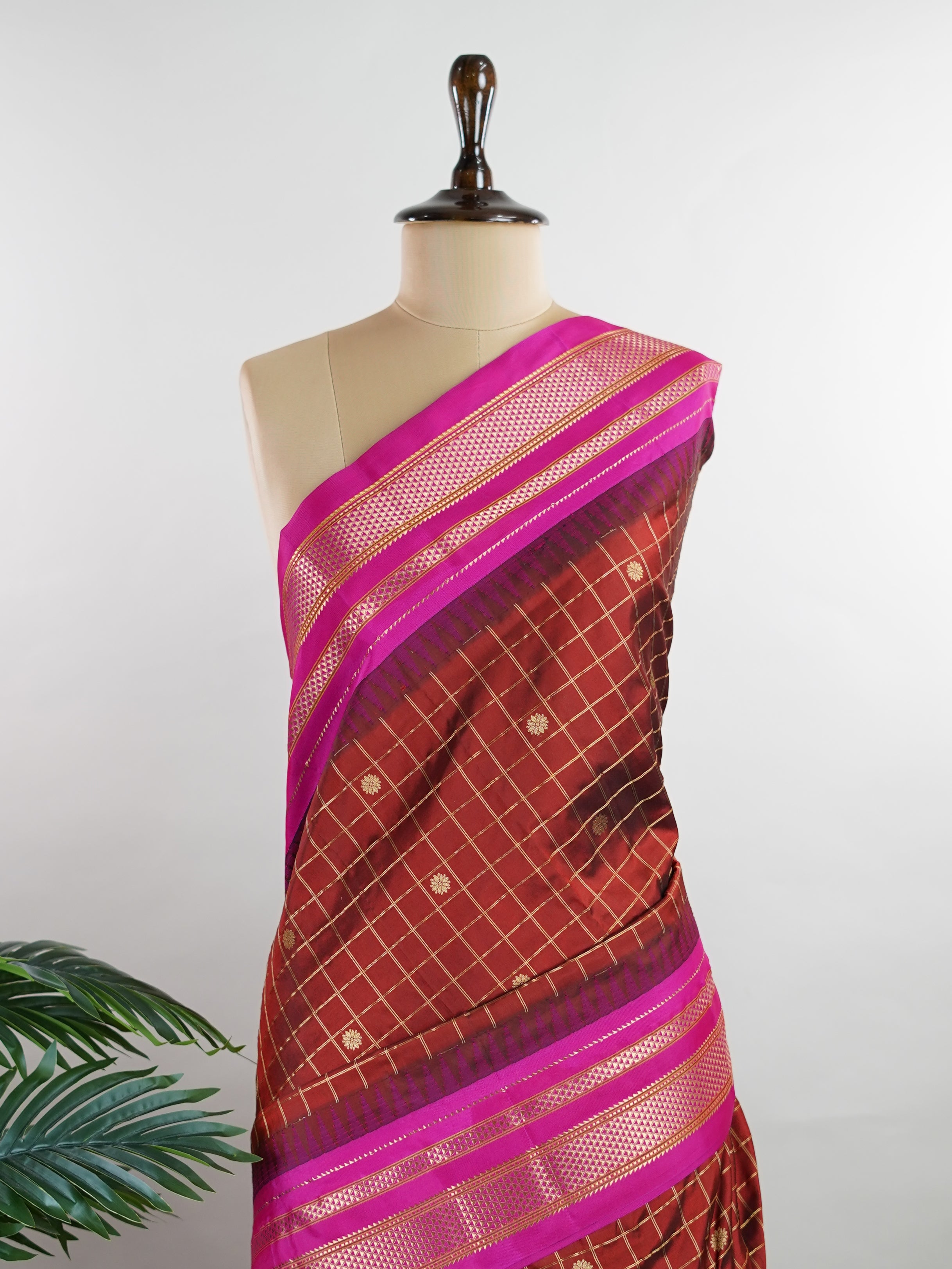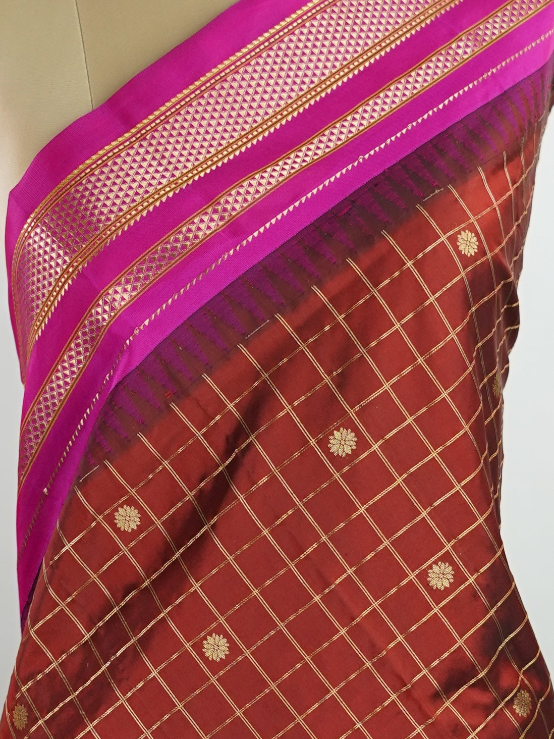 Narayanpet sarees with checks and buttis showcase a perfect blend of tradition and simplicity, featuring intricate motifs woven over classic check patterns.