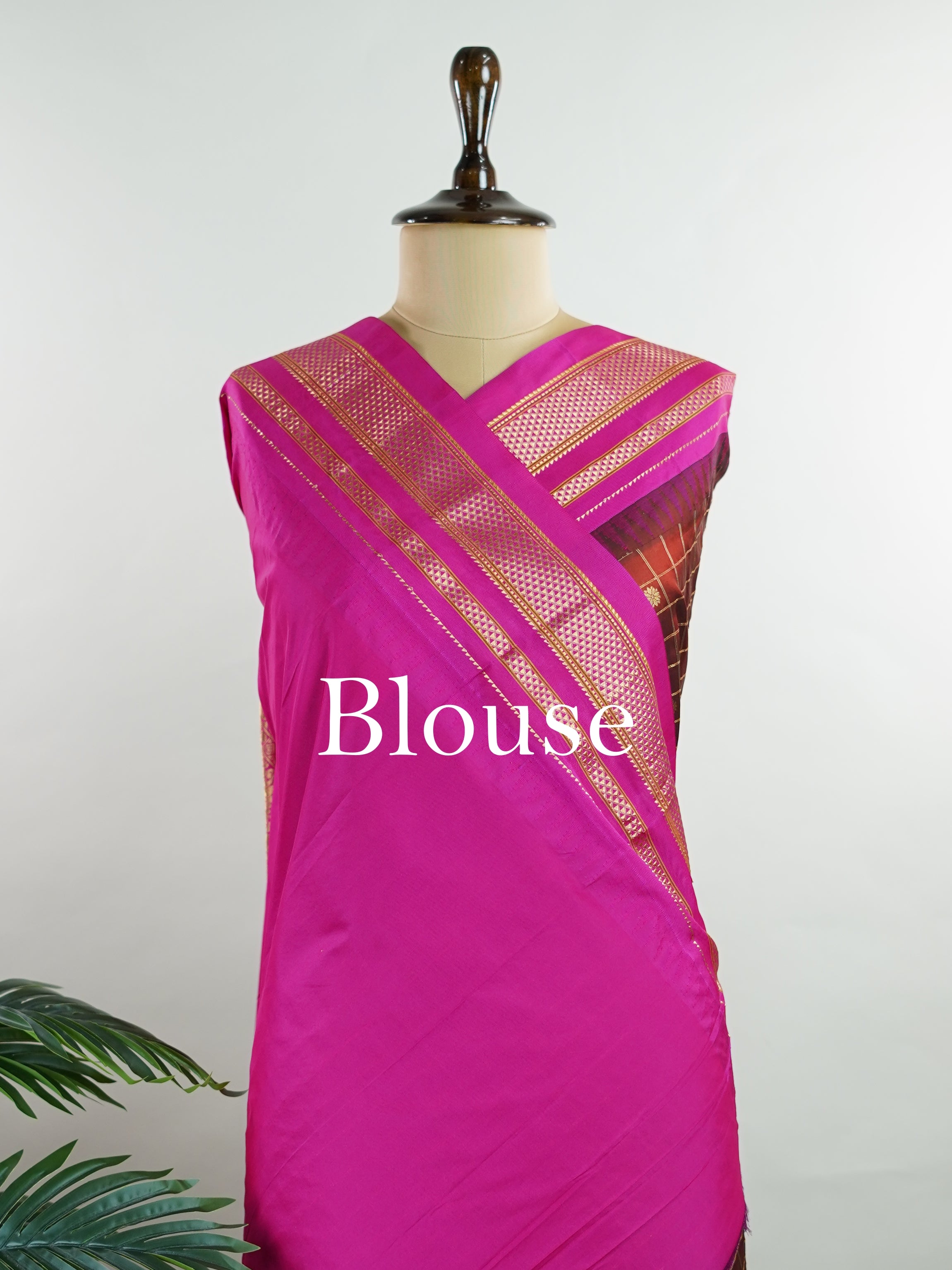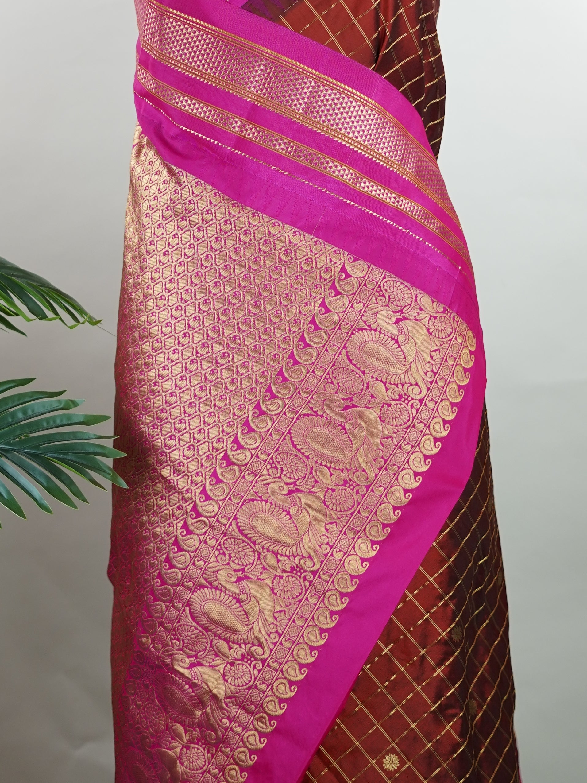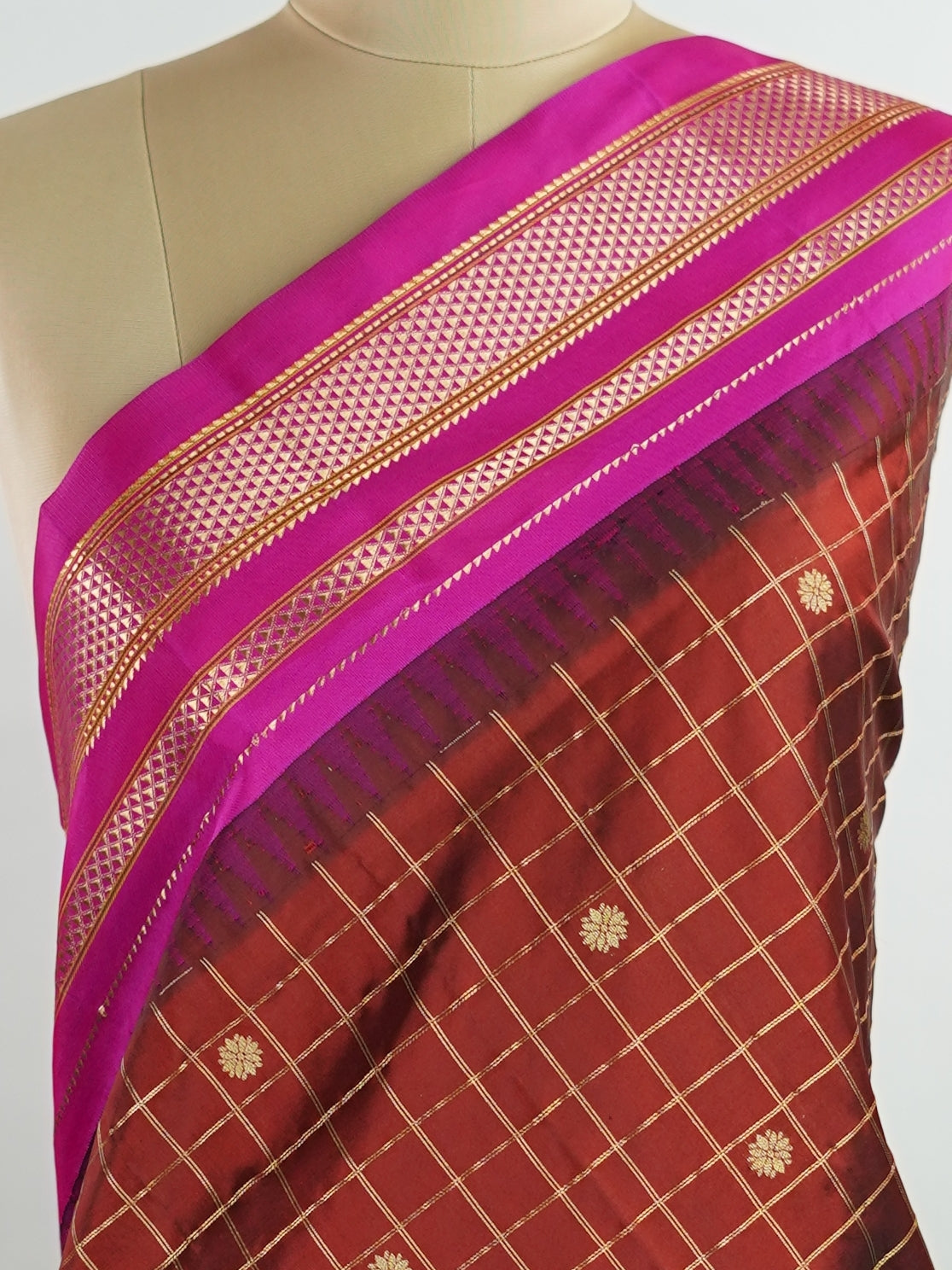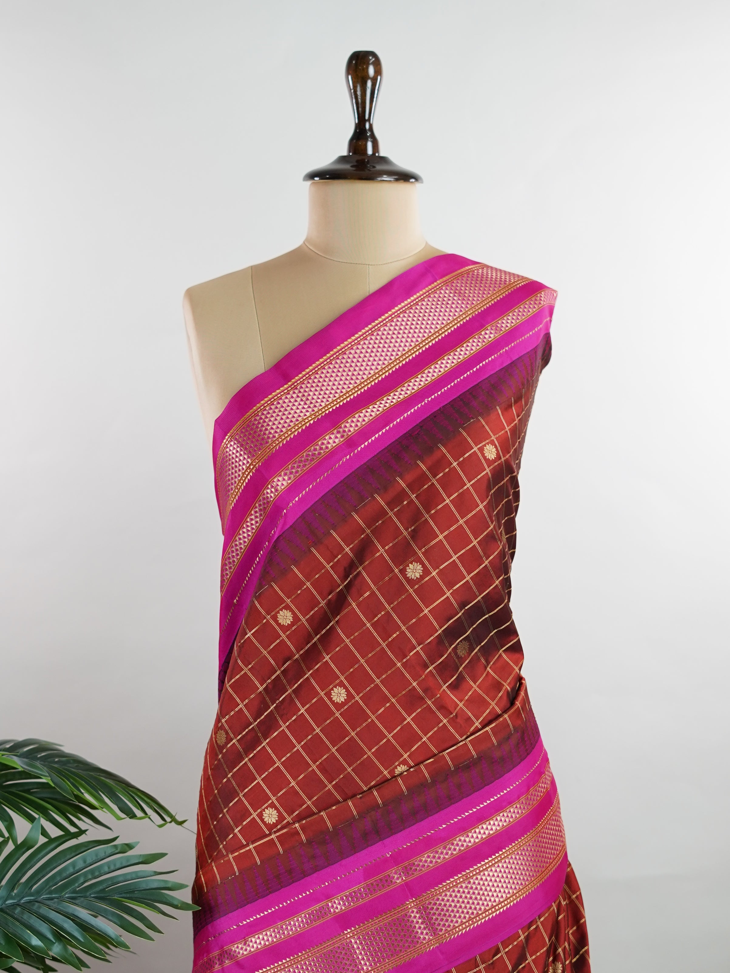 Narayanpet sarees with checks and buttis showcase a perfect blend of tradition and simplicity, featuring intricate motifs woven over classic check patterns.