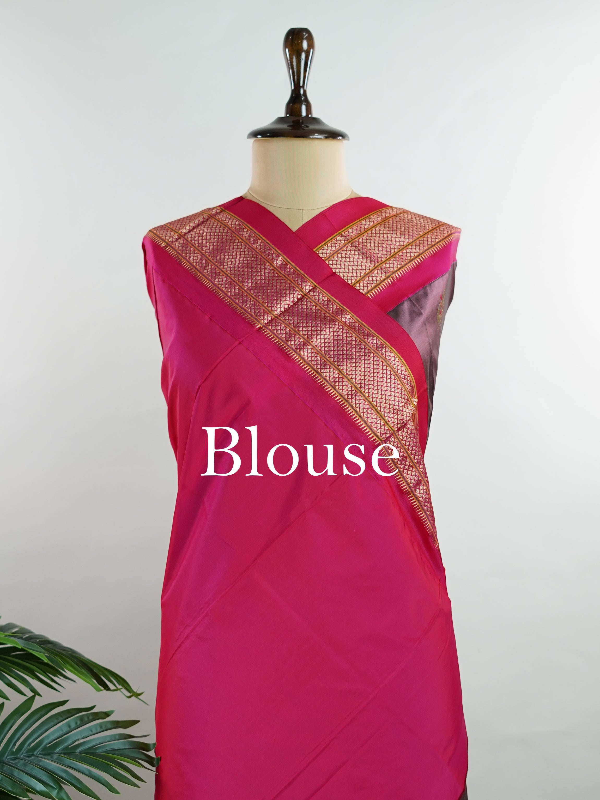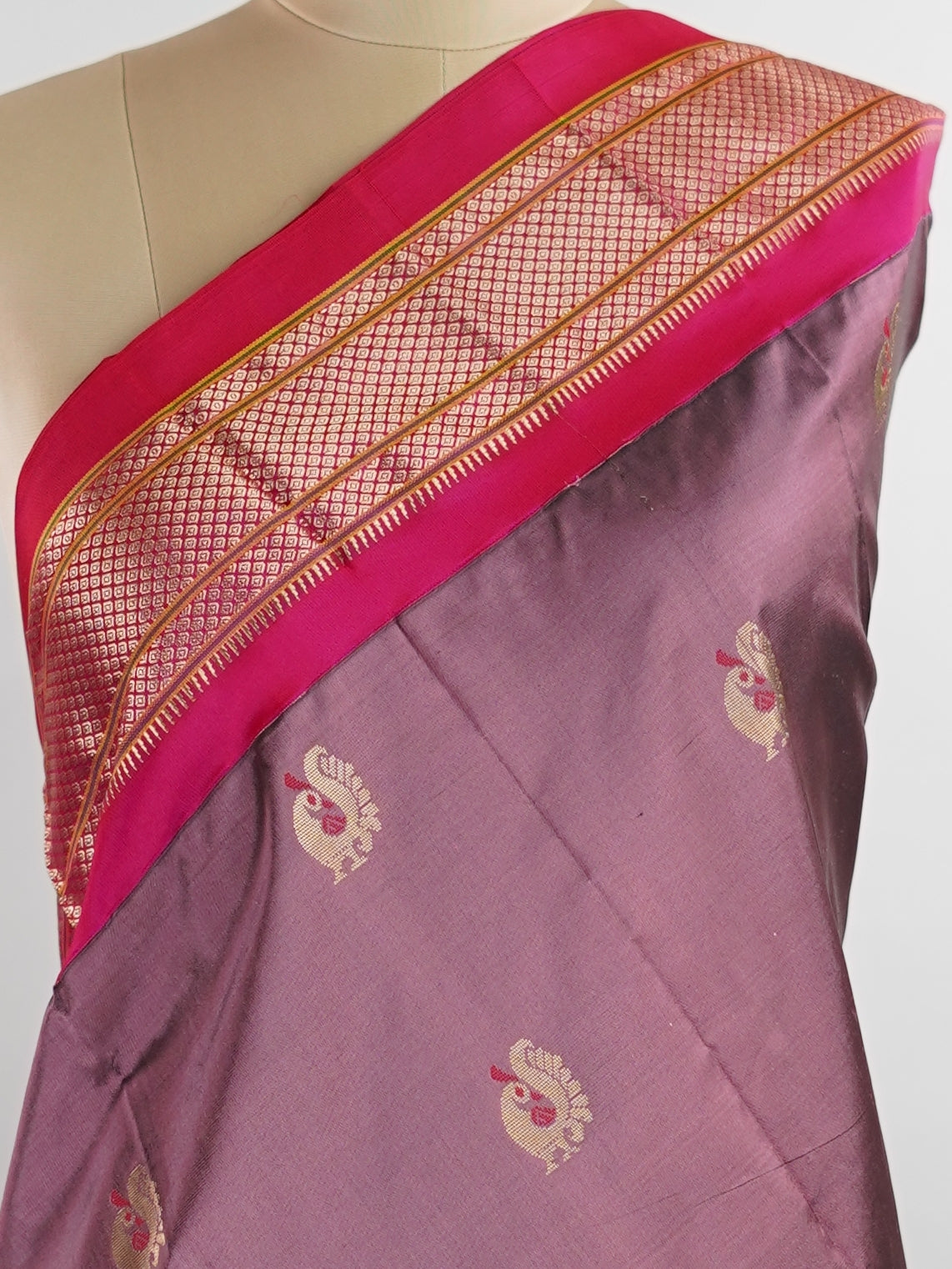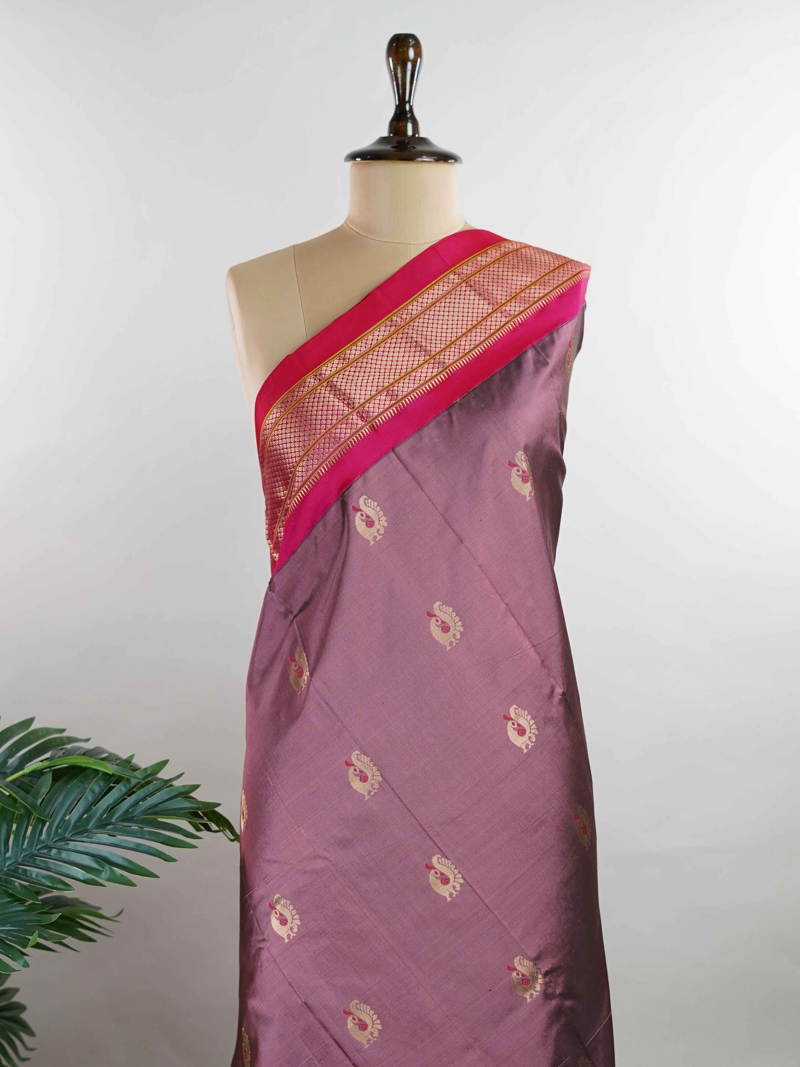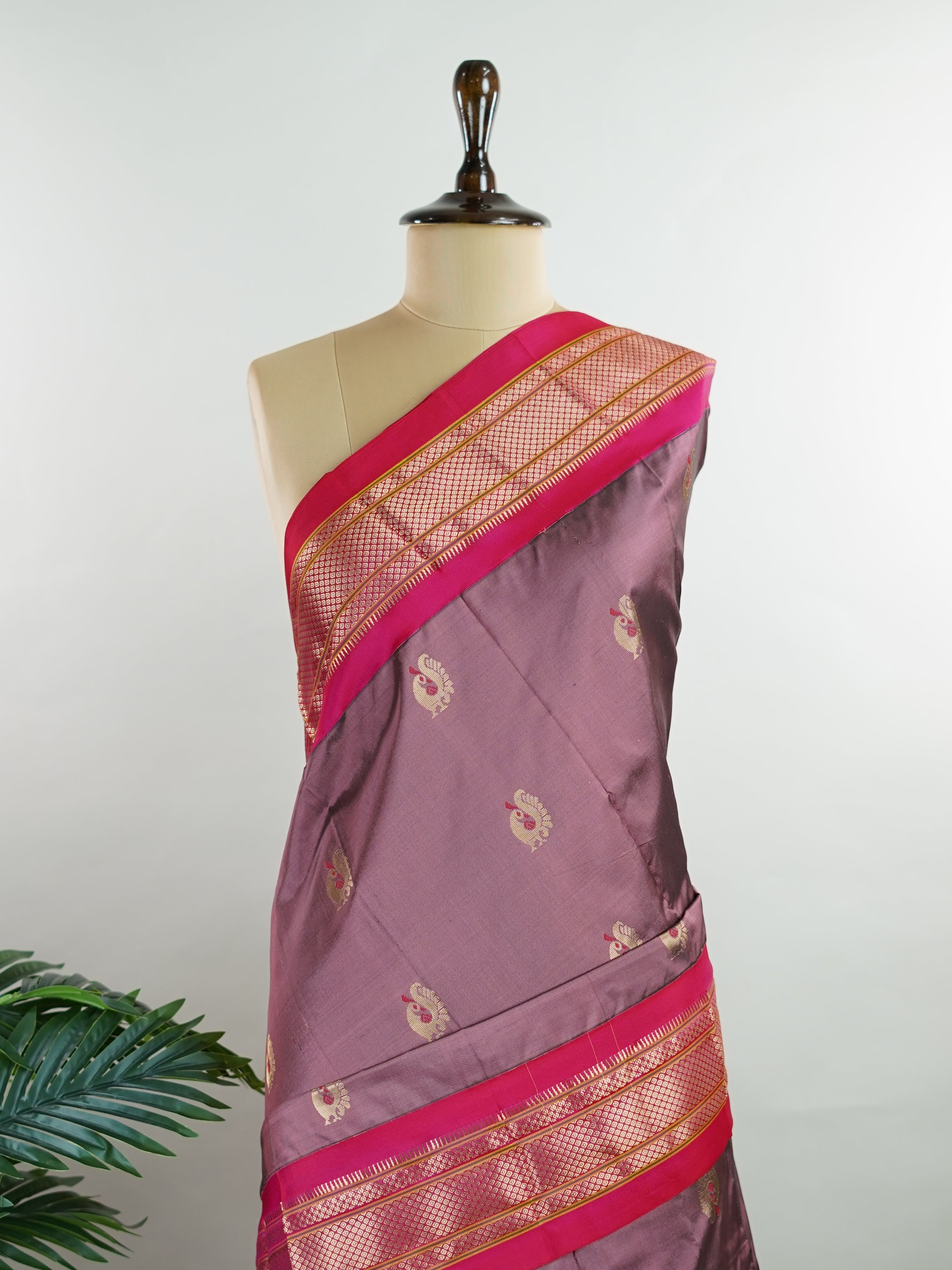 Narayanpet sarees feature elegant plain bodies adorned with delicate buttas, complemented by rich Paithani-style pallus.