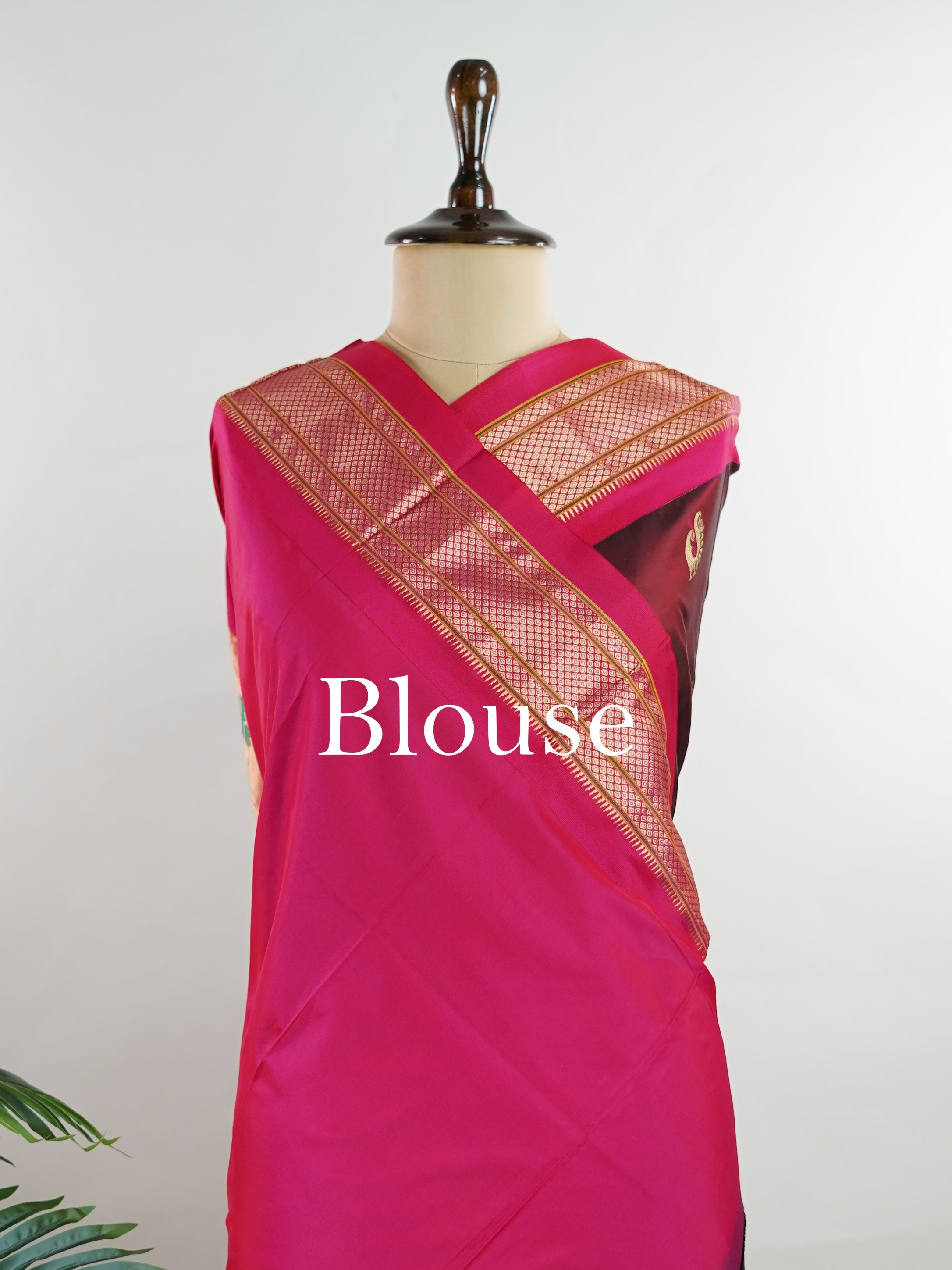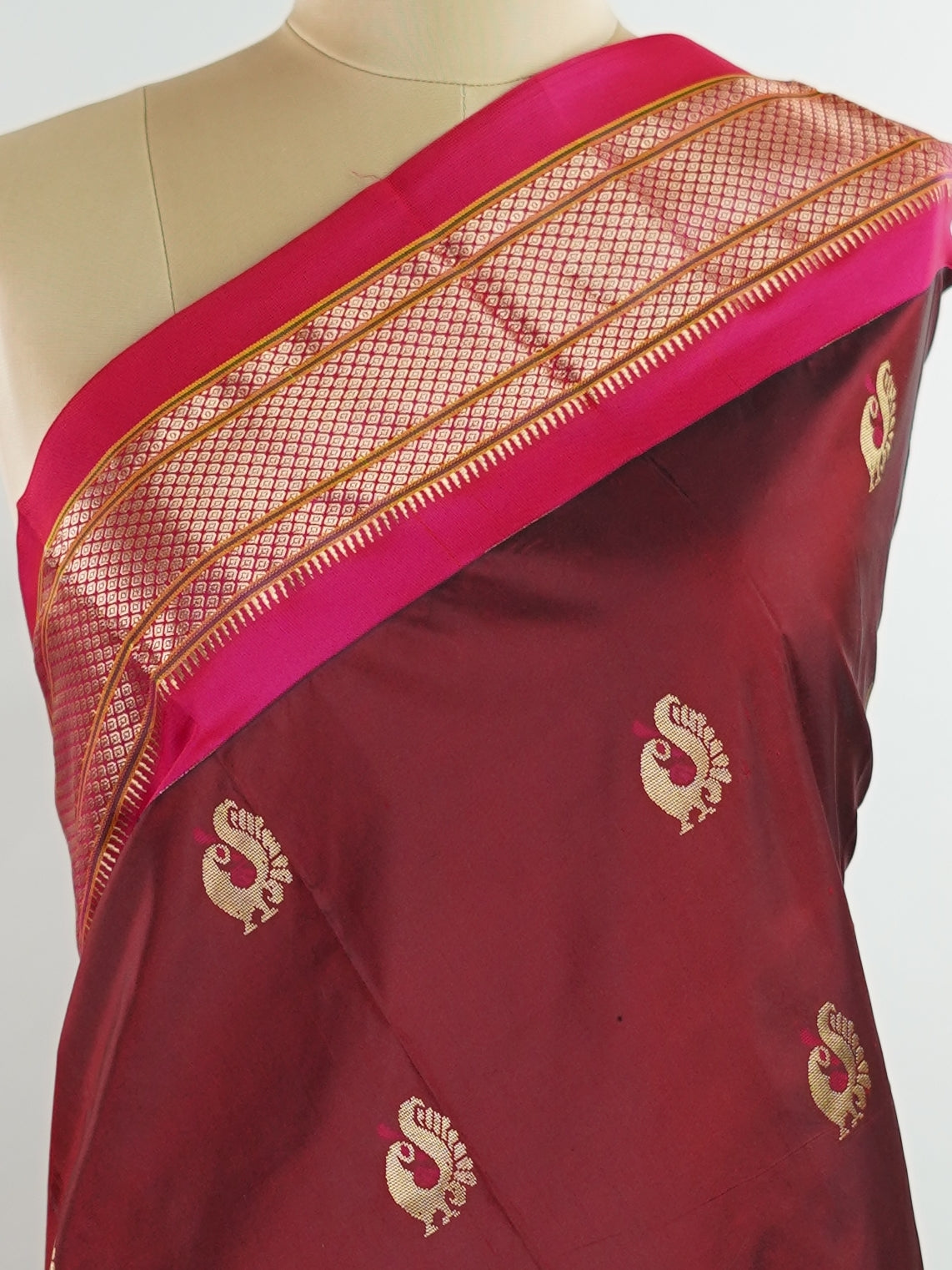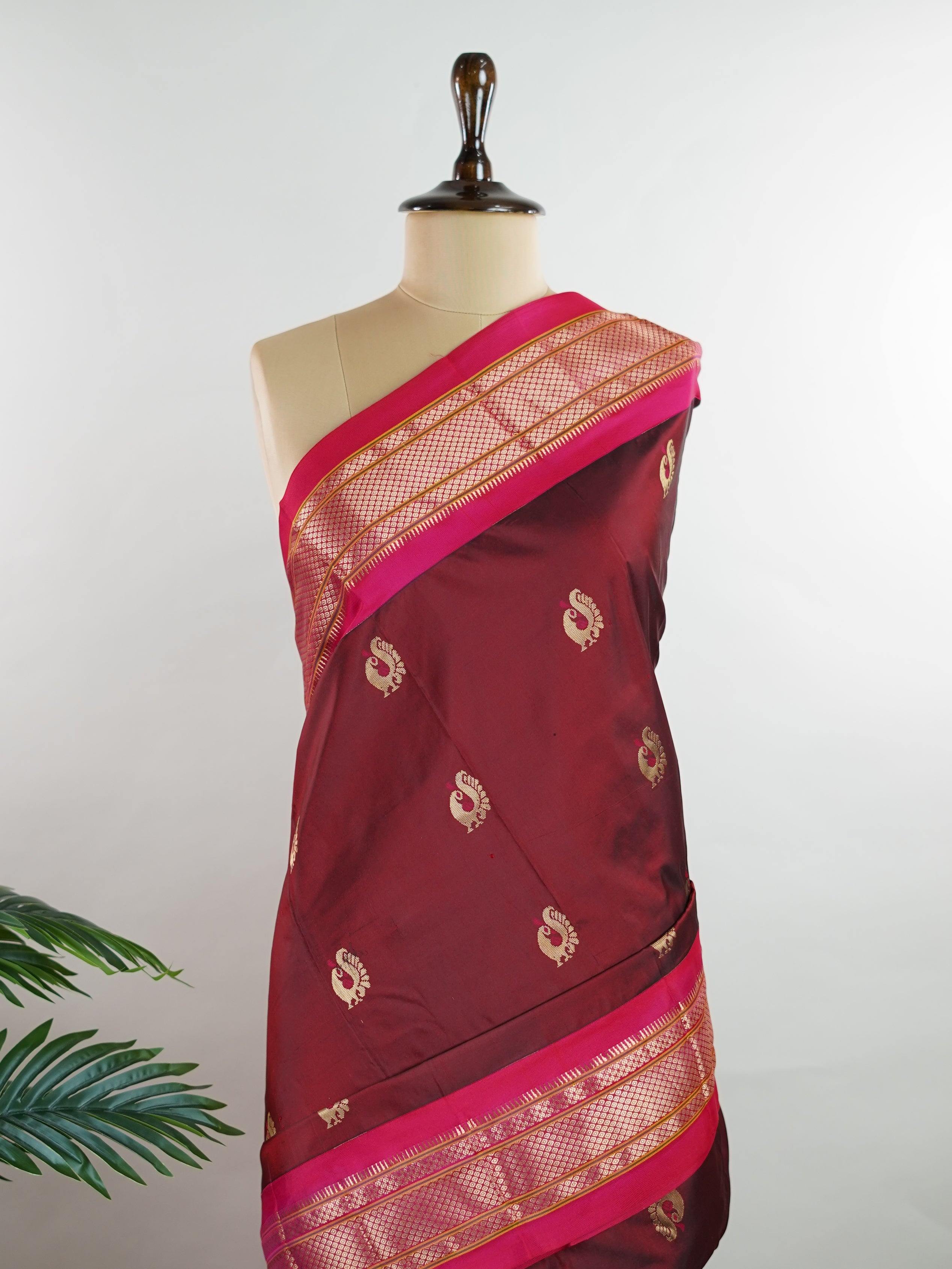 Narayanpet sarees feature elegant plain bodies adorned with delicate buttas, complemented by rich Paithani-style pallus.