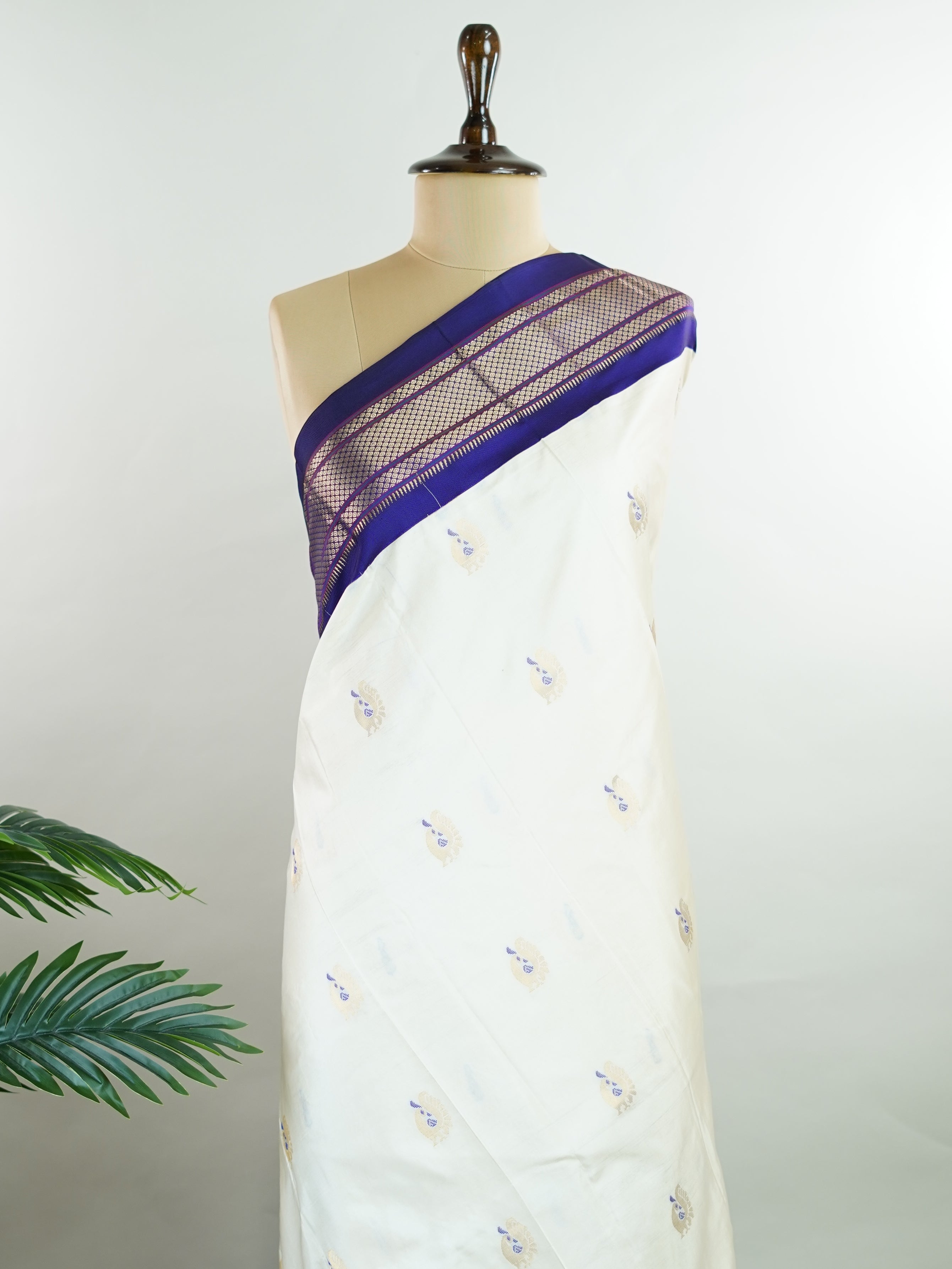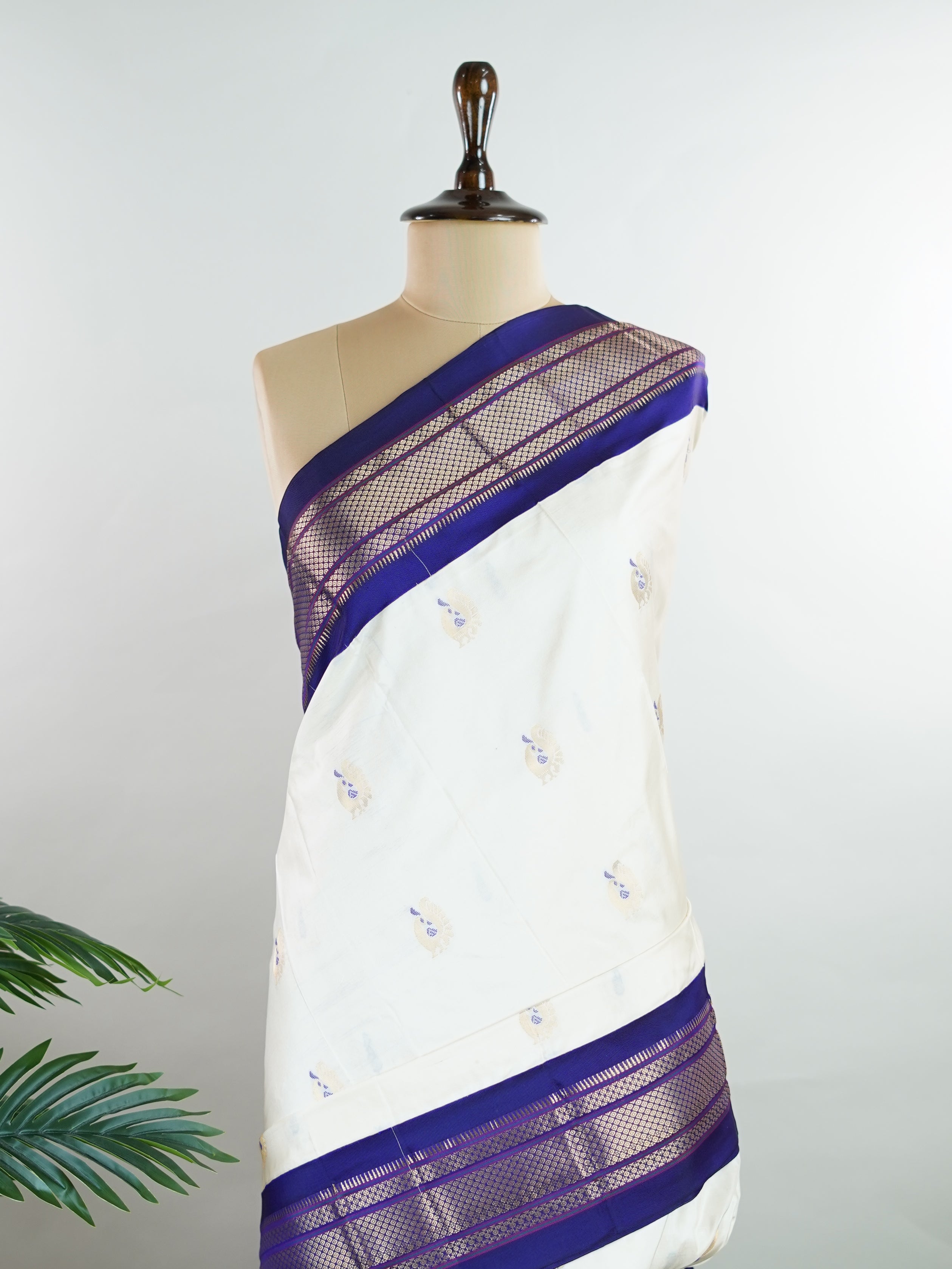 Narayanpet sarees feature elegant plain bodies adorned with delicate buttas, complemented by rich Paithani-style pallus.
